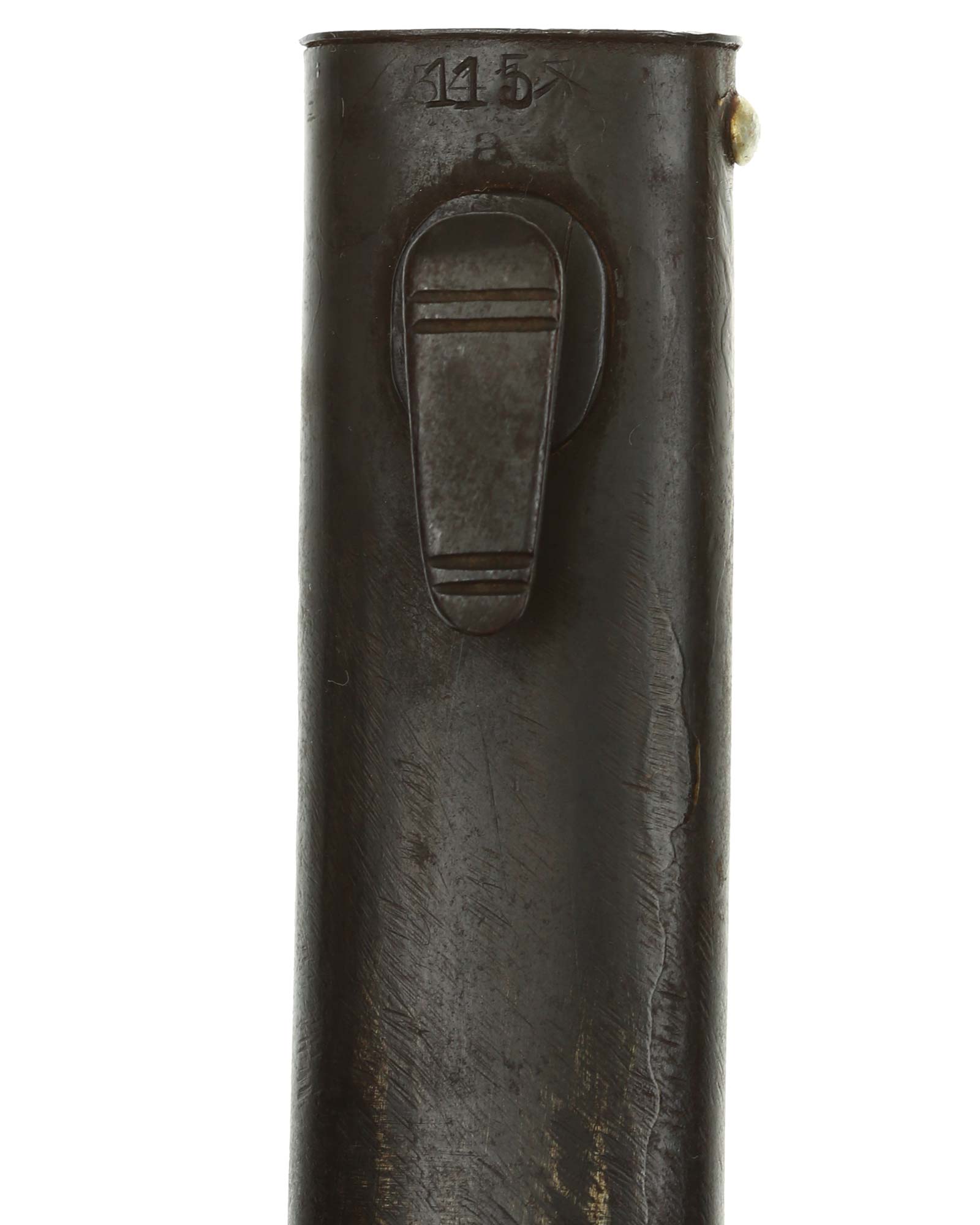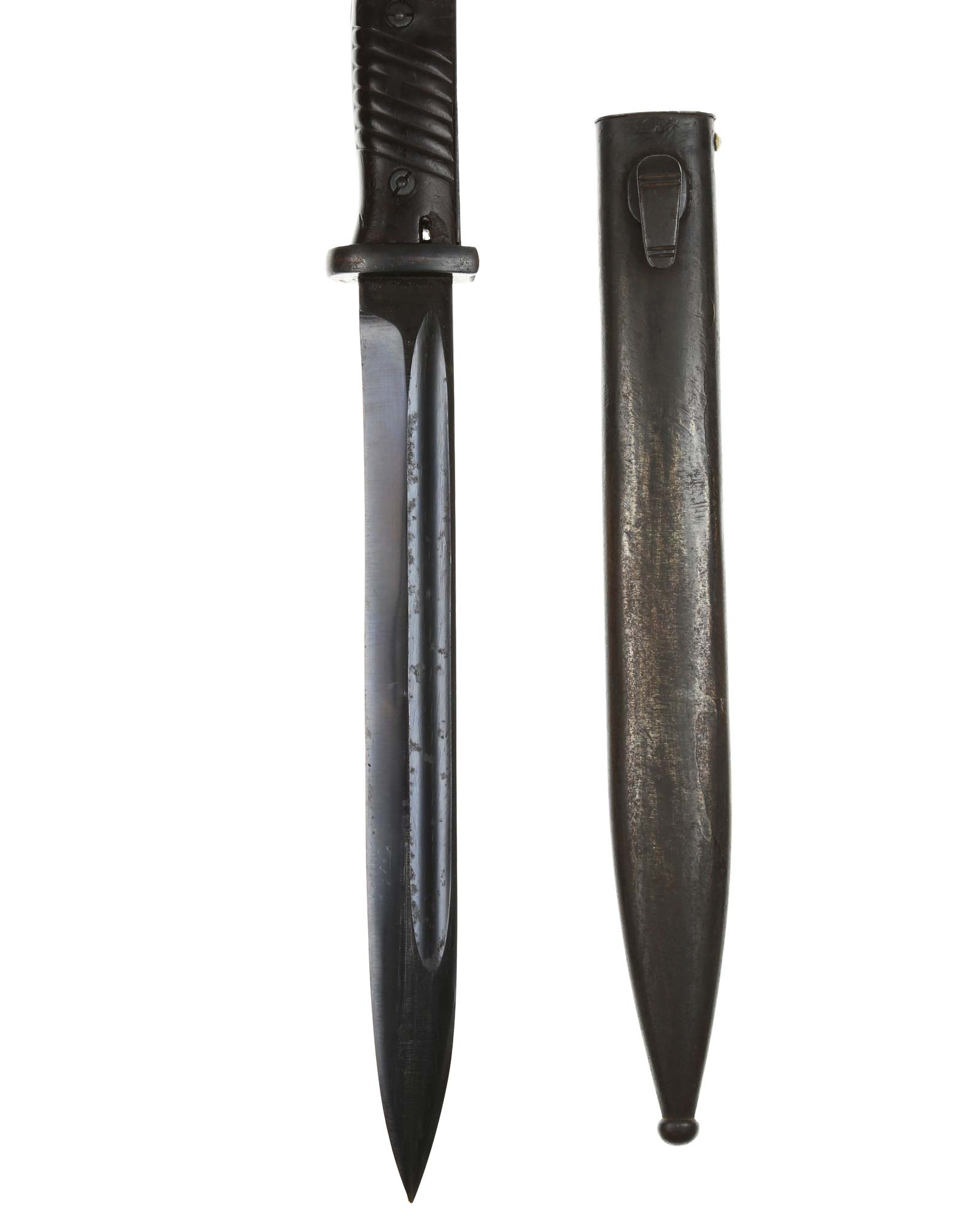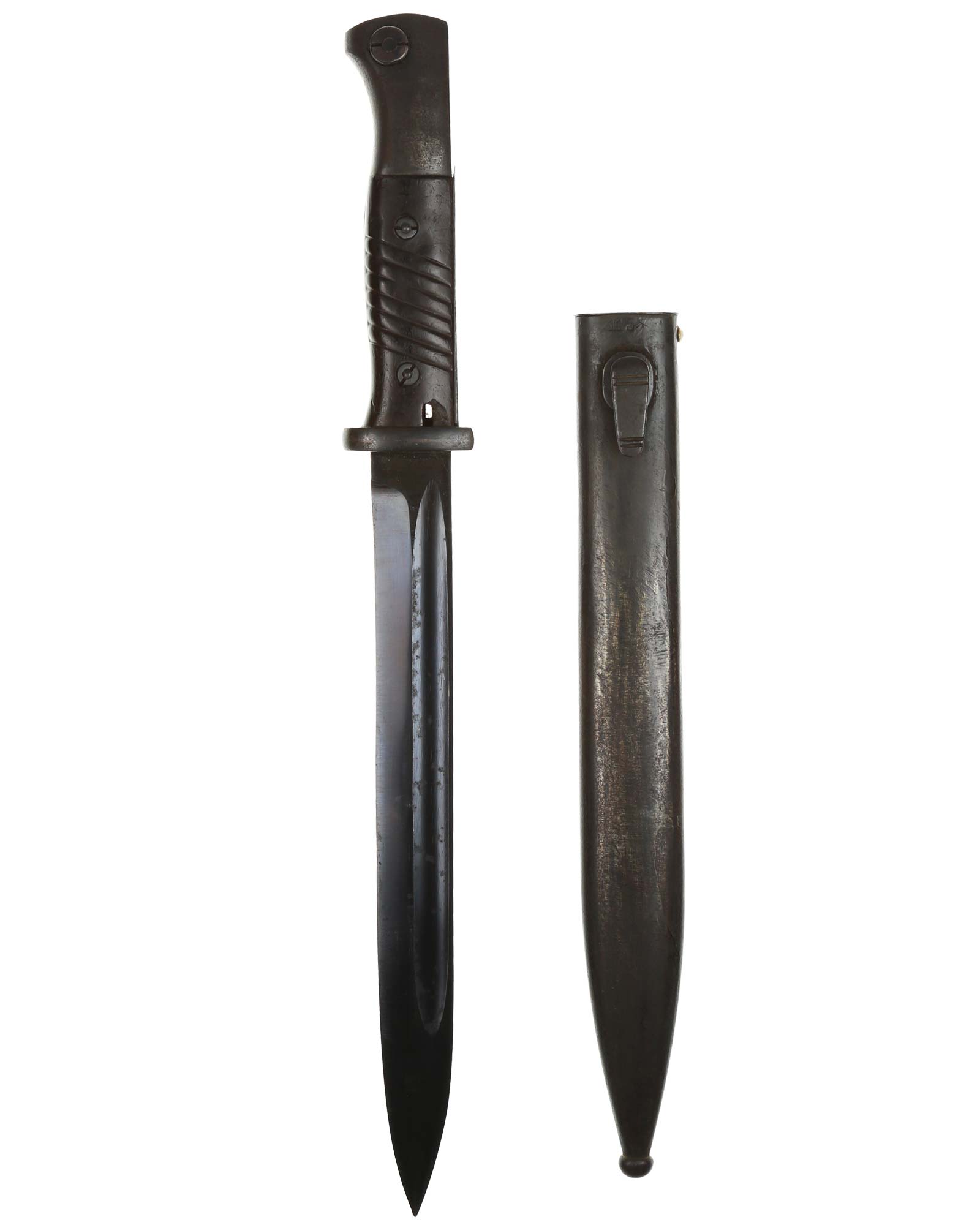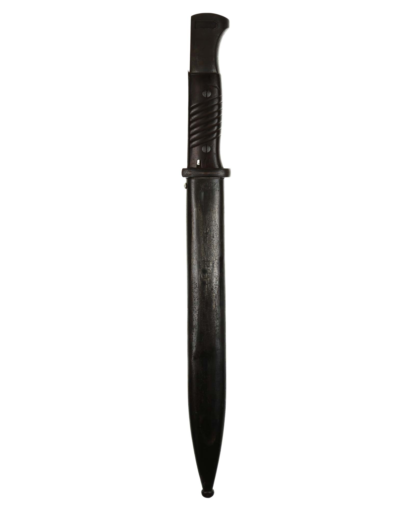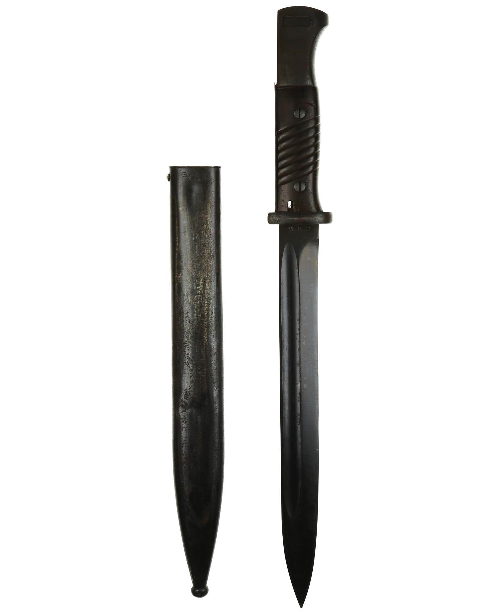 Brünierter Griff mit schwarzbraunen Griffschalen. Beide Griffschalen und Griffschrauben unbeschädigt. Druckknopf funktioniert einwandfrei. Die Klinge ist brüniert und einschneidig mit runden Hohlkehlen. Auf der Rückseite der Klinge befindet sich der Hersteller: WKC Solingen. Brünierte Stahlscheide mit div. Stempelungen: S/177 1936. Gesamtlänge beträgt 444 mm.