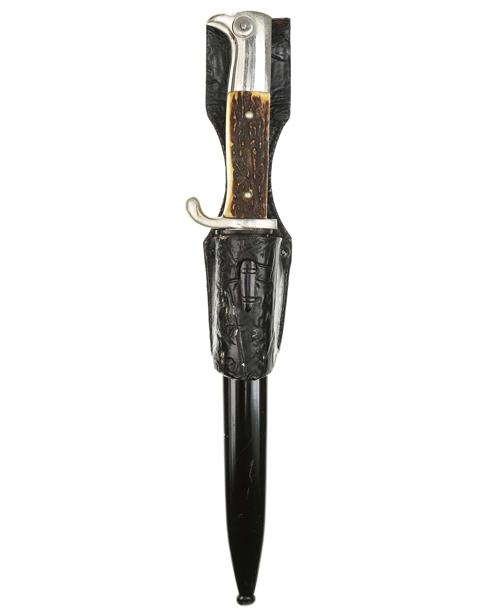 Seitengewehr [K98] mit Hirschhorn-Griffschalen. Beide Griffschalen und Nieten unbeschädigt. Die Klinge ist einschneidig mit runden Hohlkehlen. Stahlscheide mit Originallackierung. Lederkoppelschuh.