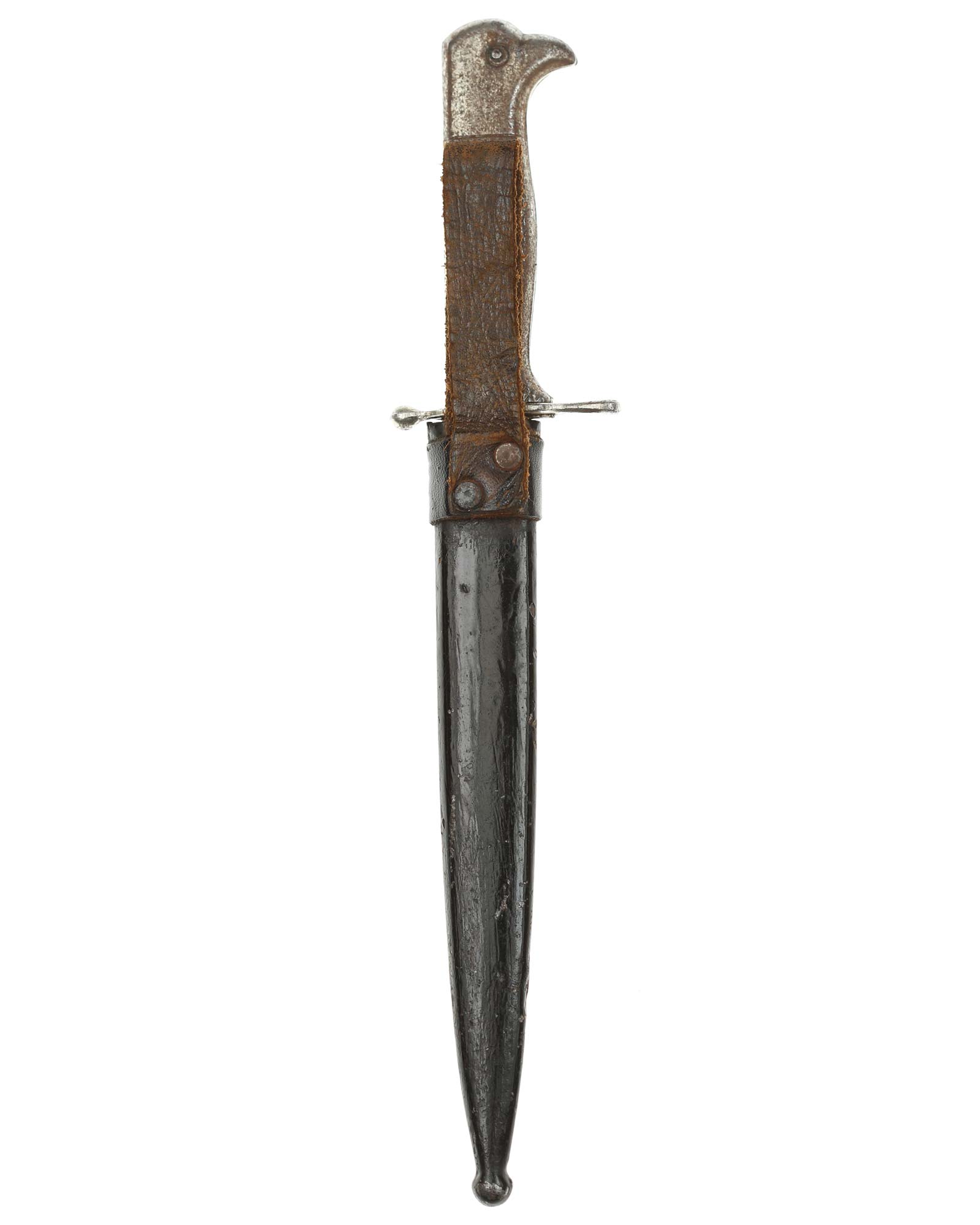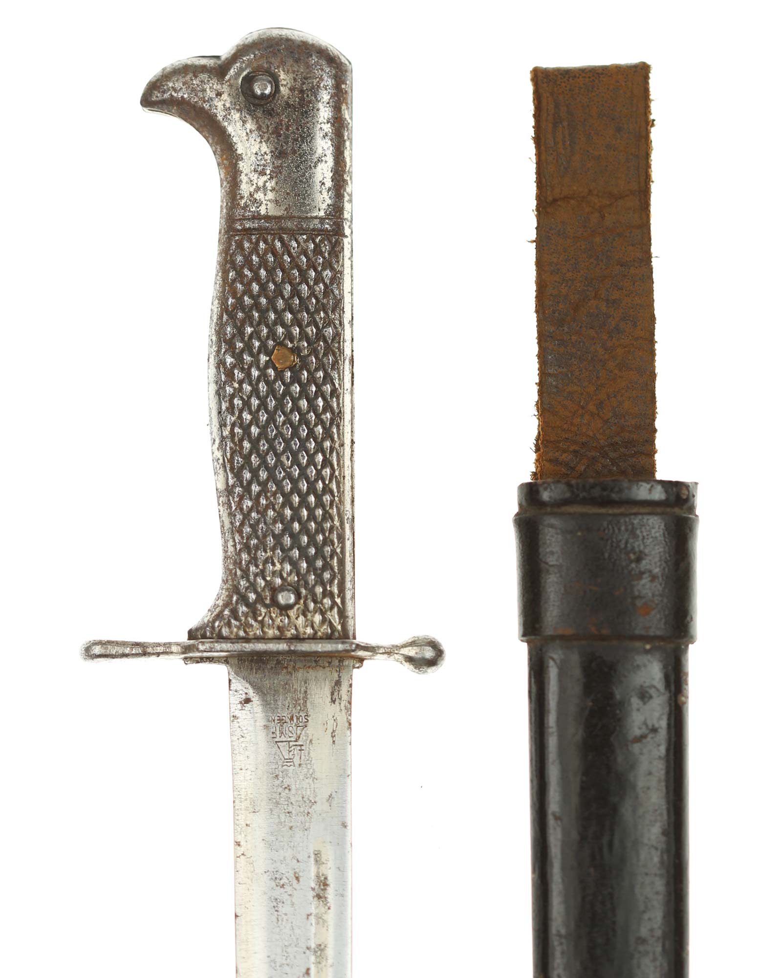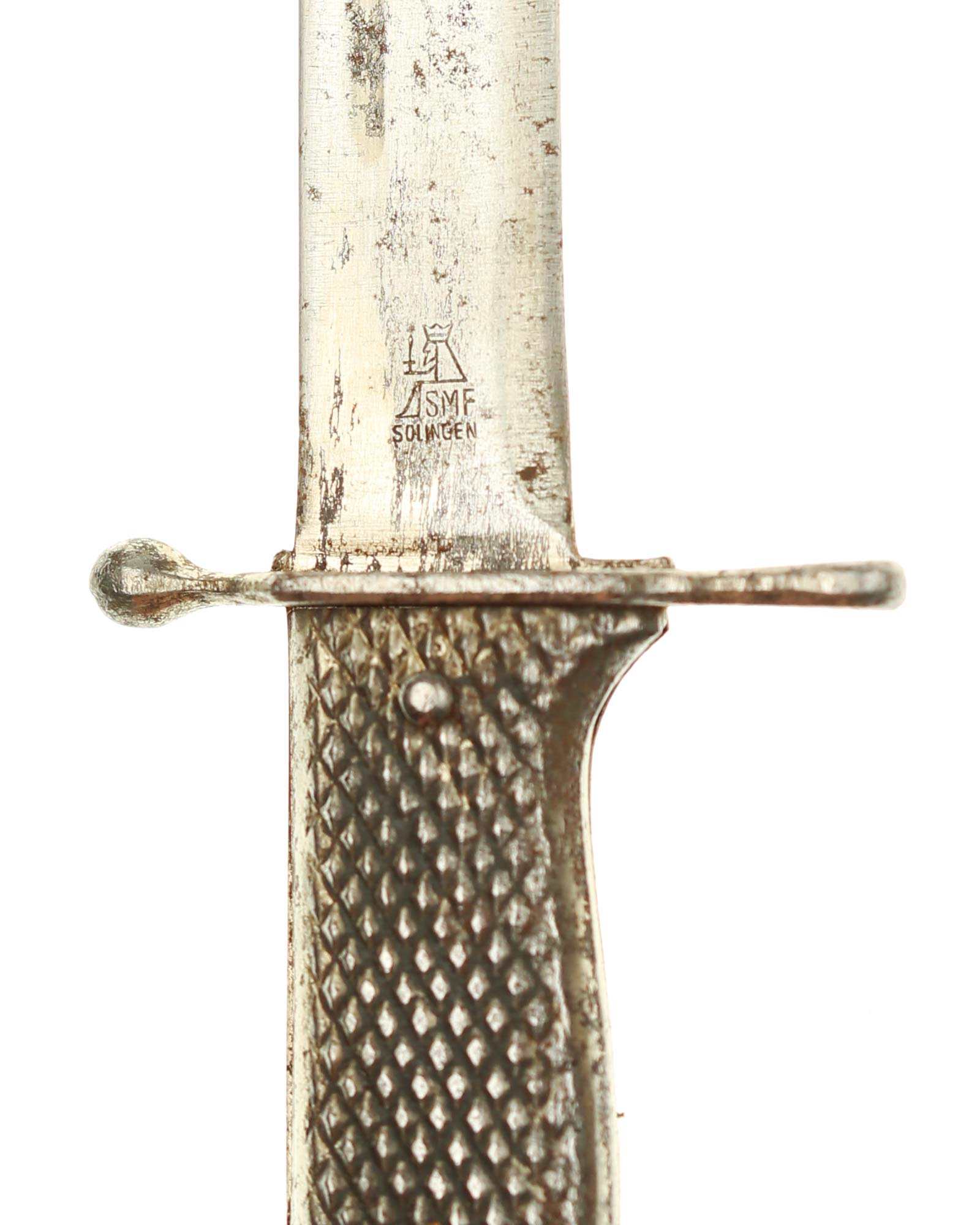Seitengewehr [K98 - Miniatur] mit Leder-Koppelschlaufe. Beide Griffschalen aus Metall. Die Klinge ist einschneidig mit runden Hohlkehlen. Auf der Vorderseite der Klinge befindet sich das Herstellerlogo: SMF Solingen. Stahlscheide mit schwarzer Lackierung. Gesamtlänge beträgt 240 mm. Braune Leder-Koppelschlaufe.