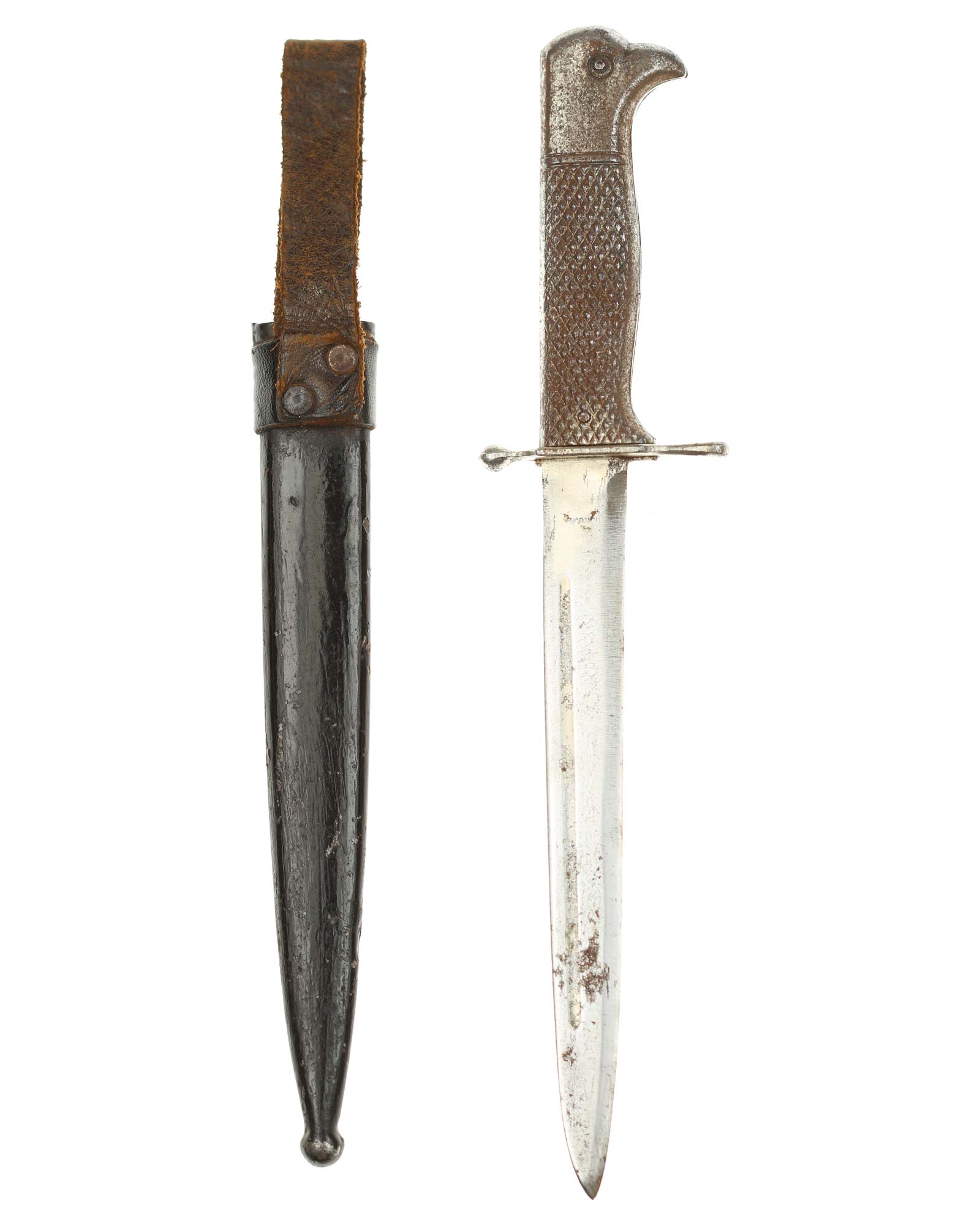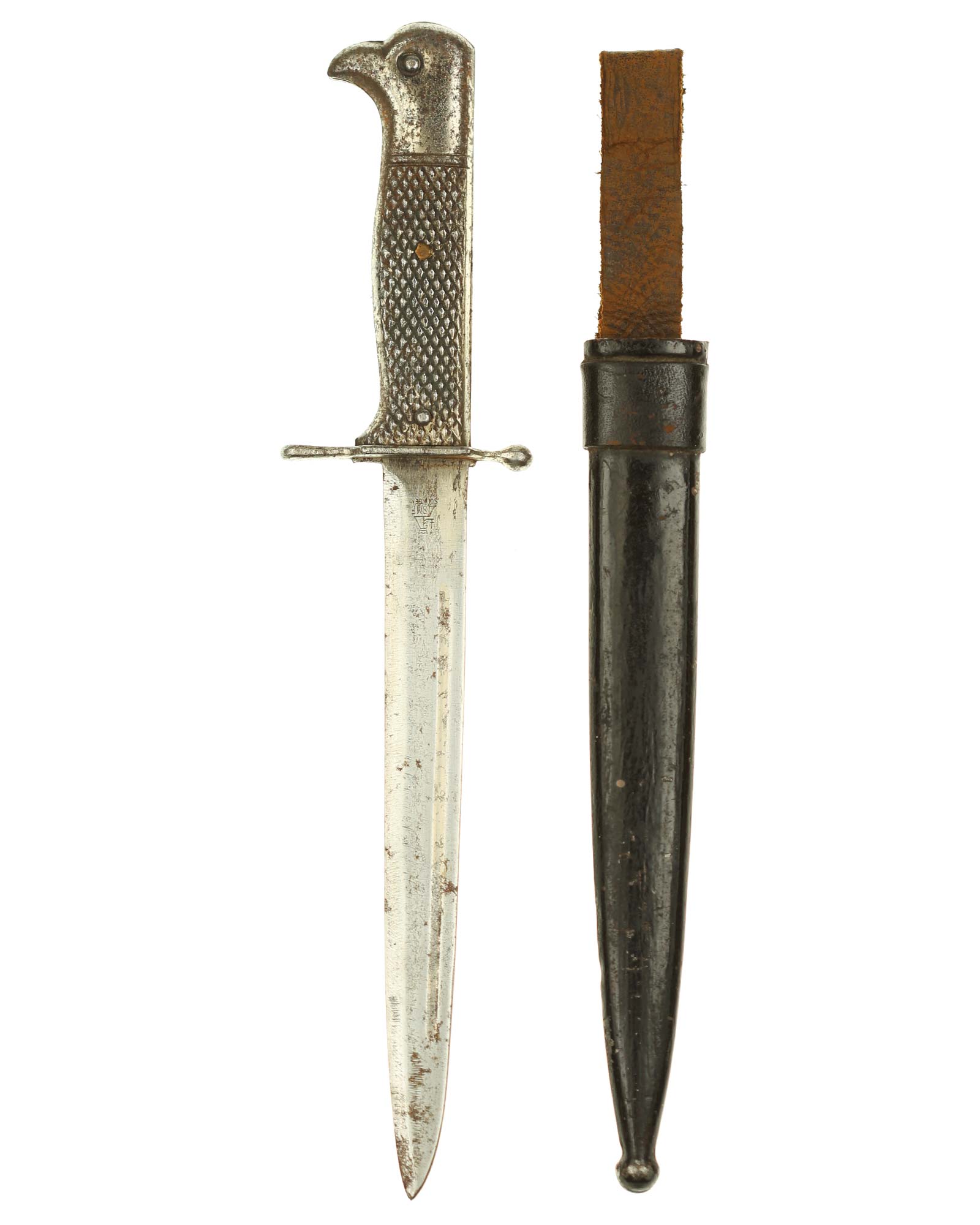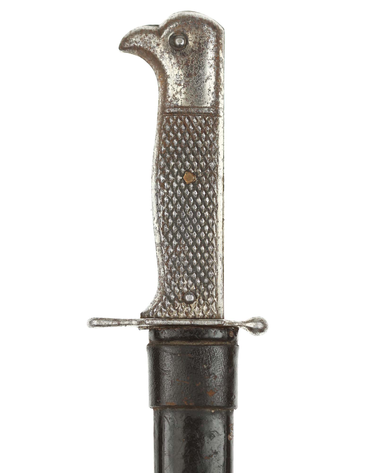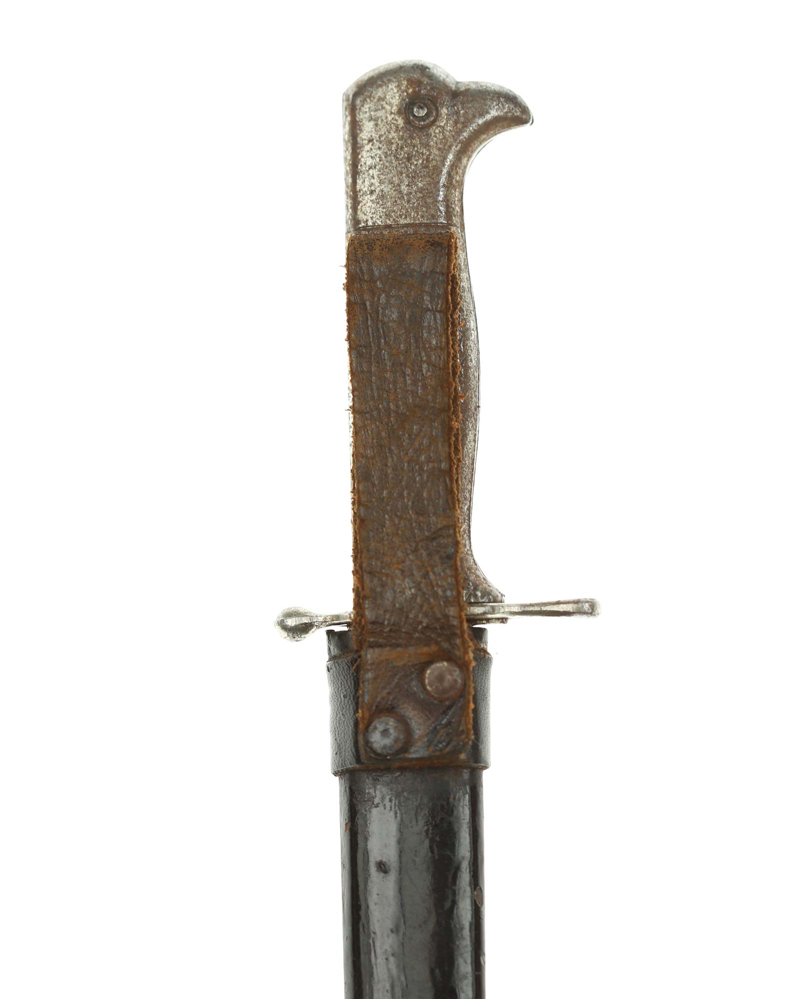 Seitengewehr [K98 - Miniatur] mit Leder-Koppelschlaufe. Beide Griffschalen aus Metall. Die Klinge ist einschneidig mit runden Hohlkehlen. Auf der Vorderseite der Klinge befindet sich das Herstellerlogo: SMF Solingen. Stahlscheide mit schwarzer Lackierung. Gesamtlänge beträgt 240 mm. Braune Leder-Koppelschlaufe.