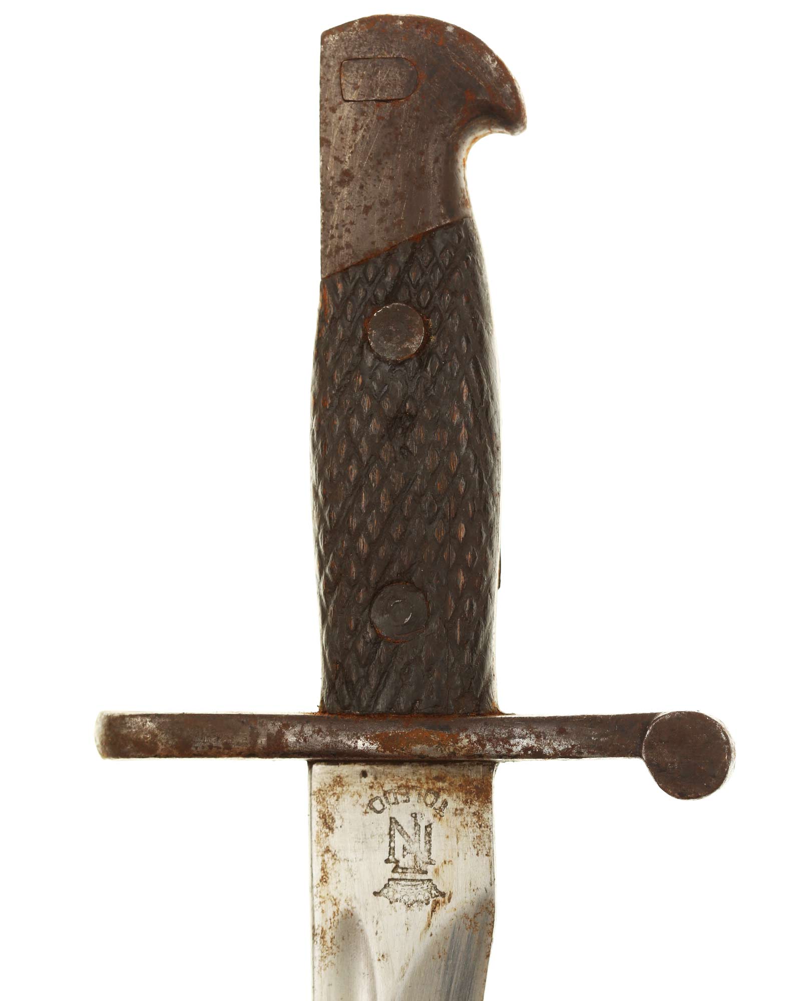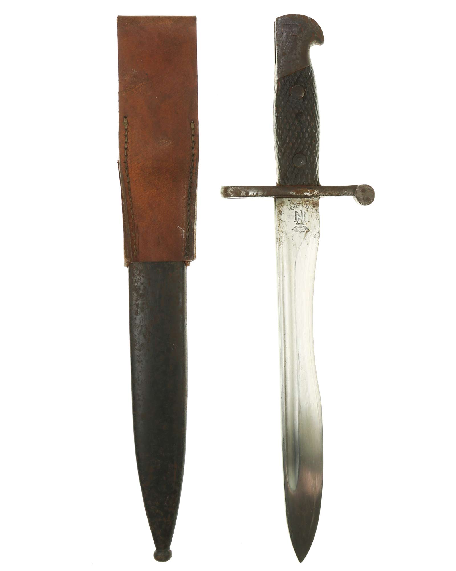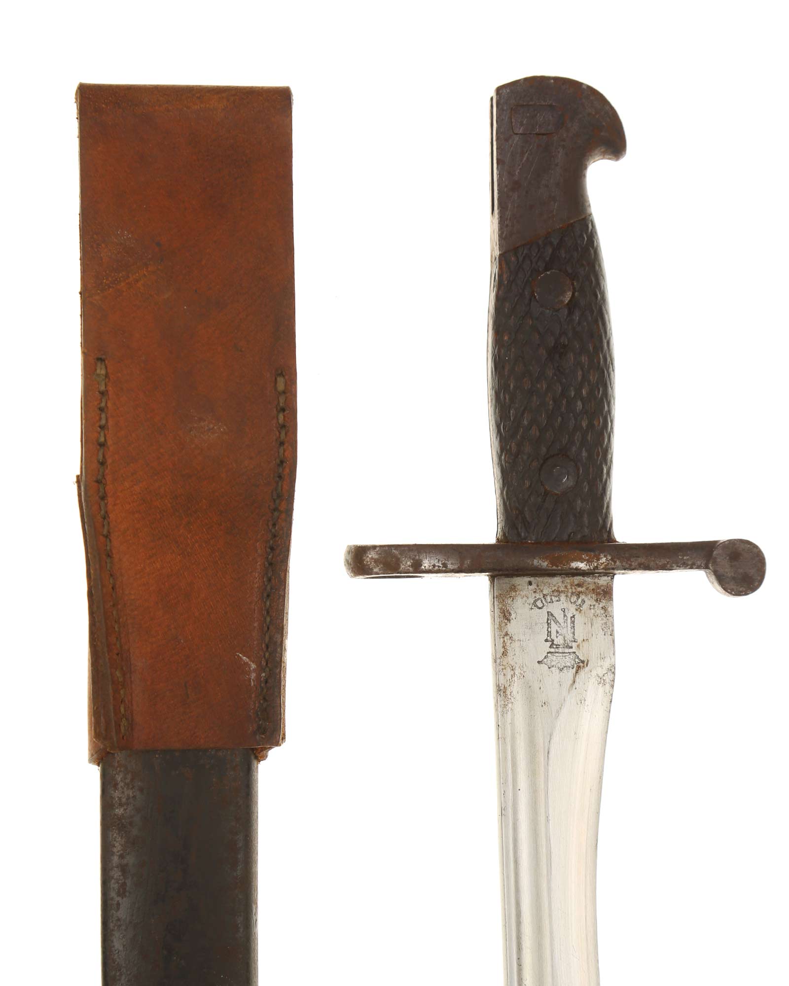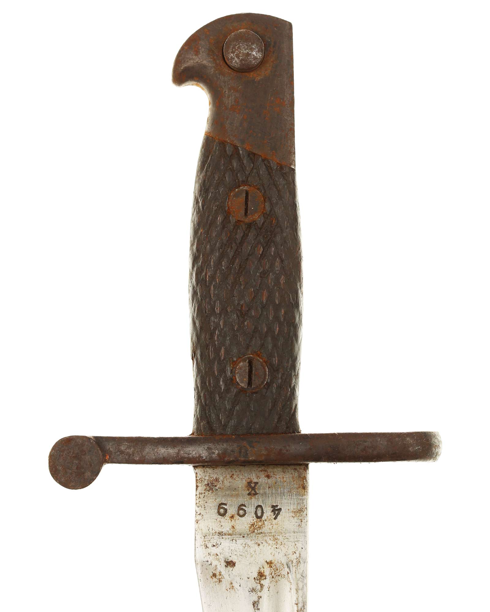 Spanisches Macheten Bajonett Modell 1941. Machetenbajonett mit geriffelten Holzgriffschalen für spanischen Karabiner 98/43. Die Klinge ist nummeriert: 4099 X. Bajonettdrücker funktioniert einwandfrei. Gesamtlänge 397 mm.