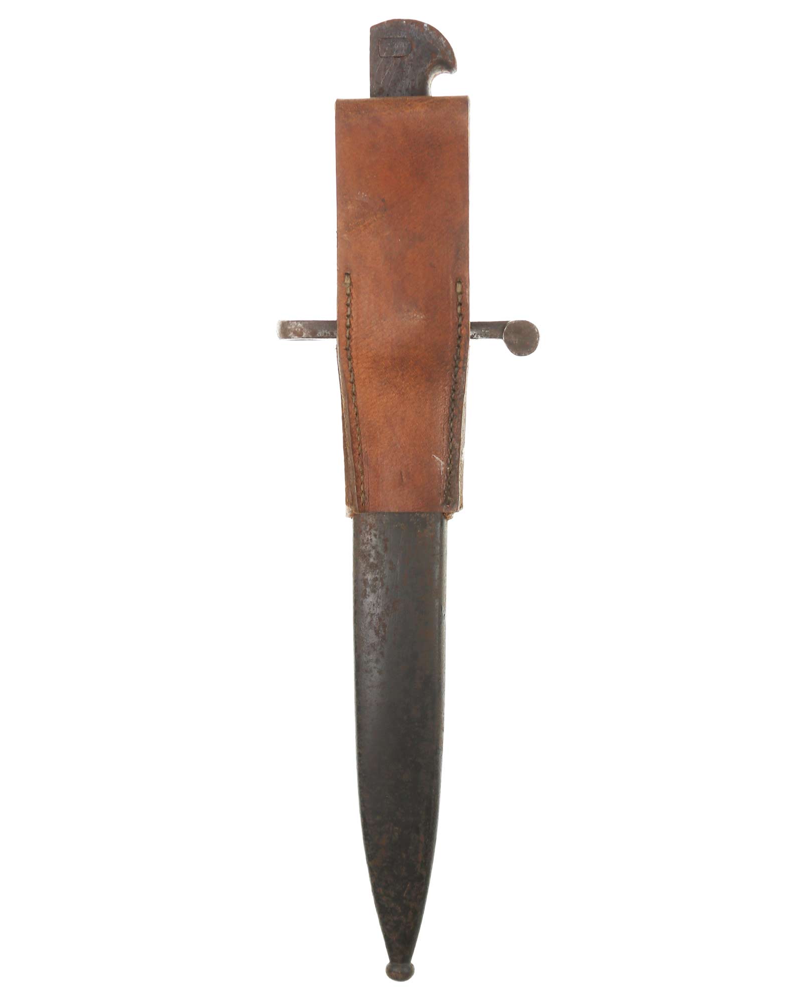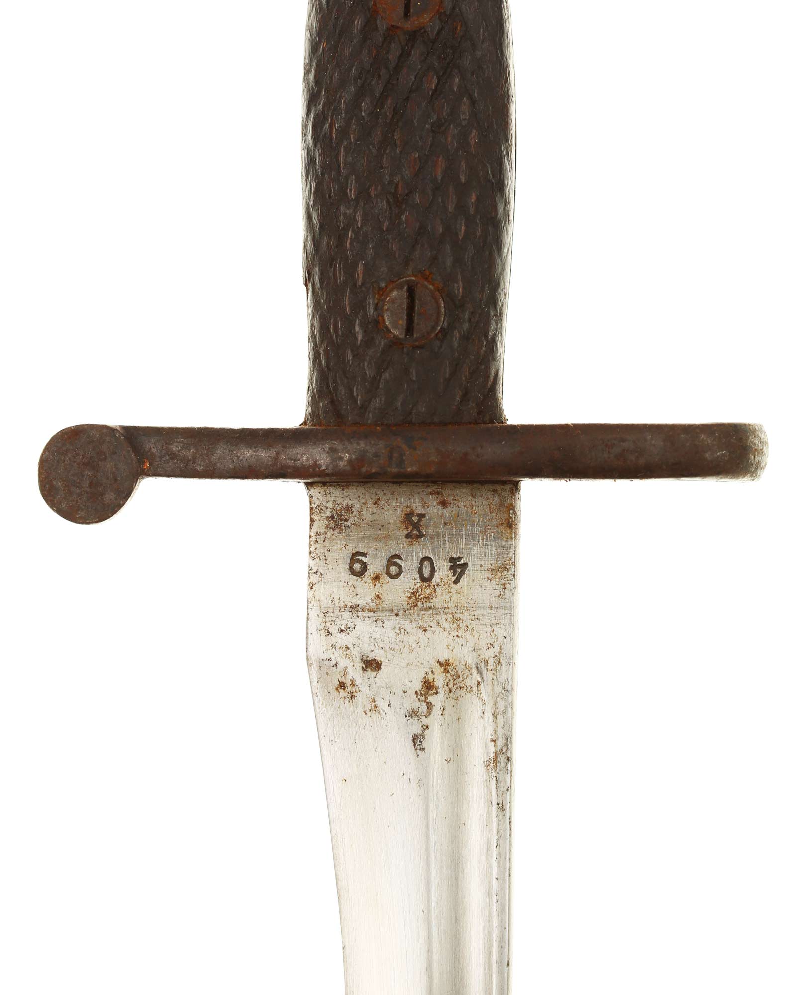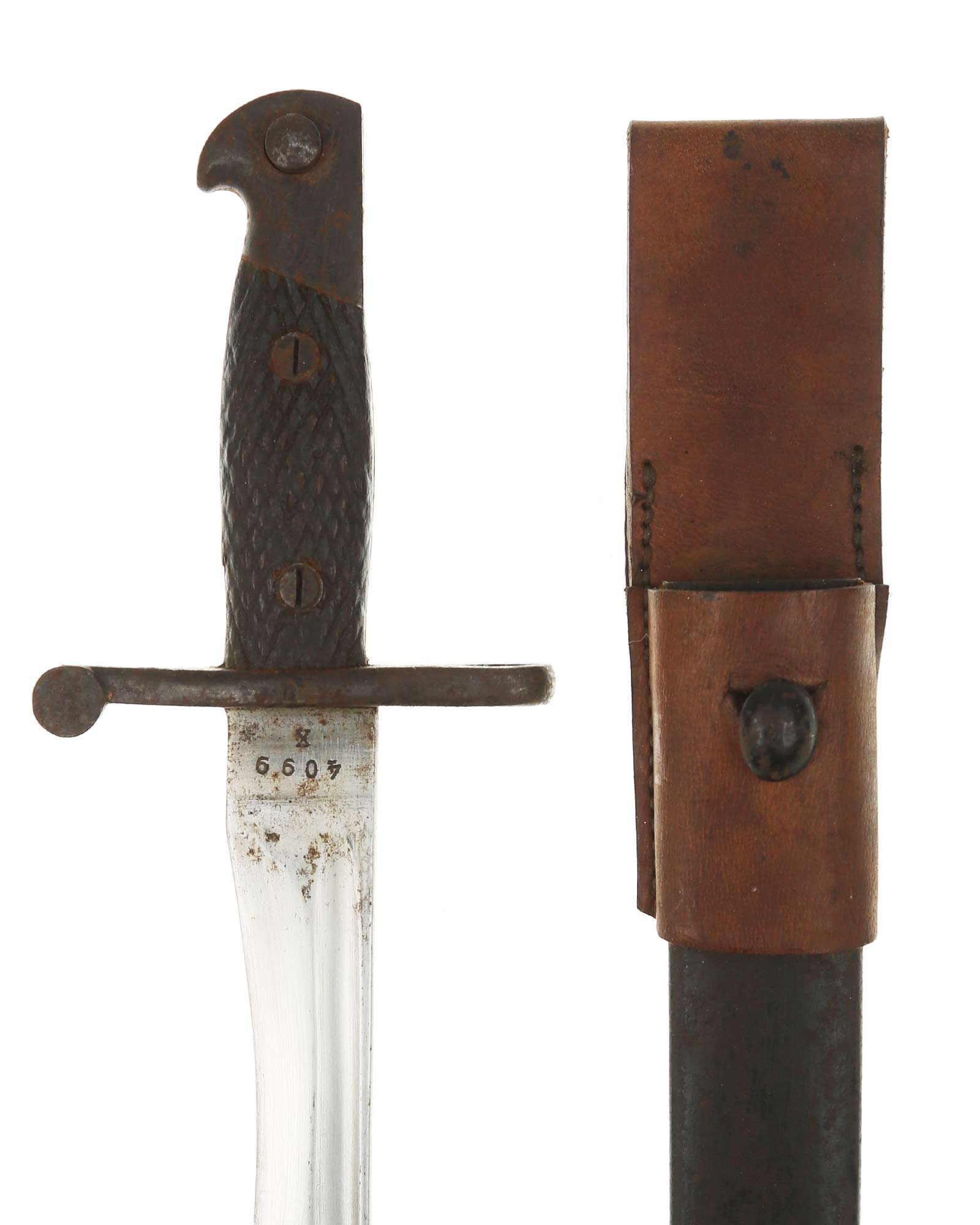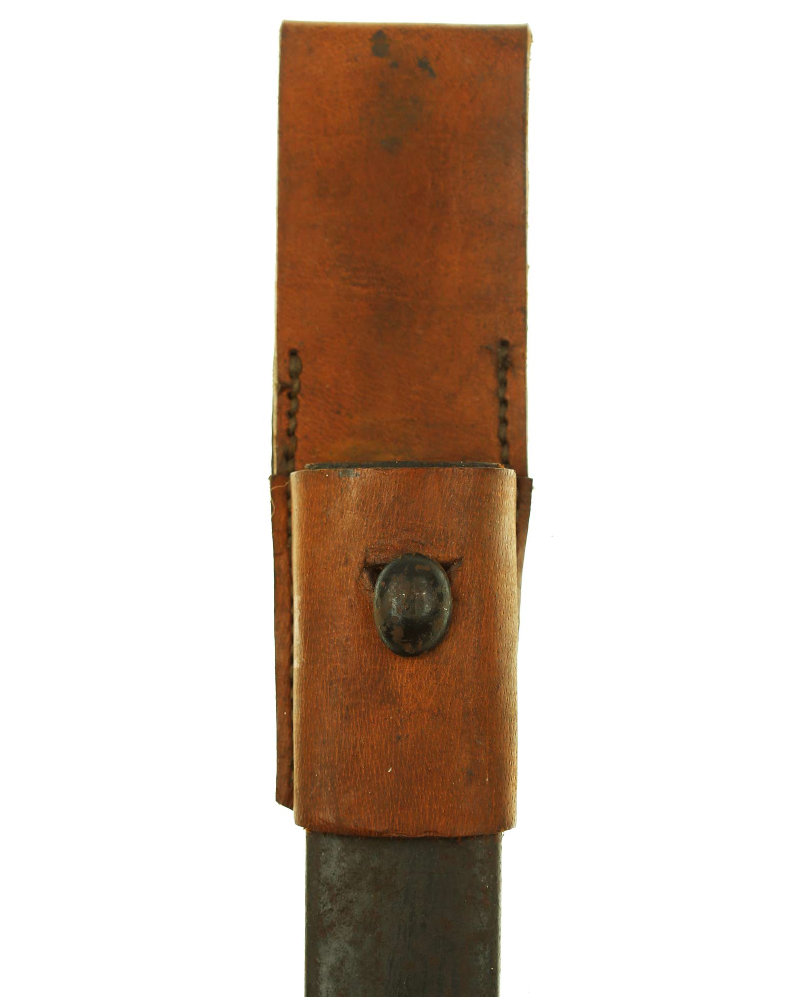 Spanisches Macheten Bajonett Modell 1941. Machetenbajonett mit geriffelten Holzgriffschalen für spanischen Karabiner 98/43. Die Klinge ist nummeriert: 4099 X. Bajonettdrücker funktioniert einwandfrei. Gesamtlänge 397 mm.