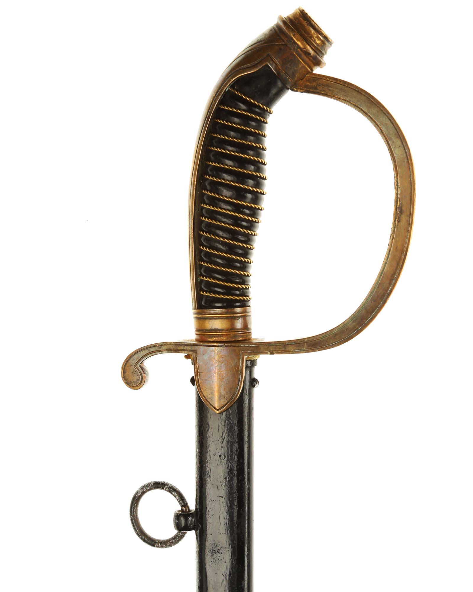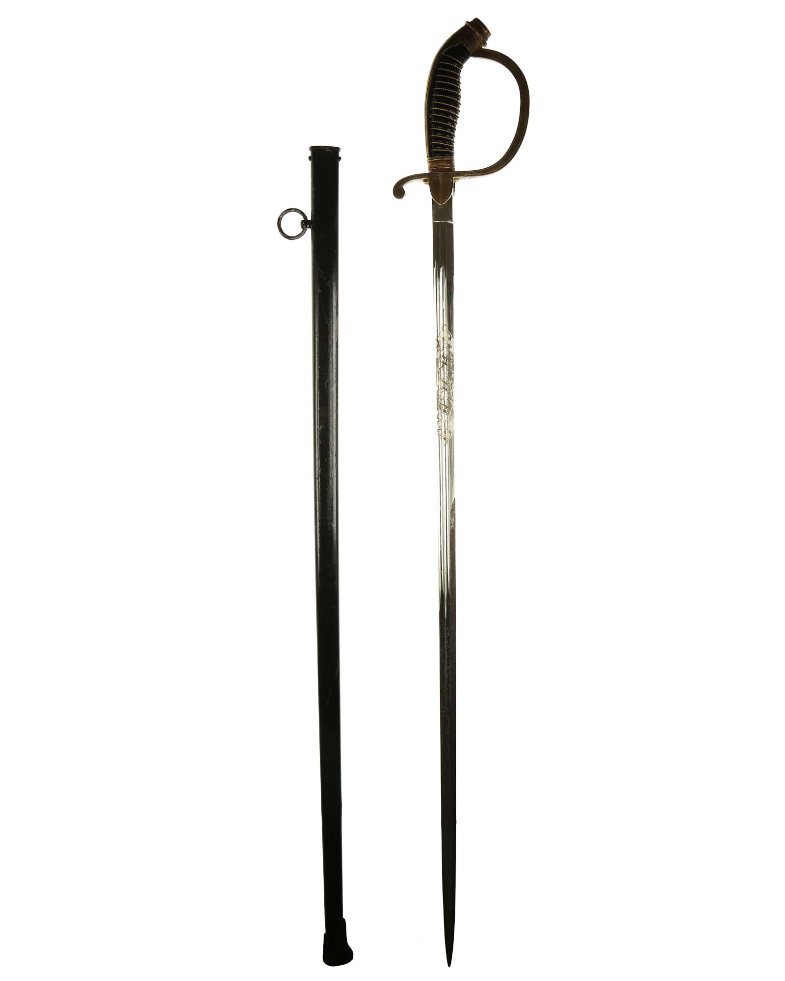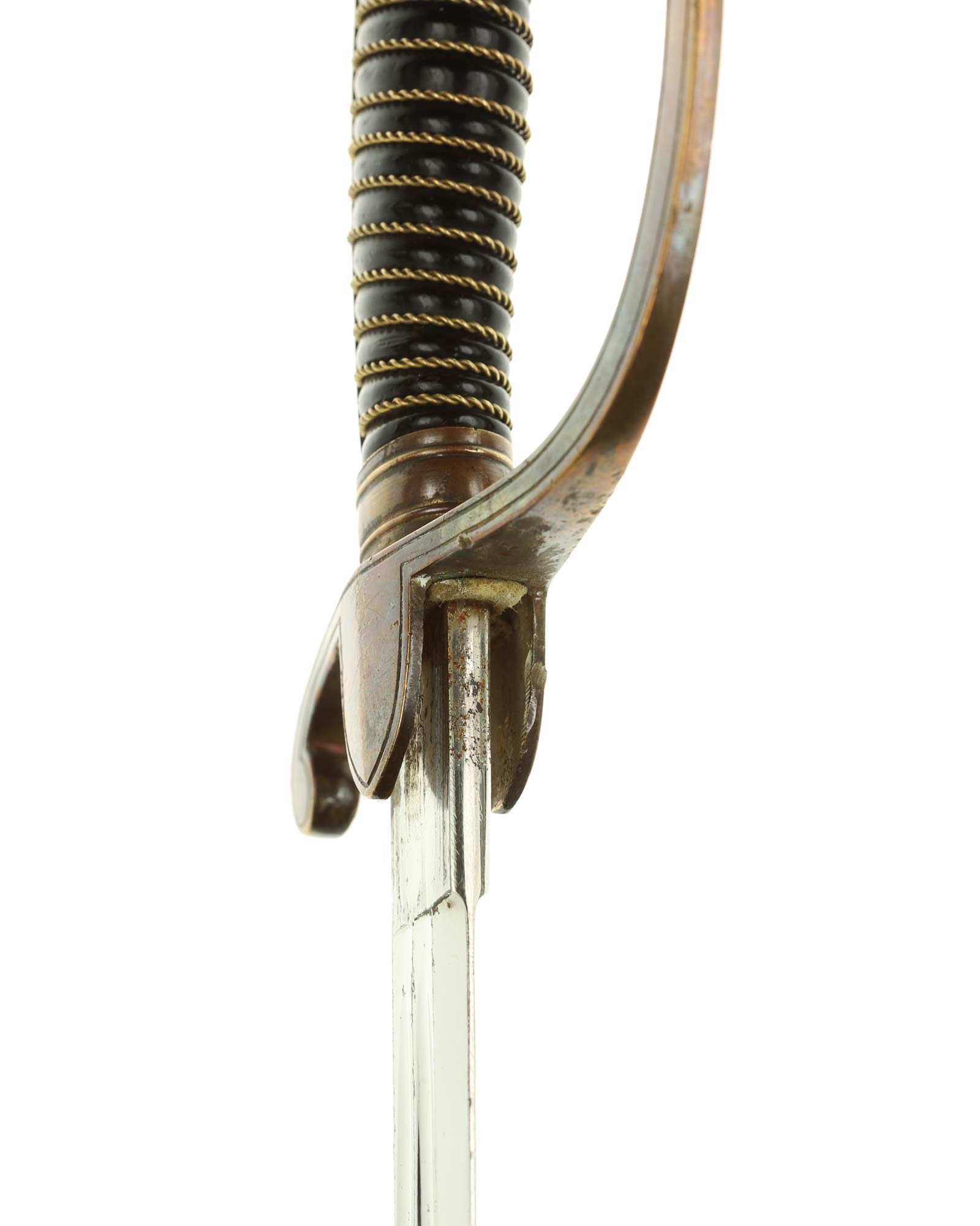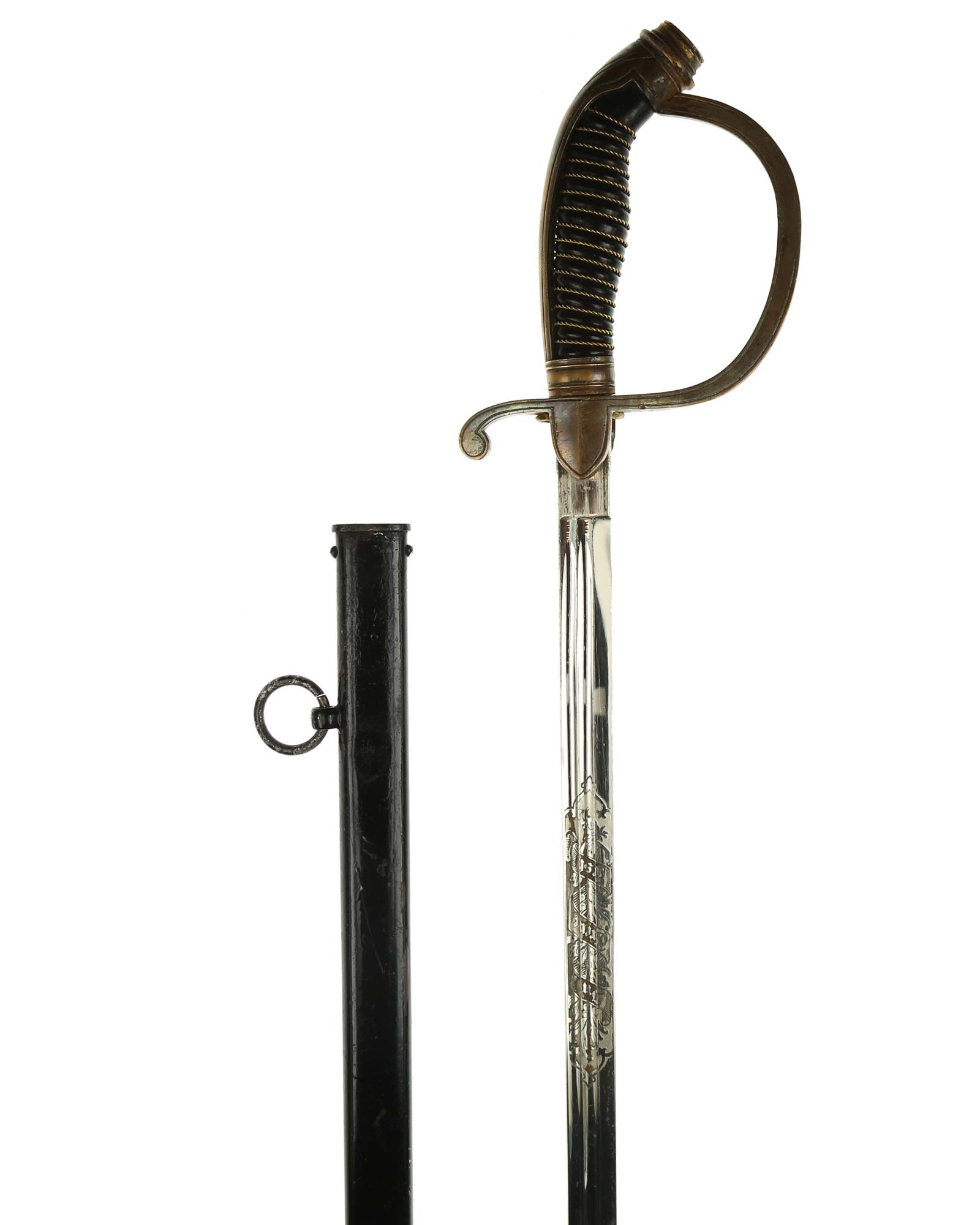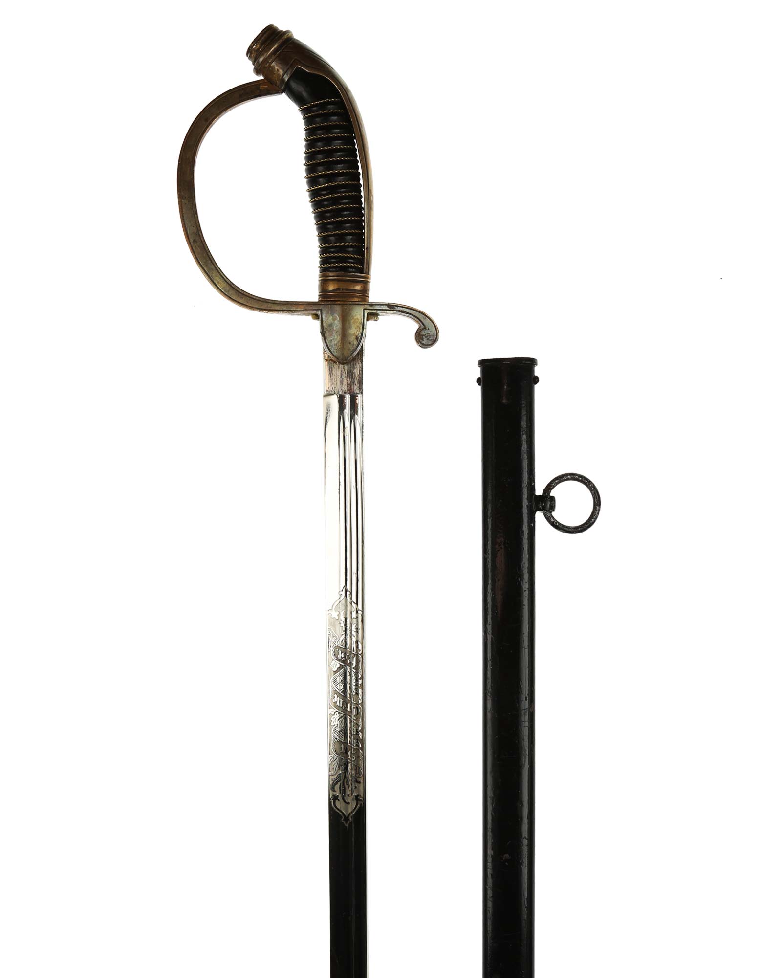 Bayerischer Interimsdegen für Kavallerie-Offiziere um 1900. Messinggefäß. Griff mit Drahtwicklung. Blanke Klinge mit Herstellermarkierung (Carl Eickhorn Solingen), beidseitig mit Ätzung (In Treue Fest!). Die Stahlscheide ist schwarz-lackiert.