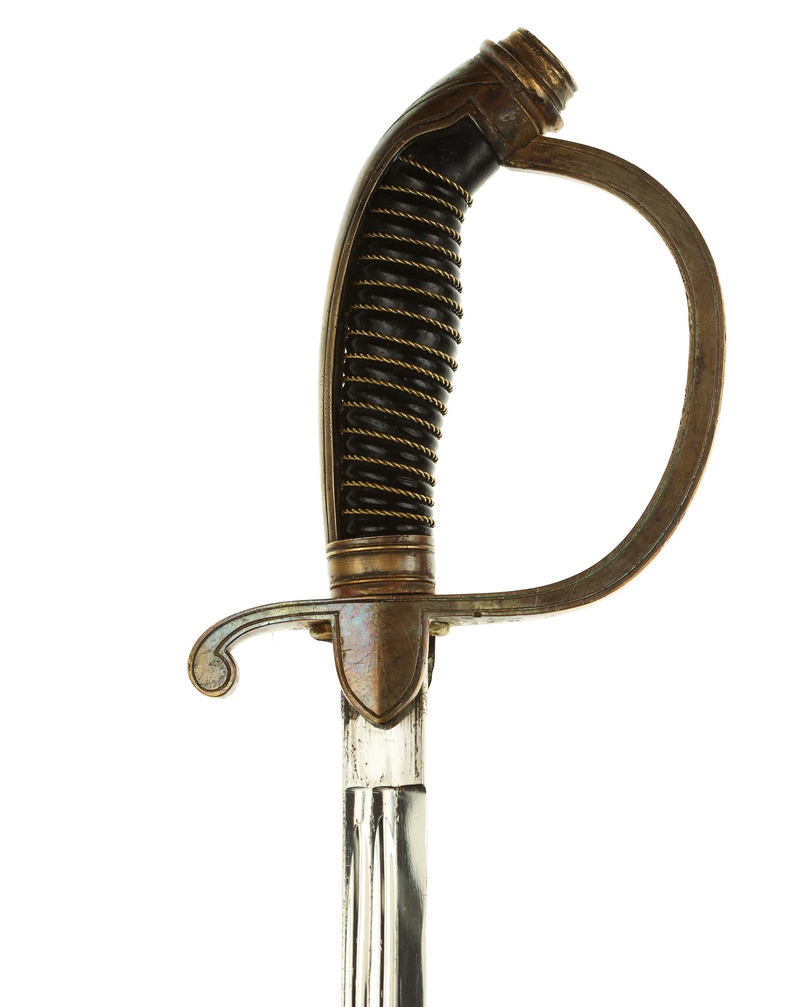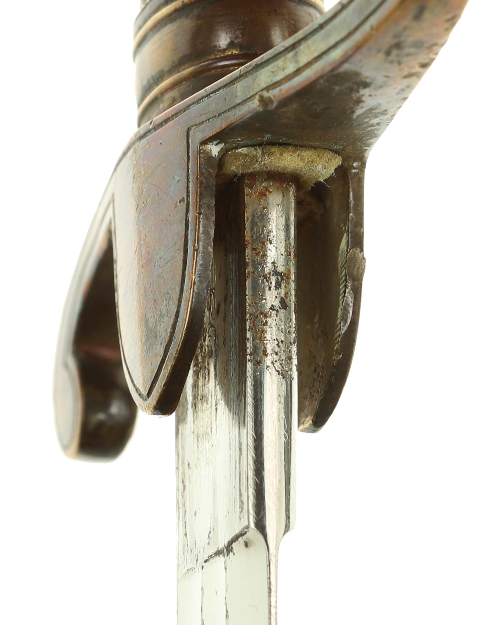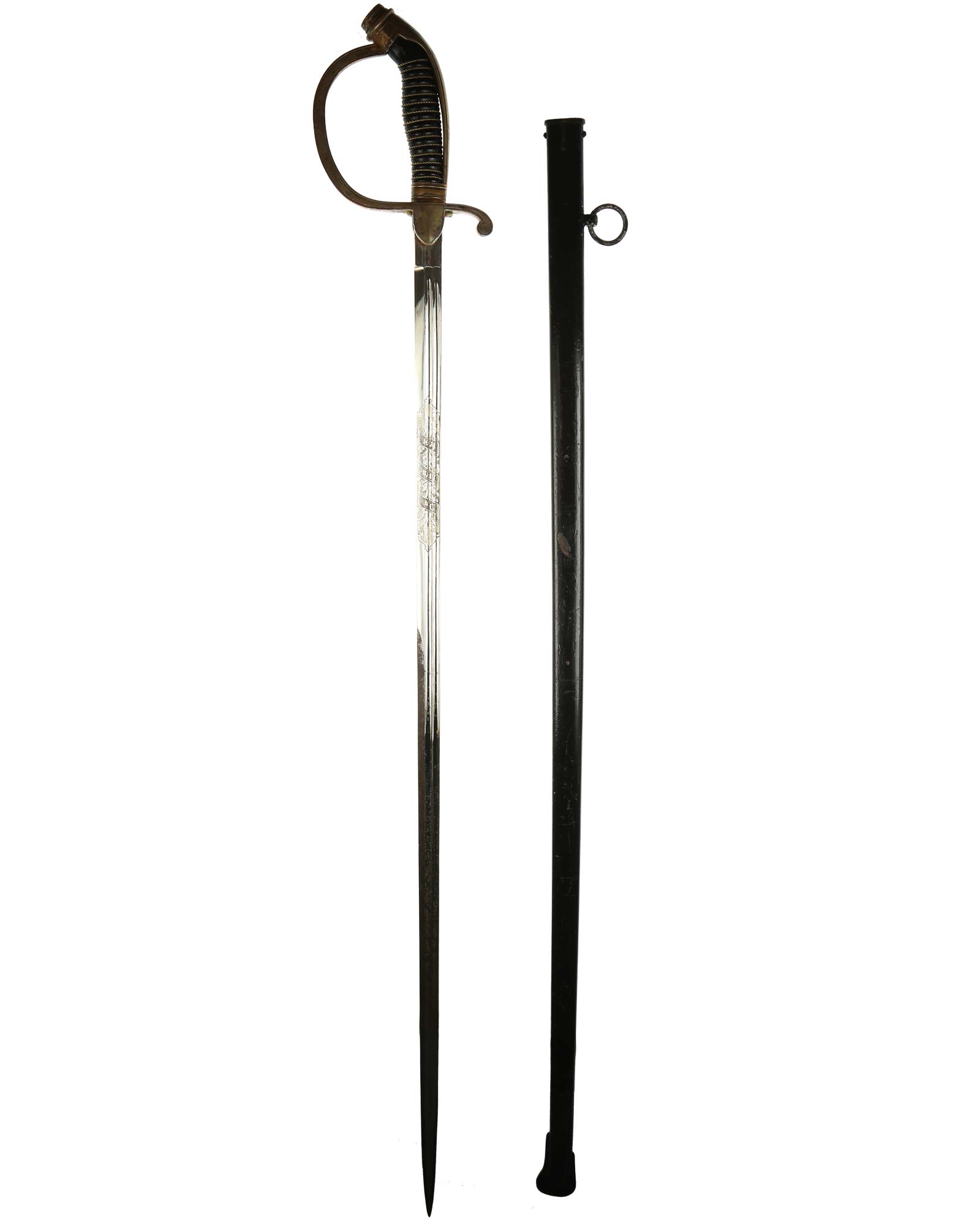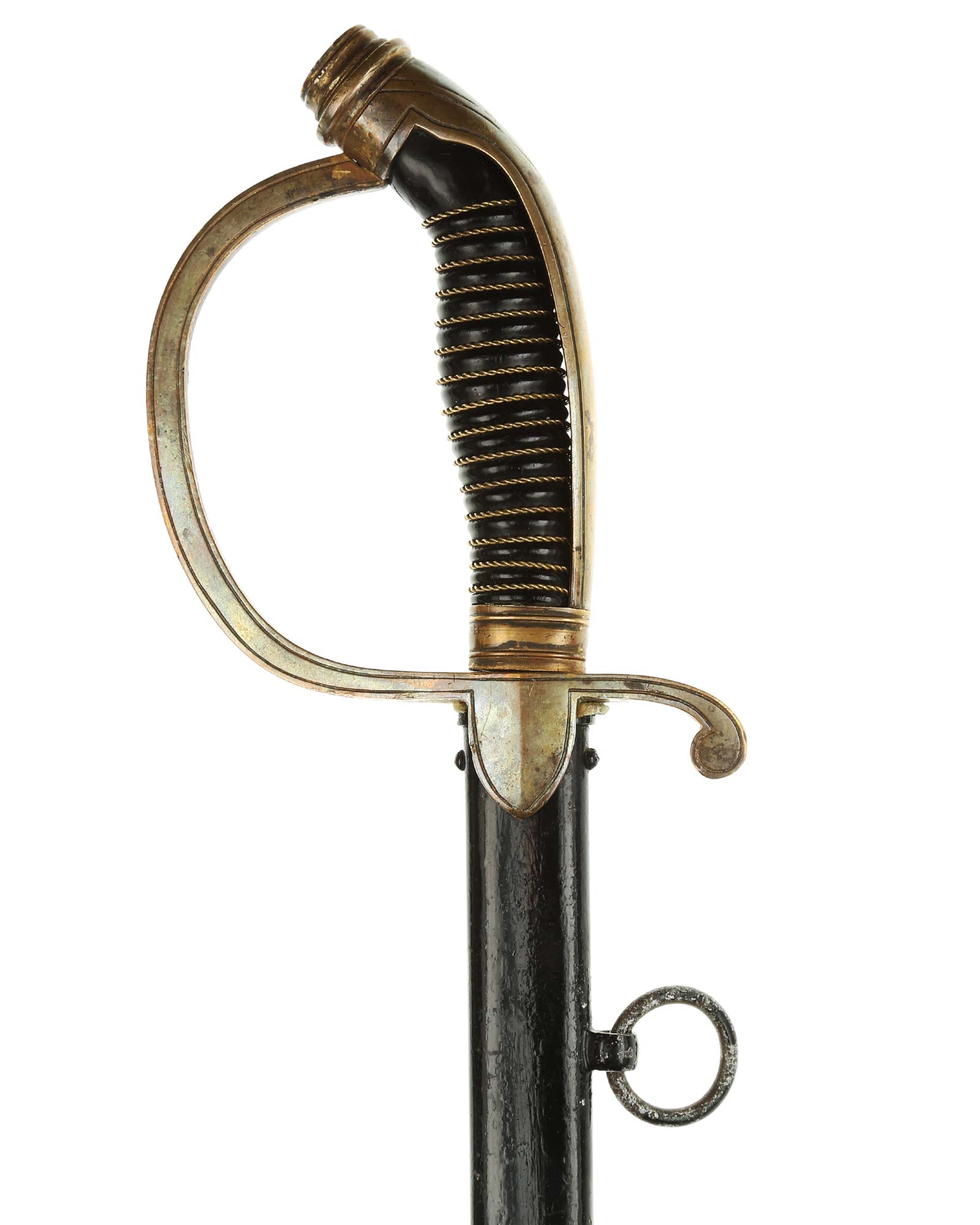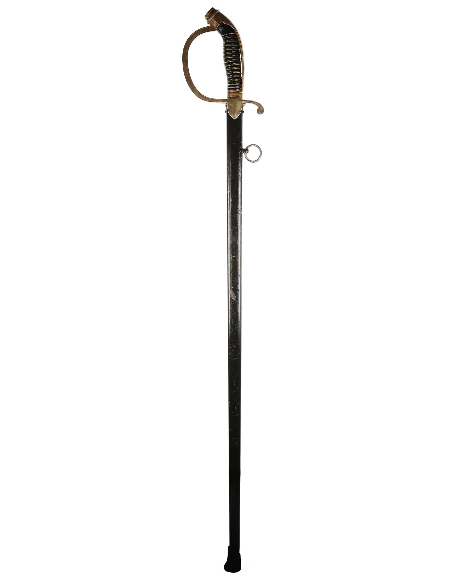 Bayerischer Interimsdegen für Kavallerie-Offiziere um 1900. Messinggefäß. Griff mit Drahtwicklung. Blanke Klinge mit Herstellermarkierung (Carl Eickhorn Solingen), beidseitig mit Ätzung (In Treue Fest!). Die Stahlscheide ist schwarz-lackiert.
