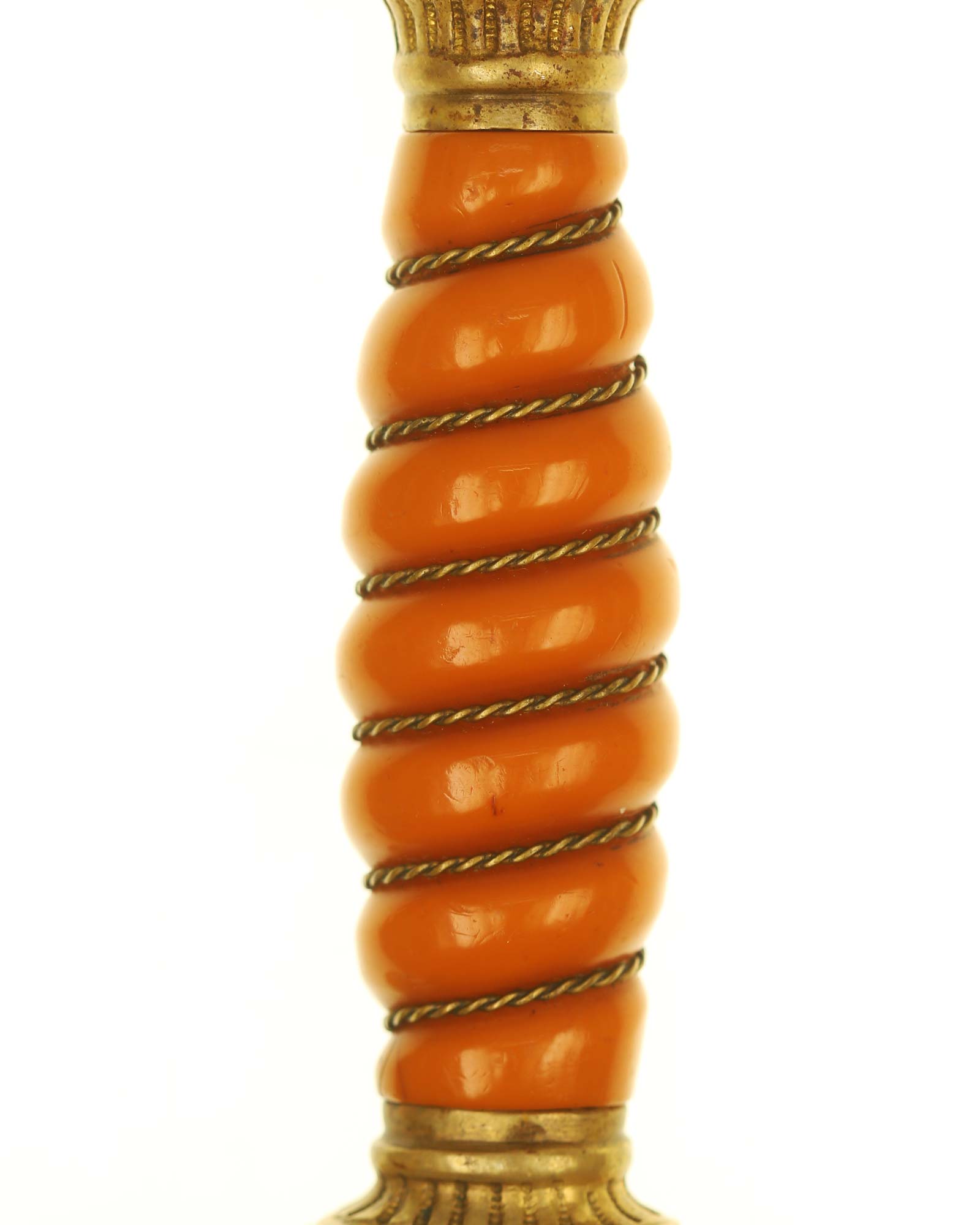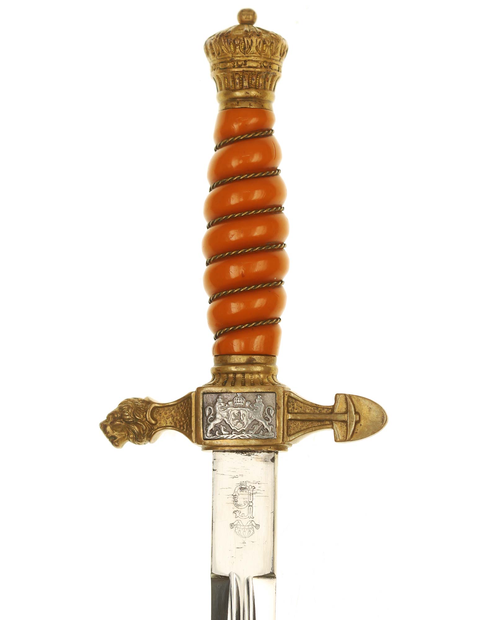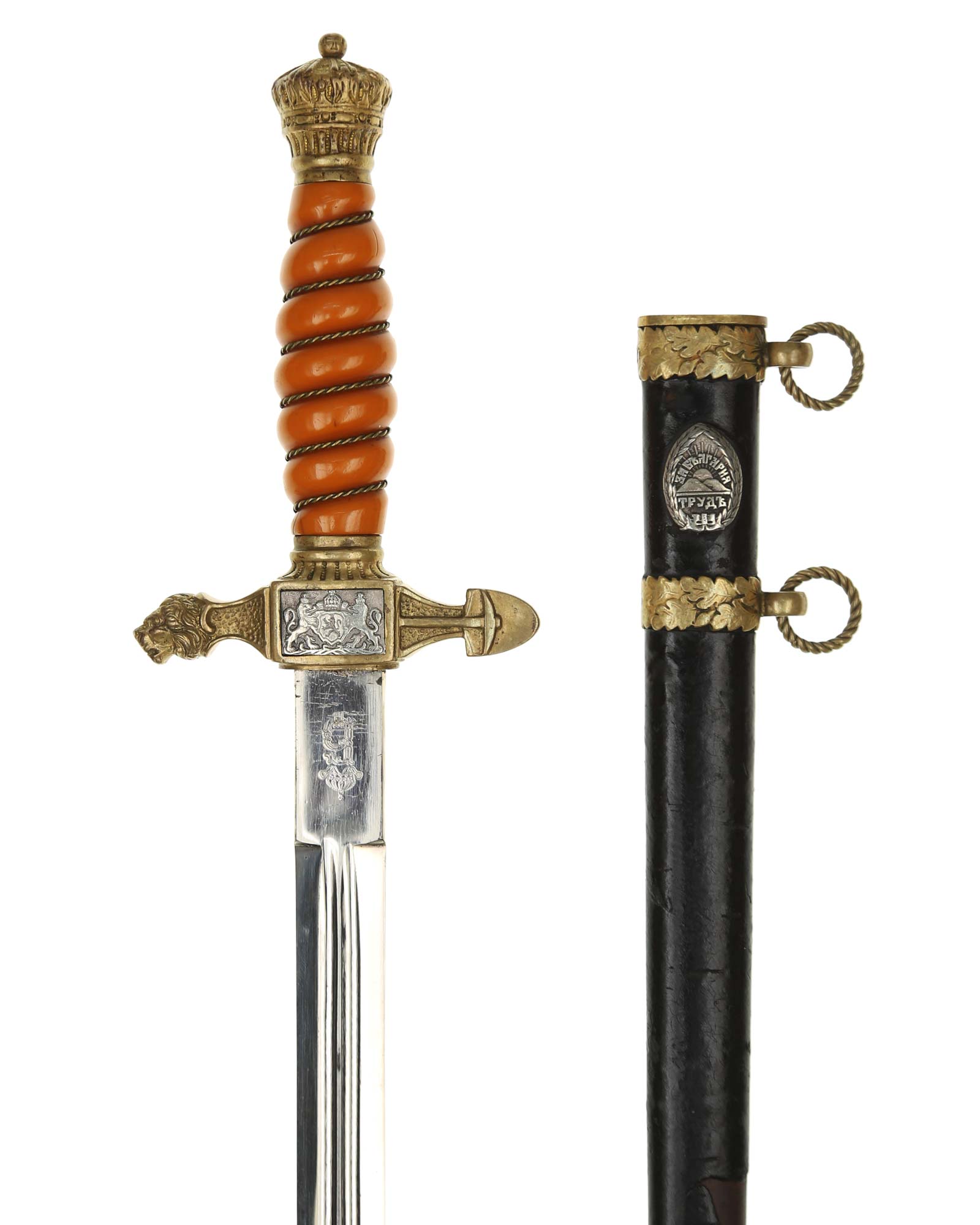 Griff: Heller Griff, verläuft leicht oval. Der Griff ist mit einem Doppeldraht gewickelt. Die Parierstange und der Knauf sind aus Buntmetall gefertigt. Der Kopf des Griffs ist aus Messingguss und hat die Form einer Krone. Die untere Hülse ist aus Messing, mit einem Reliefornament aus Eichenblättern. Der Querbalken ist aus Messing, massiv, auf der einen Seite mit einem leicht nach unten geneigten Löwenkopf, auf der anderen Seite mit einer stilisierten Darstellung einer Schaufel und einer Spitzhacke. In der Mitte befindet sich auf einer rechteckigen Platte aus weißem Metall eine Abbildung des bulgarischen Wappens, auf der Rückseite ein Rechteck ohne Abbildung.