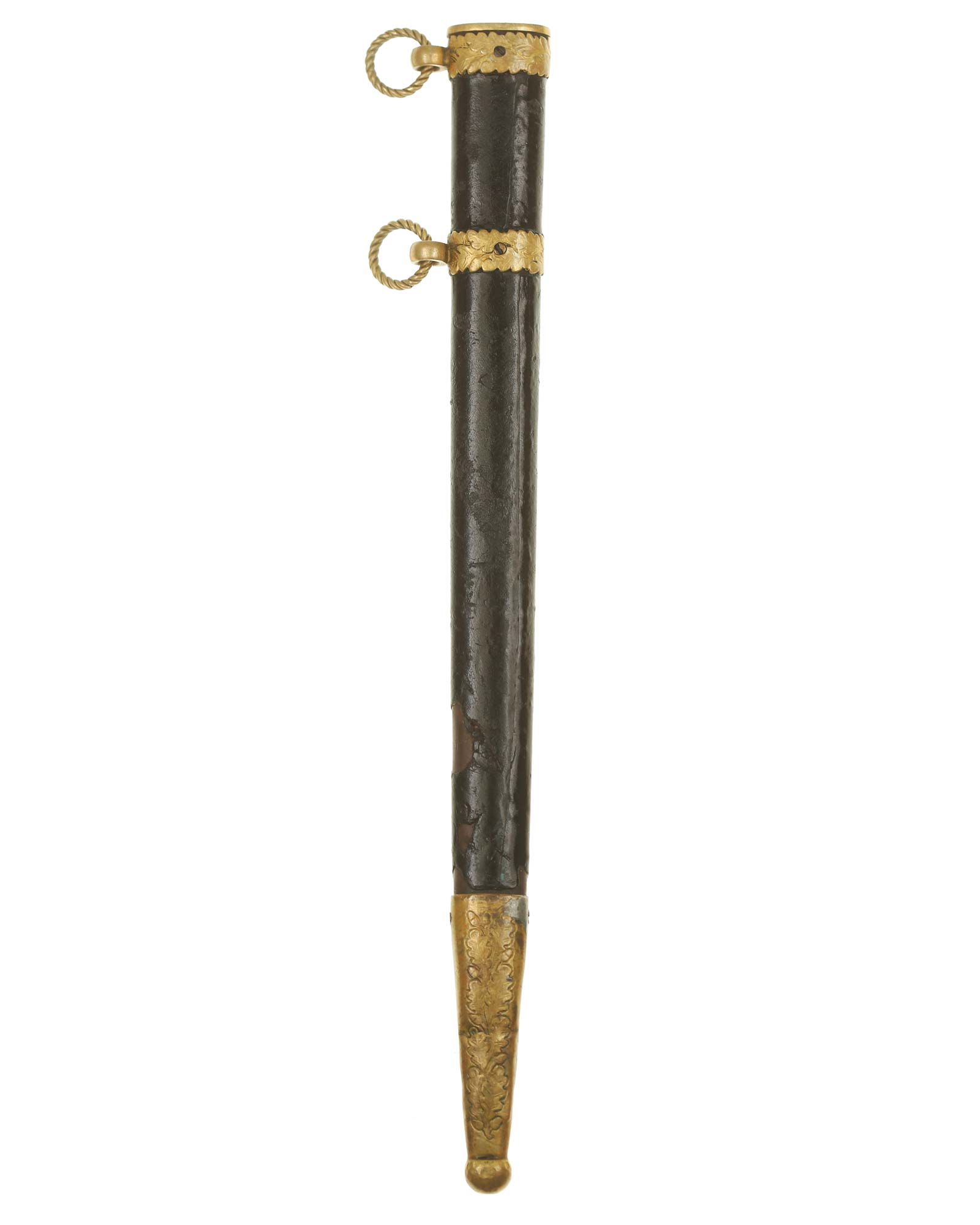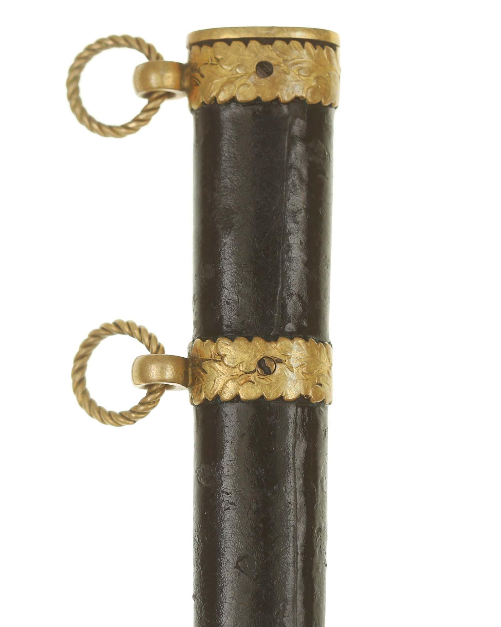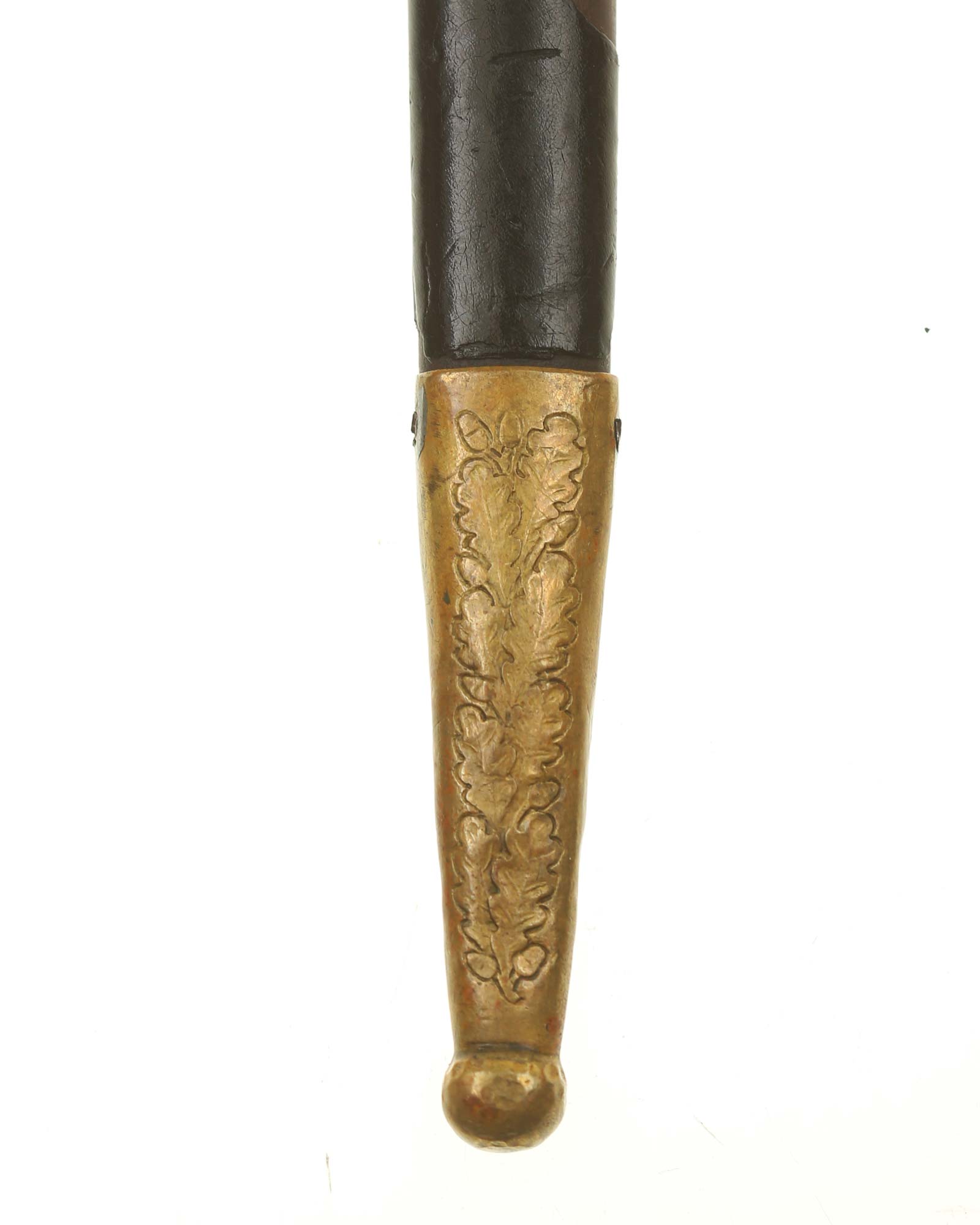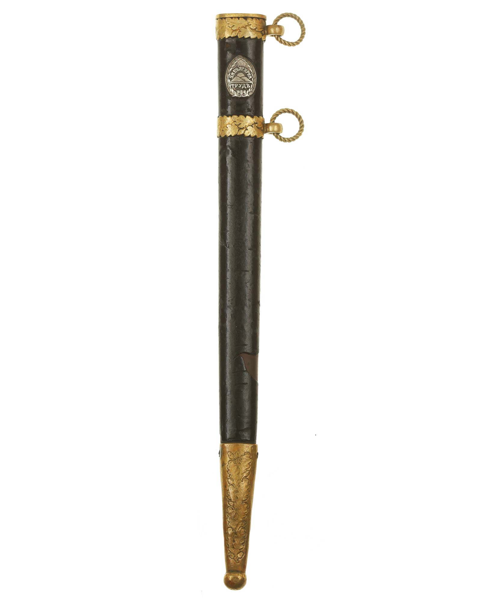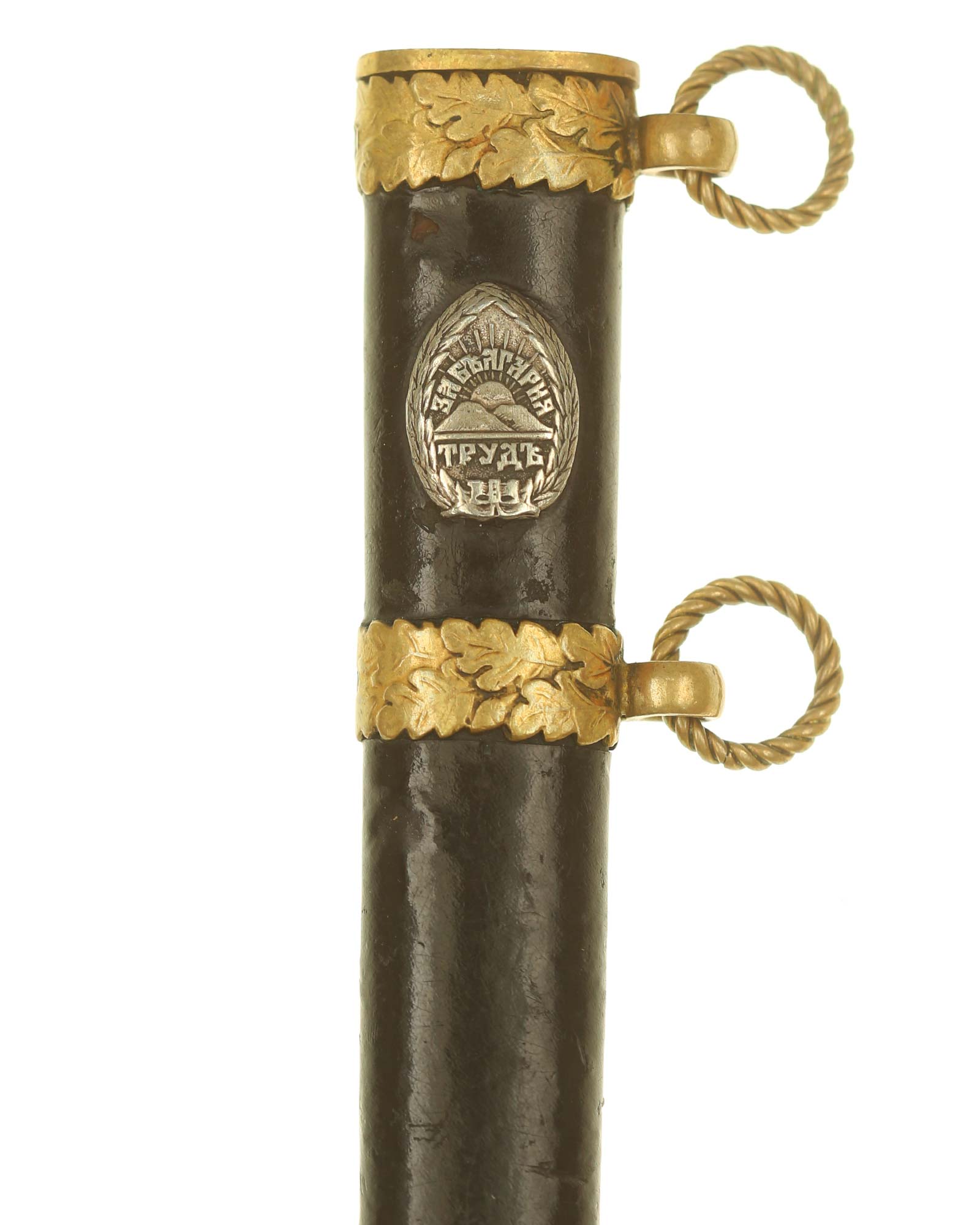 Scheide: Die Scheide ist aus Leder, schwarz. Die Vorrichtung der Scheide ist aus Messing und besteht aus einer Spitze, verziert mit einem Ornament aus Eichenblättern, einem Mund und einer Nuss. Das Maul und die Nuss sind in Form eines Bandes aus Eichenblättern mit Reliefringen zur Befestigung der Riemen des Harnischs ausgeführt. Auf der Vorderseite der Scheide ist ein weißes Metallschild mit dem Emblem der Arbeitsfront und ihrem Motto „Arbeit für Bulgarien! , Труд за Болгарию!“ angebracht.