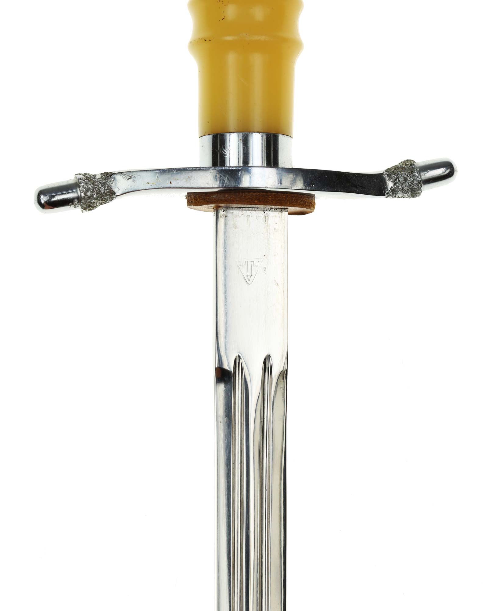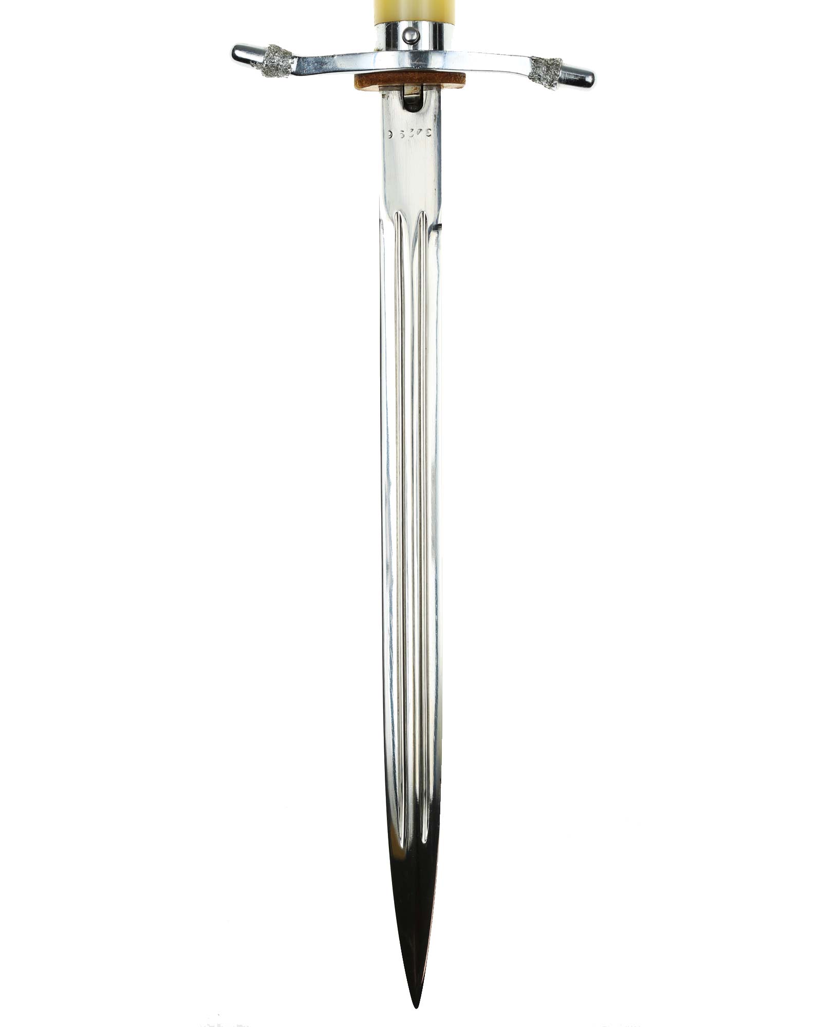 Klinge: Zweischneidige, vernickelte Stahlklinge in sehr gutem Zustand,