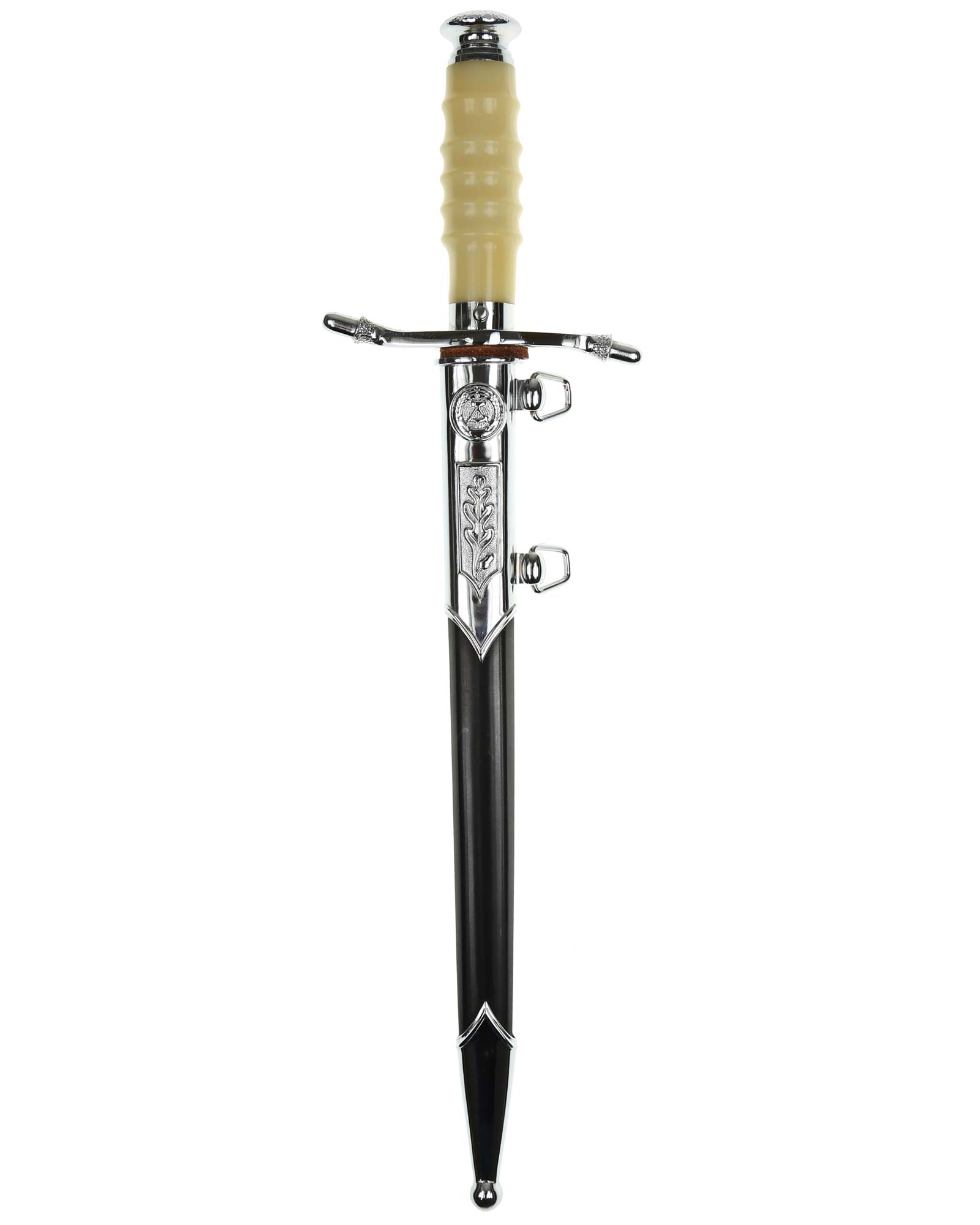 NVA / DDR Offiziersdolch mit Verleihungsnummer. Weißer Kunststoffgriff, versilberte Beschläge, brünierter Scheidenkorpus. Blanke Klinge mit eingeschlagener Nummer #84611. Ungetragener Zustand.