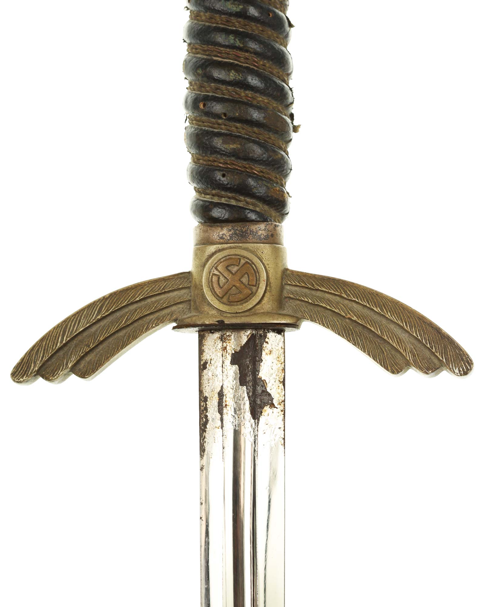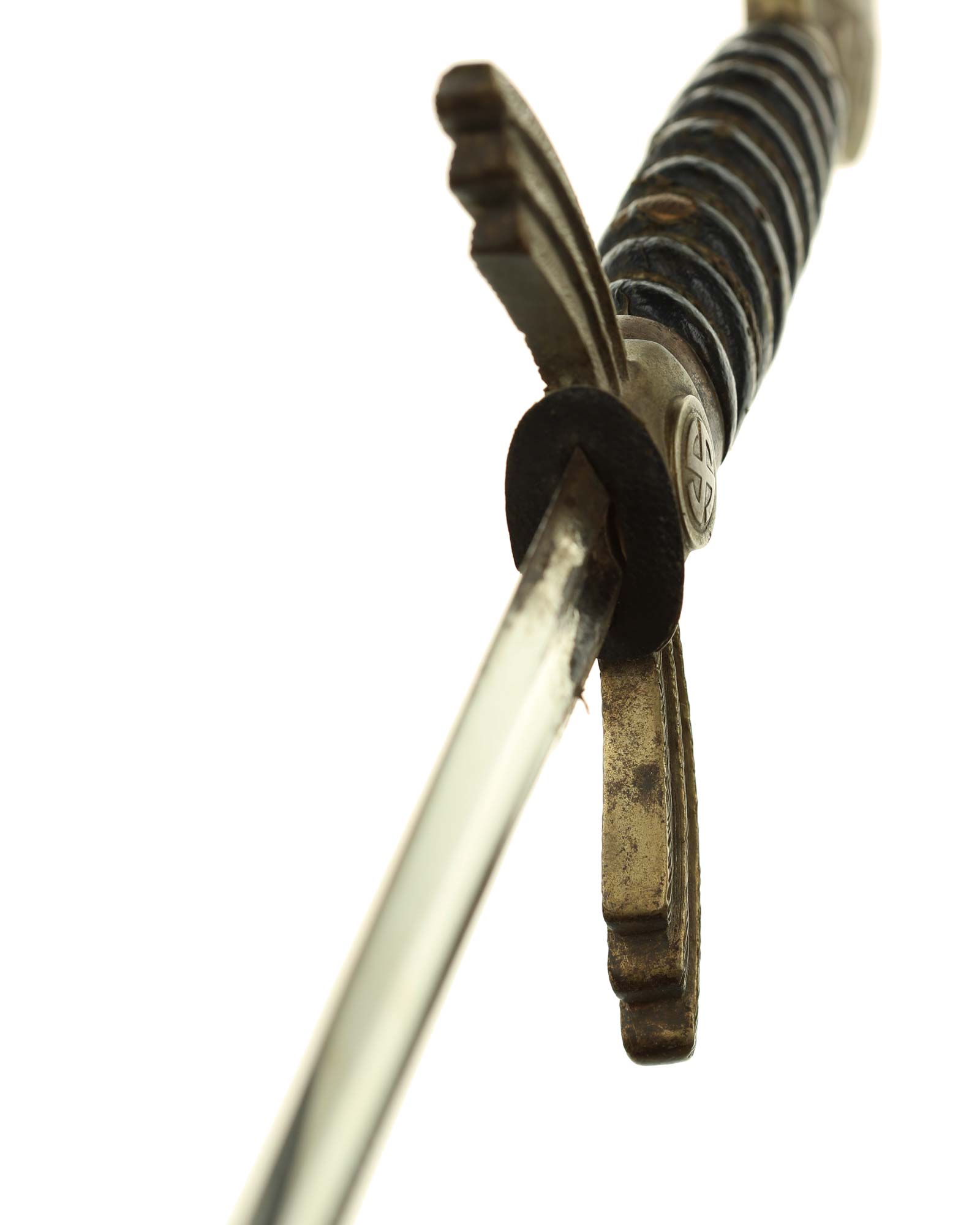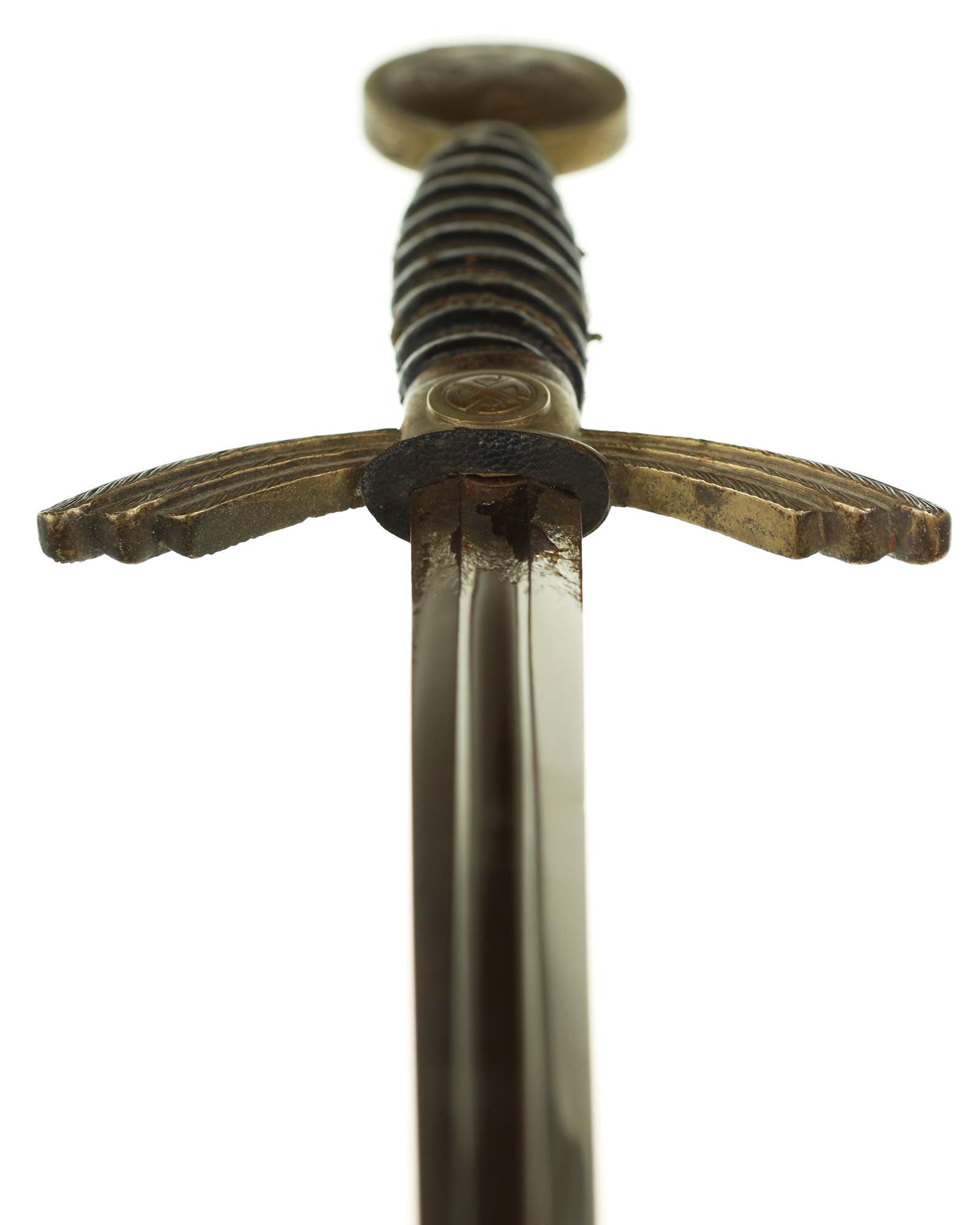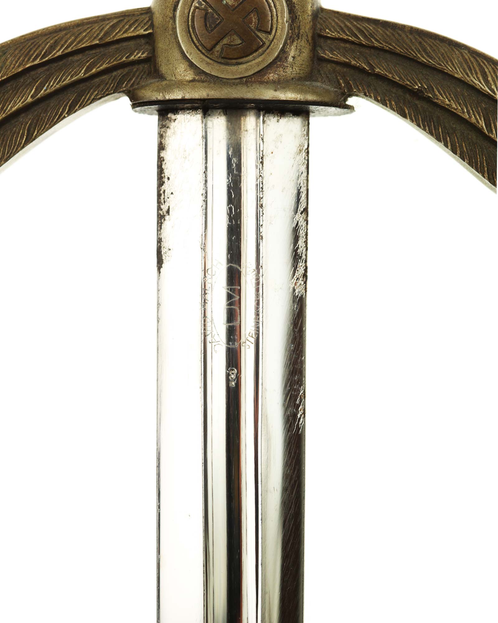 Fliegerschwert der Luftwaffe [Modell 1935] in früher Fertigung. Die Gesamtlänge beträgt 92,0 cm. Die Rückseite der Klinge ist mit Hersteller: David Malsch Steinbach.