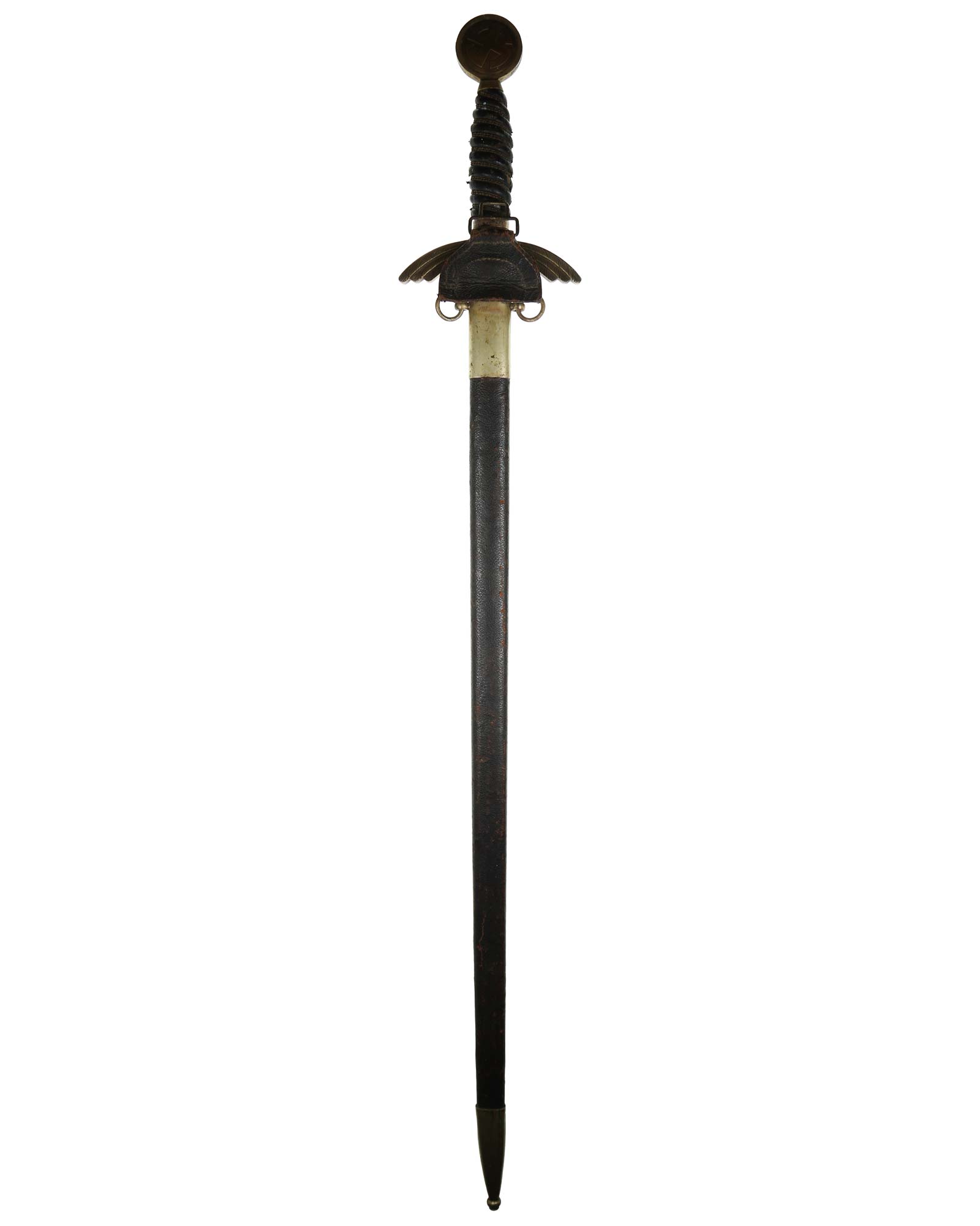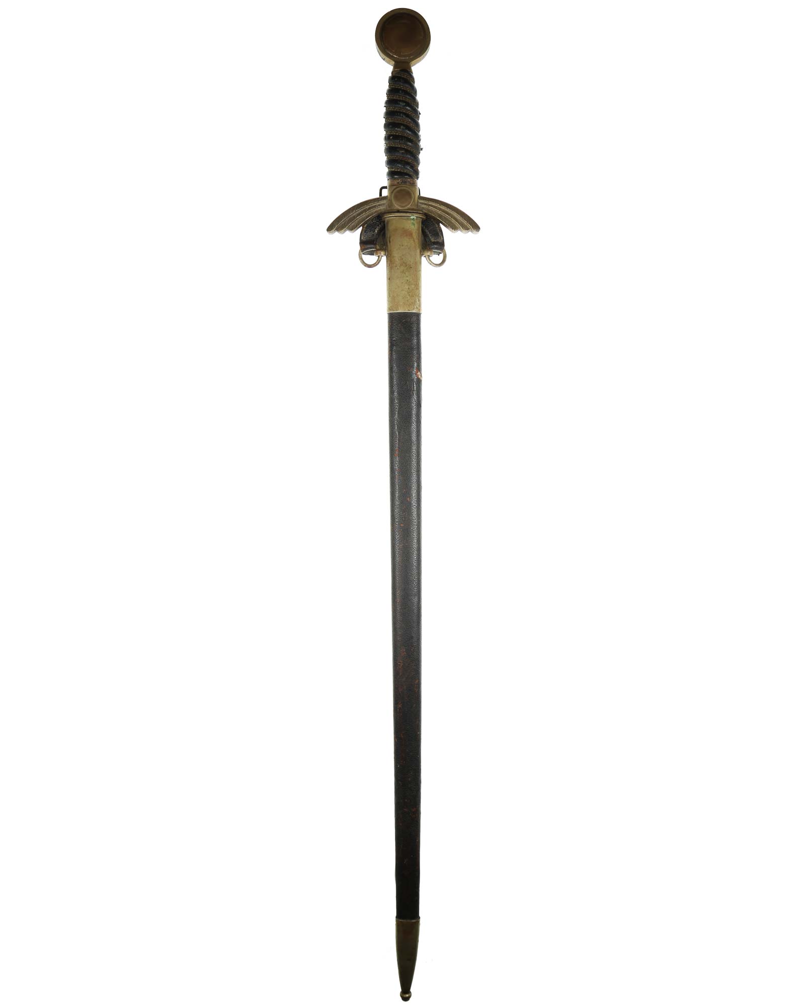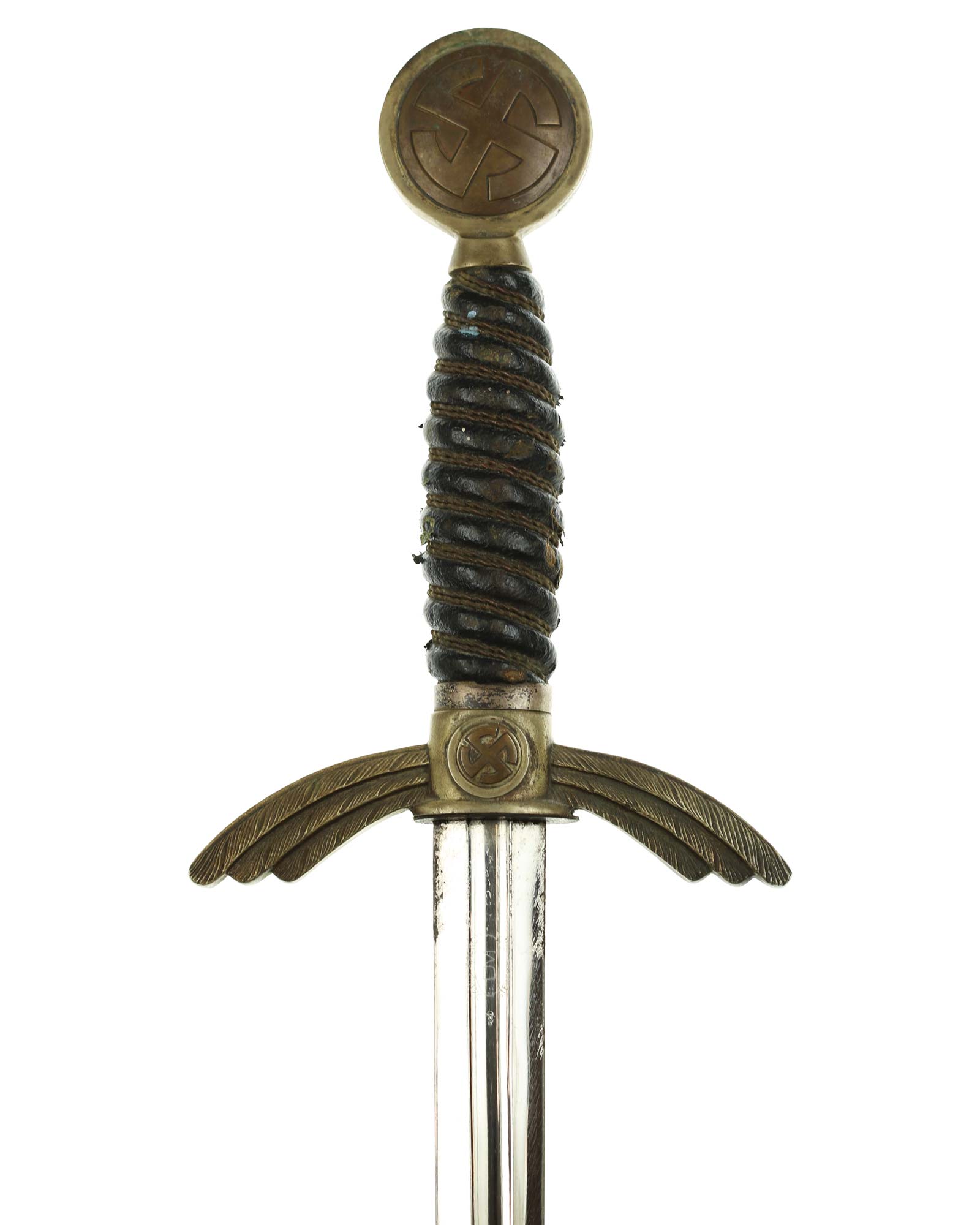 Fliegerschwert der Luftwaffe [Modell 1935] in früher Fertigung. Die Gesamtlänge beträgt 92,0 cm. Die Rückseite der Klinge ist mit Hersteller: David Malsch Steinbach.