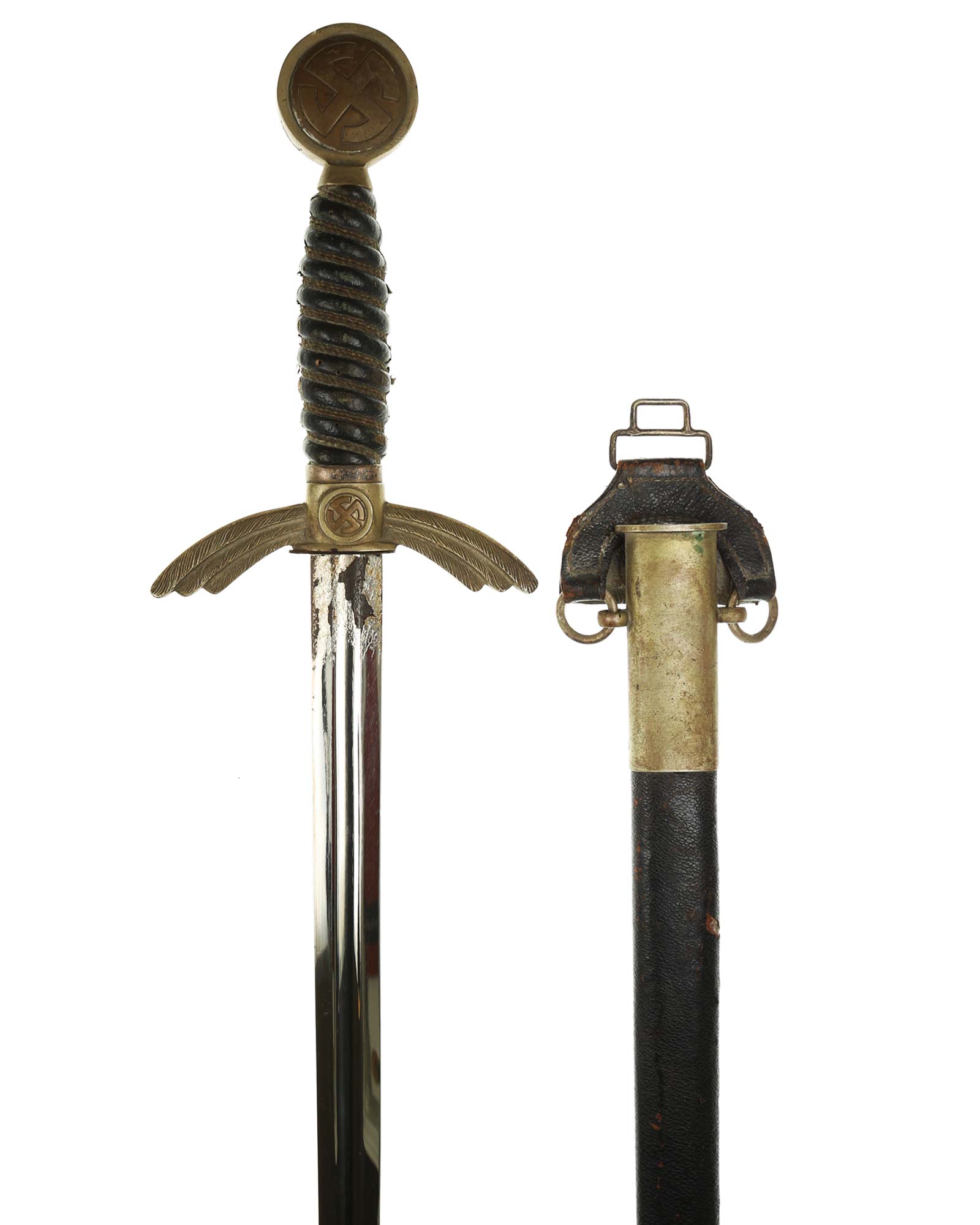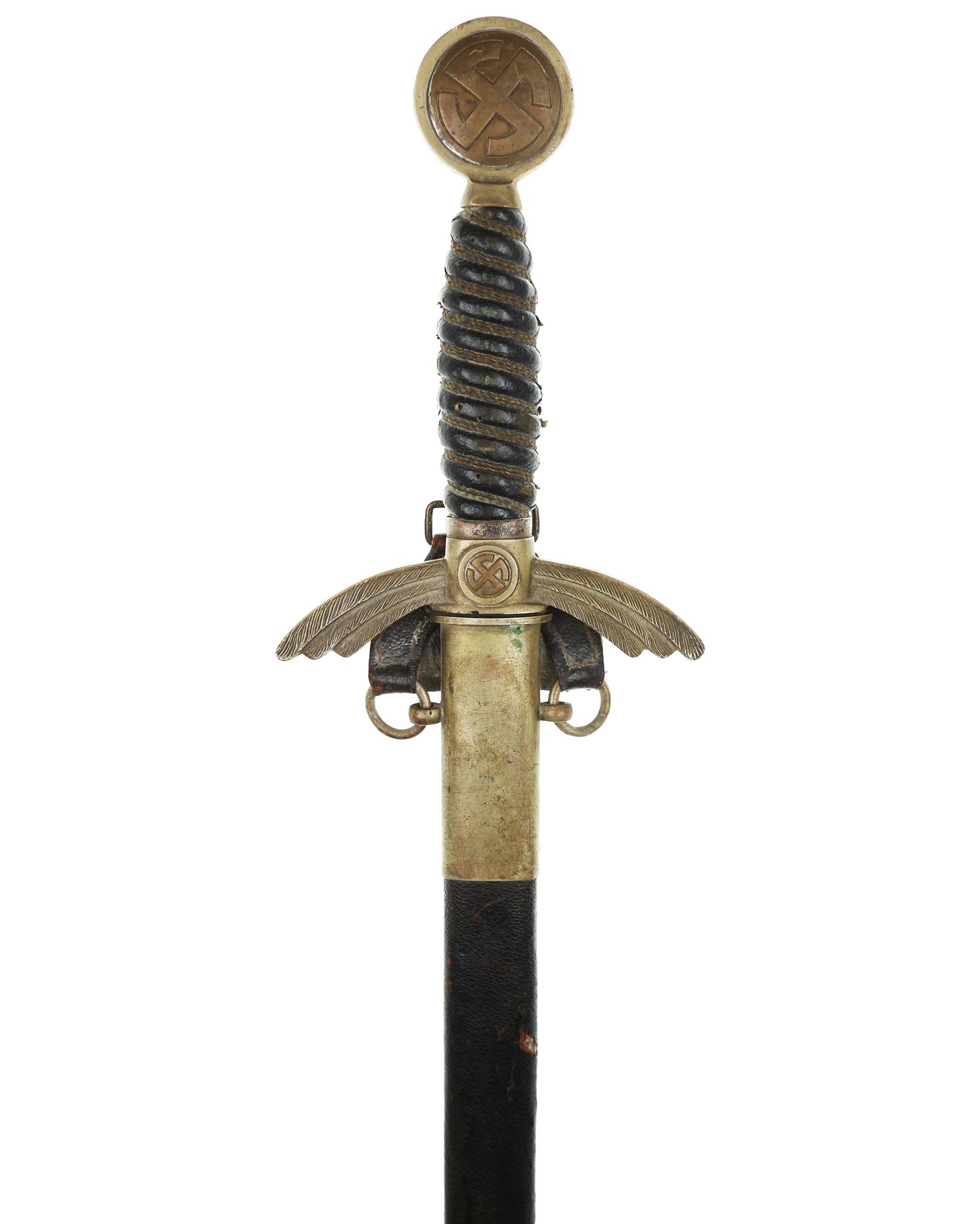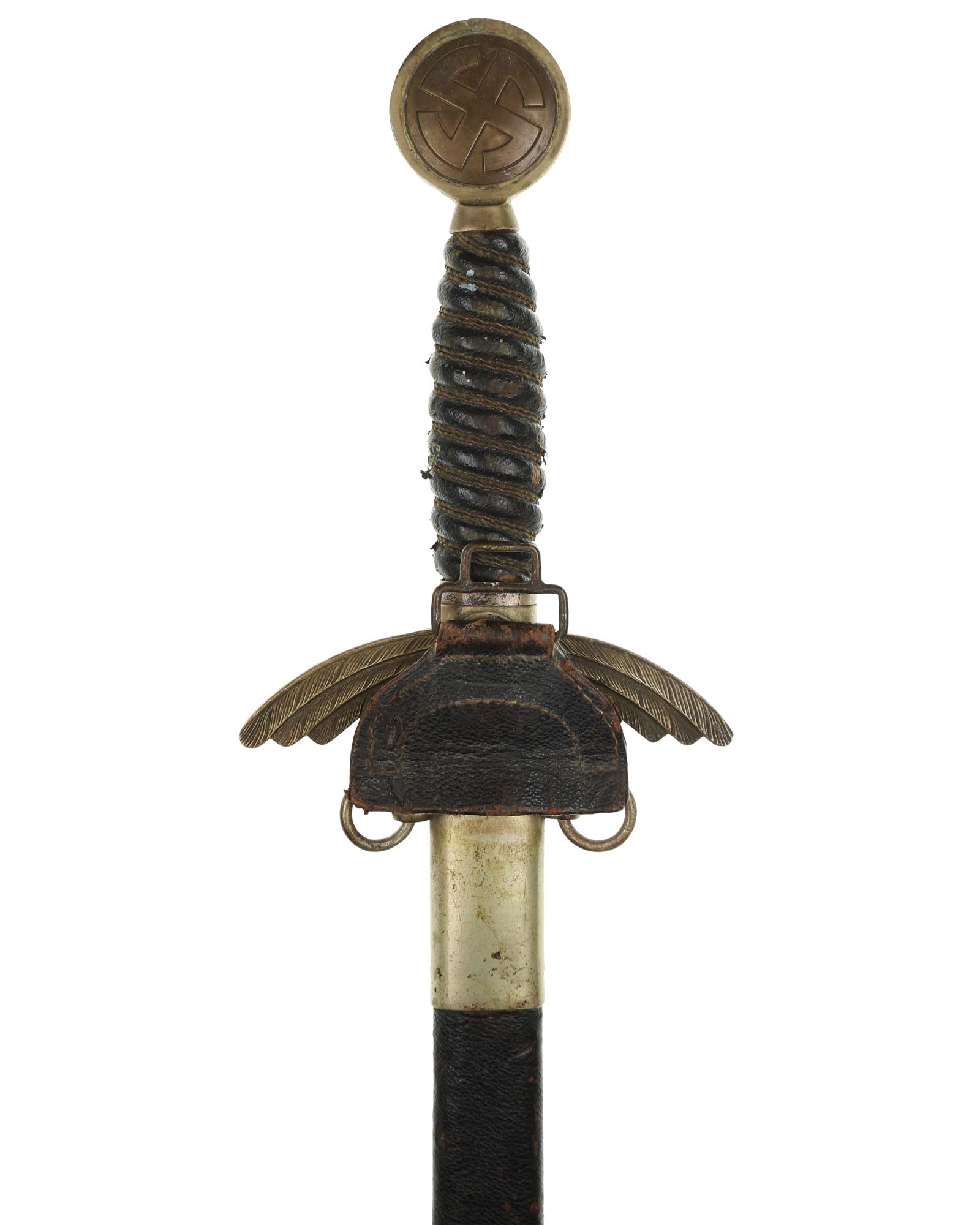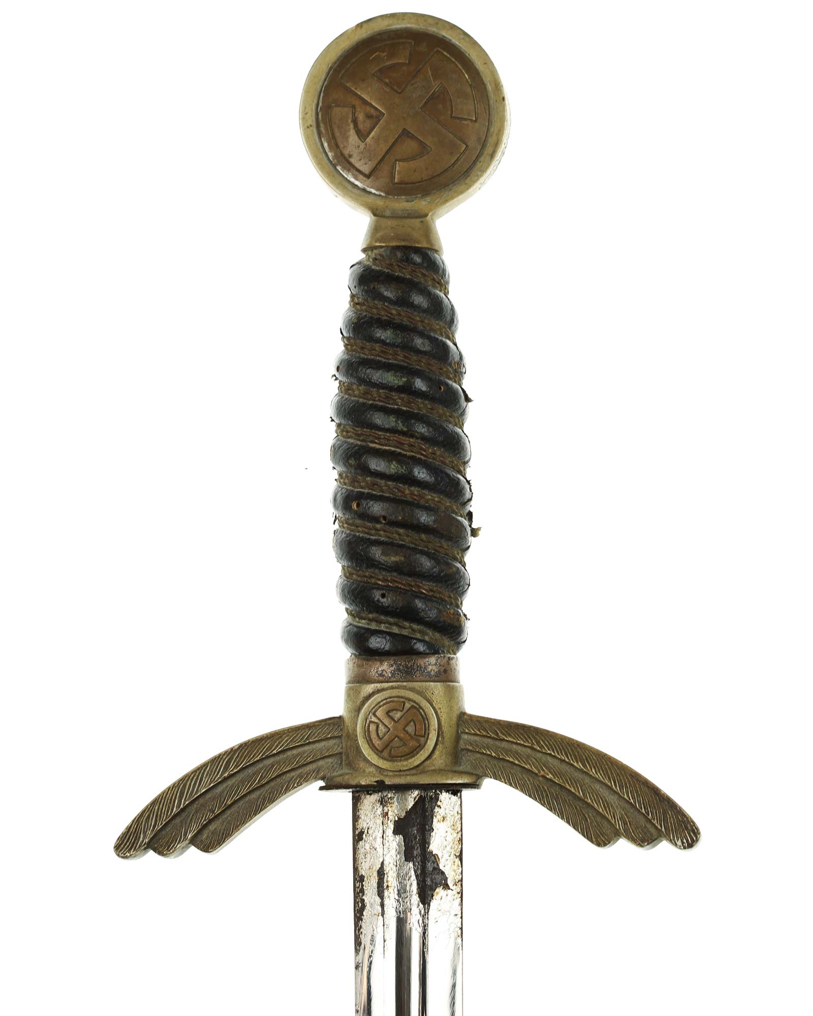 Fliegerschwert der Luftwaffe [Modell 1935] in früher Fertigung. Die Gesamtlänge beträgt 92,0 cm. Die Rückseite der Klinge ist mit Hersteller: David Malsch Steinbach.