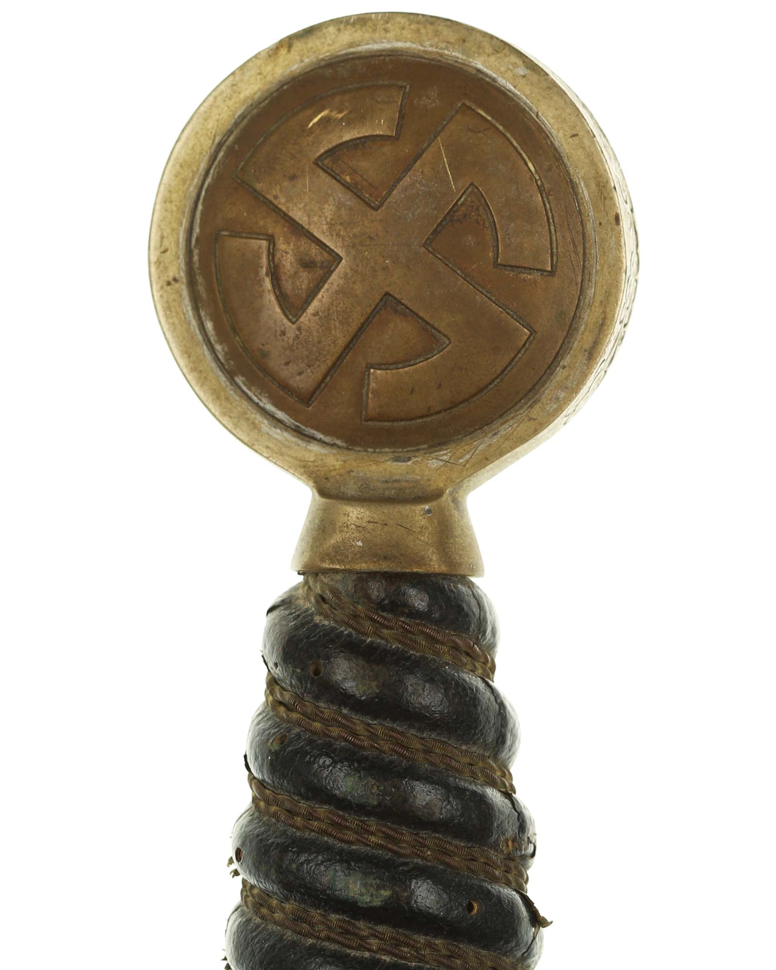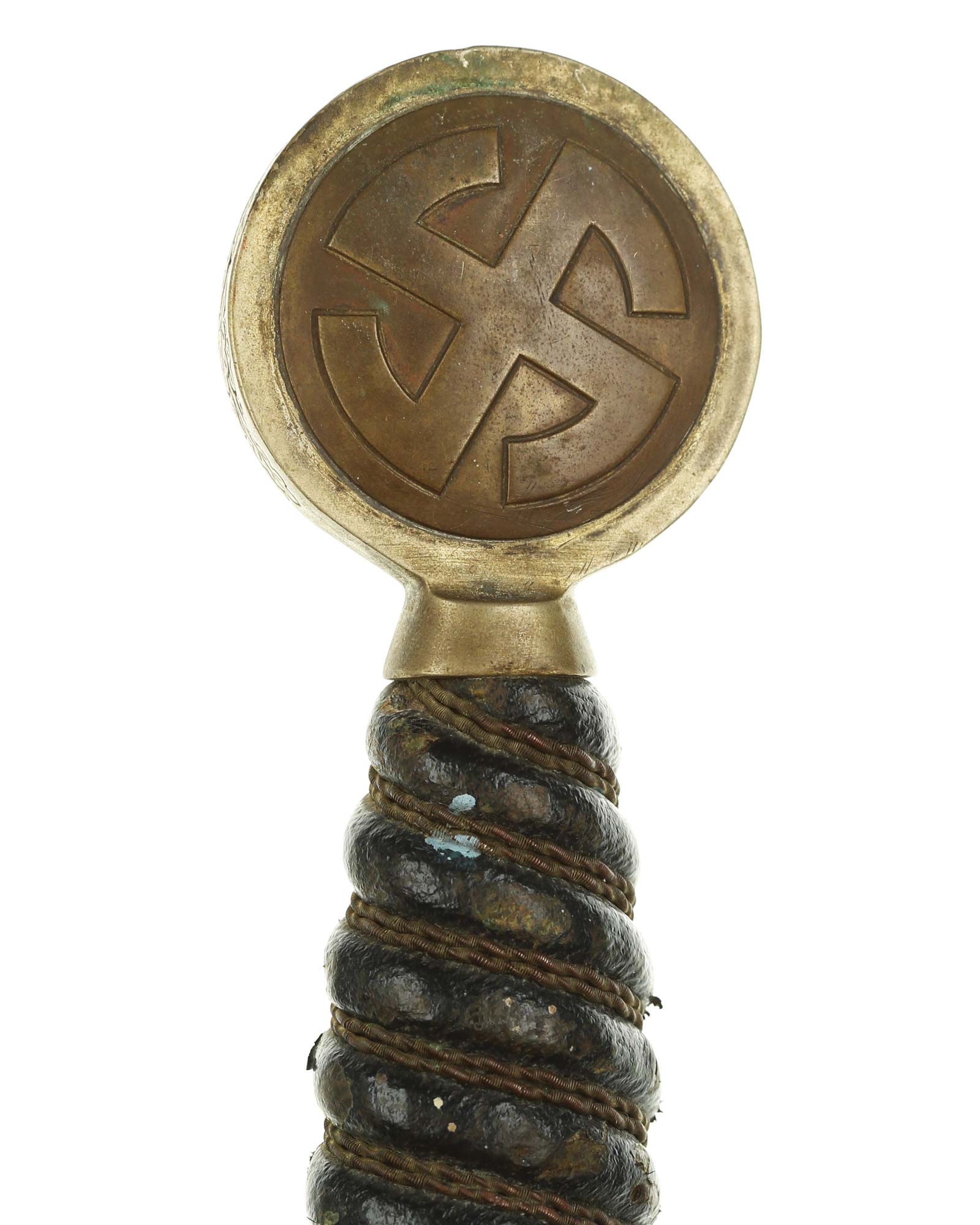 Griff: Der Griff besteht aus einem Holzkern, dieser ist mit einem blauen Saffianleder umwickelt. Die Griffwicklung ist noch sehr gut erhalten ohne Schäden. Der Knauf ist beidseitig mit vergoldeten Hakenkreuzen, dieser ist auf die Klingenangel festgeschraubt.