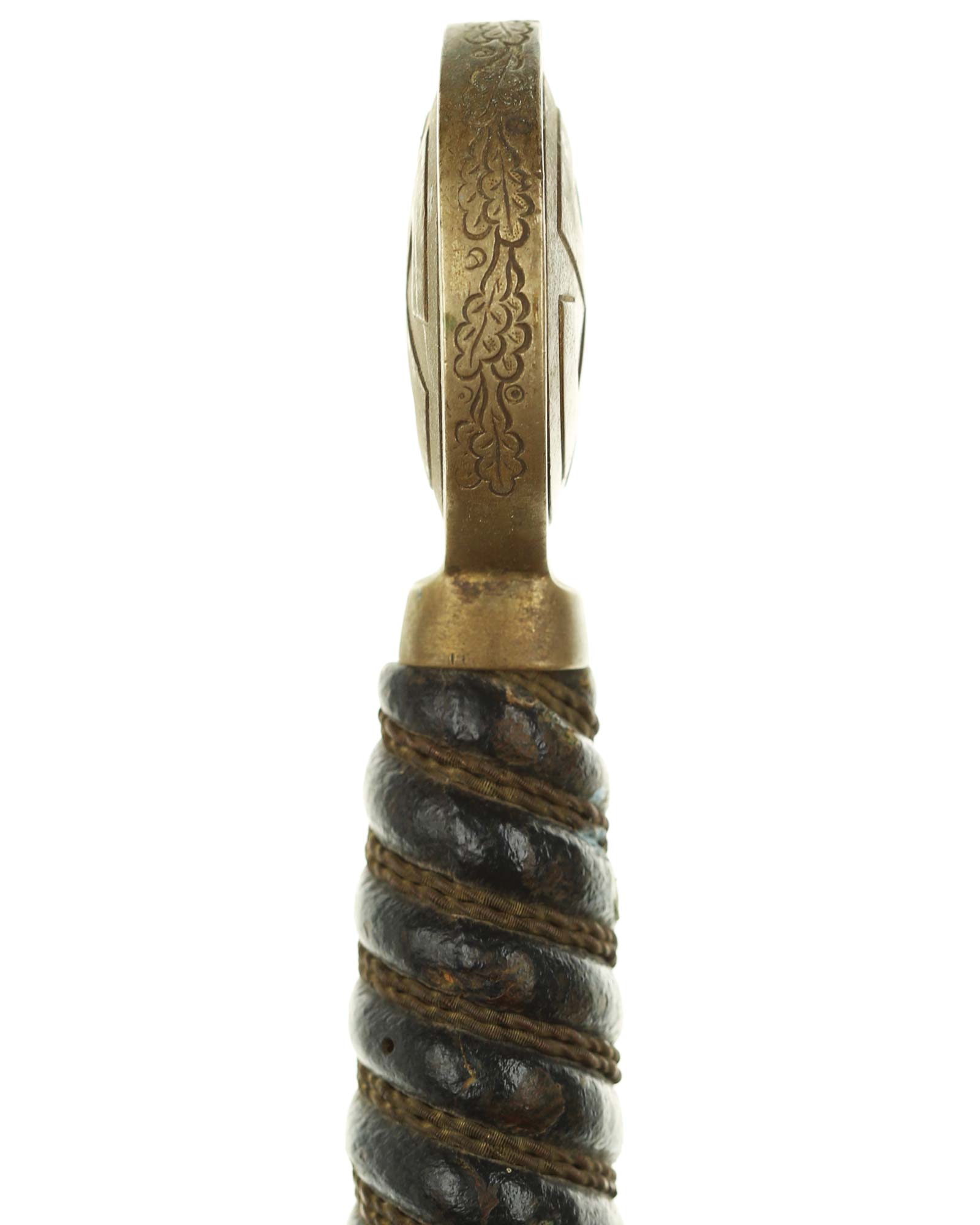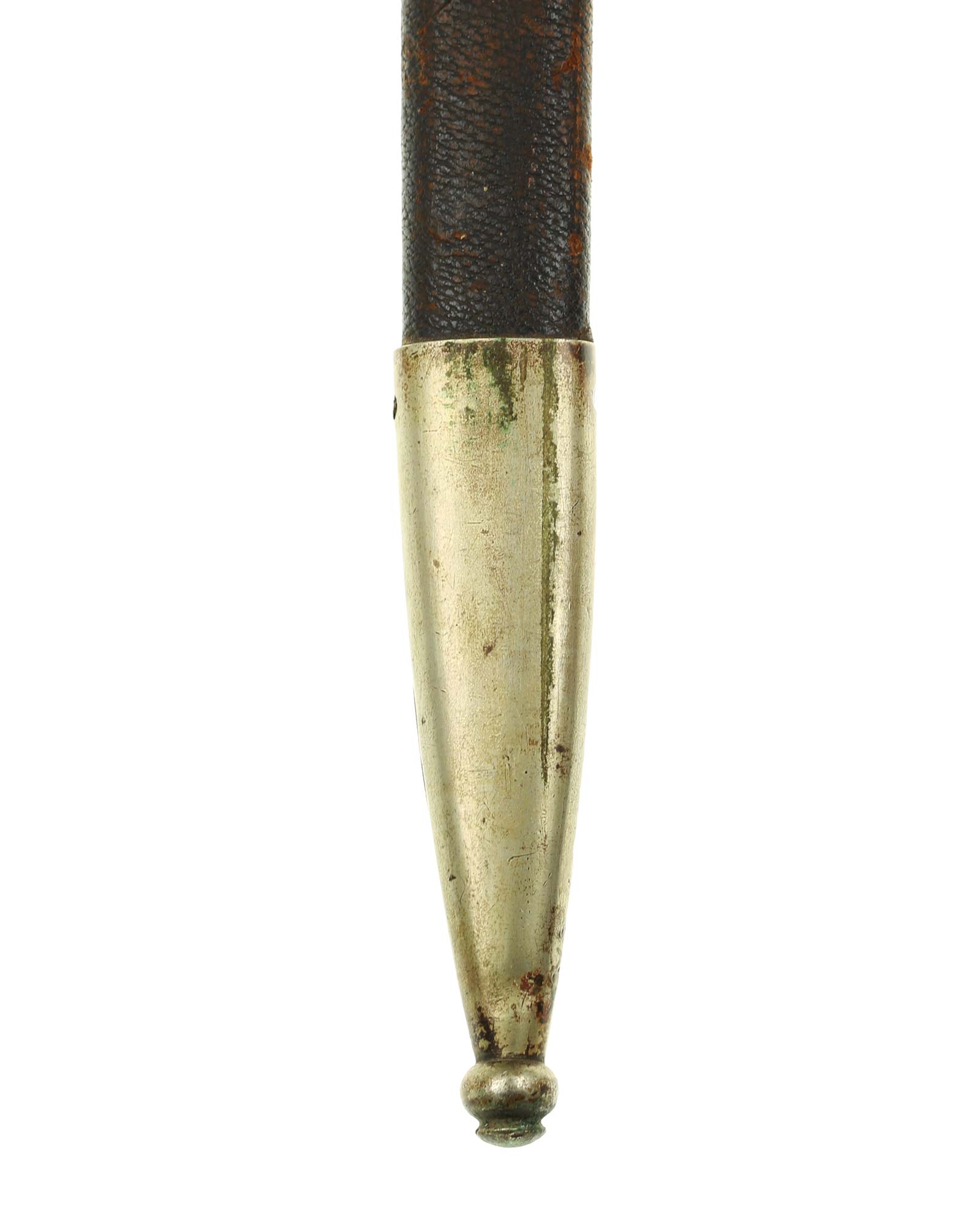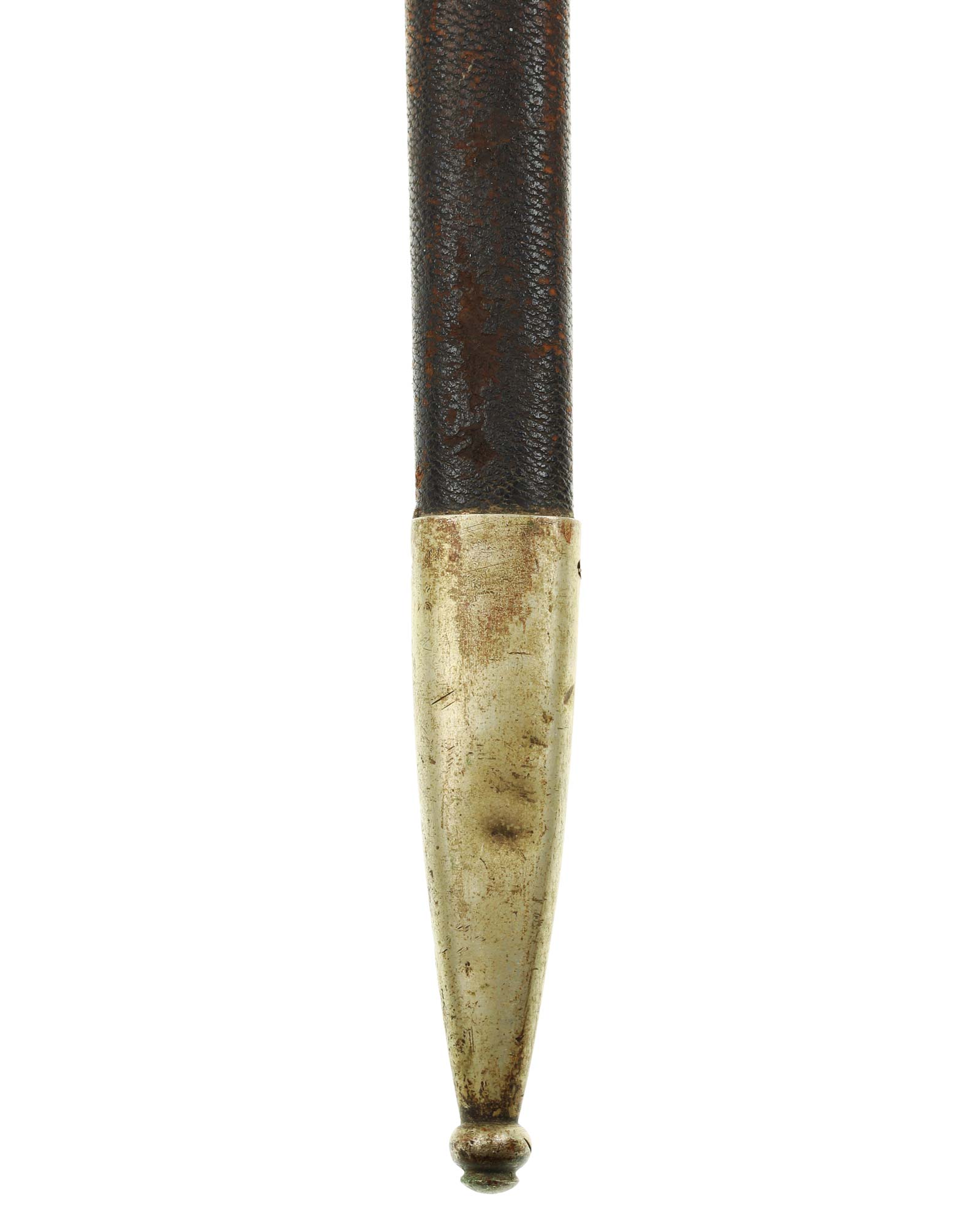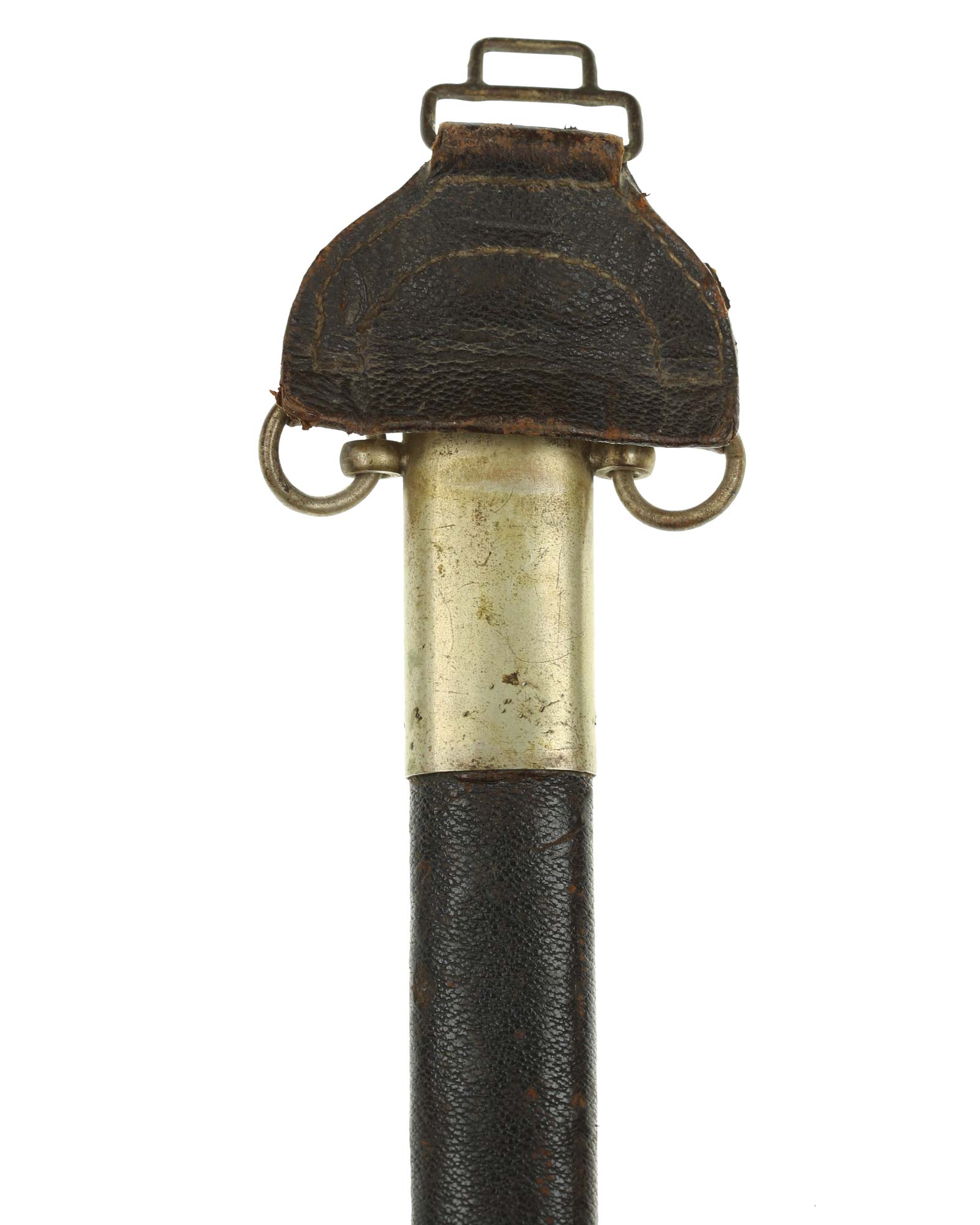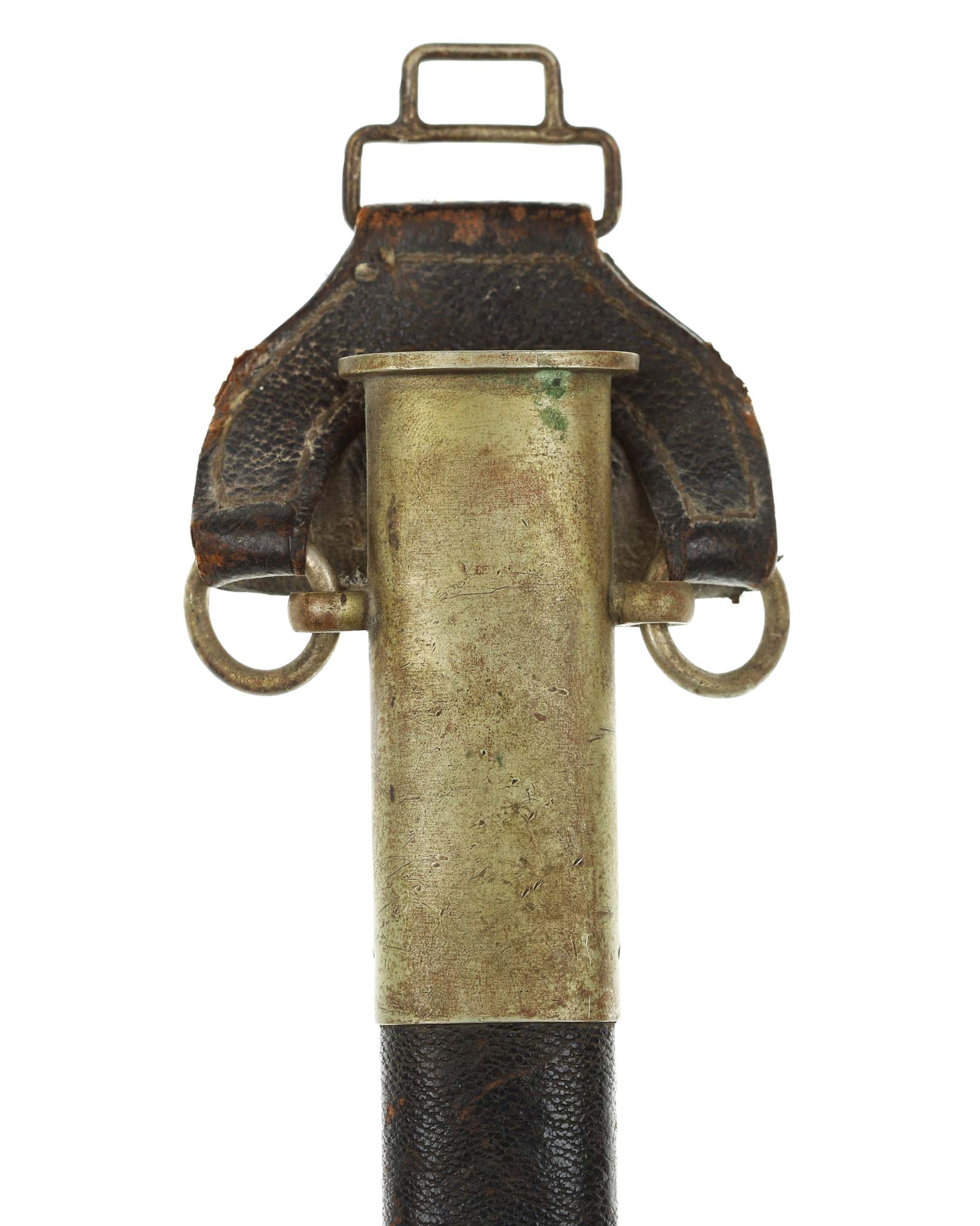 Scheide: Die Scheide ist gerade und ohne Dellen oder Beulen, ebenfalls mit blauen Saffianleder umwickelt. Gleichmäßige Patina über gesamtes Fliegerschwert.
