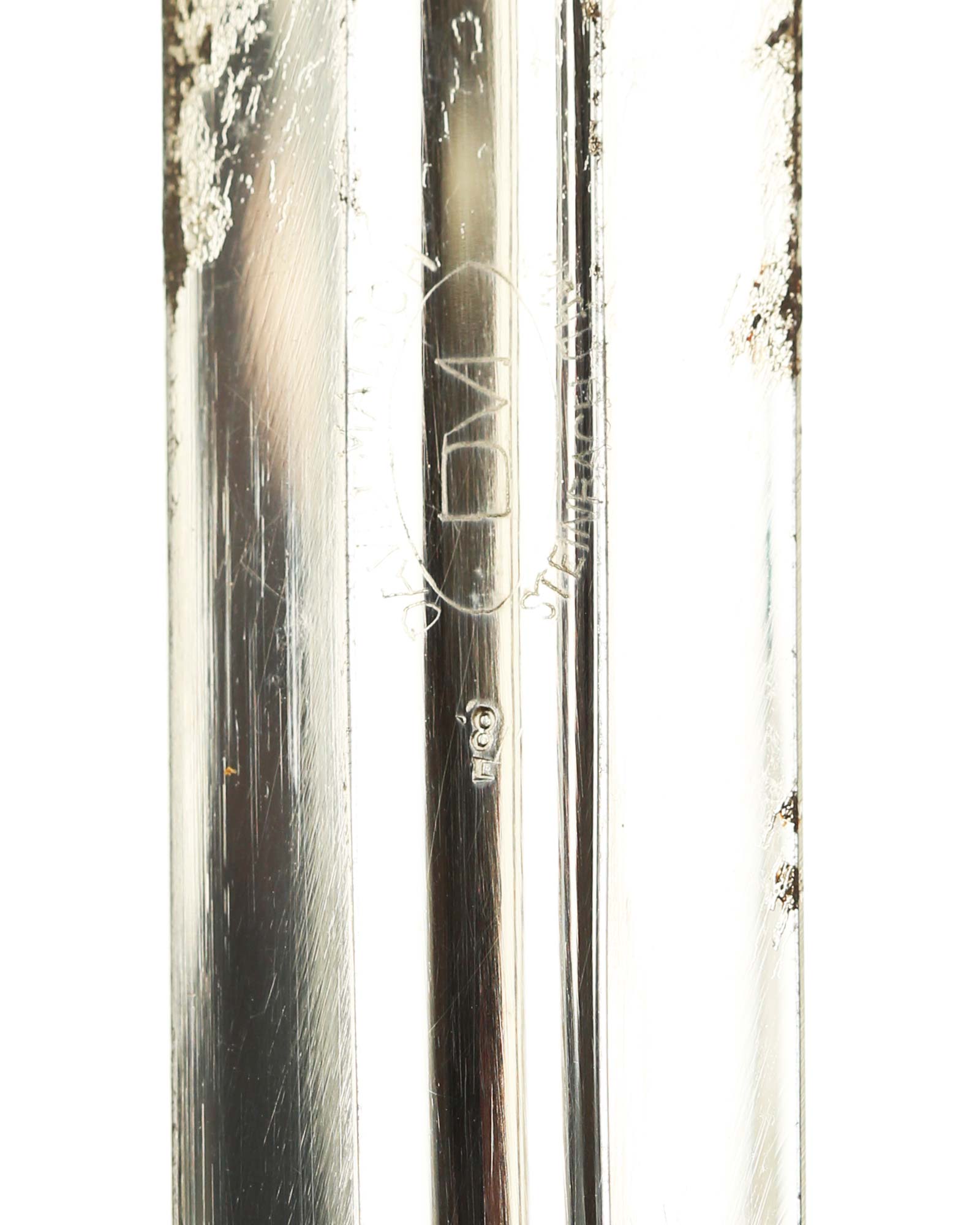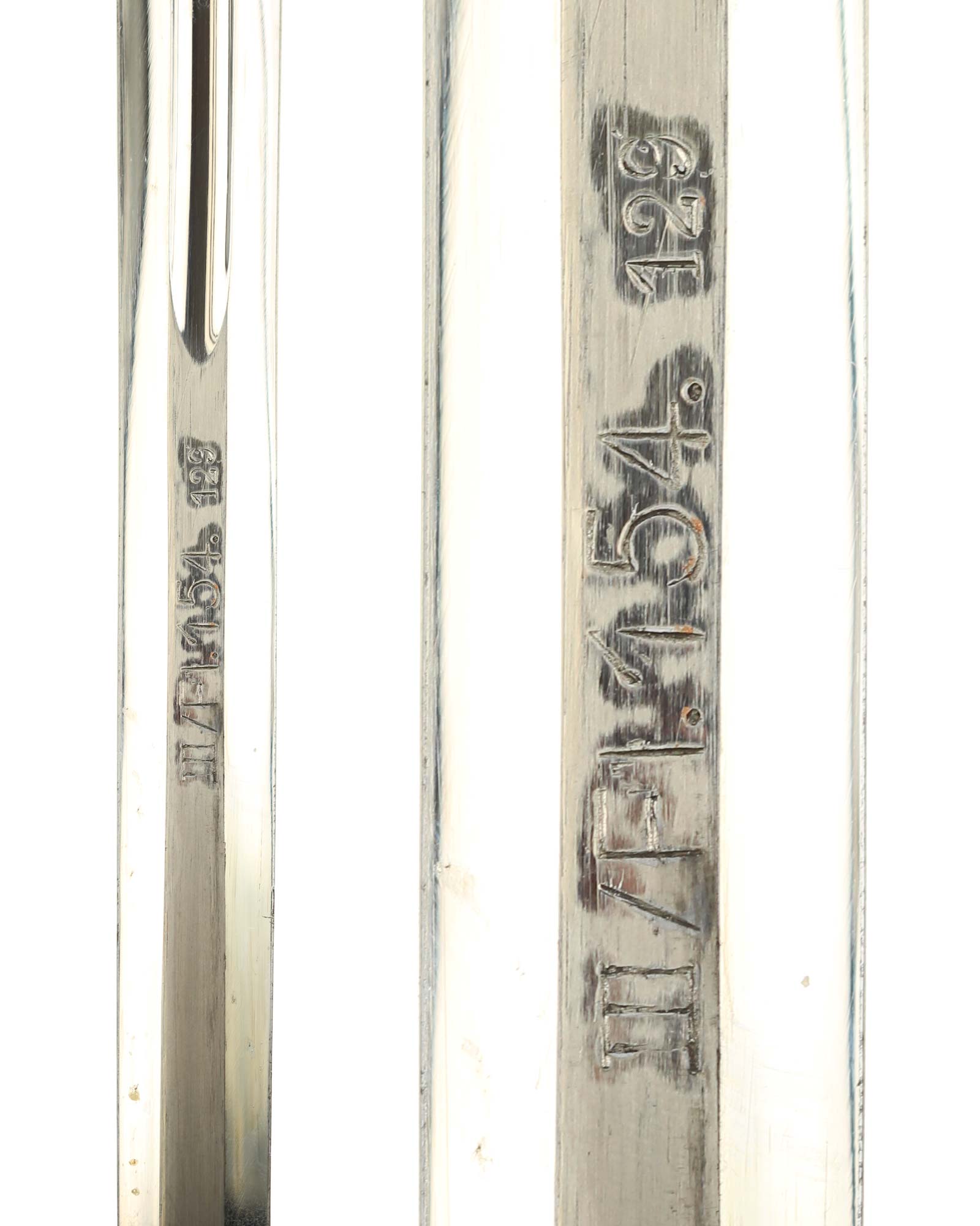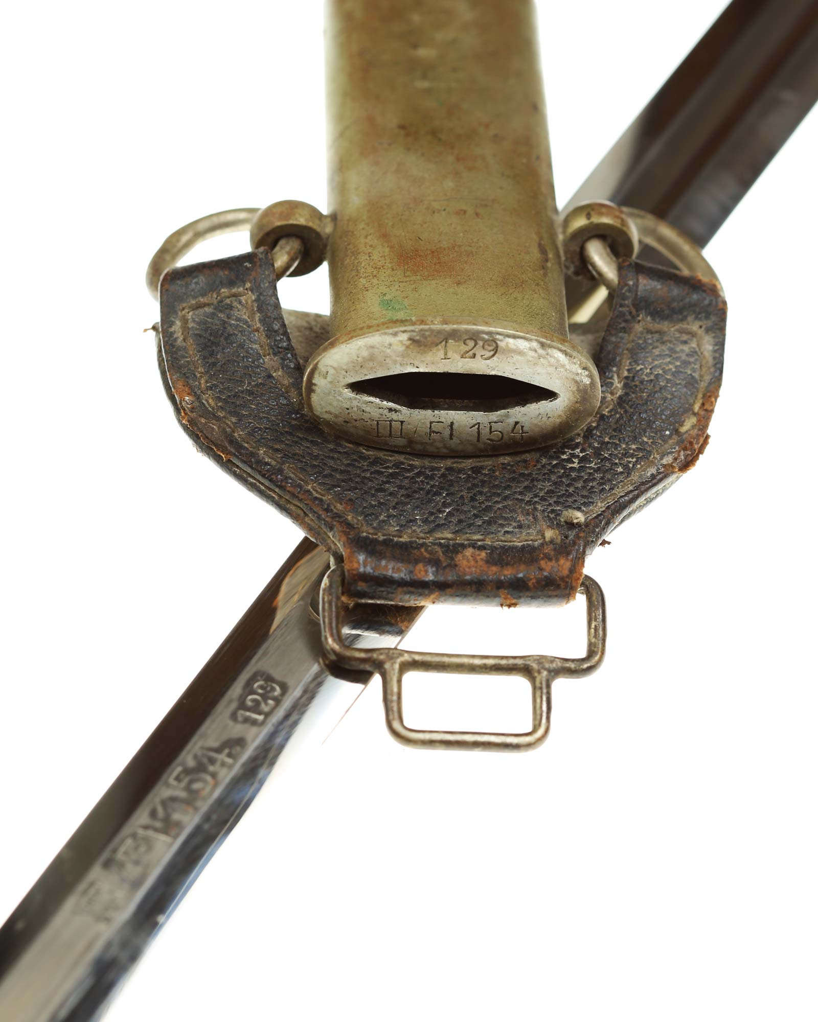 Klinge: Die Klinge ist vernickelt mit Herstellerloge David Malsch, Steinbach und Luftwaffenabnahmestempel 8. Die Schultern der Klinge passen perfekt auf die Parierstange. Blaues Stoßleder vorhanden. Die Klinge und Scheide sind markiert mit III/Fl. 154. 129.