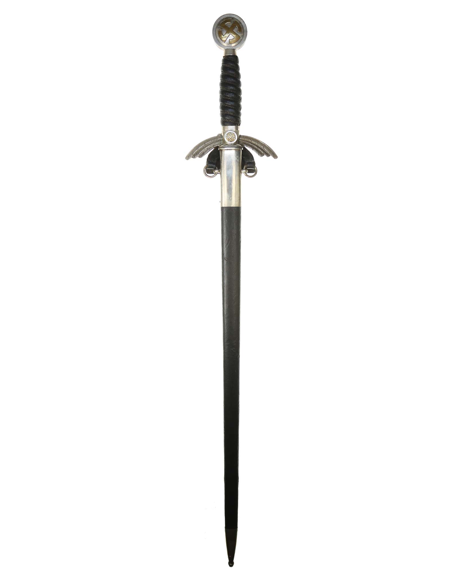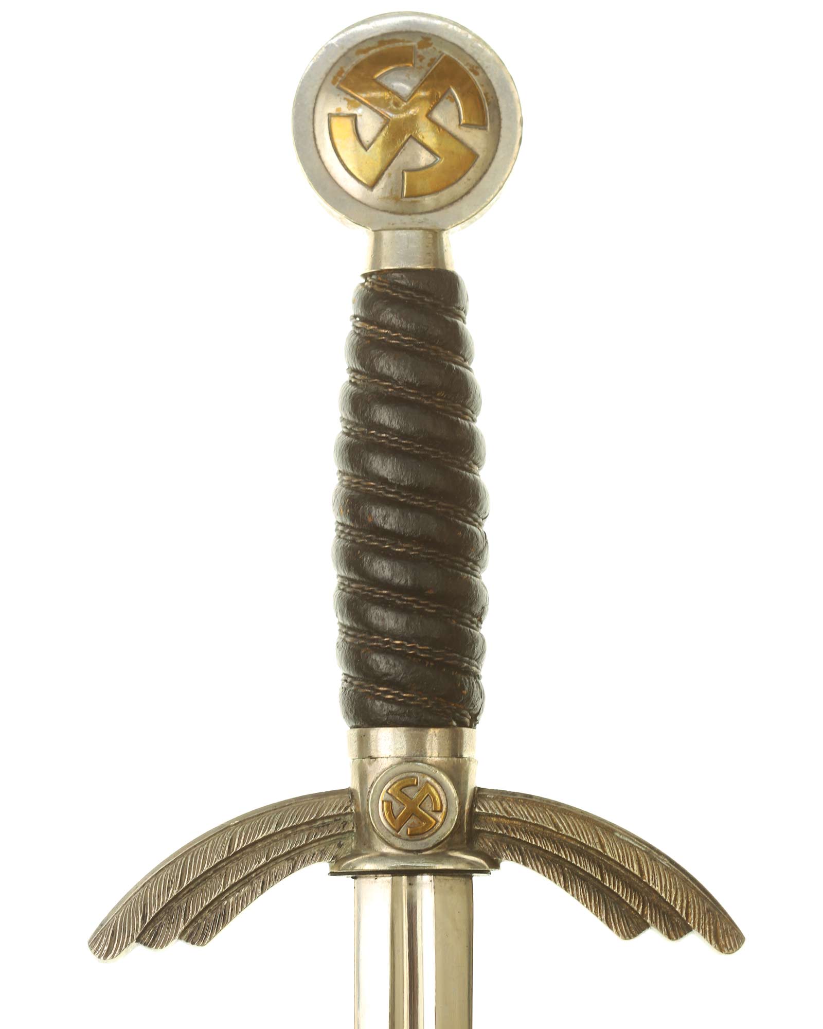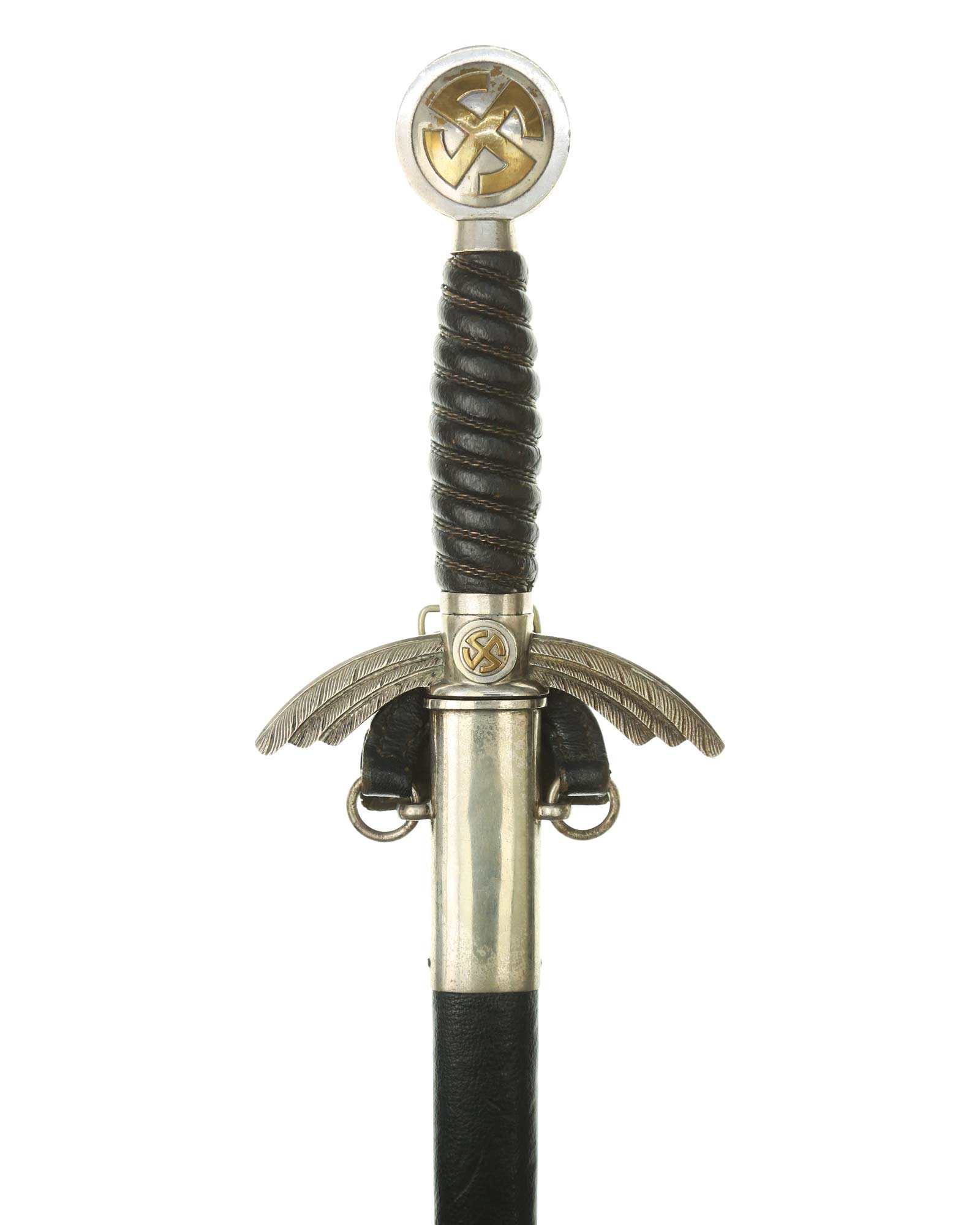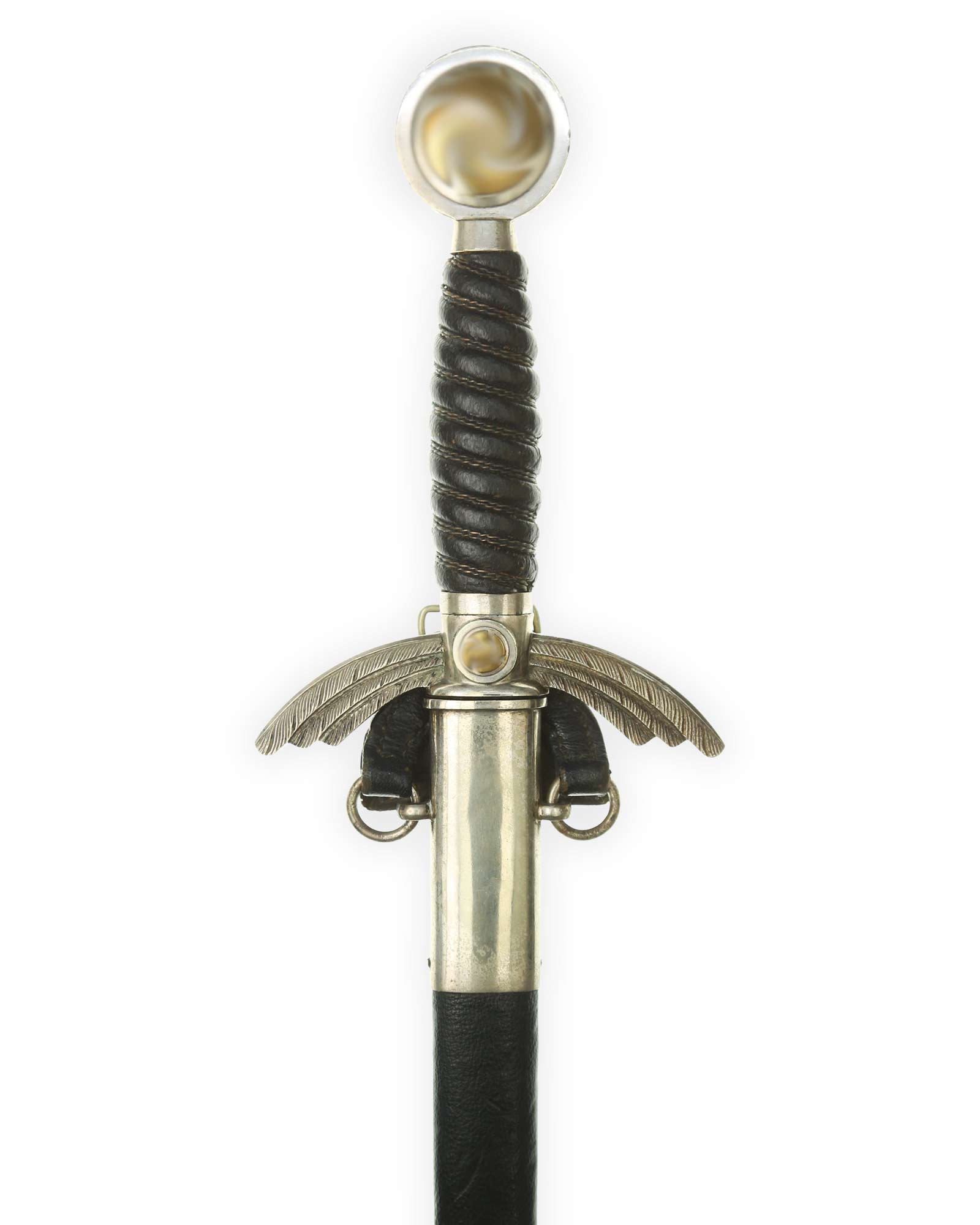 Fliegerschwert der Luftwaffe [Modell 1935] in früher Fertigung. Die Gesamtlänge beträgt 93,5 cm. Die Rückseite der Klinge ist mit Hersteller: Paul Weyersberg Solingen.