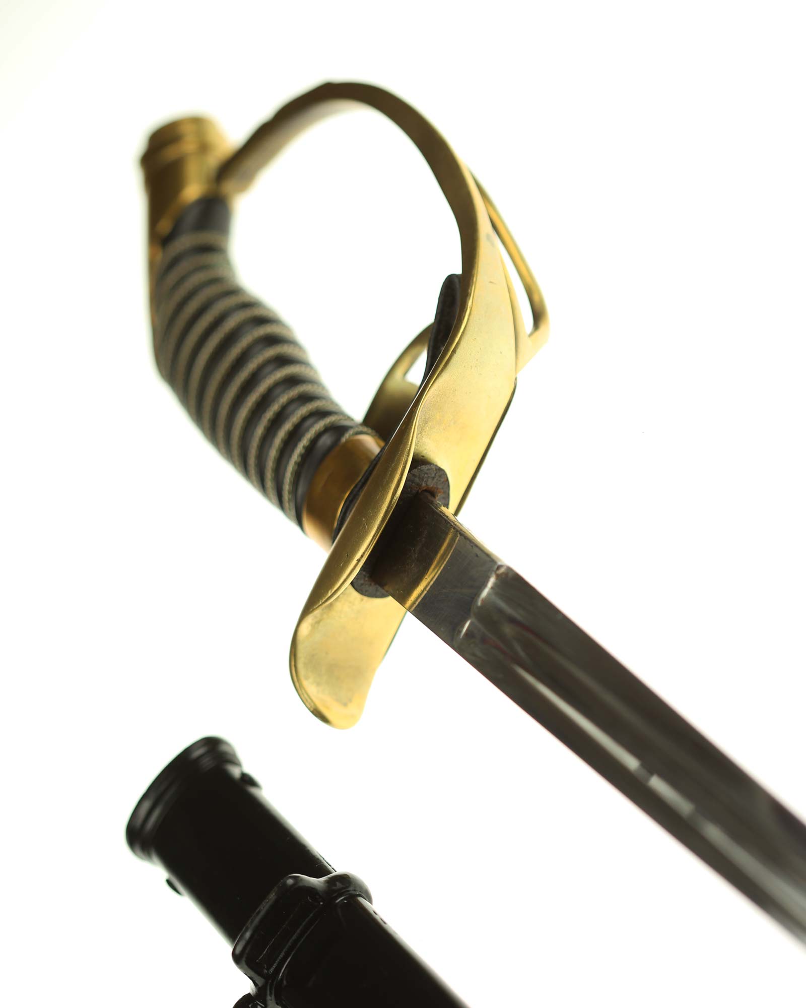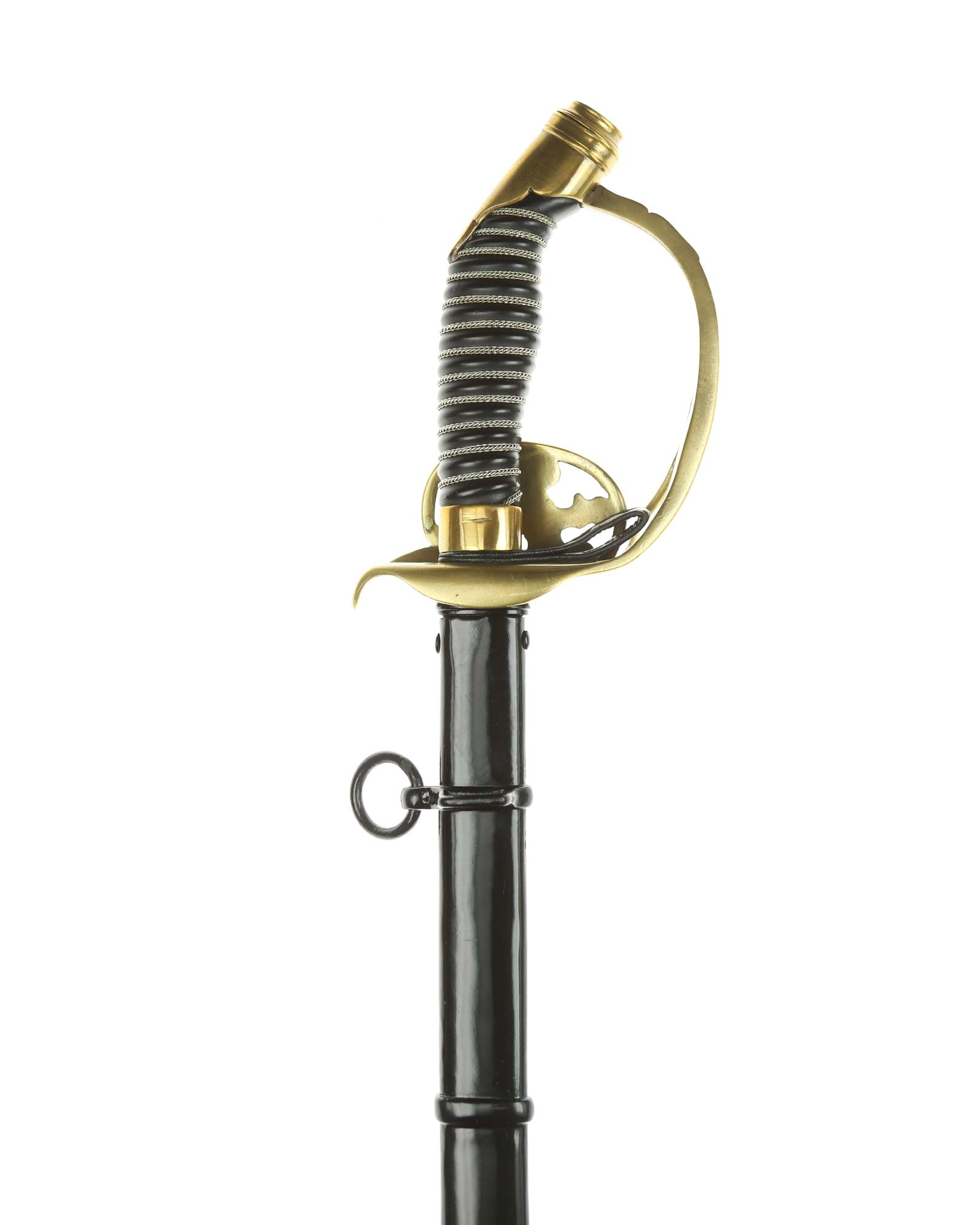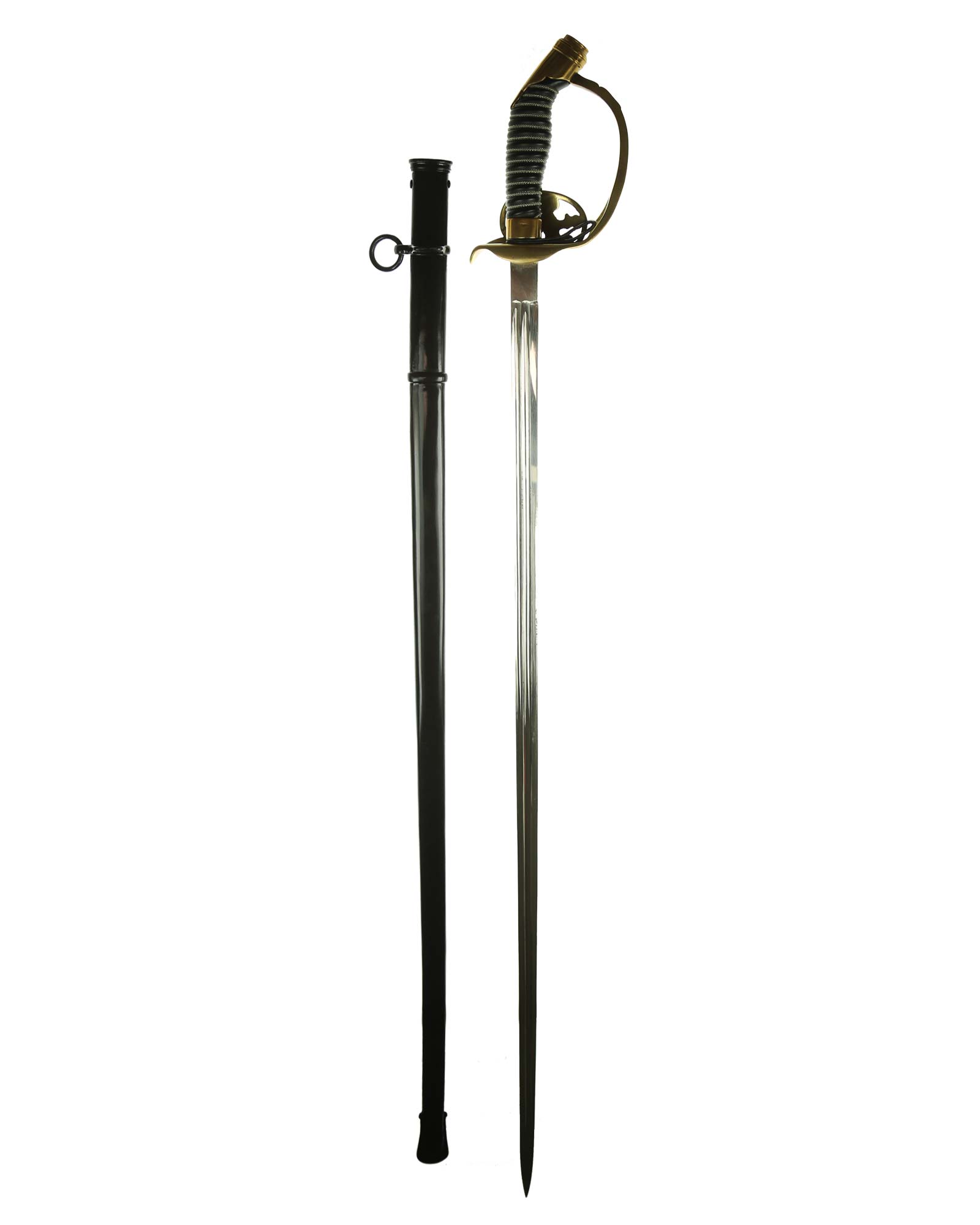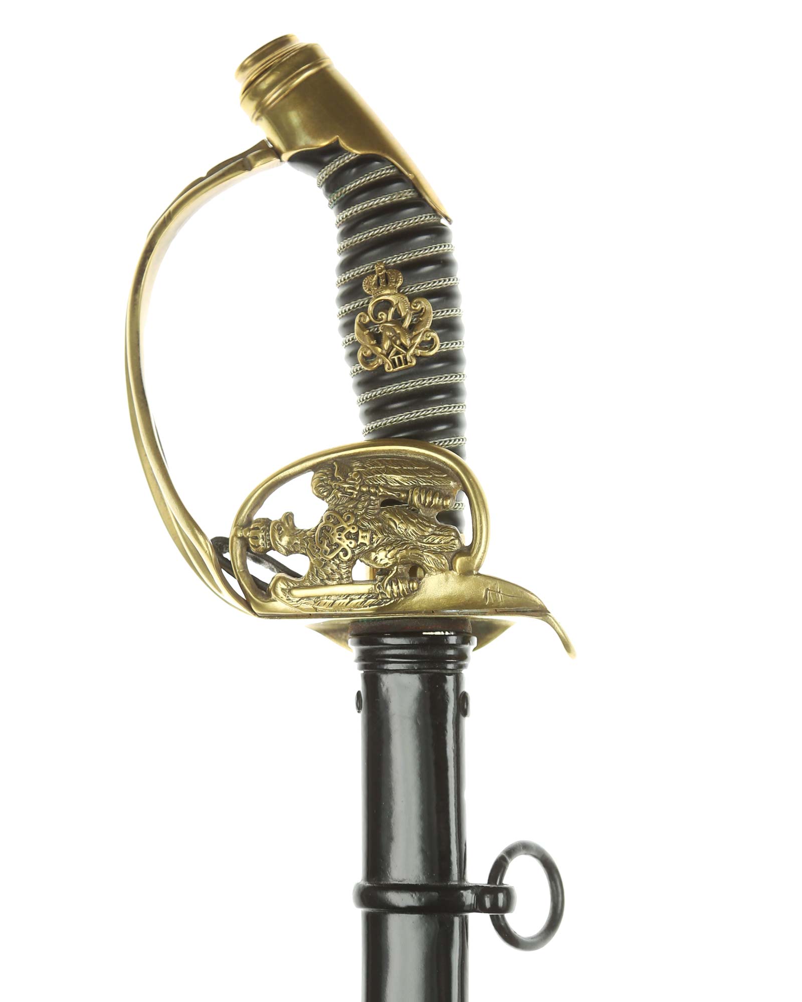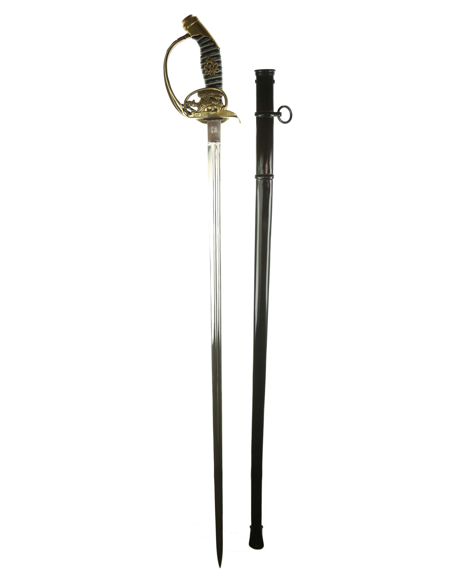 Preußen Infanterie Degen für Offiziere (IOD) 1889 mit dem Solinger Hersteller WKC Solingen, auf dem Griff befindet sich das Herrscher-Chiffre. Messinggefäß mit Klappscharnier, Adler noch mit allen Herrscherinsignien. Griff mit intakter Drahtwicklung. Beidseitig blanke Klinge, auf der vorderen Seite befindet sich der Herstellerstempel WKC Solingen Die Scheide ist schwarz-lackiert in guter Erhaltung.