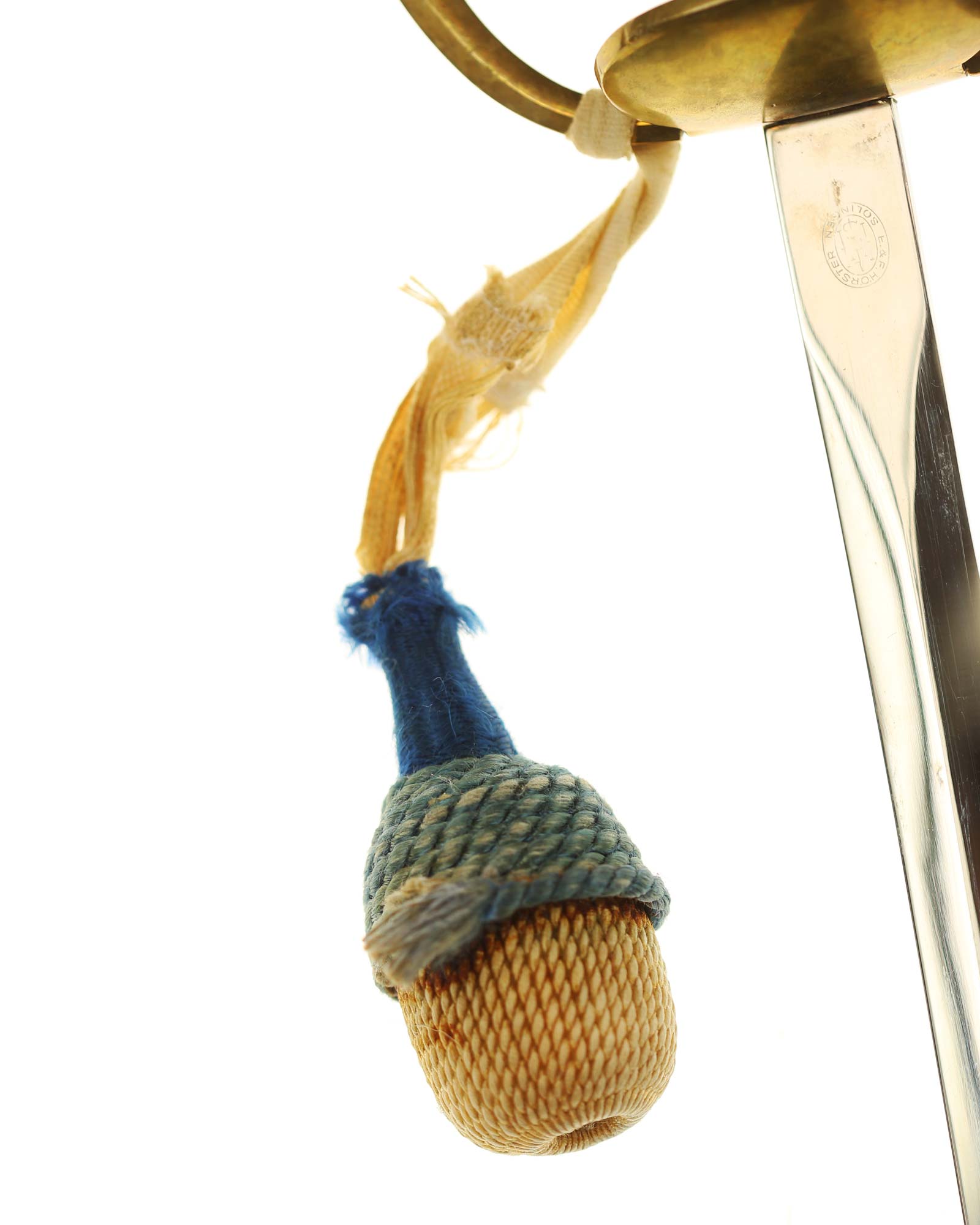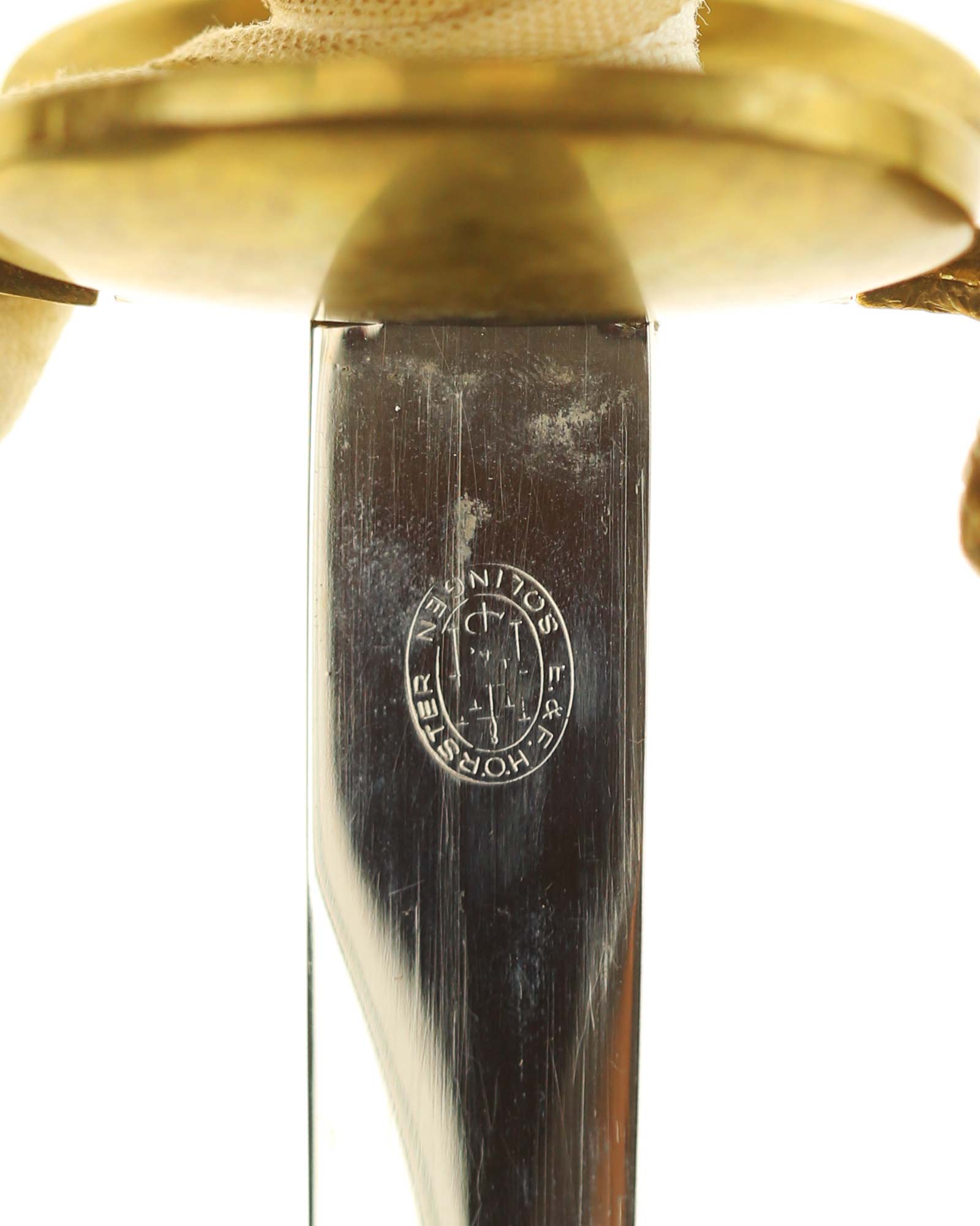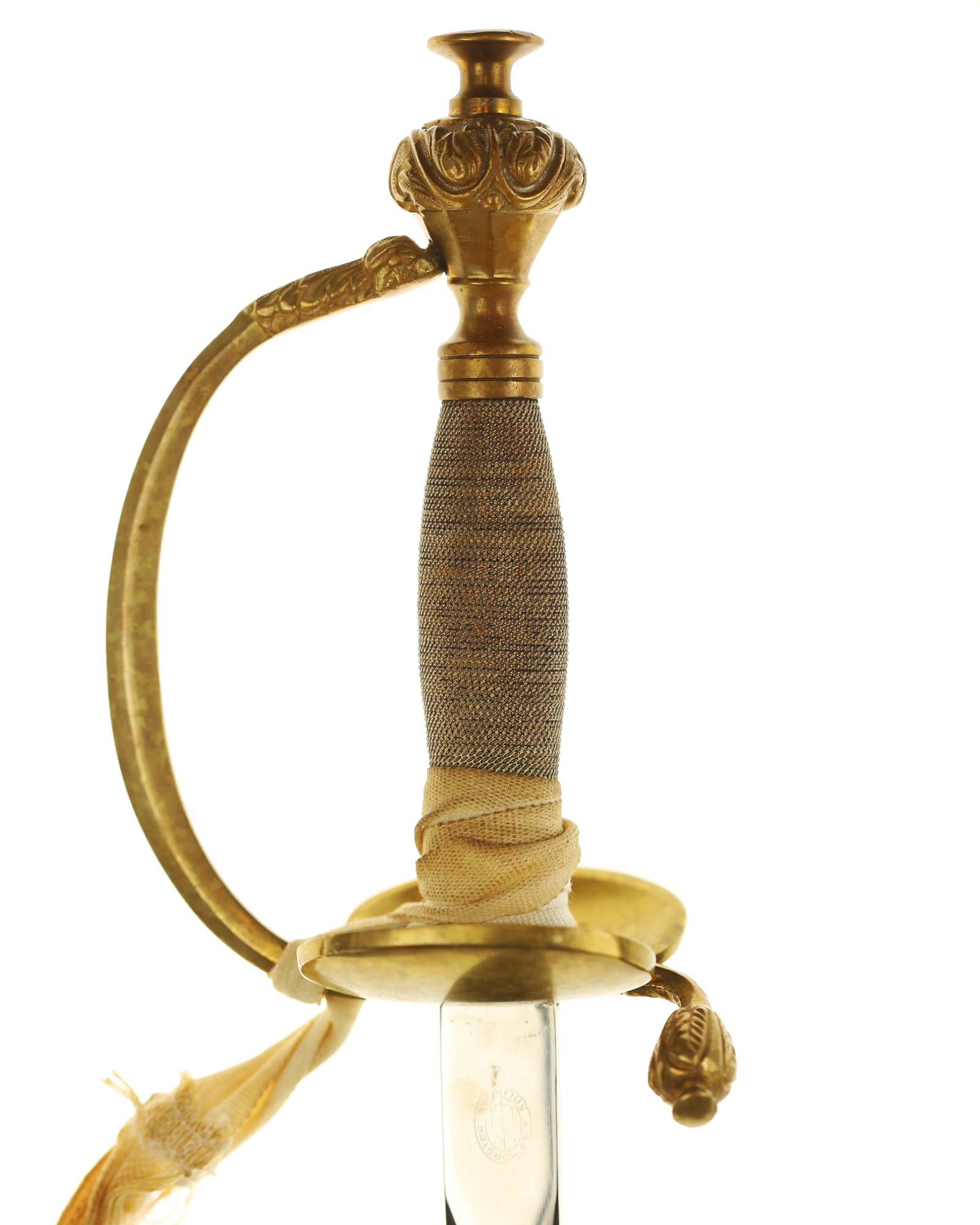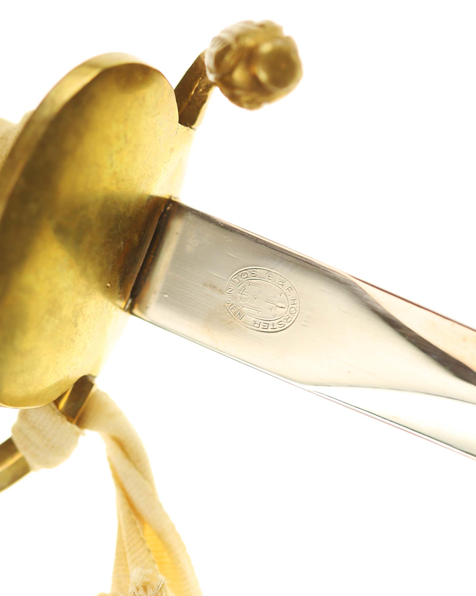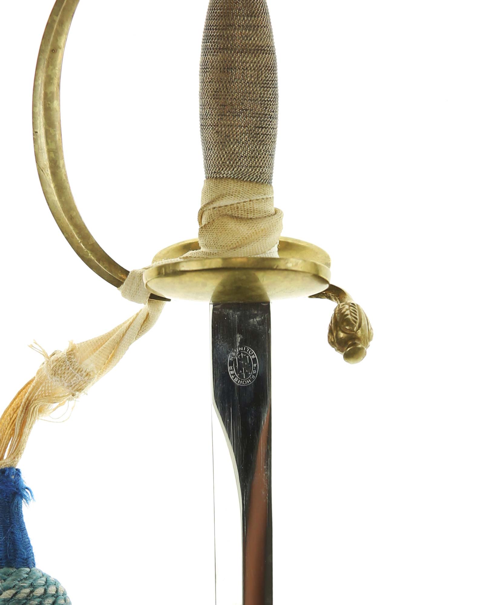 Preußen Infanterie Offiziersdegen mit dem Solinger Hersteller E.&F. Hörster Solingen. Messinggefäß mit intakter Drahtwicklung. Beidseitig blanke Klinge, auf der Rückseite befindet sich der Herstellerstempel. Schwarze Lederscheide mit Messingbeschlägen. Das Degen ist mit einem dazugehörigem Portepee und Koppelschuh.