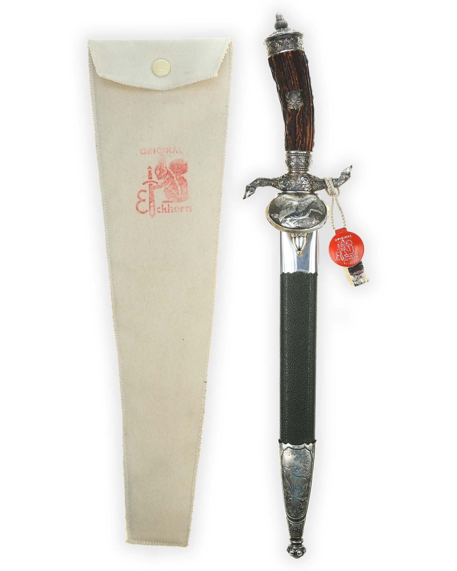 Deutsche Jägerschaft Hirschfänger in Luxusausführung Modell 1711 mit Verkaufstüte & rotem Eickhorn Blechsiegel. Hirschfänger für Angehörige der Deutschen Jägerschaft (DJ) mit dem Hersteller: Carl Eickhorn Solingen. Kräftige Keilklinge mit jagdlichen Zierätzungen und Eickhornlogo. Versilberte Kappe und Parierstange mit reliefiertem Dekor, das Stichblatt mit Auerhahndarstellung und das Hirschhorngriffstück mit aufgelegtem DJ-Emblem. Grüne Holz-Lederscheide mit versilberten Beschlägen. Anhängendes rotes Blechsiegel mit Papier "Original Eickhorn". Länge 46,7 cm.