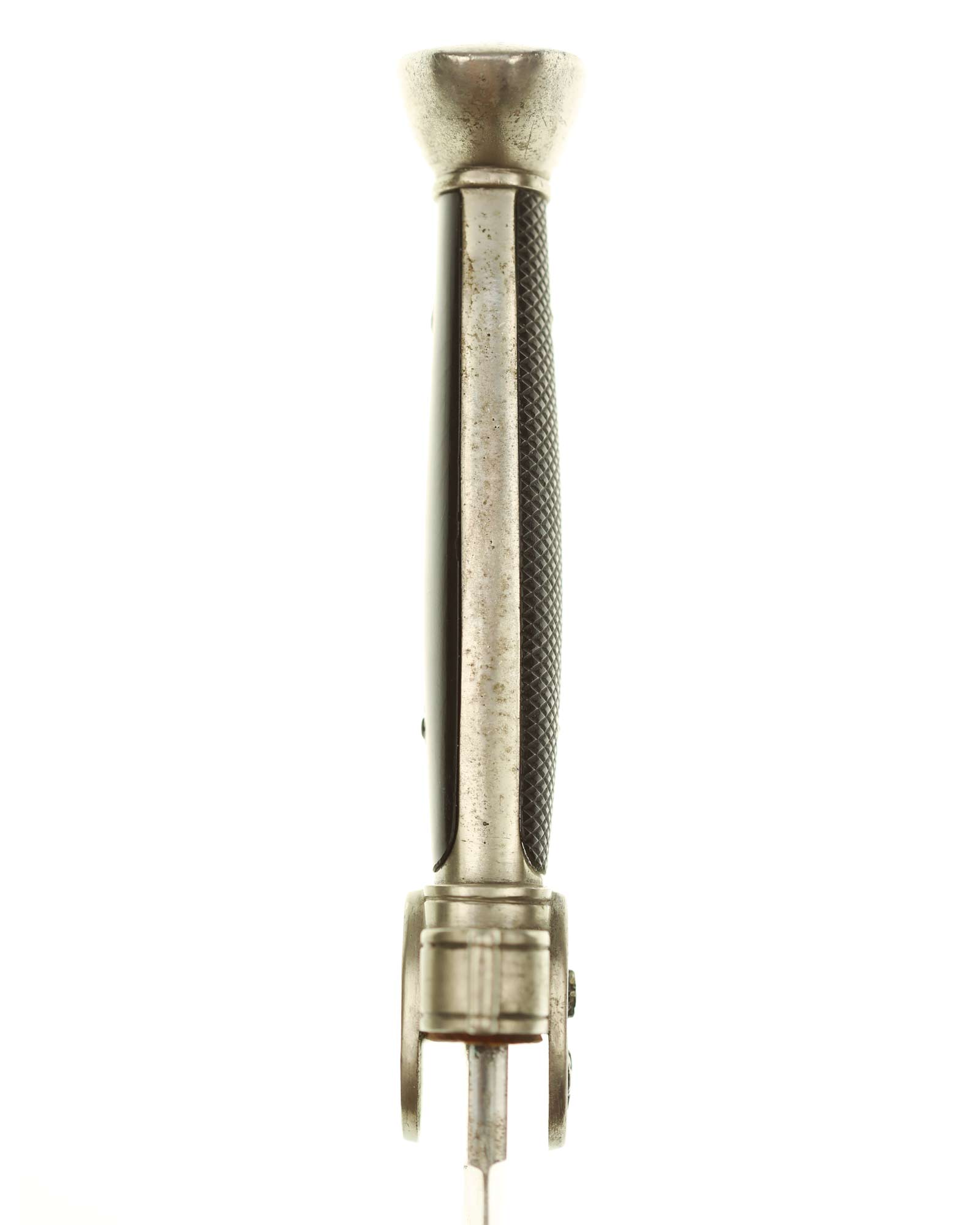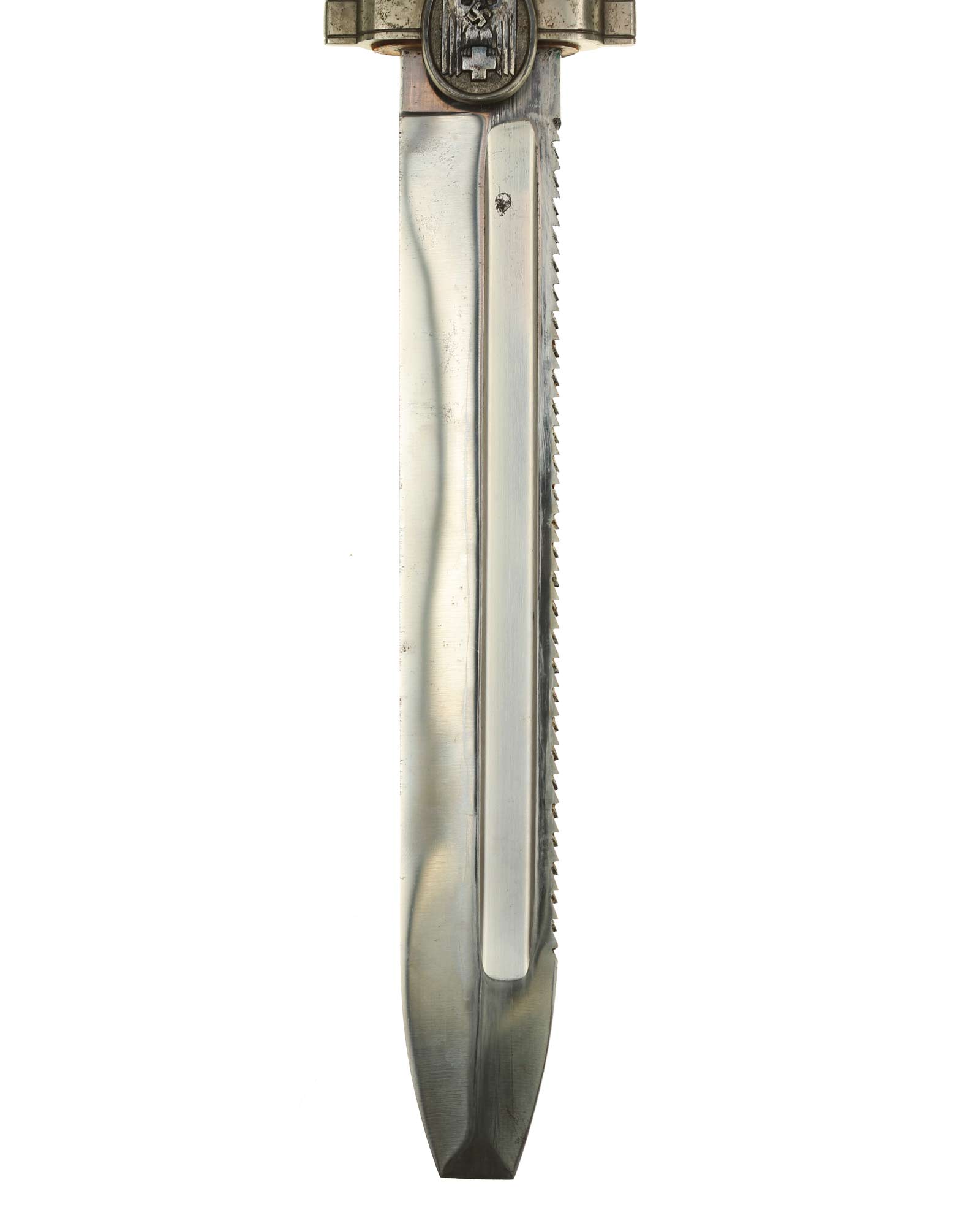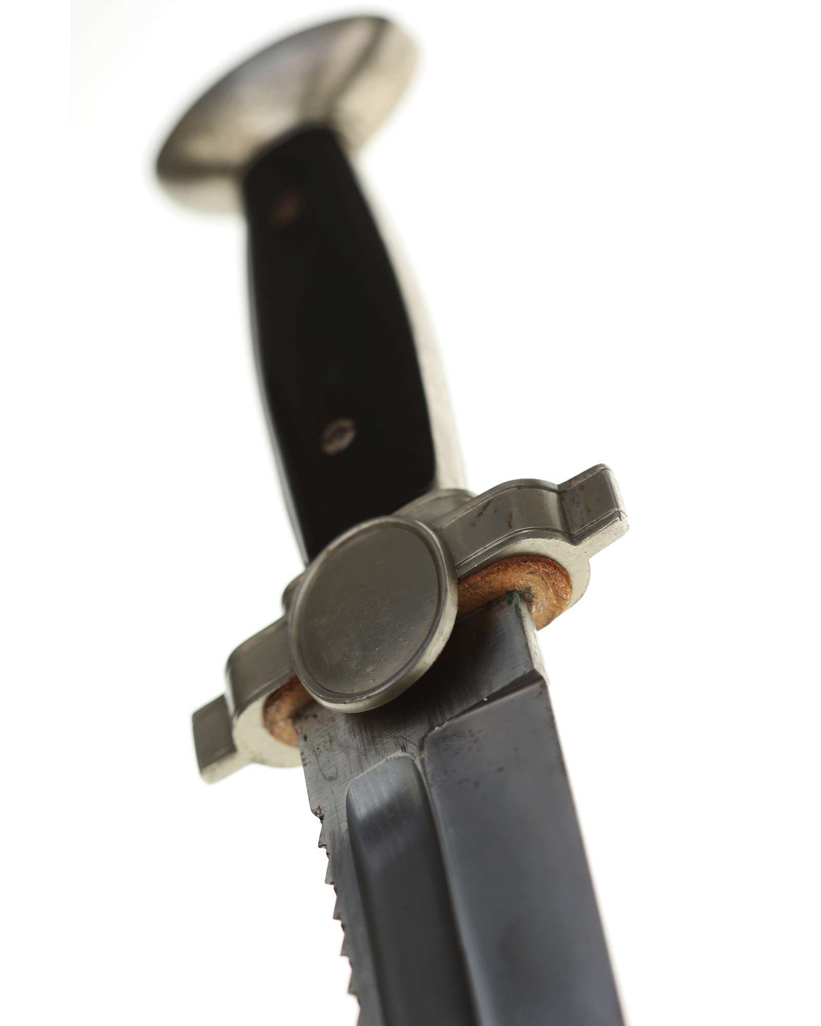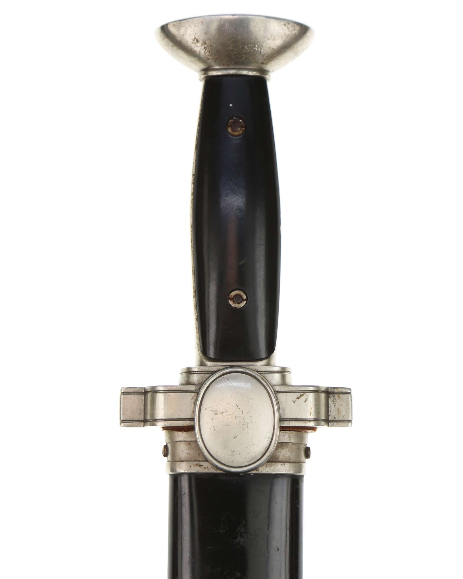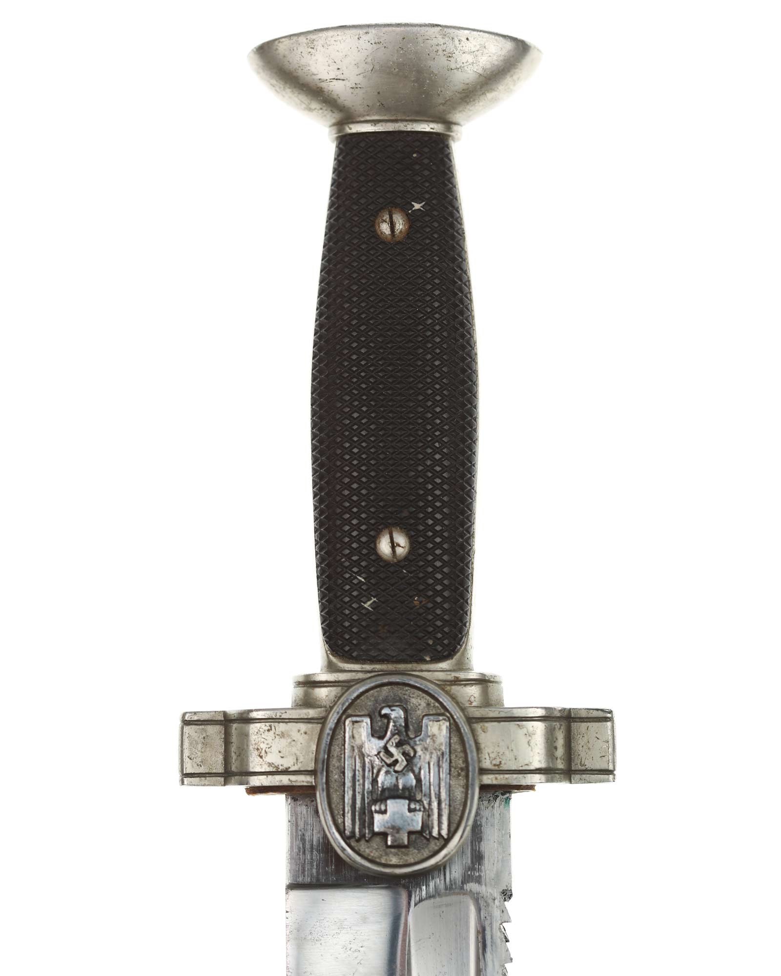 Griff: Nickelgriffstück mit verschraubten schwarzen Kunststoff-Griffschalen, diese werden durch zwei Schrauben festgehalten. Die Parierstange ist in Form eines Medaillons mit DRK Adler, der nach links schaut, dieser hält in seinen Krallen das DRK Kreuz. Hakenkreuz wurde instandgesetzt.