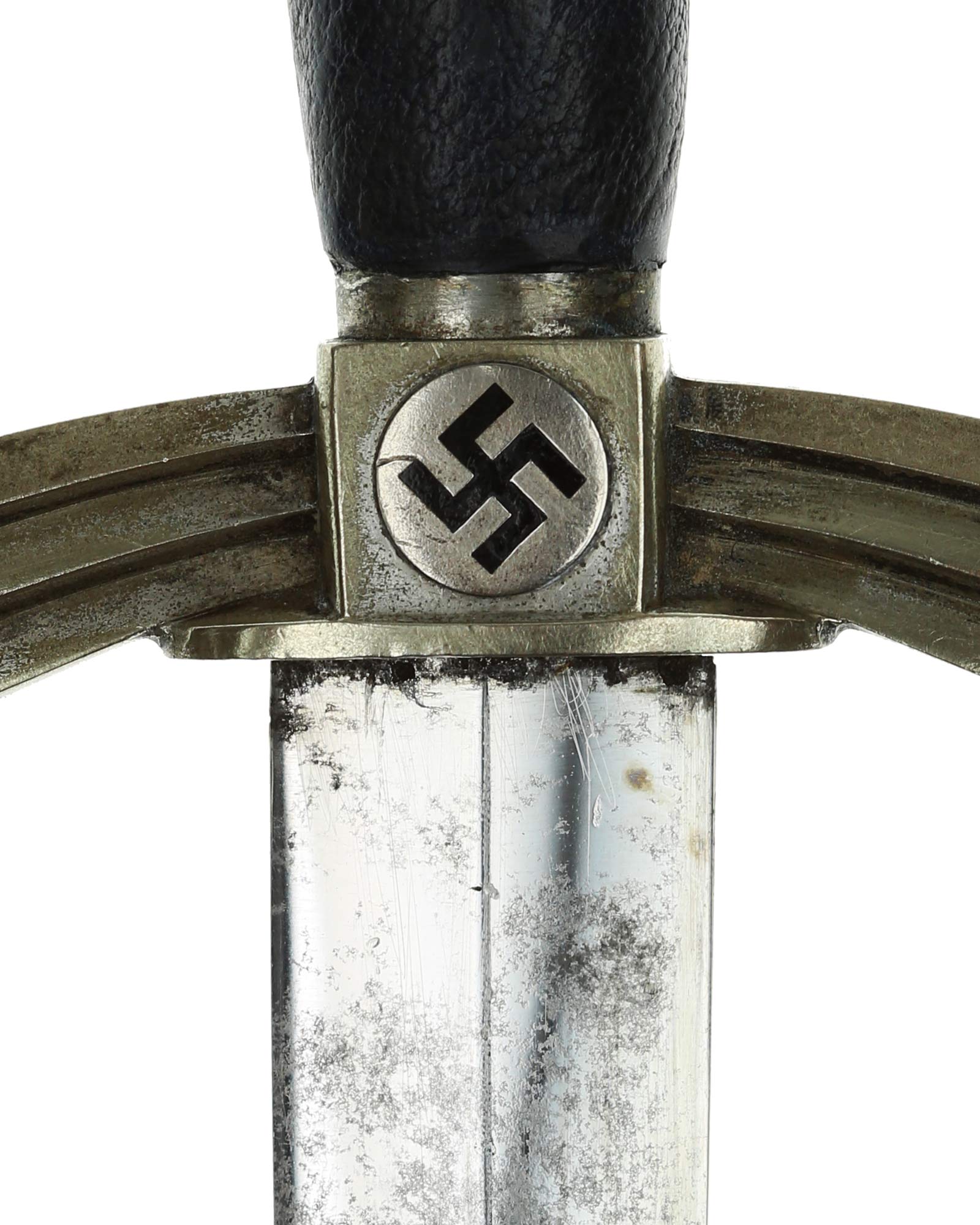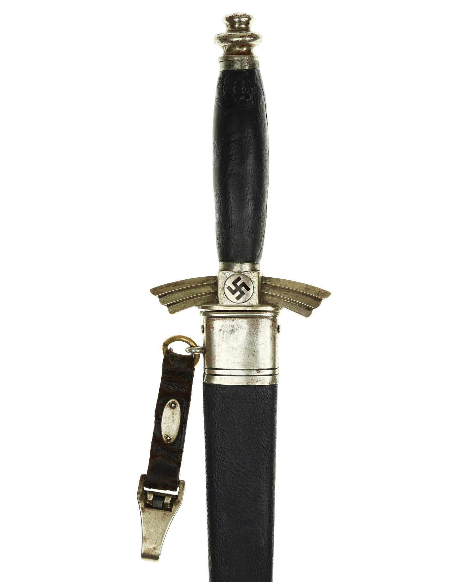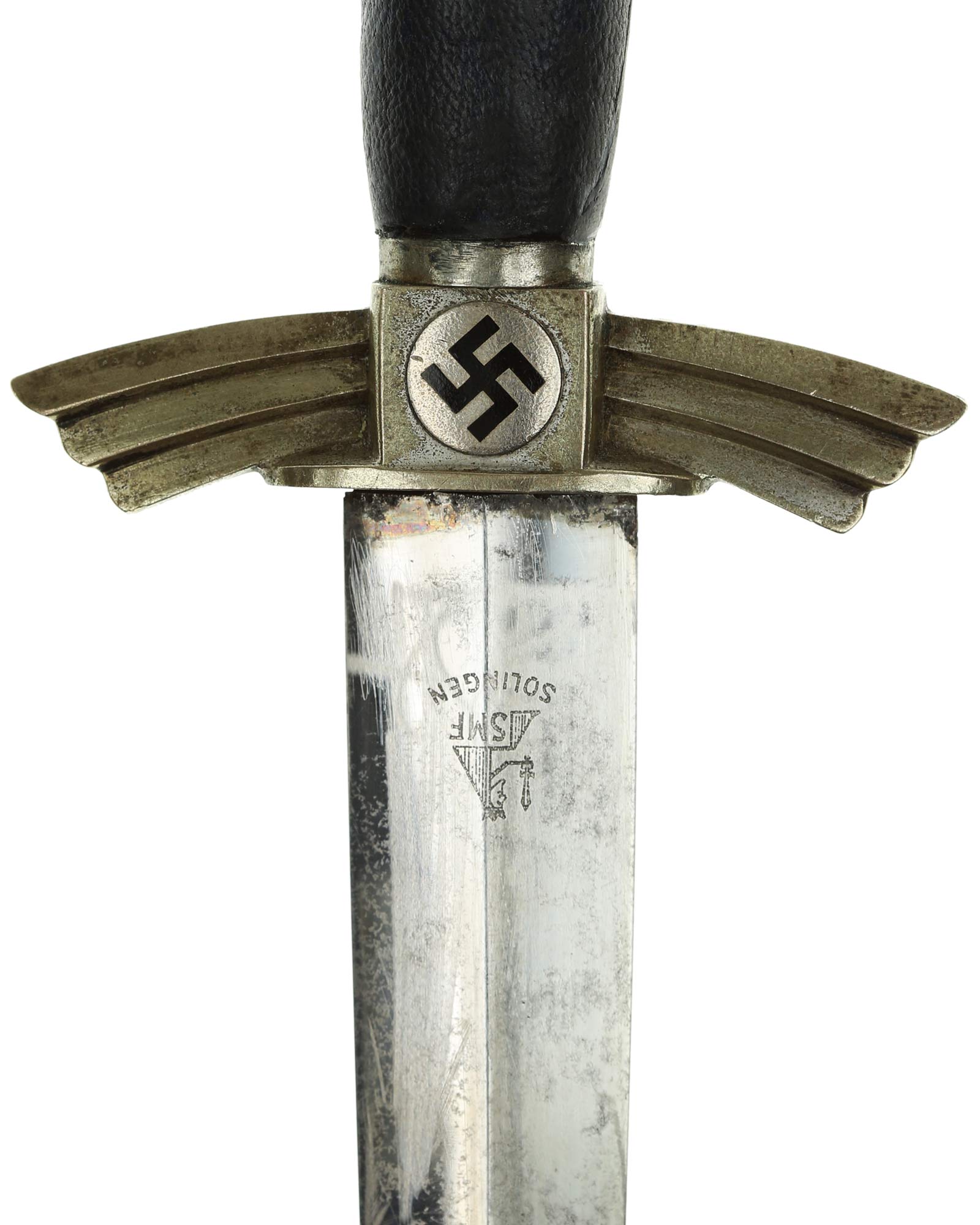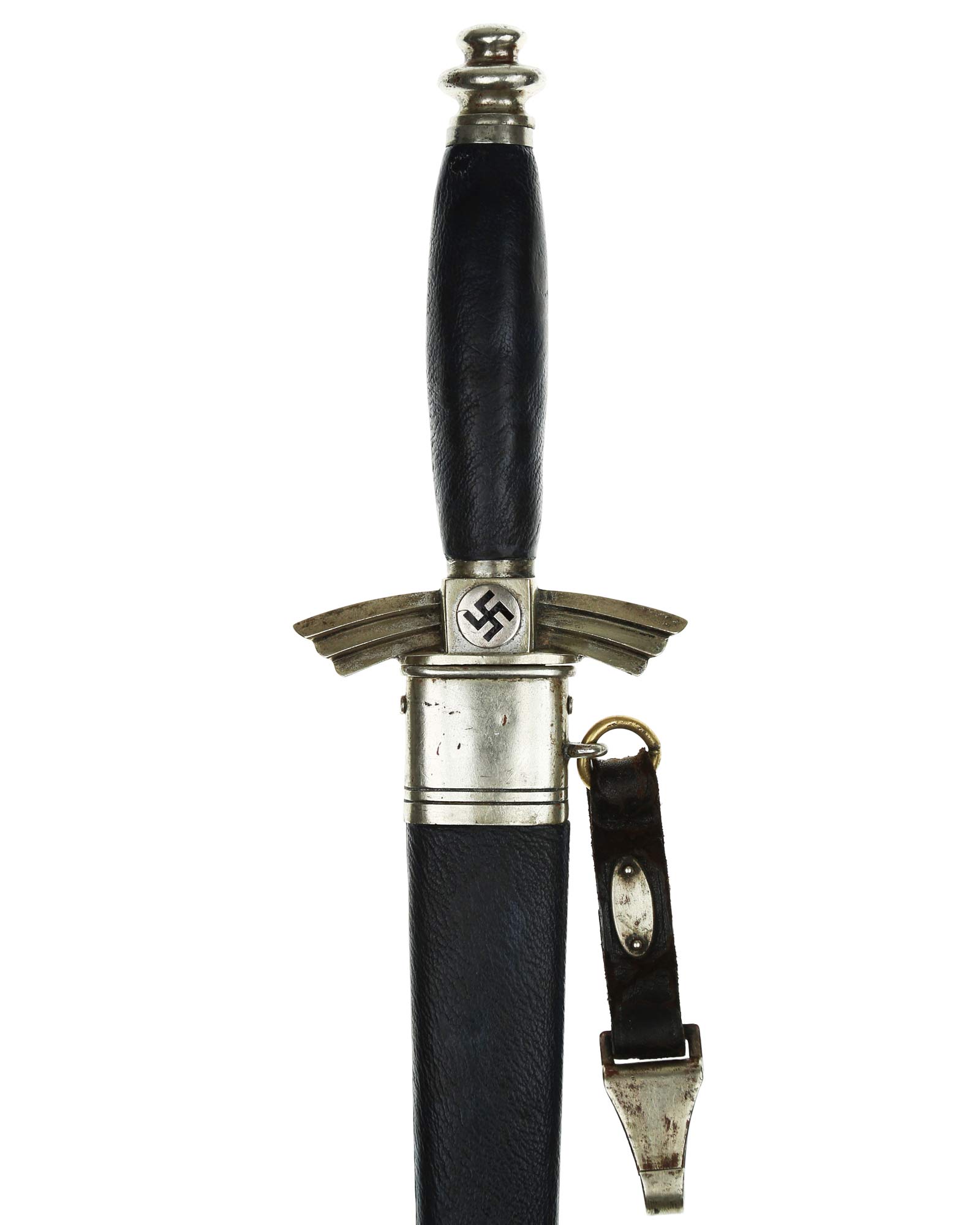 Griff: Der Griff besteht aus einem Holzkern und ist mit dunkelblauem Saffianleder (Marokkoleder) überzogen. Die Parierstange und der Knauf sind aus Neusilber gefertigt. Die Hakenkreuzmedaillons sind emailliert und in die Parierstange zentral eingesetzt. Die Parierstange hat die Form stilisierter Flügel und ist leicht nach unten gebogen. Seitlich am Flügel ist die Parierstange mit einem „K“ dem Kürzel des Gussherstellers versehen. Das DLV Messer wird durch einen am oberen Griffende verschraubten Knauf zusammengehalten.