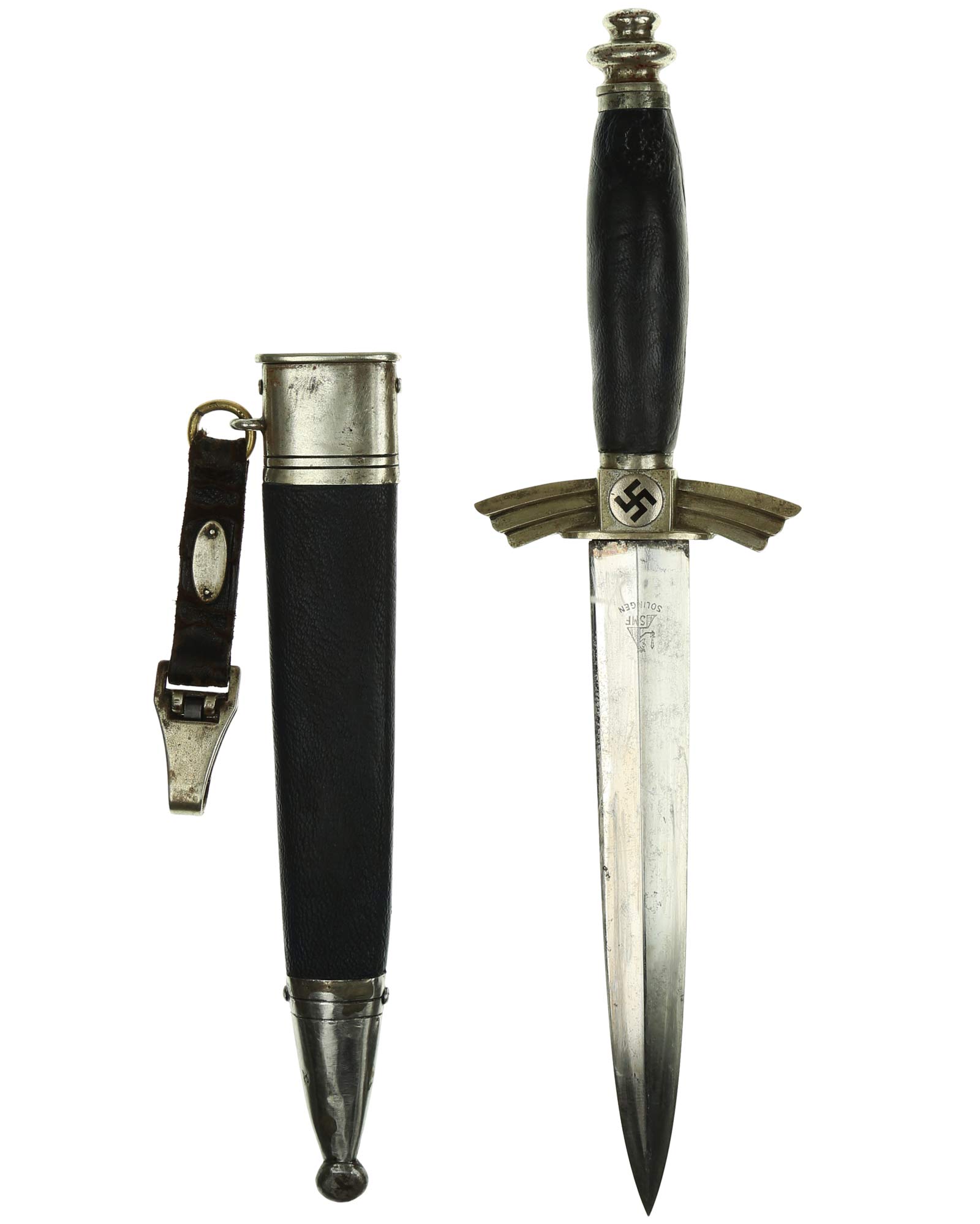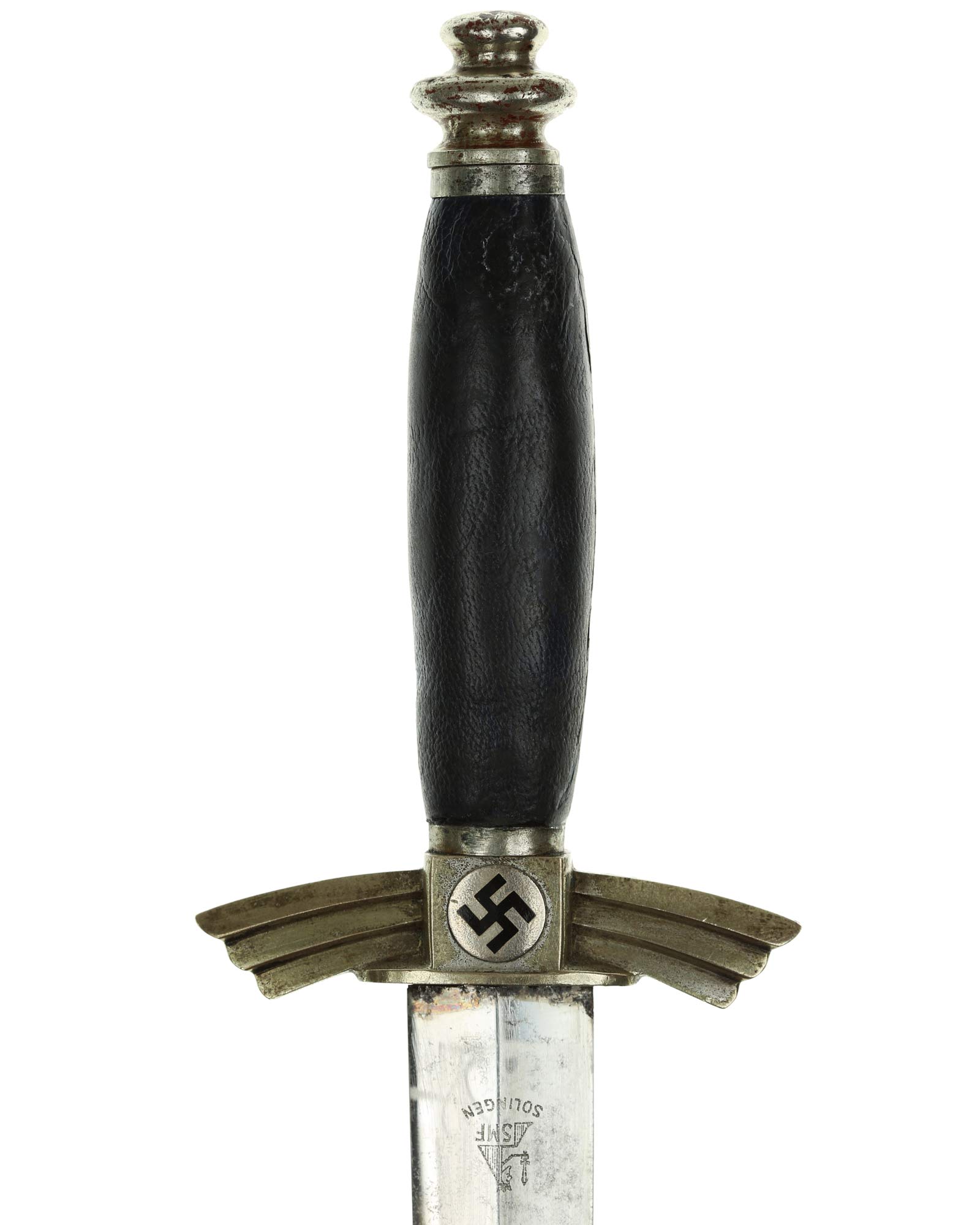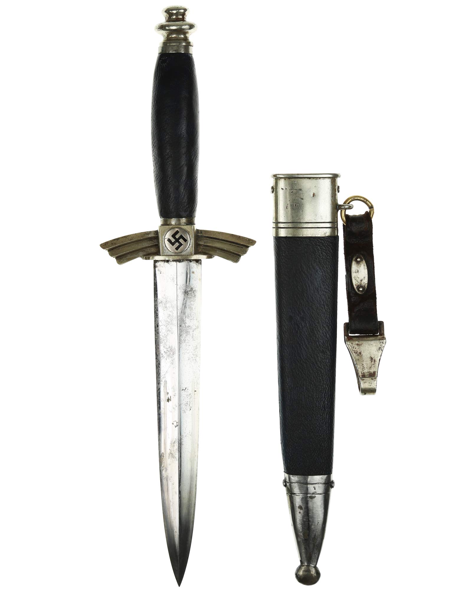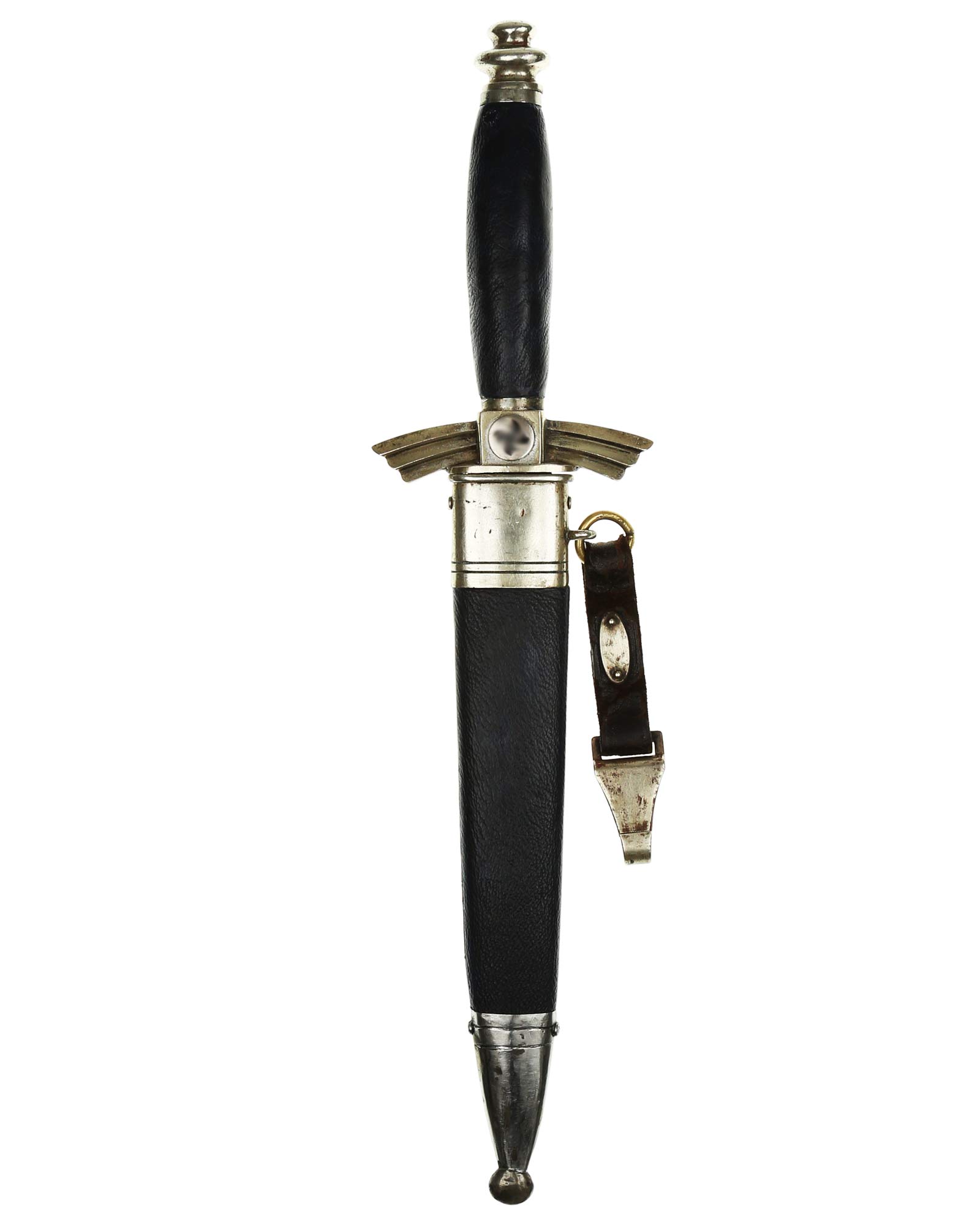 Griff: Der Griff besteht aus einem Holzkern und ist mit dunkelblauem Saffianleder (Marokkoleder) überzogen. Die Parierstange und der Knauf sind aus Neusilber gefertigt. Die Hakenkreuzmedaillons sind emailliert und in die Parierstange zentral eingesetzt. Die Parierstange hat die Form stilisierter Flügel und ist leicht nach unten gebogen. Seitlich am Flügel ist die Parierstange mit einem „K“ dem Kürzel des Gussherstellers versehen. Das DLV Messer wird durch einen am oberen Griffende verschraubten Knauf zusammengehalten.