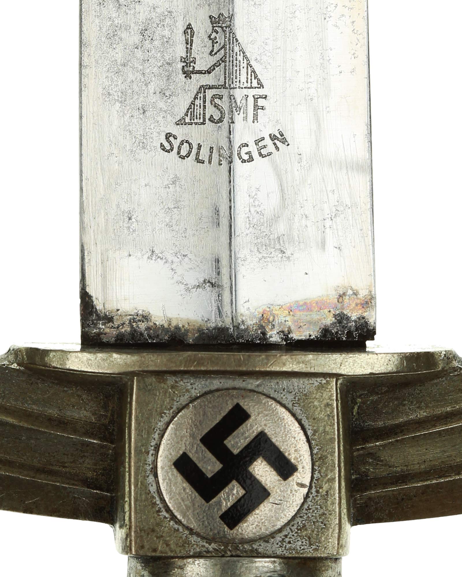 Klinge: Die Klinge ist zweischneidig und in einem ungereinigten Zustand. Die Gesamtlänge der Klinge beträgt 175 mm und an der breitesten Stelle 25,28 mm. Auf der Rückseite der Klinge befindet sich das Herstellerlogo:SMF (Stöcker & Co.), Solingen.