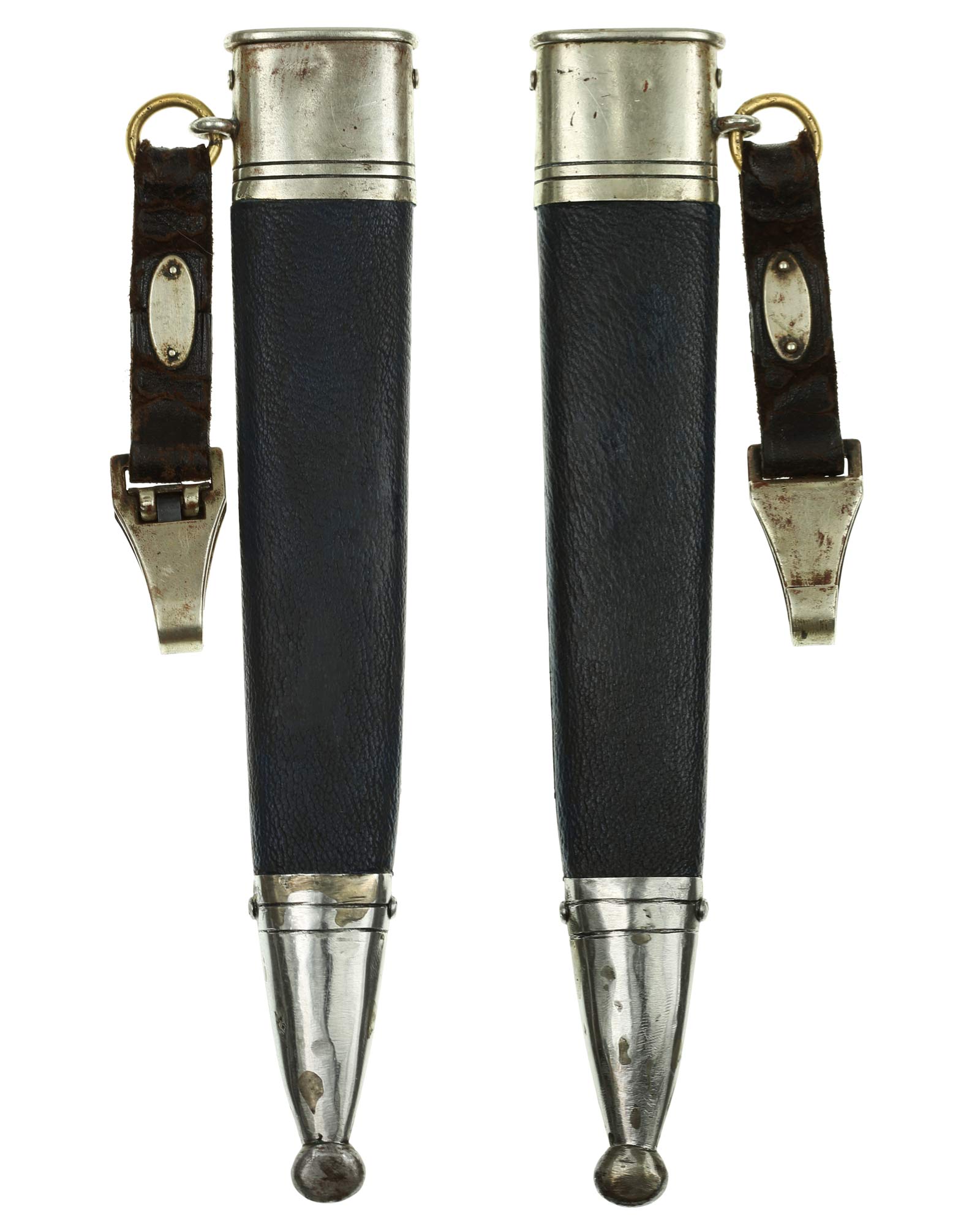 Scheide: Die Scheide ist aus Eisen und ebenfalls mit dunkelblauem Saffianleder (Marokkoleder) überzogen. Die Scheidenbeschläge sind aus Neusilber und mit jeweils zwei rundumlaufenden Zierrillen versehen. Der obere Scheidenbeschlag besteht aus zwei Teilen. Mittels zweier Schrauben ist der obere und untere Scheidenbeschlag mit der Scheide mit Flachkopfschrauben verschraubt. Das Mundstück ist mit einem DLV Stempel versehen. Am Tragering der Scheide ist der Lederhänger befestigt.