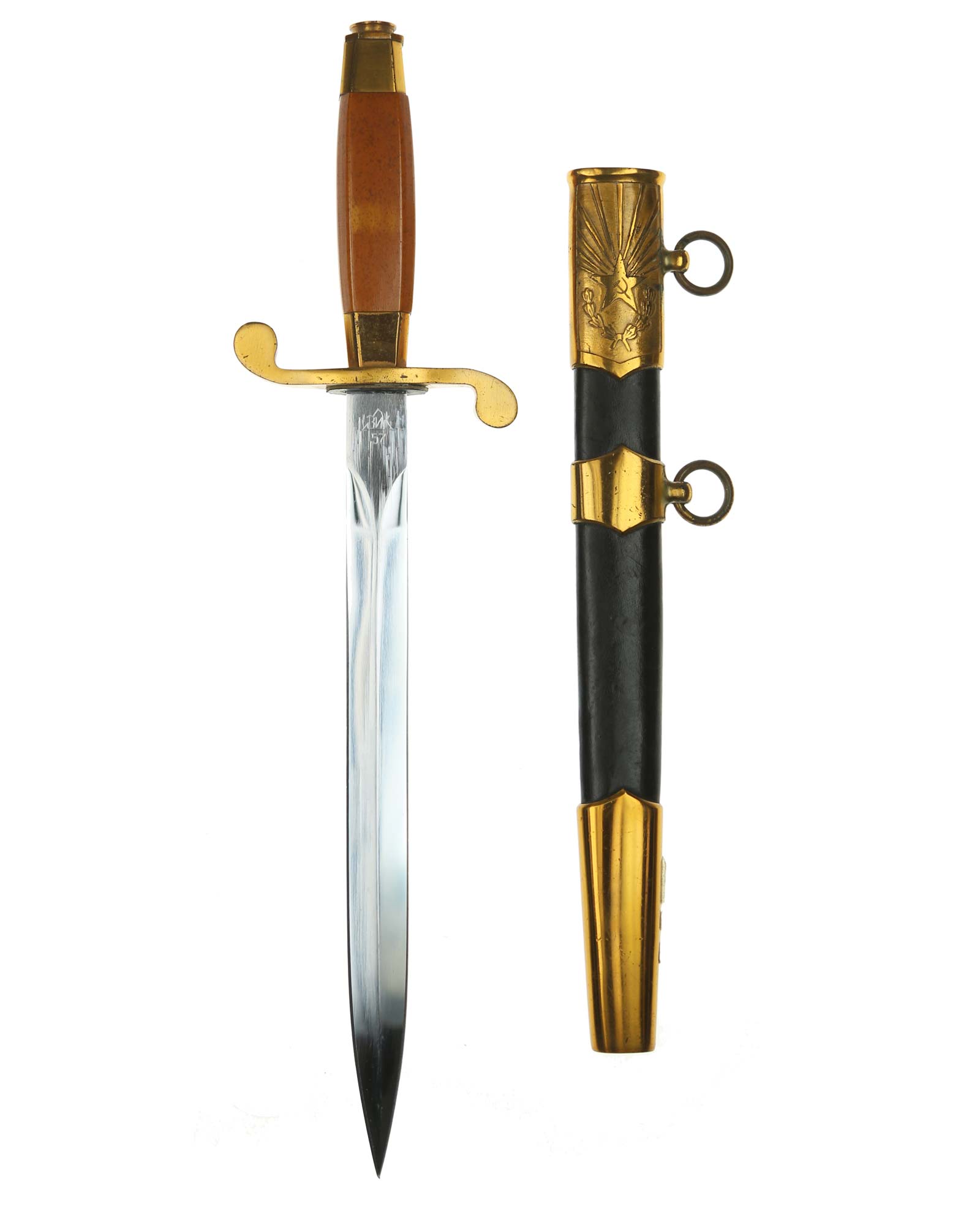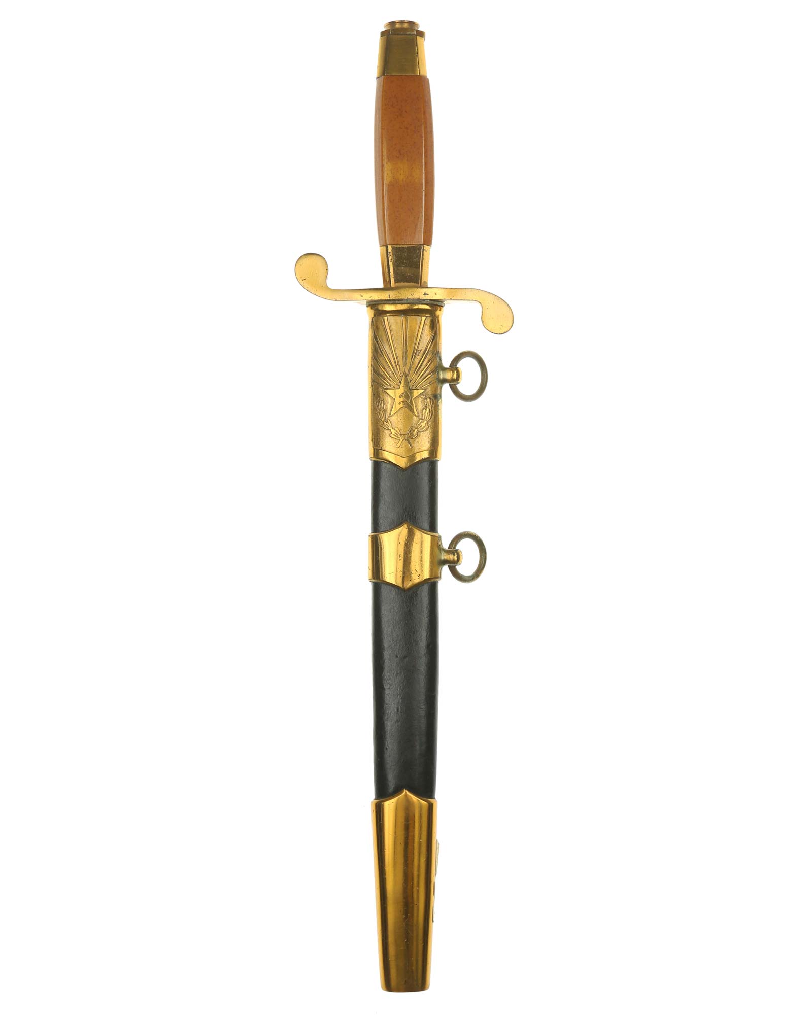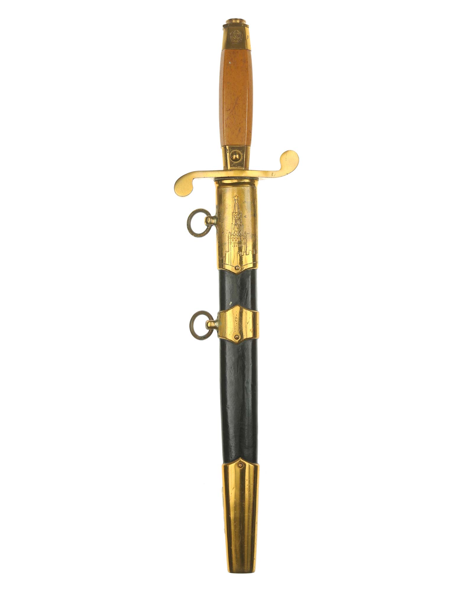 Dolch für Offiziere des Heeres der UdSSR/Sowjetunion mit gelb-braunen Griff, Beschläge in Rot- und Gelbgold vergoldet. Oberhalb des Griffes befindet sich ein Staatsemblem. Die Klinge ist blank mit Hersteller Zik (Зик) und Kammernummer X03731, sowie 1957. Die Klinge ist zweischneidig mit Mittelgrat. Scheide ist schwarz beledert mit drei vergoldeten Beschlägen. Oberer Beschlag mit sowj. Stern (Hammer und Sichel) und Kreml-Gebäude (Spasski-Turm). Der Griff ist mit Druckknopf.