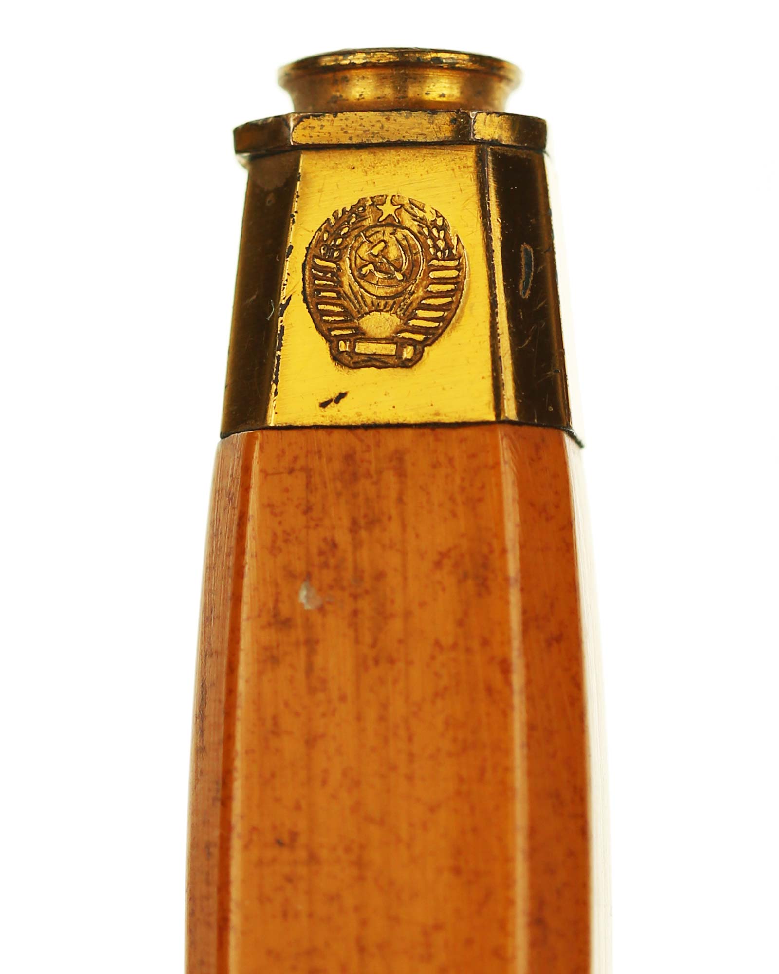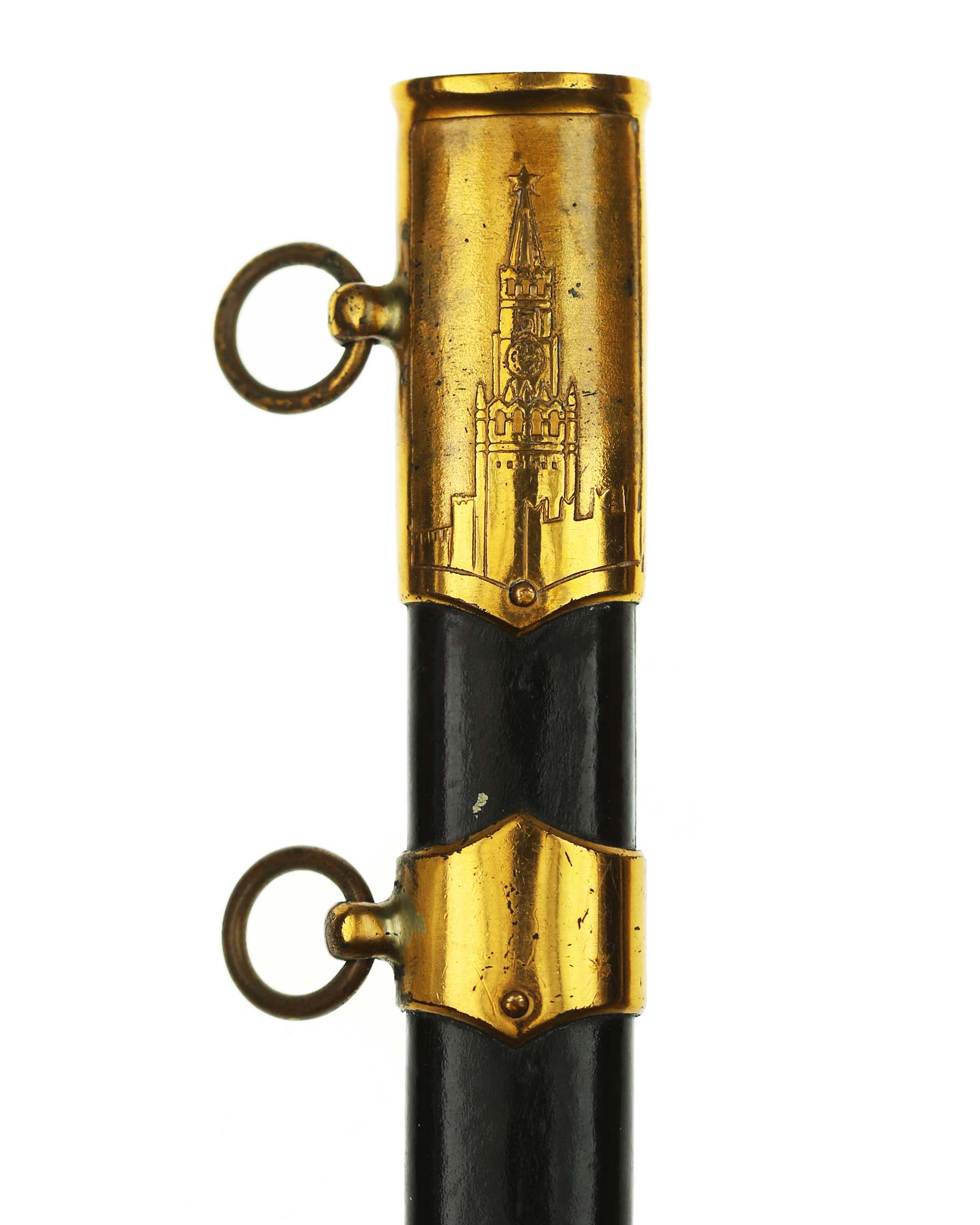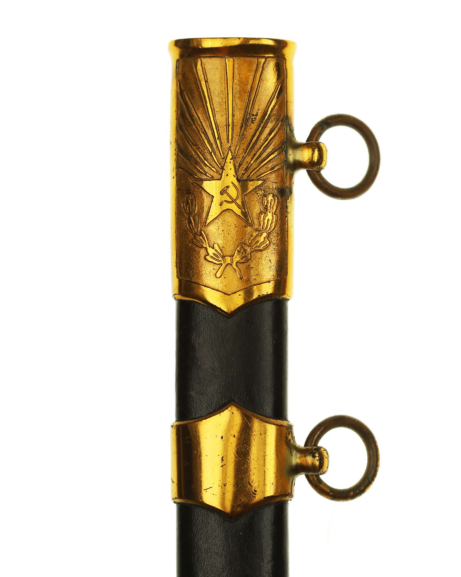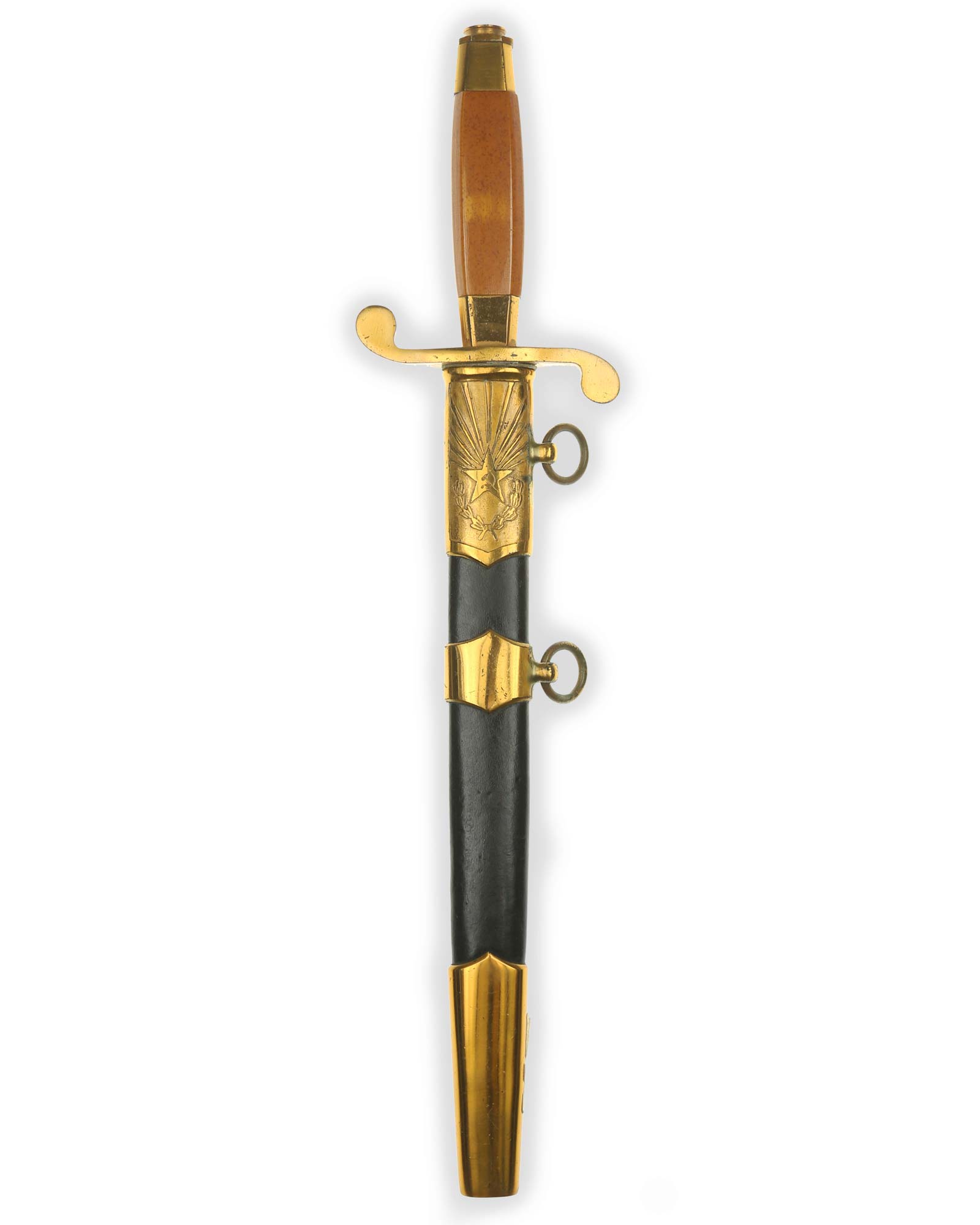 Dolch für Offiziere des Heeres der UdSSR/Sowjetunion mit gelb-braunen Griff, Beschläge in Rot- und Gelbgold vergoldet. Oberhalb des Griffes befindet sich ein Staatsemblem. Die Klinge ist blank mit Hersteller Zik (Зик) und Kammernummer X03731, sowie 1957. Die Klinge ist zweischneidig mit Mittelgrat. Scheide ist schwarz beledert mit drei vergoldeten Beschlägen. Oberer Beschlag mit sowj. Stern (Hammer und Sichel) und Kreml-Gebäude (Spasski-Turm). Der Griff ist mit Druckknopf.