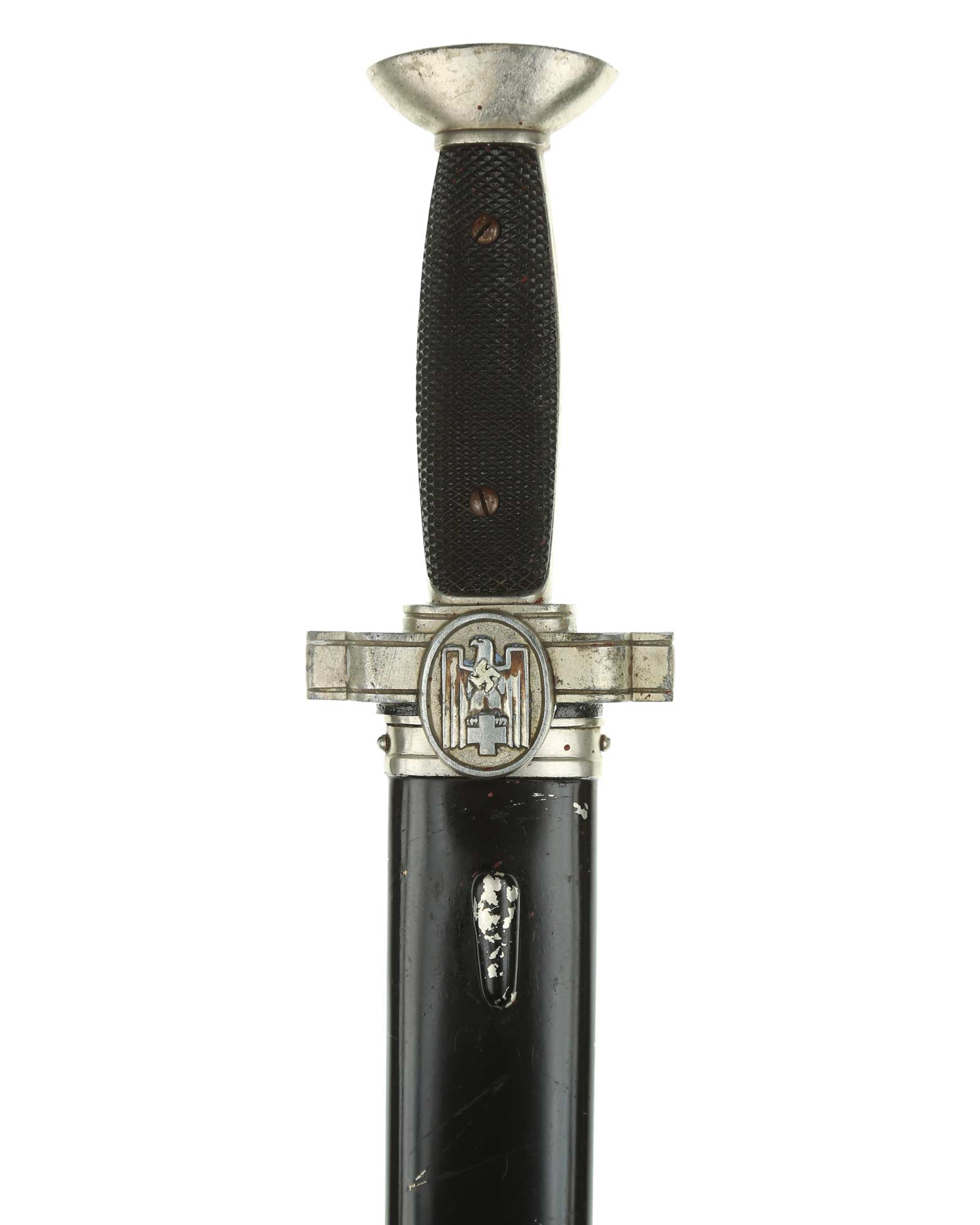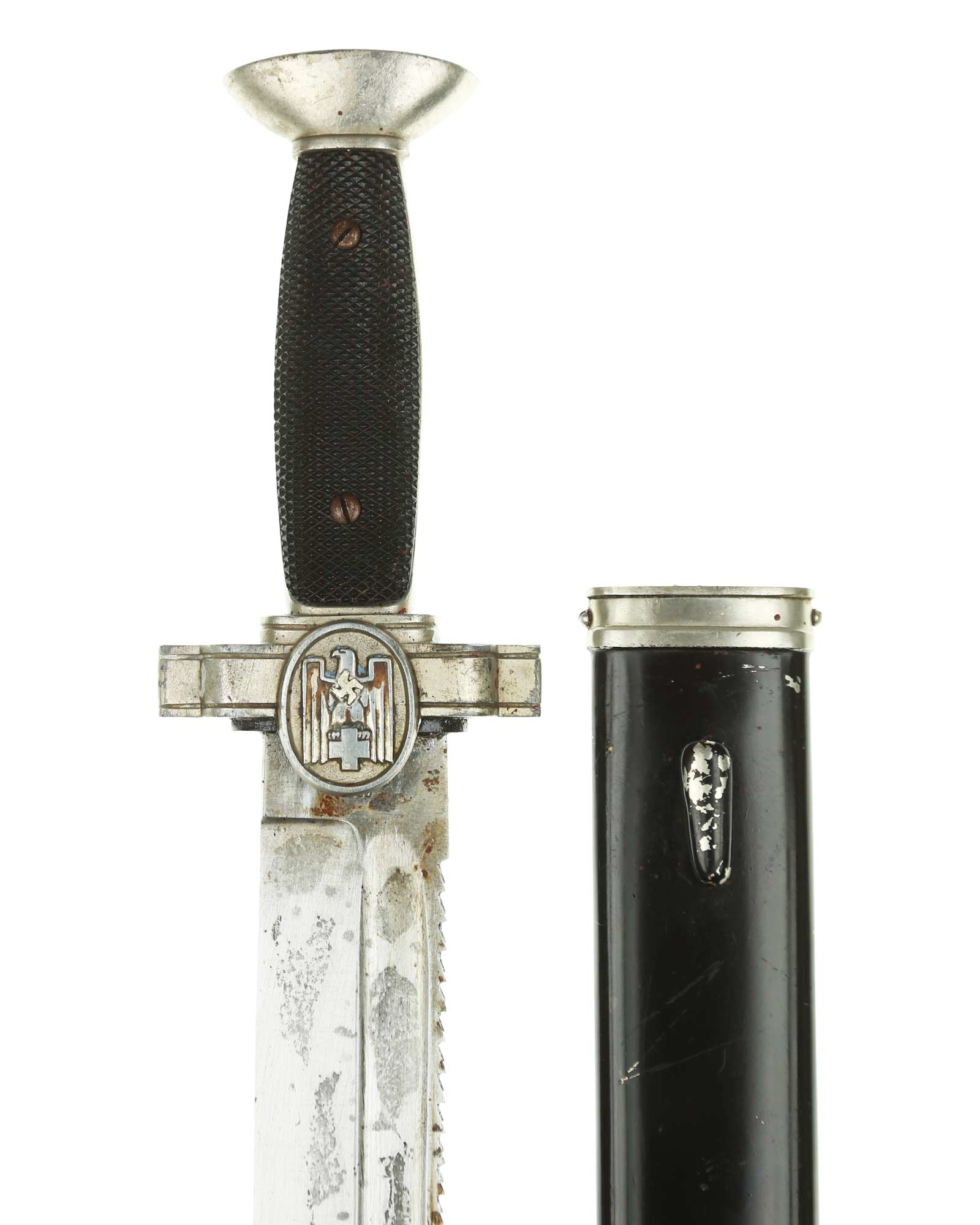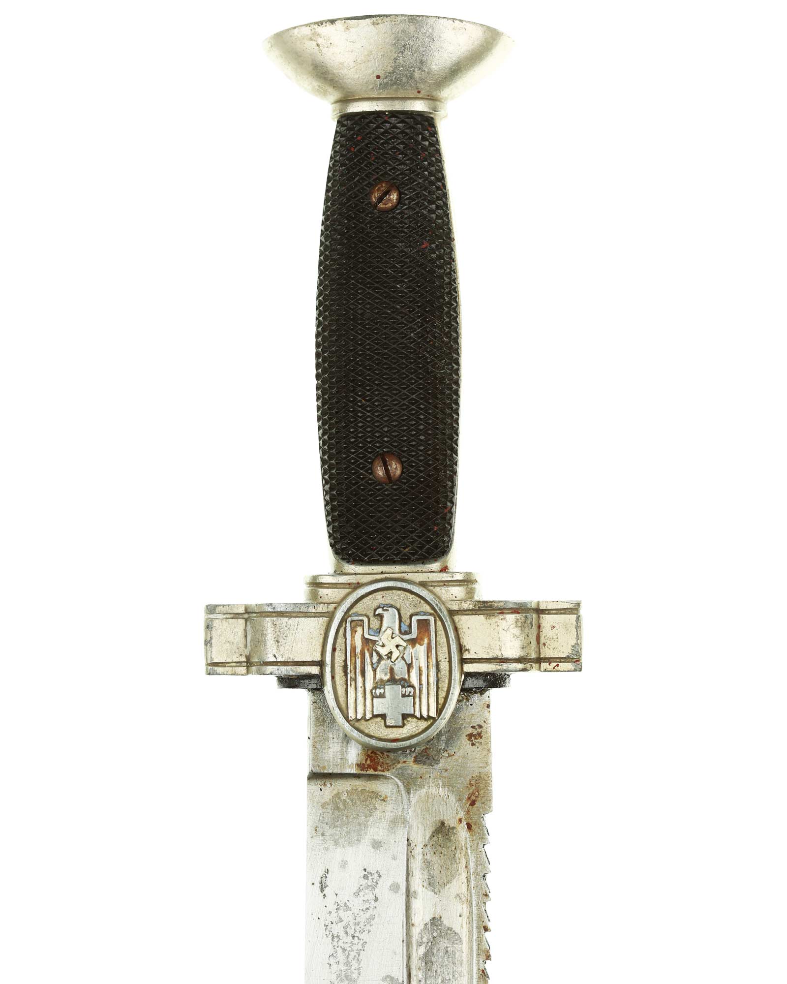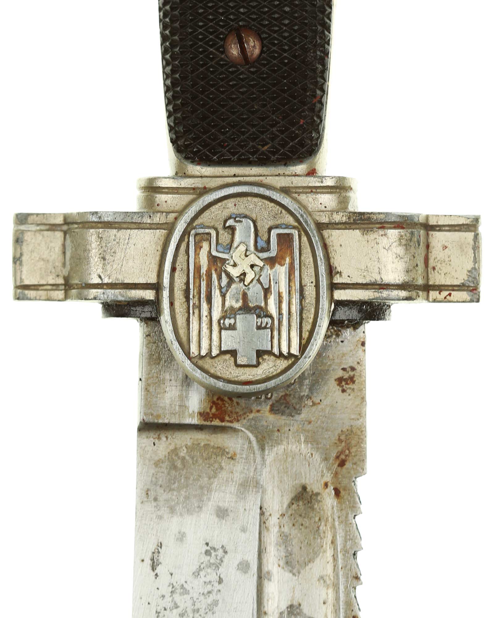 Griff: Nickelgriffstück mit verschraubten schwarzen Kunststoff-Griffschalen, diese werden durch zwei Schrauben festgehalten. Die Parierstange ist in Form eines Medaillons mit DRK Adler, der nach links schaut, dieser hält in seinen Krallen das DRK Kreuz. Das Hakenkreuz wurde erneuert.