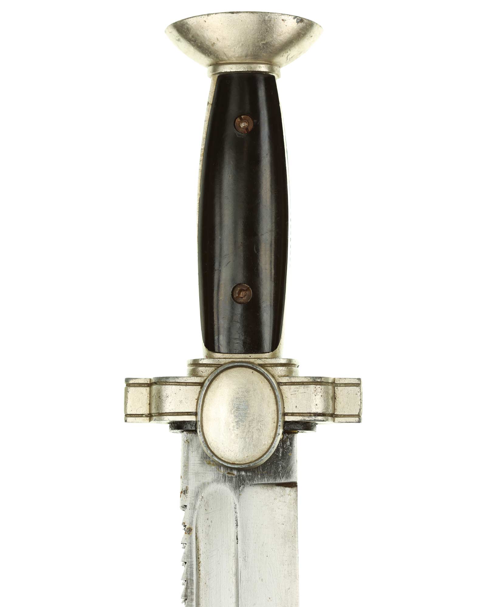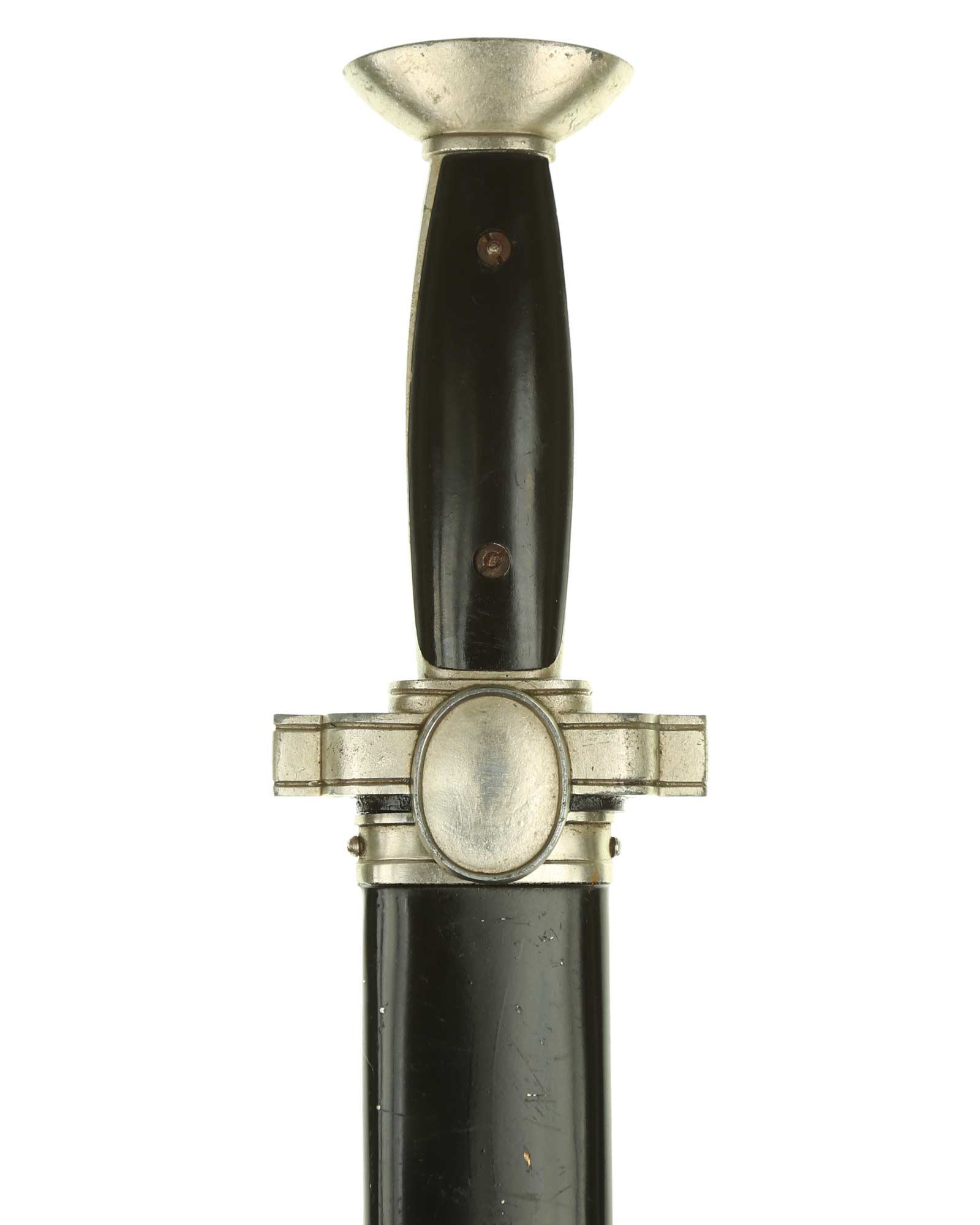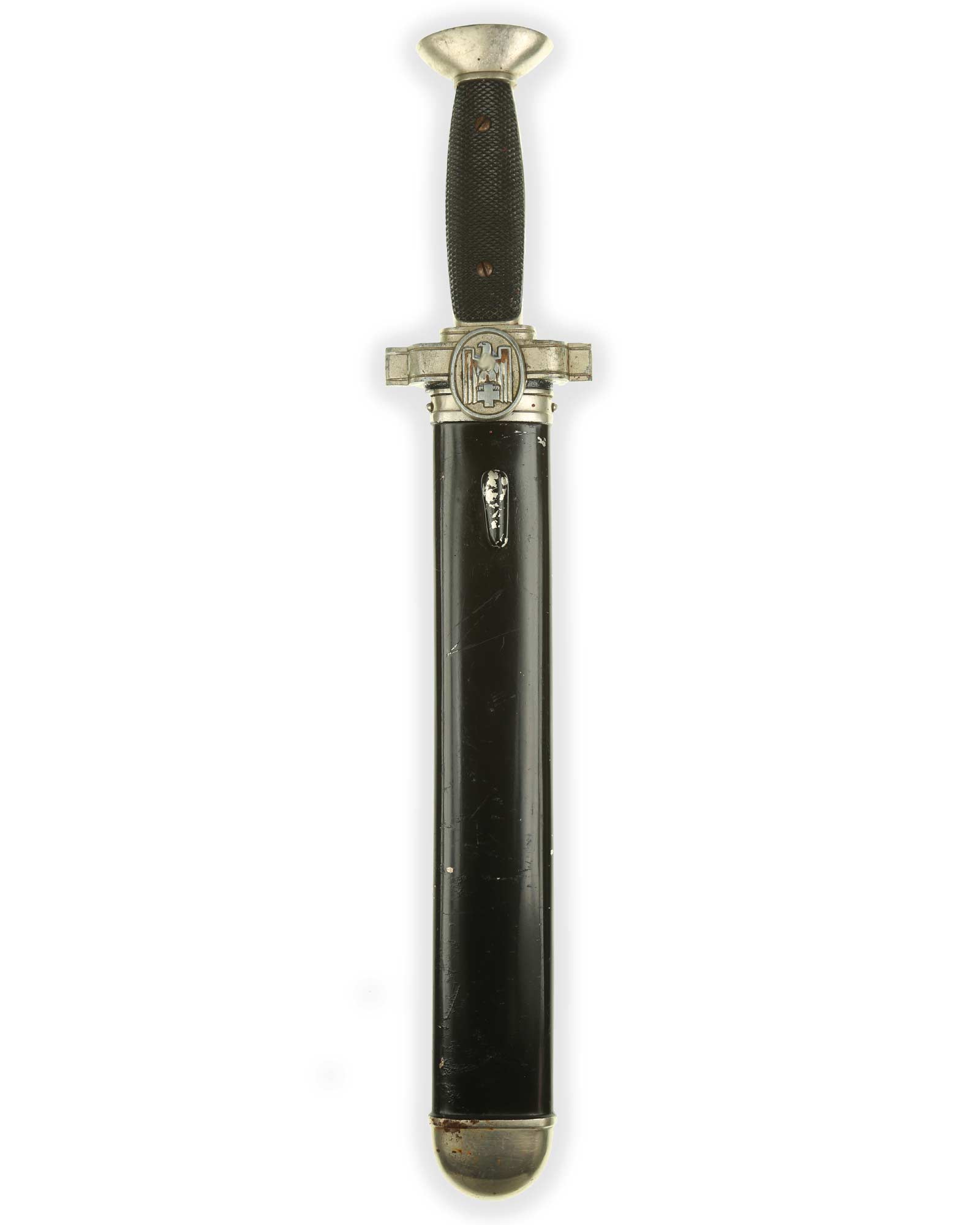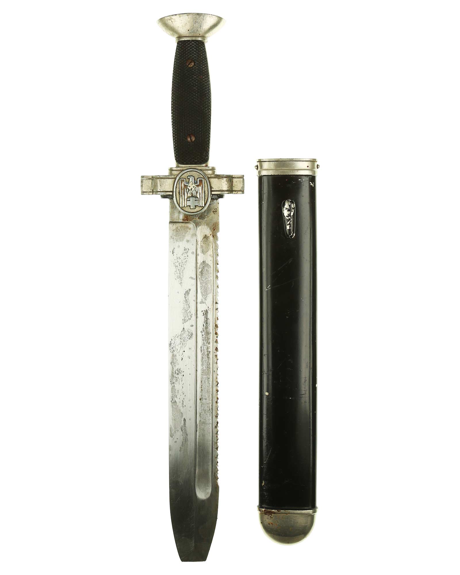 Griff: Nickelgriffstück mit verschraubten schwarzen Kunststoff-Griffschalen, diese werden durch zwei Schrauben festgehalten. Die Parierstange ist in Form eines Medaillons mit DRK Adler, der nach links schaut, dieser hält in seinen Krallen das DRK Kreuz. Das Hakenkreuz wurde erneuert.