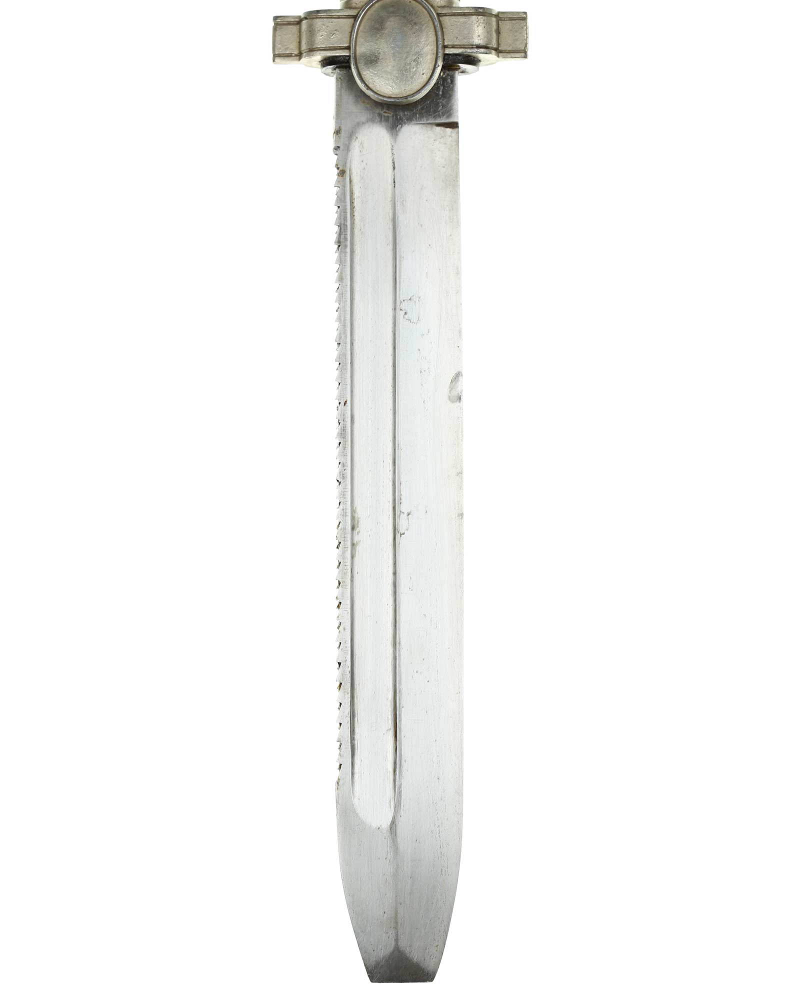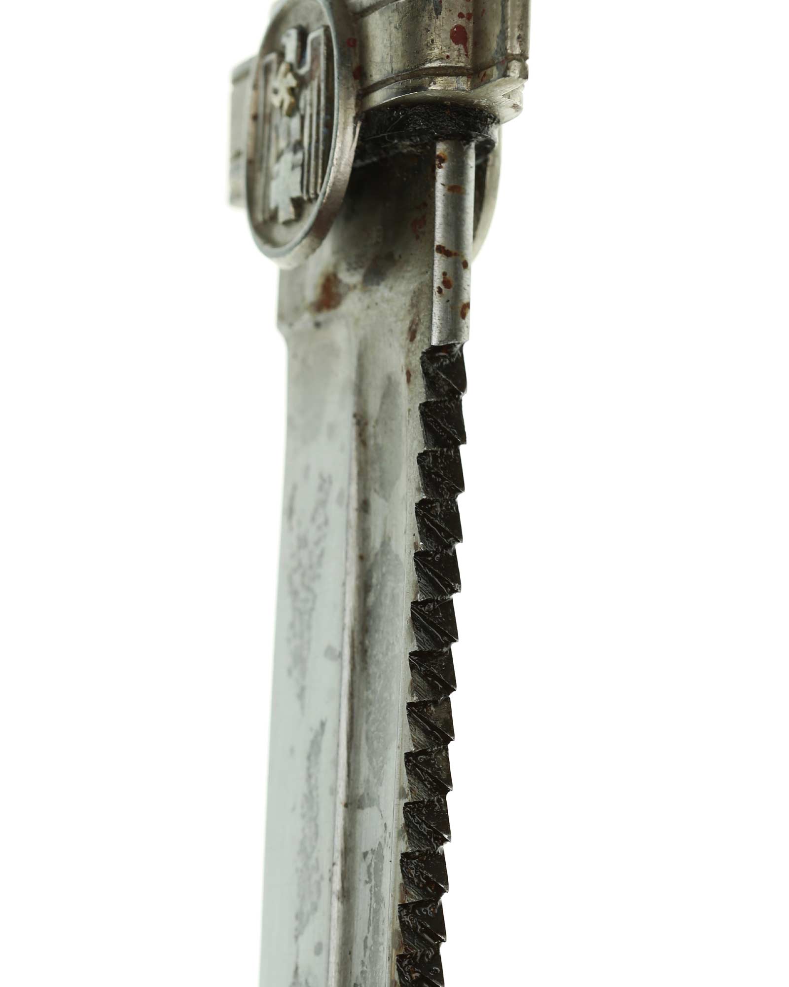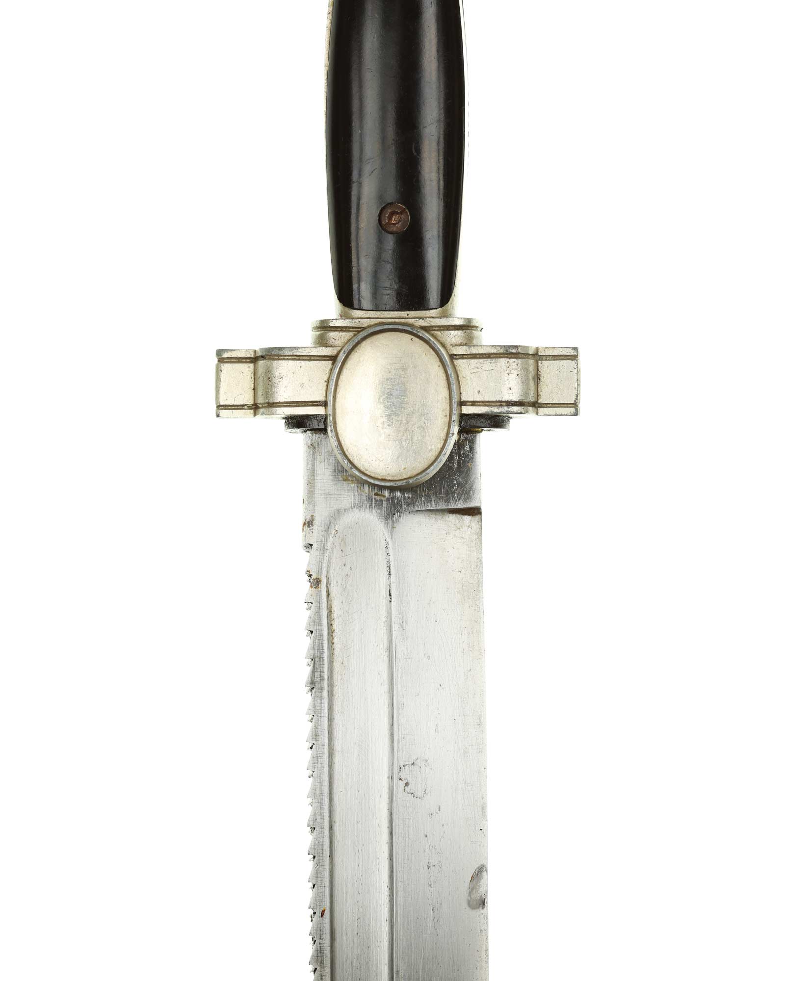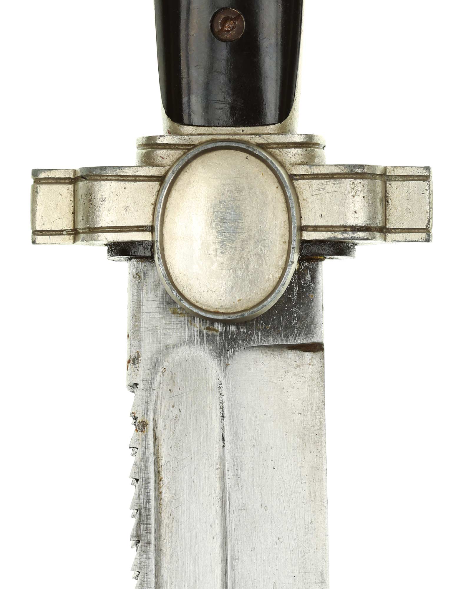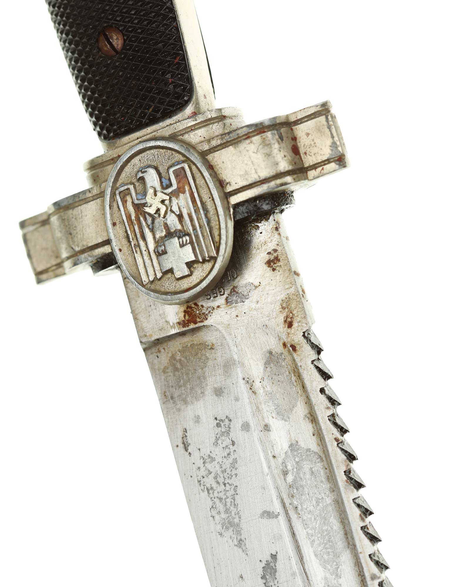 Klinge: Kräftige Kehlklinge mit Schutzkennzeichnung: Ges. Gesch. (Gesetzliche Geschützt). Die Klinge ist einschneidig mit Sägerücken.