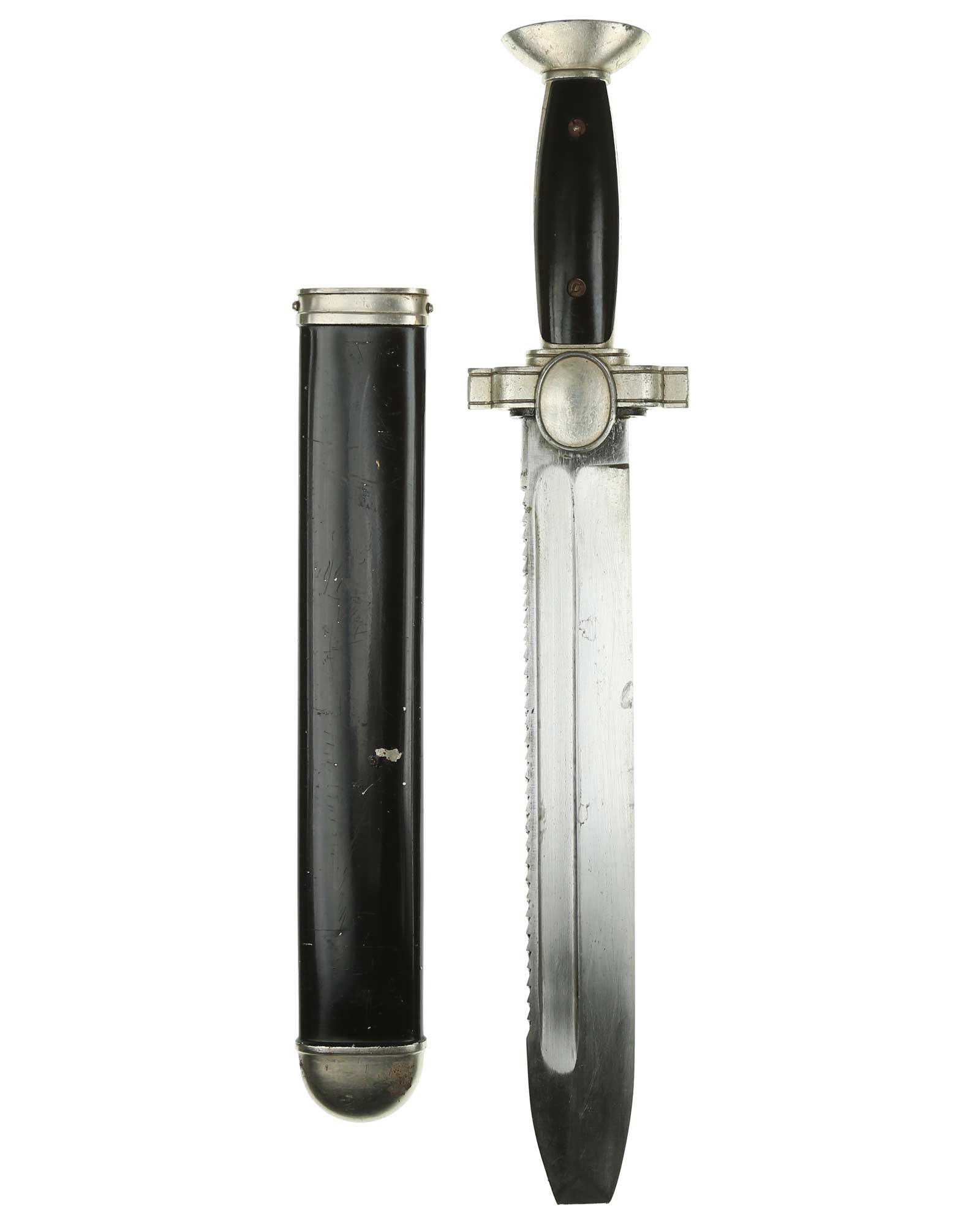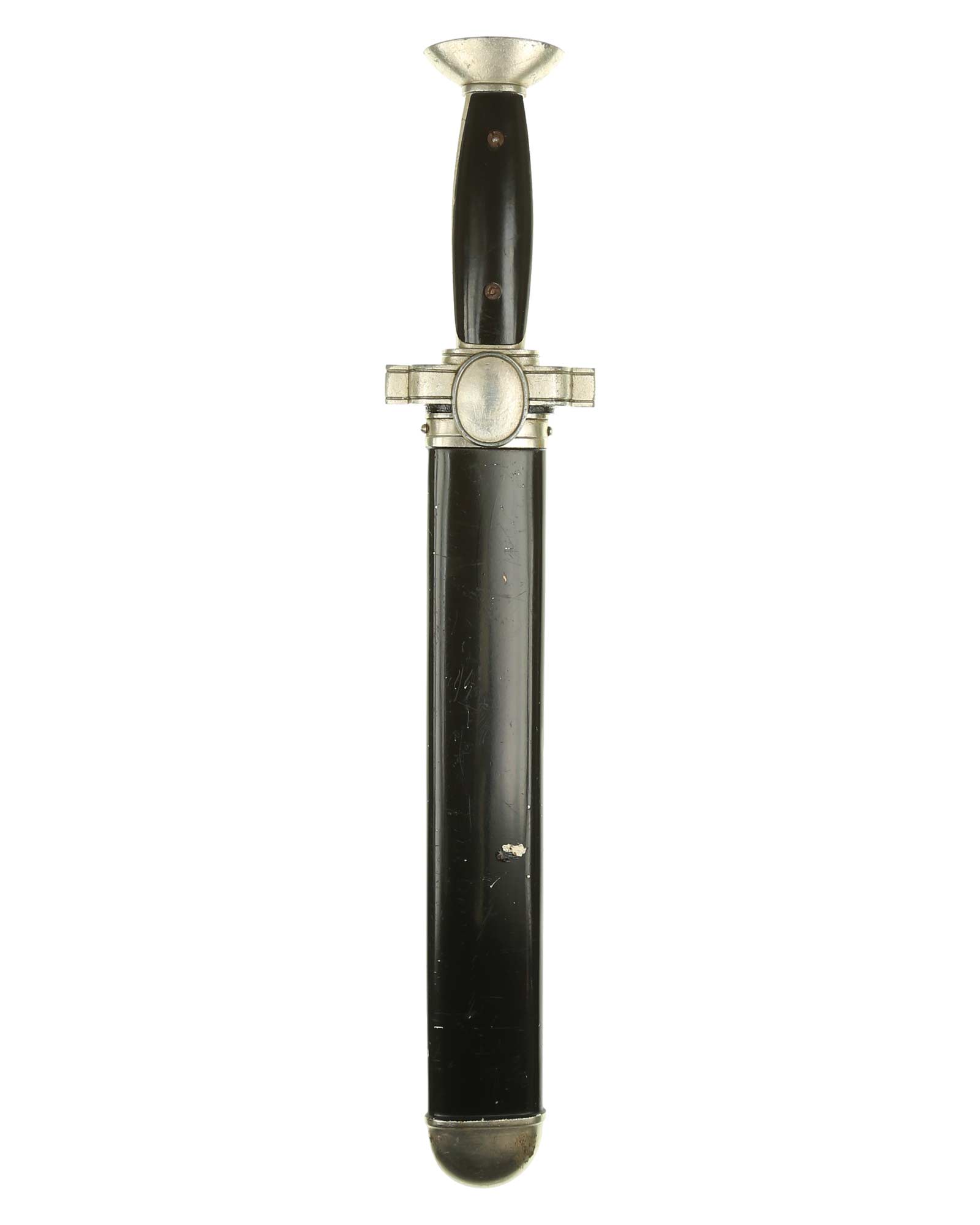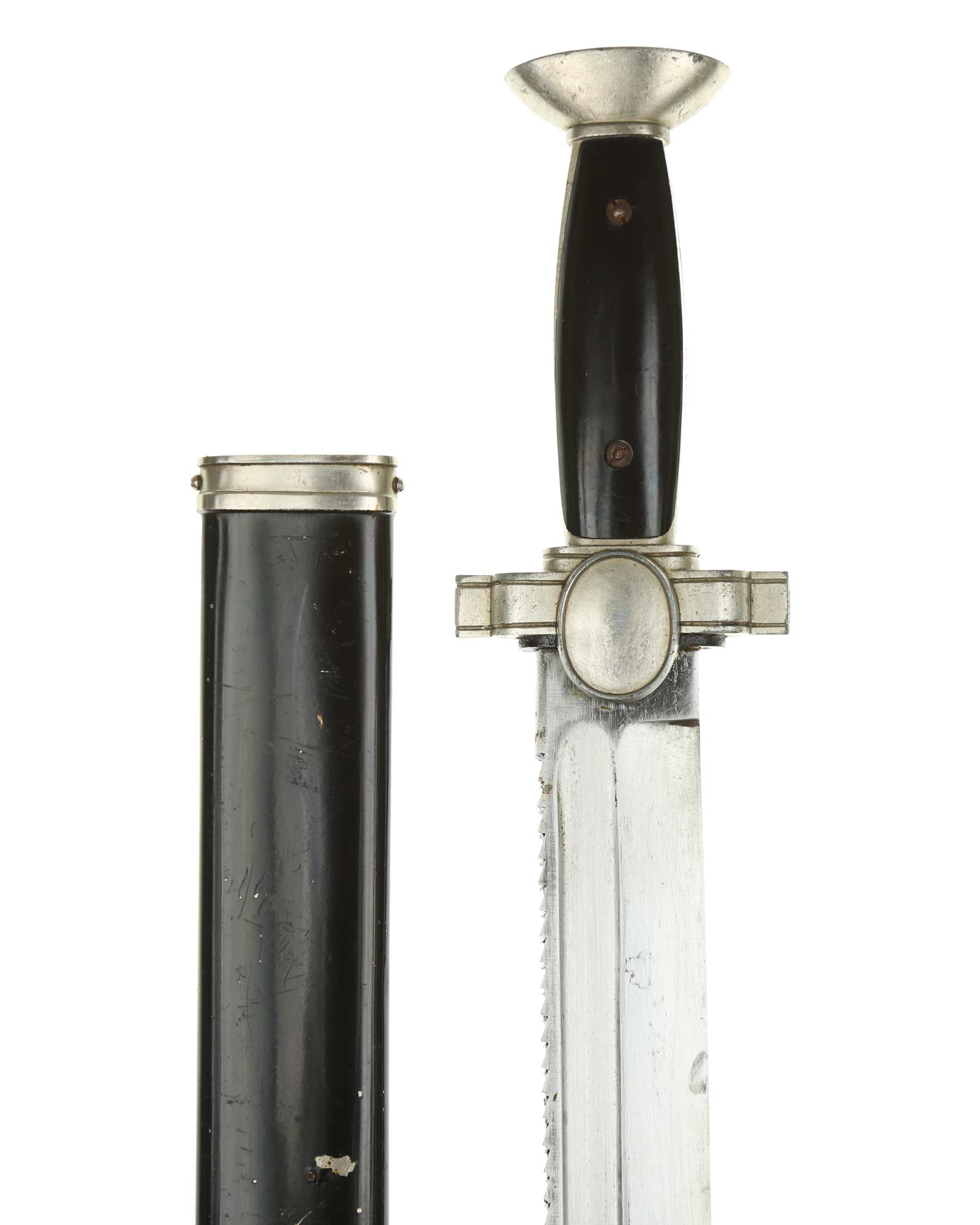 Scheide: Schwarz lackierte Stahlscheide mit 98% Originallack. Die Beschläge werden mit seitlich angebrachten Schrauben festgehalten. Im oberen Bereich befindet sich der Halteknauf, zum Einhängen des Koppelschuhs.