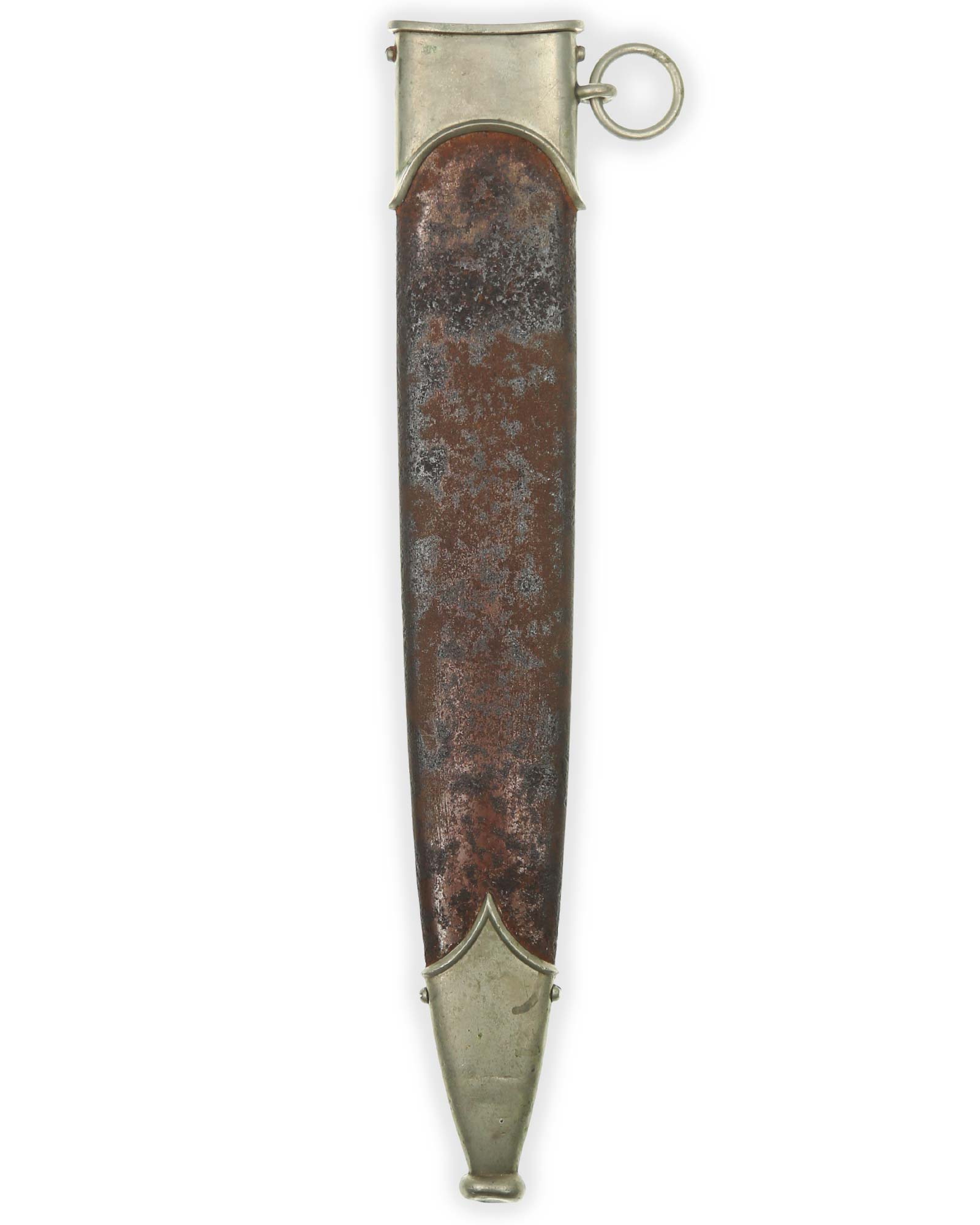 Die Scheide ist aus Eisen mit beiden Scheidenbeschläge, diese sind aus vernickeltem Stahlblech. Die Beschläge werden mit jeweils zwei Schräubchen seitlich gehalten.