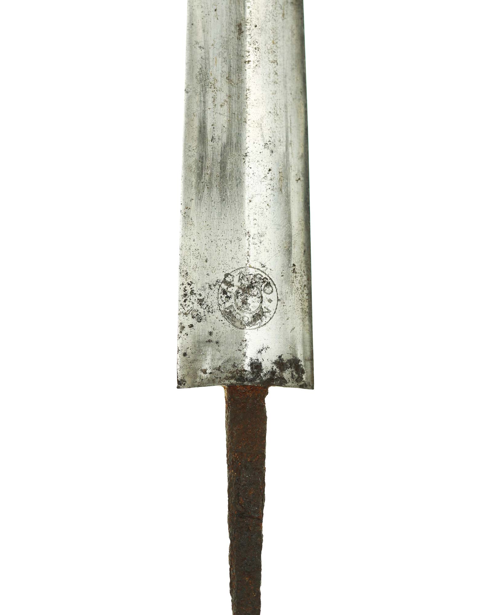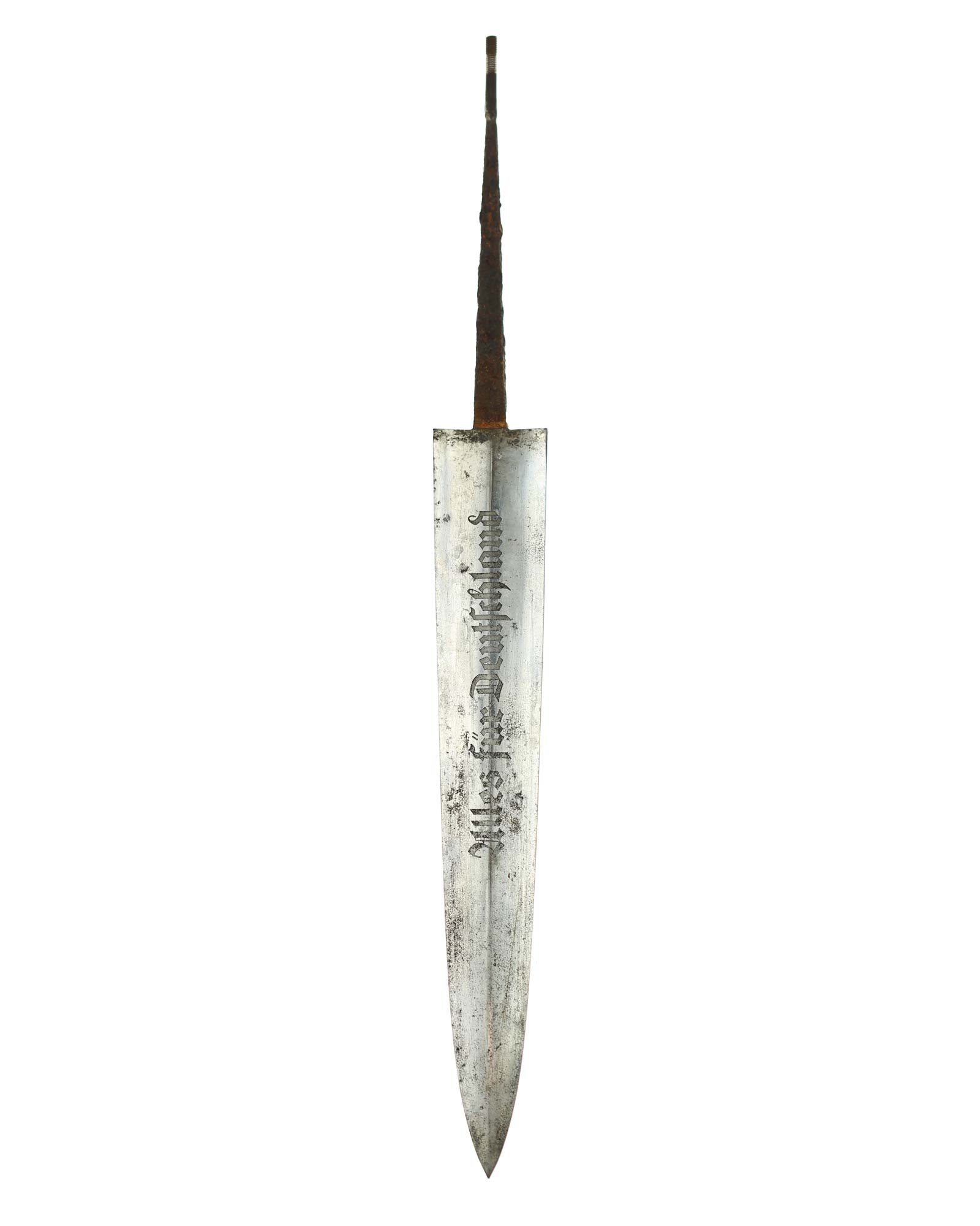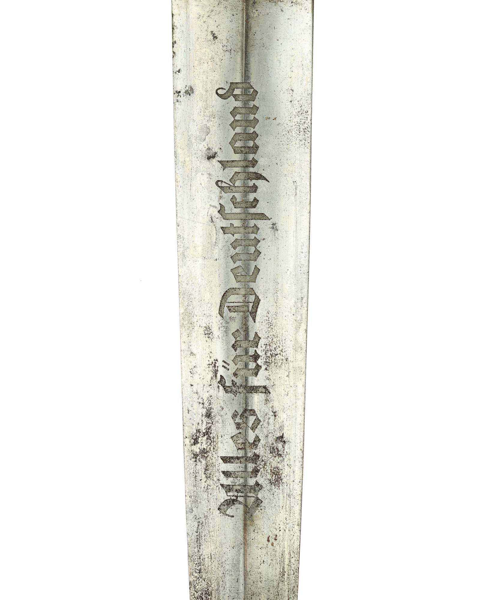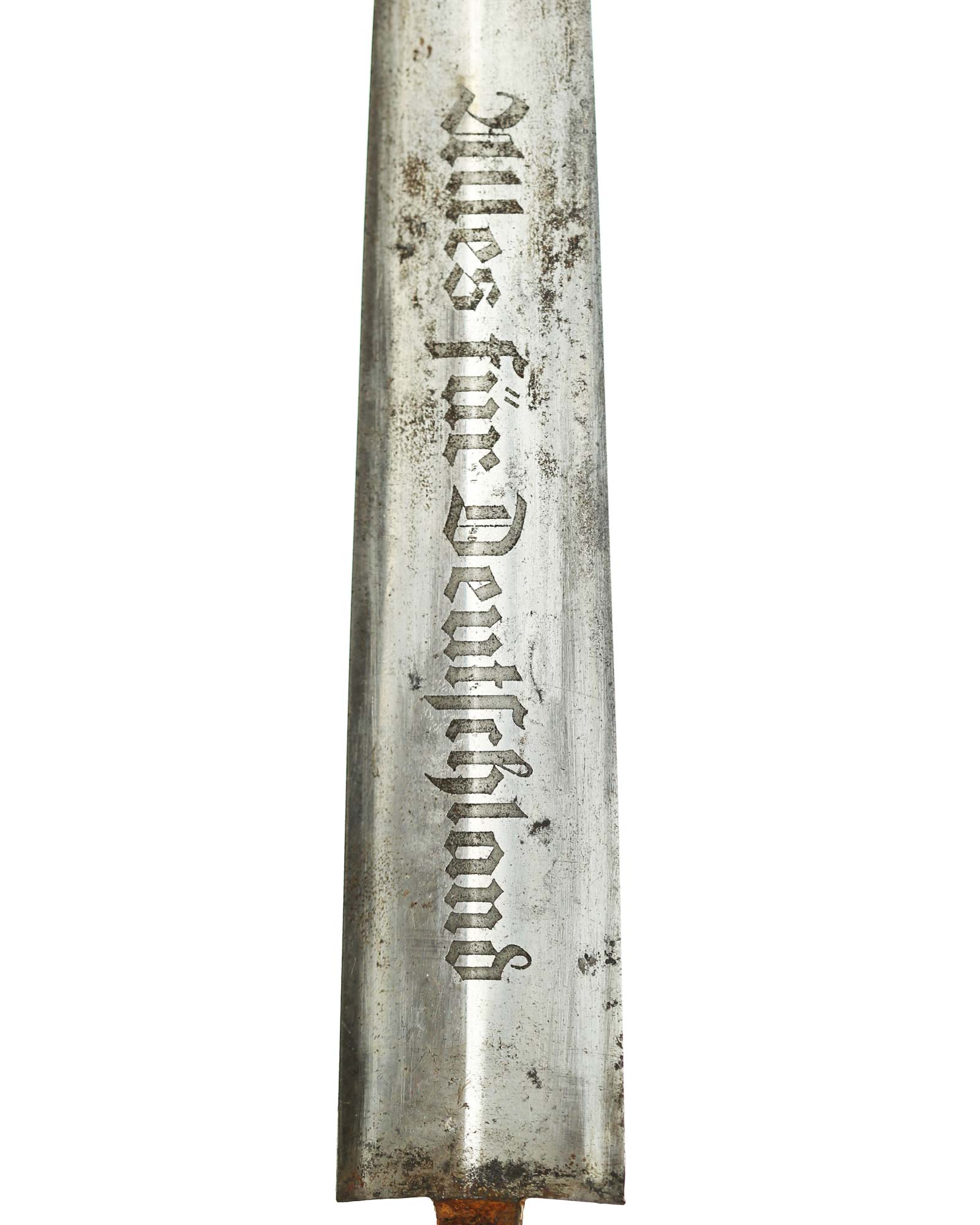 Die Klinge ist blank und zweischneidig. Auf der Vorderseite der Klinge befindet sich die SA Devise, mit der Inschrift: Alles für Deutschland. Auf der Rückseite befindet sich das Herstellerlogo HACO Berlin. Das Gewinde ist unbeschädigt.