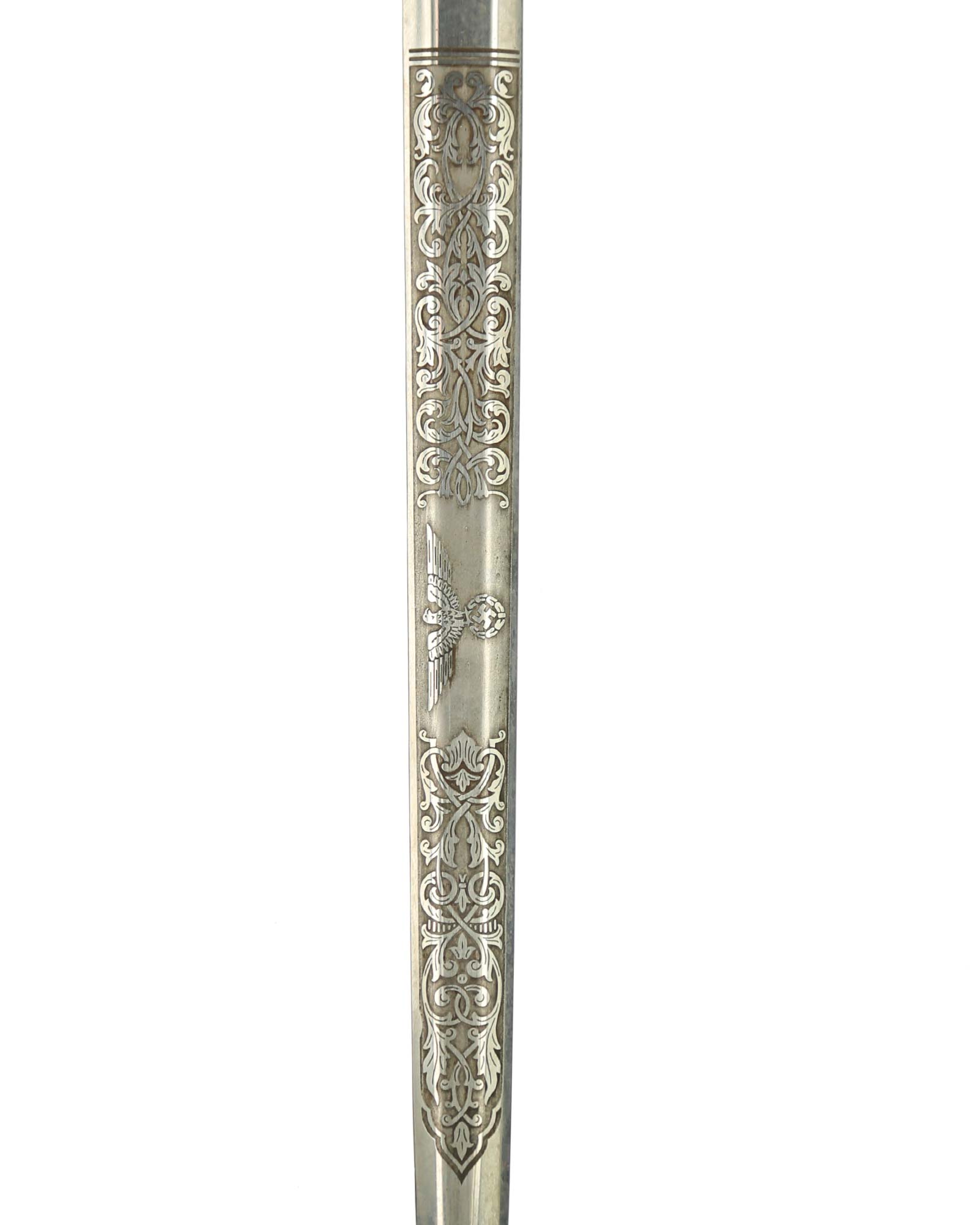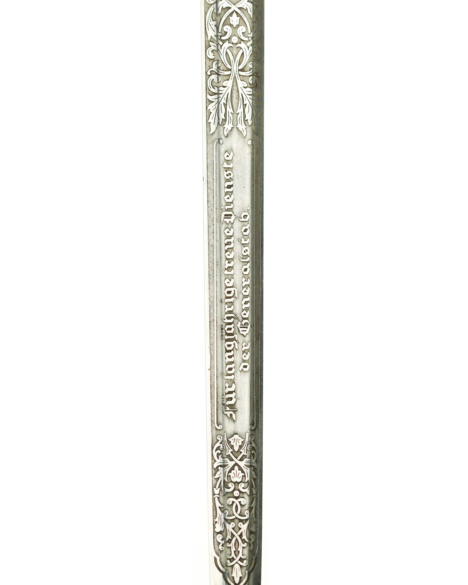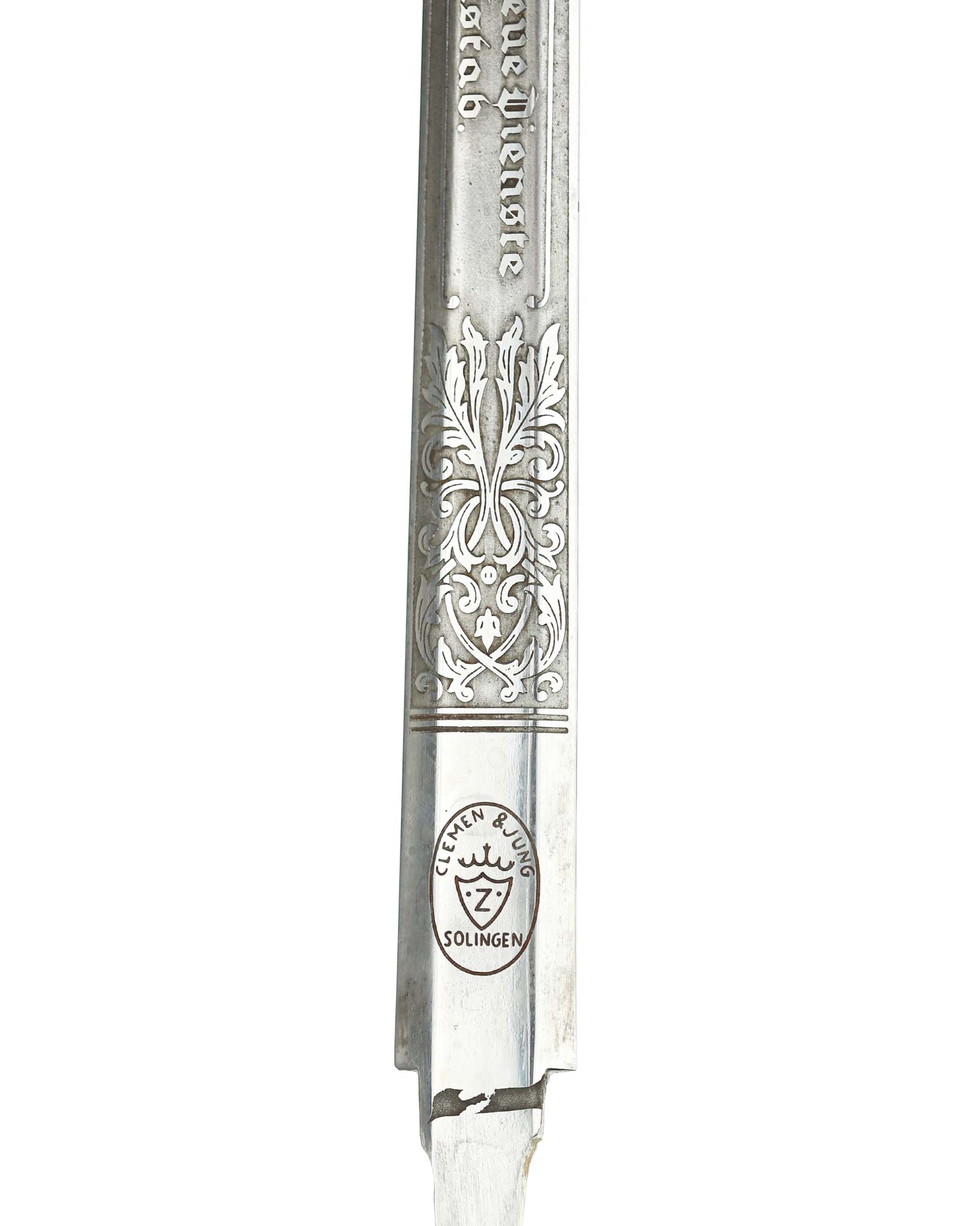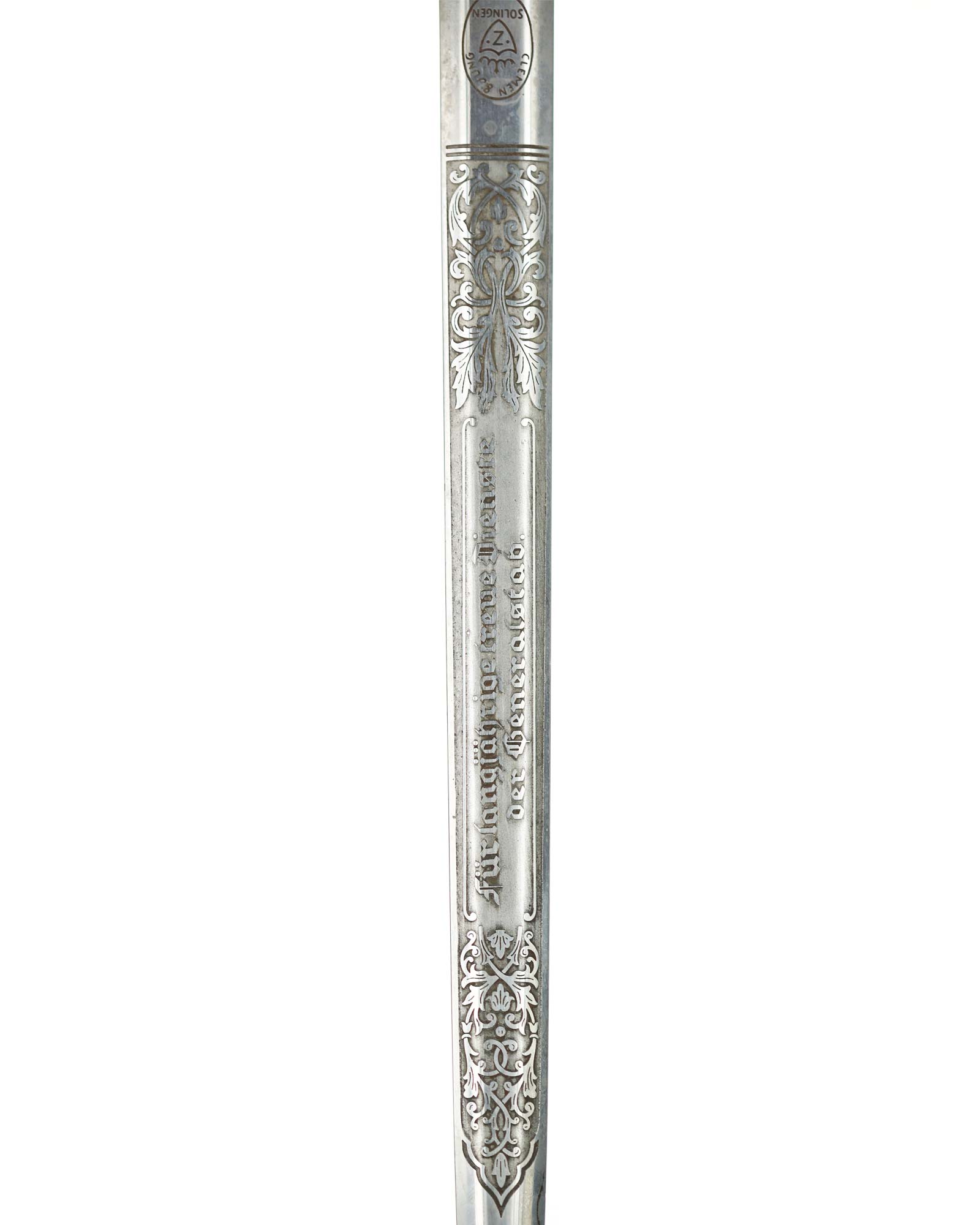 Die Klinge ist zweischneidig mit Zierätzung und Gravur "Für langjährige treue Dienste der Generalstab". Auf der Rückseite befindet sich das Herstellerlogo: Clemen Jung Solingen. Es handelt sich hierbei um eine hervorragende Museums & Sammleranfertigung. Klingen-Breite bis 18 mm., Klingen-Länge 257 mm., Gesamt-Länge 365 mm