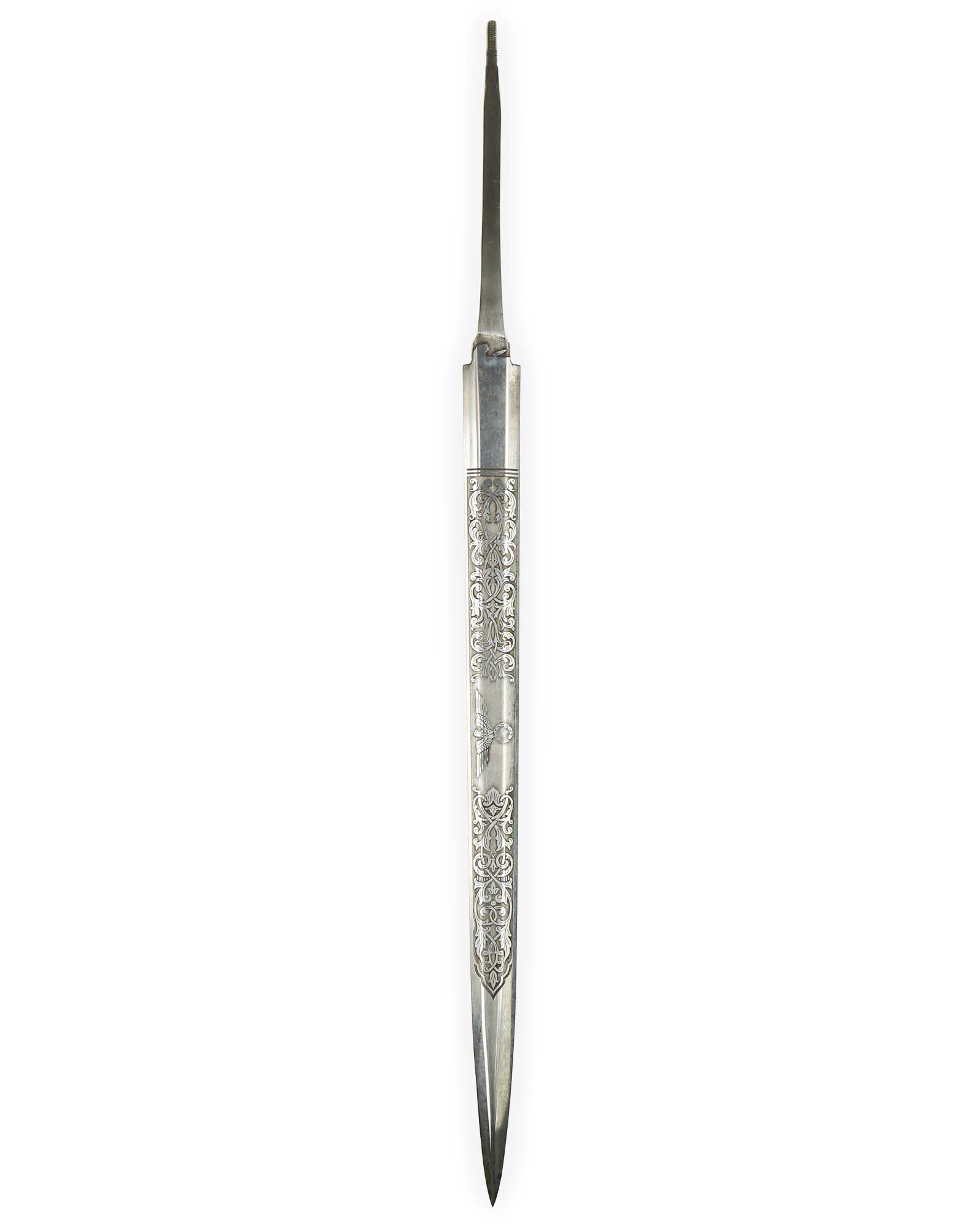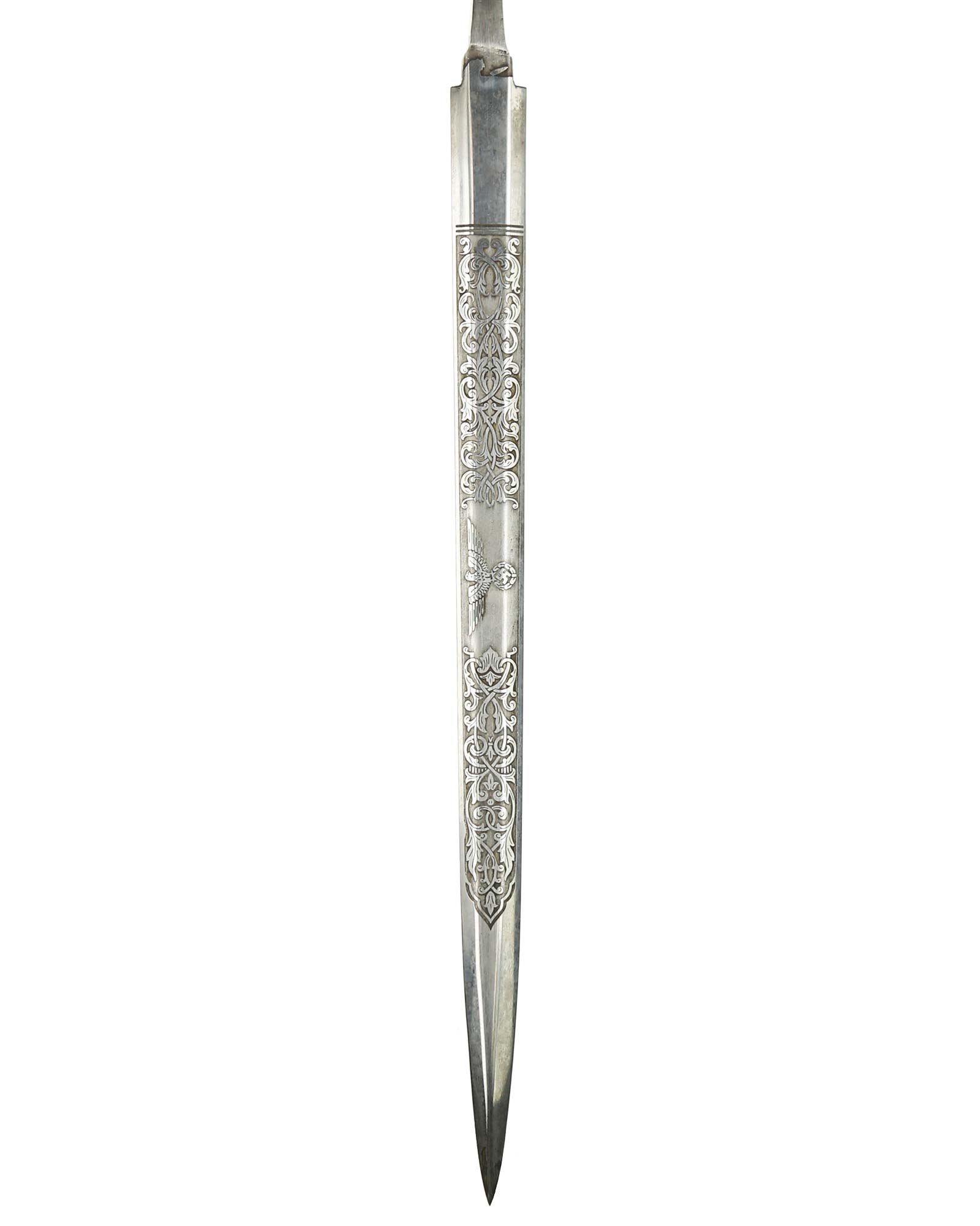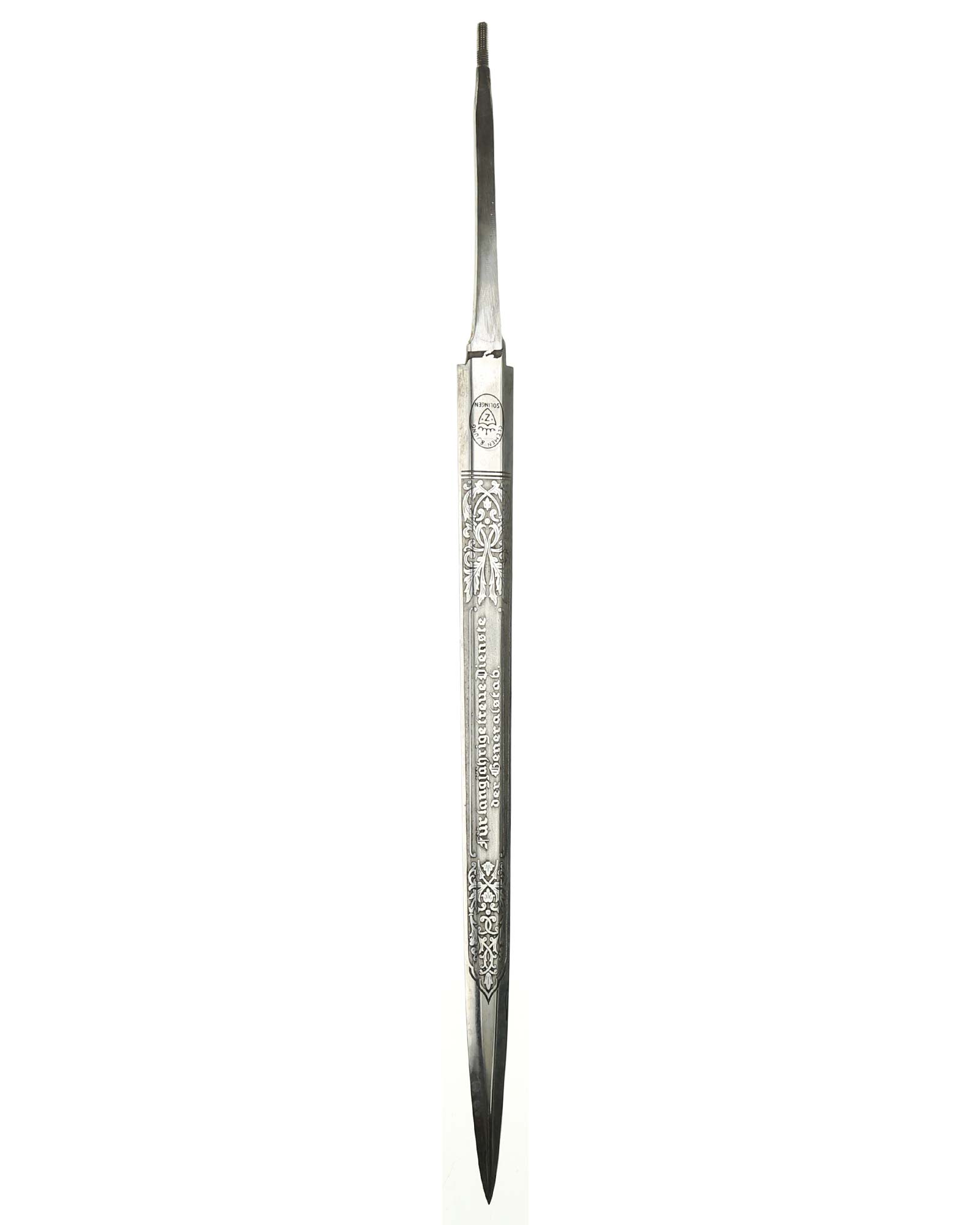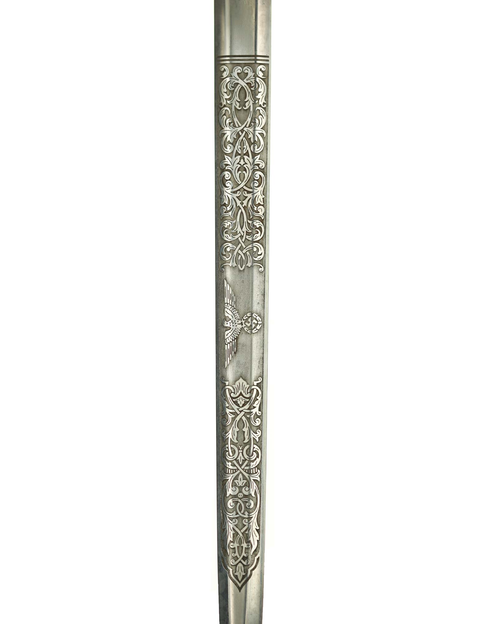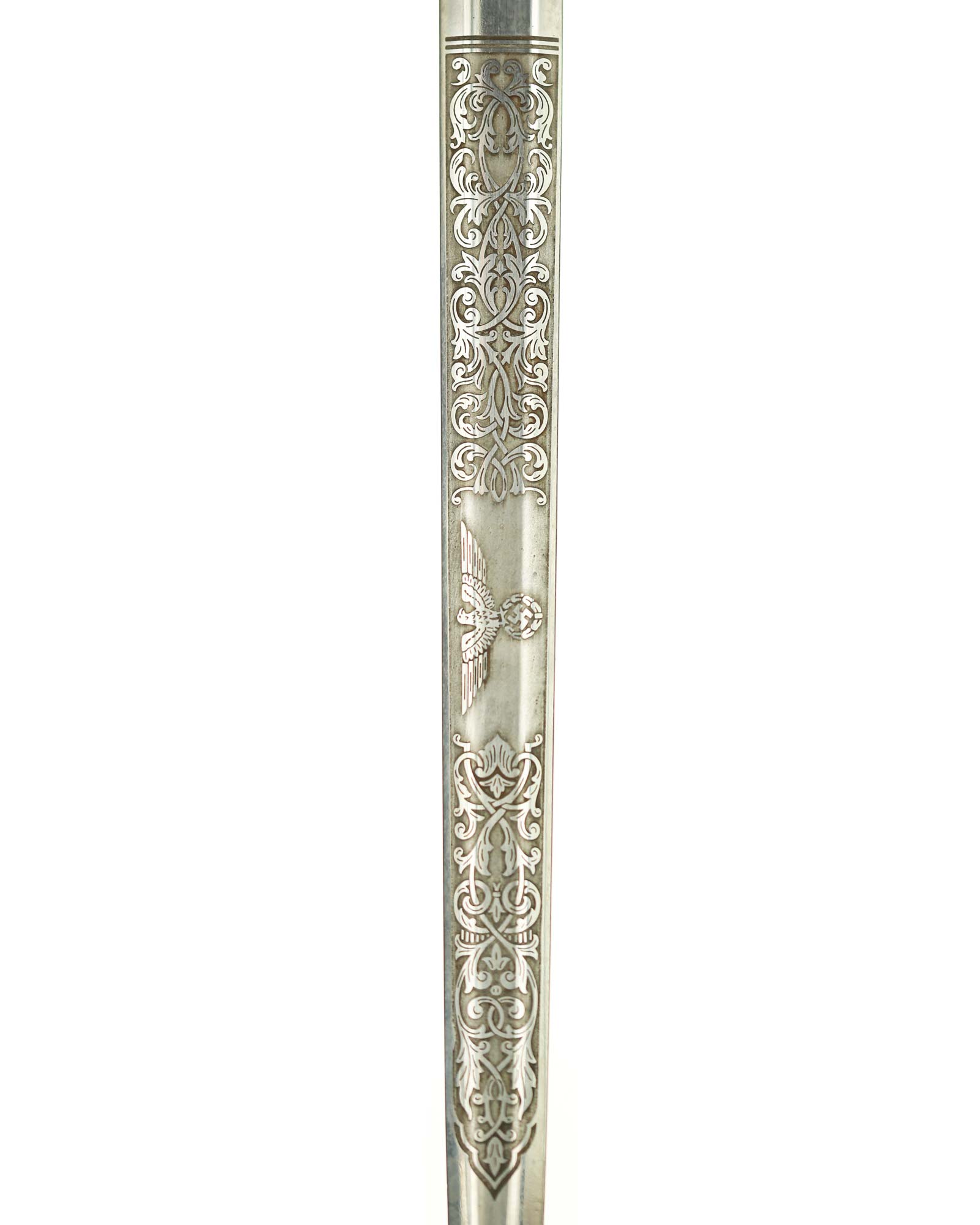 Die Klinge ist zweischneidig mit Zierätzung und Gravur "Für langjährige treue Dienste der Generalstab". Auf der Rückseite befindet sich das Herstellerlogo: Clemen Jung Solingen. Es handelt sich hierbei um eine hervorragende Museums & Sammleranfertigung. Klingen-Breite bis 18 mm., Klingen-Länge 257 mm., Gesamt-Länge 365 mm