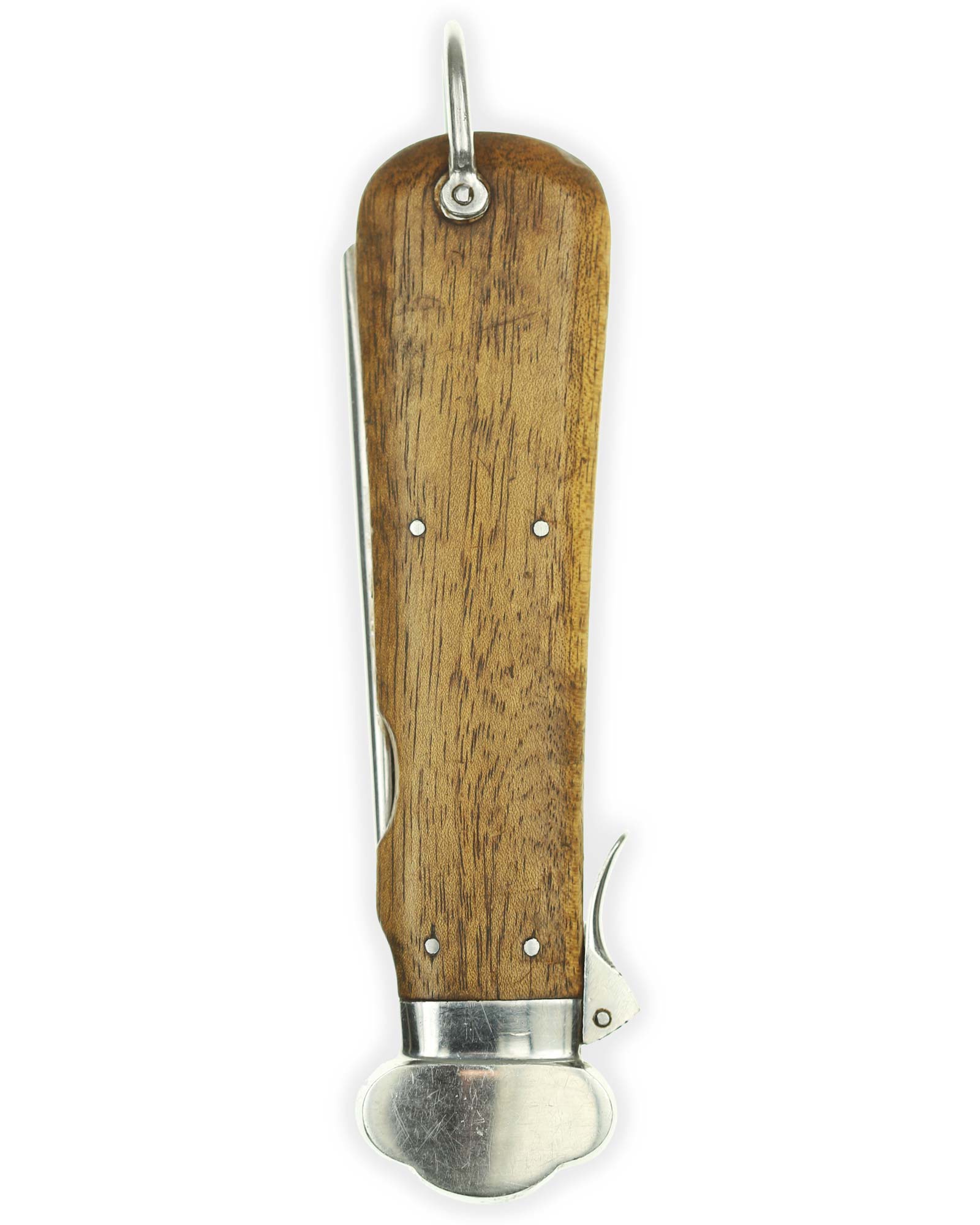 Flieger-Kappmesser mit rostfreiem Stahl. Die Gleitklinge ist einschneidig. Braune Nussbaum-Holzgriffschalen. Seitlich umlegbarer Druckhebel. Umlegbarer Aufreiber (Ahle) an der Schmalseite des Messerkastens. Vernieteter Tragebügel. Klinge lässt sich nicht einrasten. Polierte Klinge, mit seltenem Hersteller für das Fallschirm-Kappmesser: SMF Solingen. Der Druckhebel ist mit der Nummer #501 gekennzeichnet.