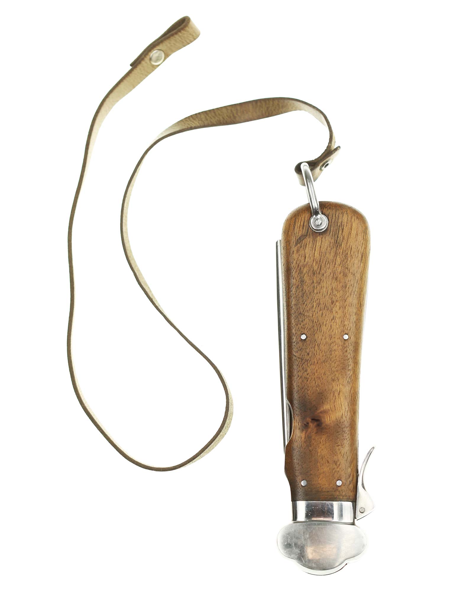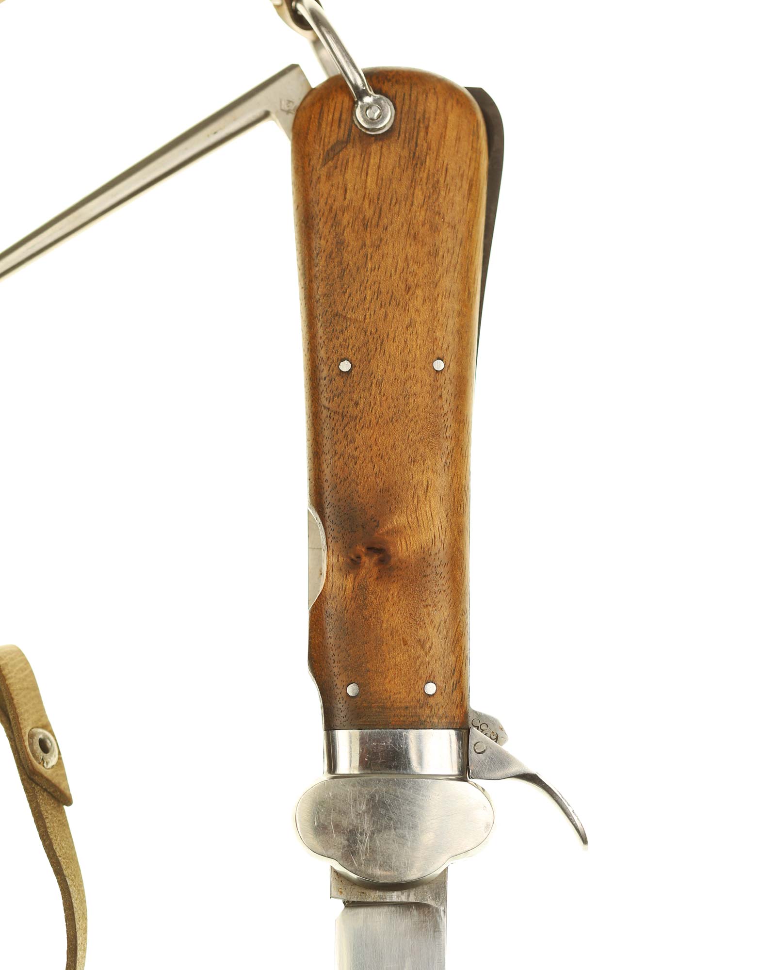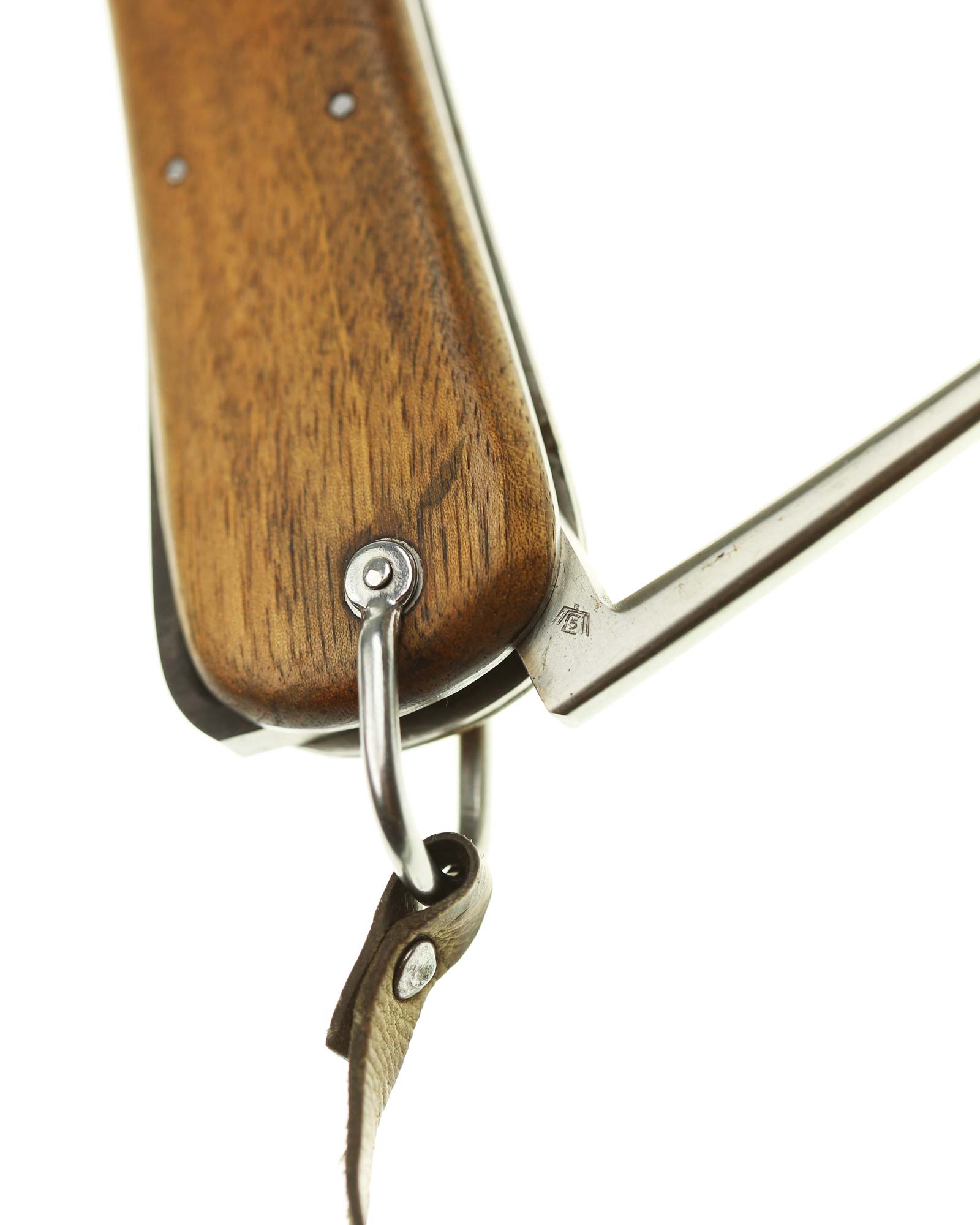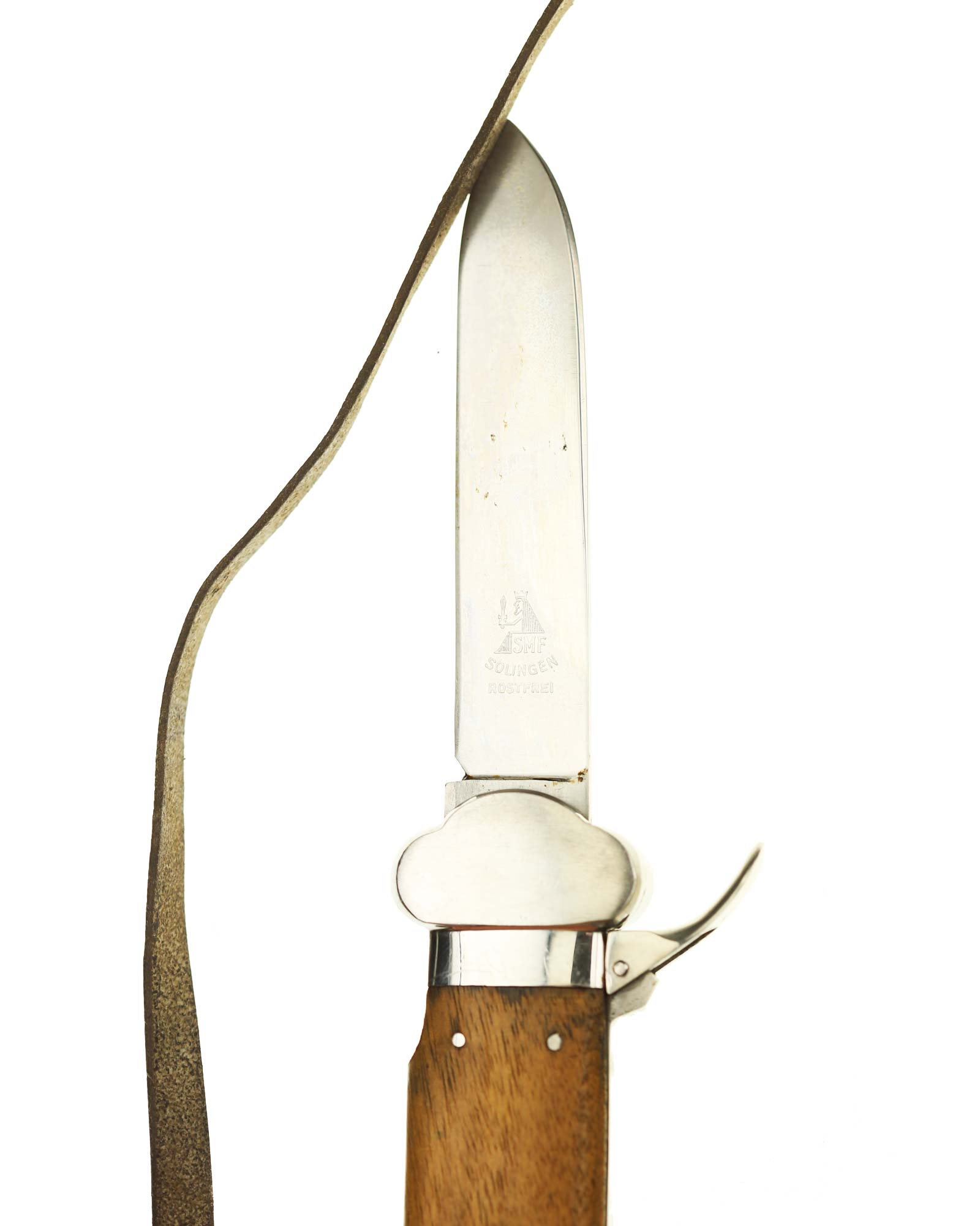 Flieger-Kappmesser mit rostfreiem Stahl. Die Gleitklinge ist einschneidig. Braune Nussbaum-Holzgriffschalen. Seitlich umlegbarer Druckhebel. Umlegbarer Aufreiber (Ahle) an der Schmalseite des Messerkastens. Vernieteter Tragebügel. Klinge lässt sich nicht einrasten. Polierte Klinge, mit seltenem Hersteller für das Fallschirm-Kappmesser: SMF Solingen. Der Druckhebel ist mit der Nummer #635 gekennzeichnet.-
