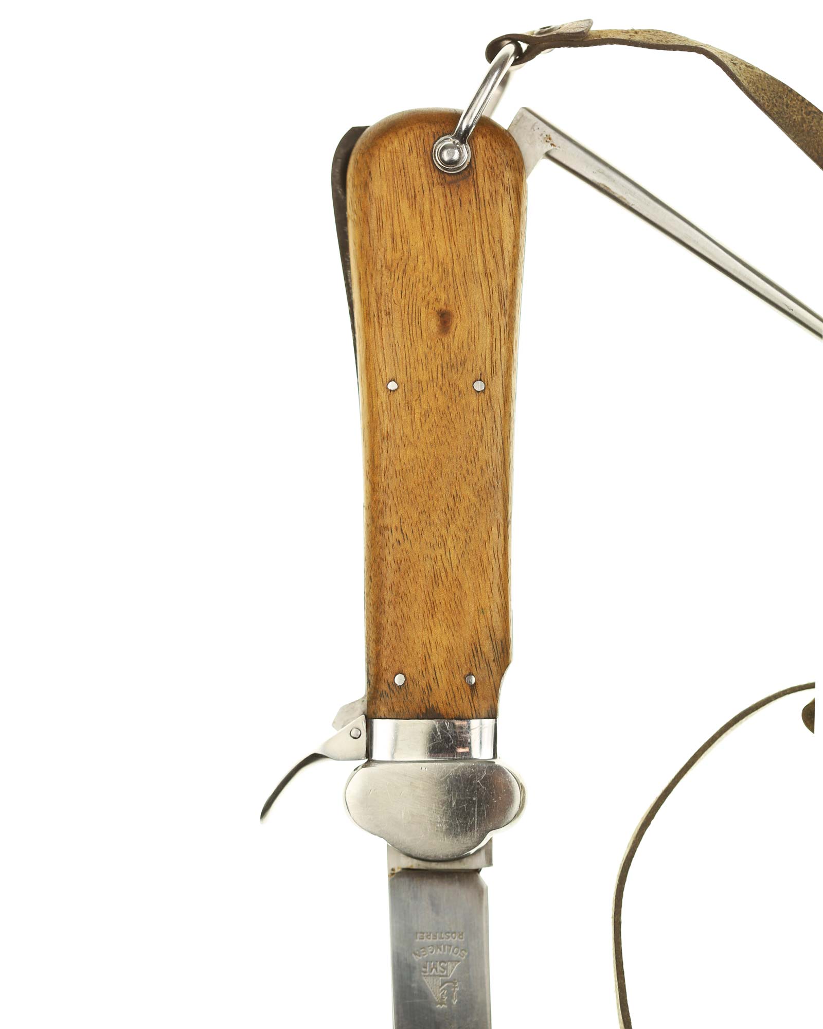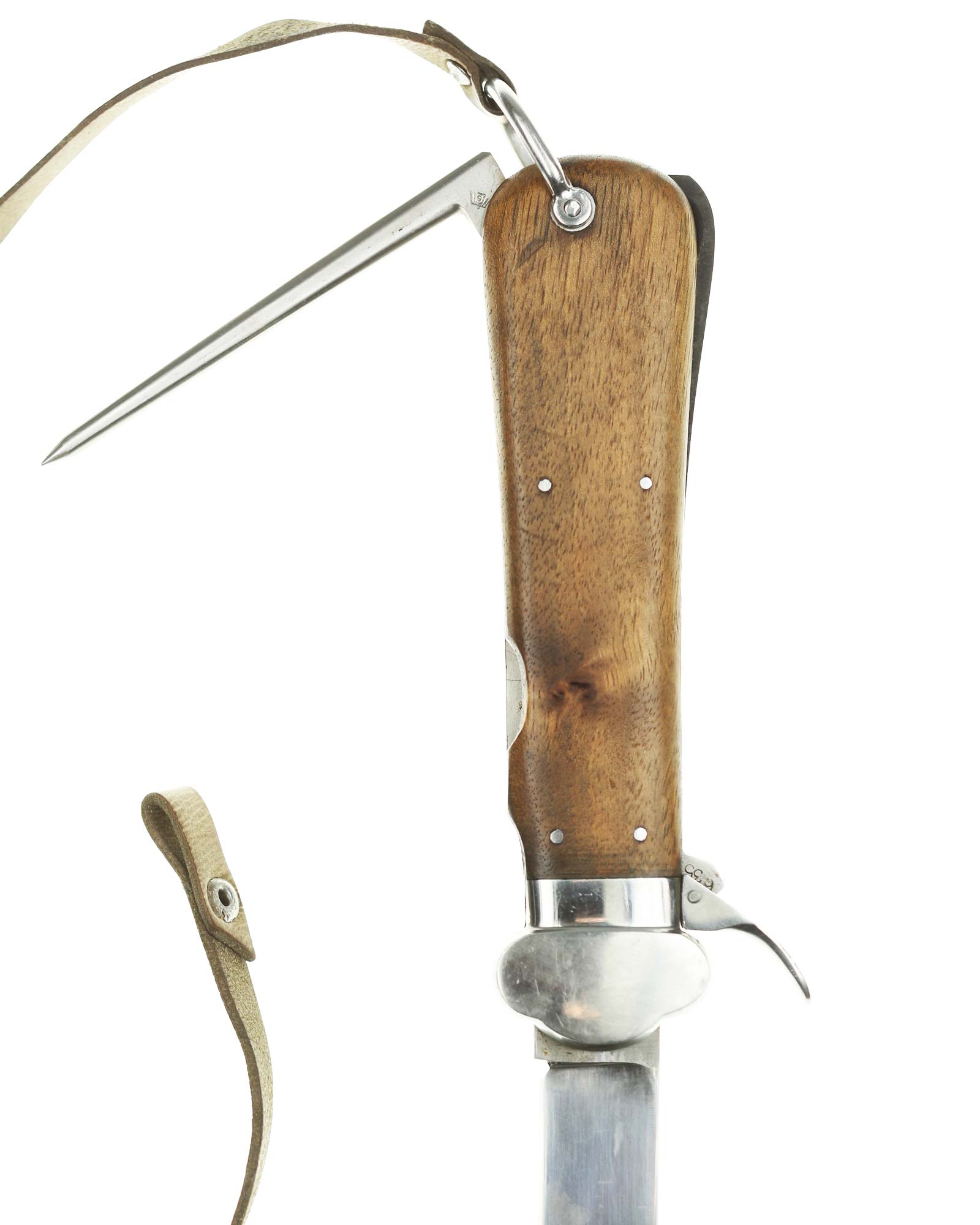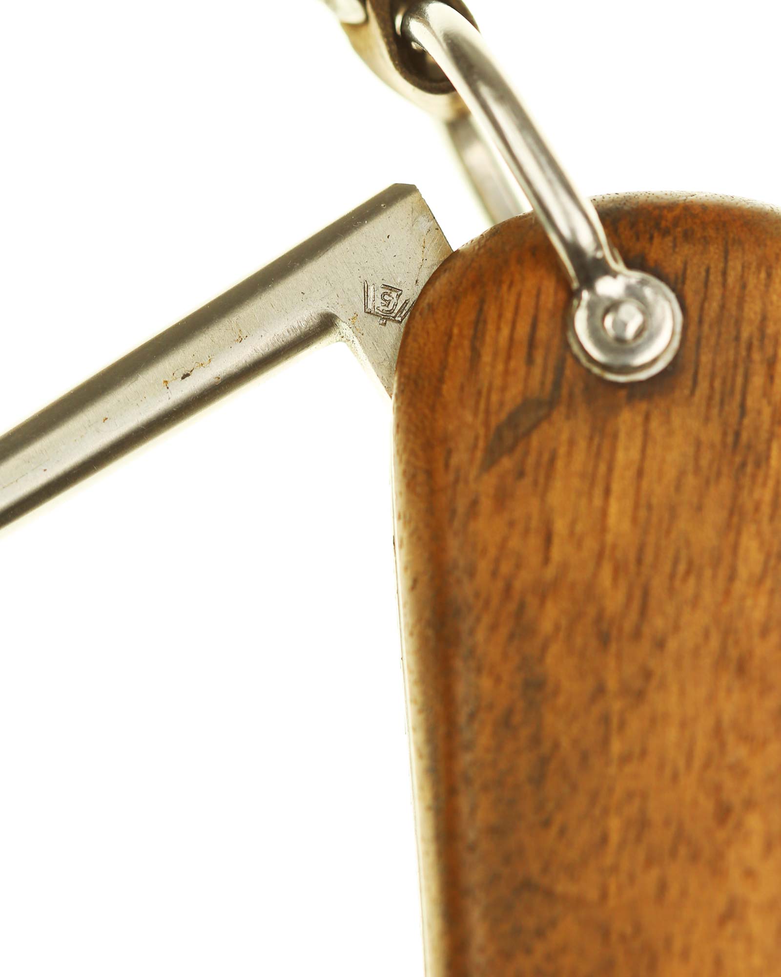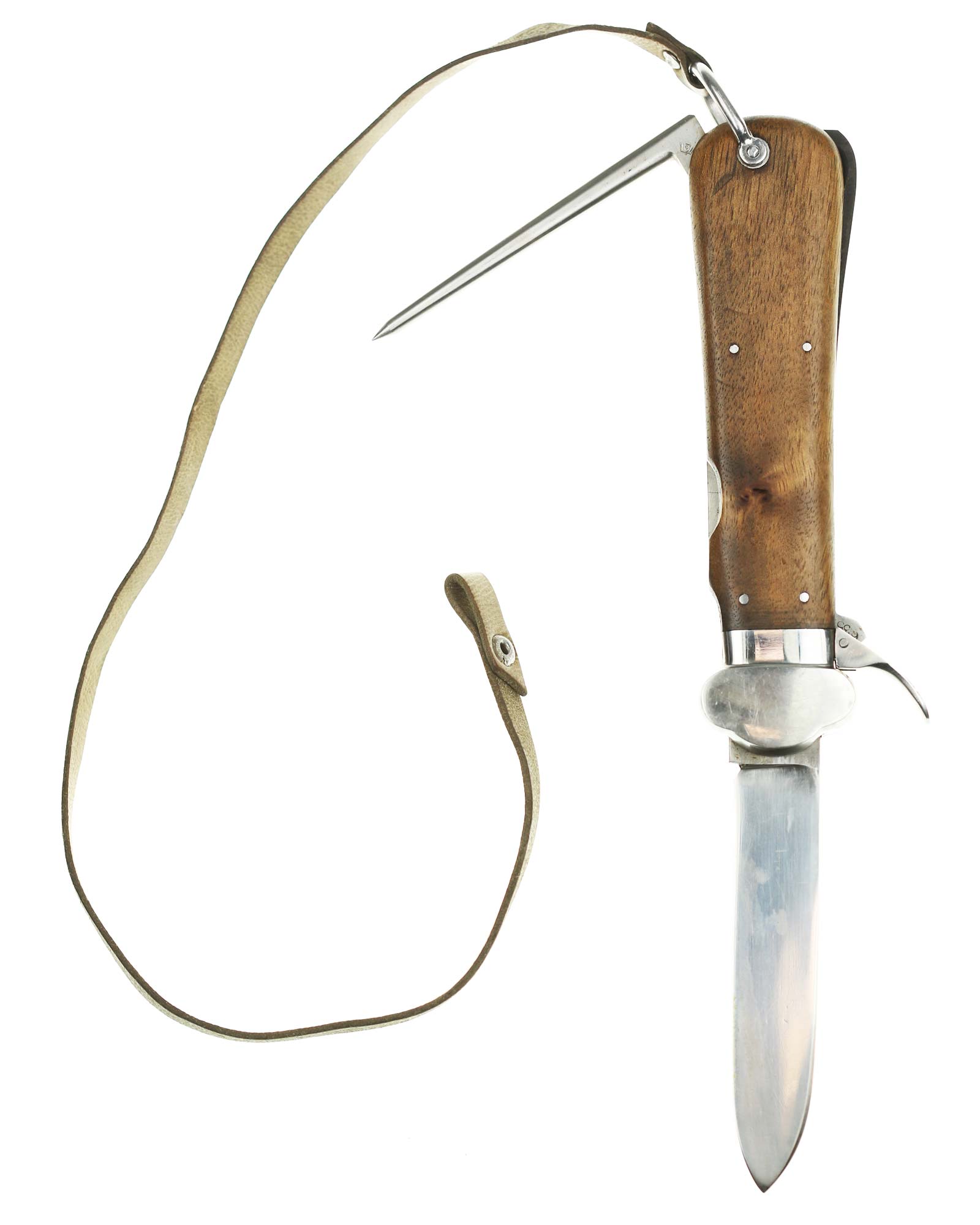 Flieger-Kappmesser mit rostfreiem Stahl. Die Gleitklinge ist einschneidig. Braune Nussbaum-Holzgriffschalen. Seitlich umlegbarer Druckhebel. Umlegbarer Aufreiber (Ahle) an der Schmalseite des Messerkastens. Vernieteter Tragebügel. Klinge lässt sich nicht einrasten. Polierte Klinge, mit seltenem Hersteller für das Fallschirm-Kappmesser: SMF Solingen. Der Druckhebel ist mit der Nummer #635 gekennzeichnet.-