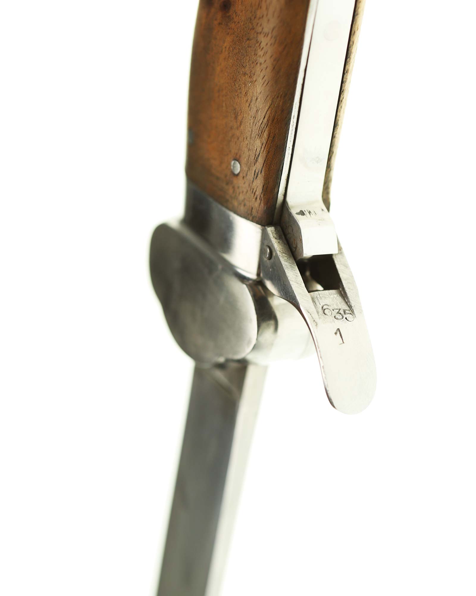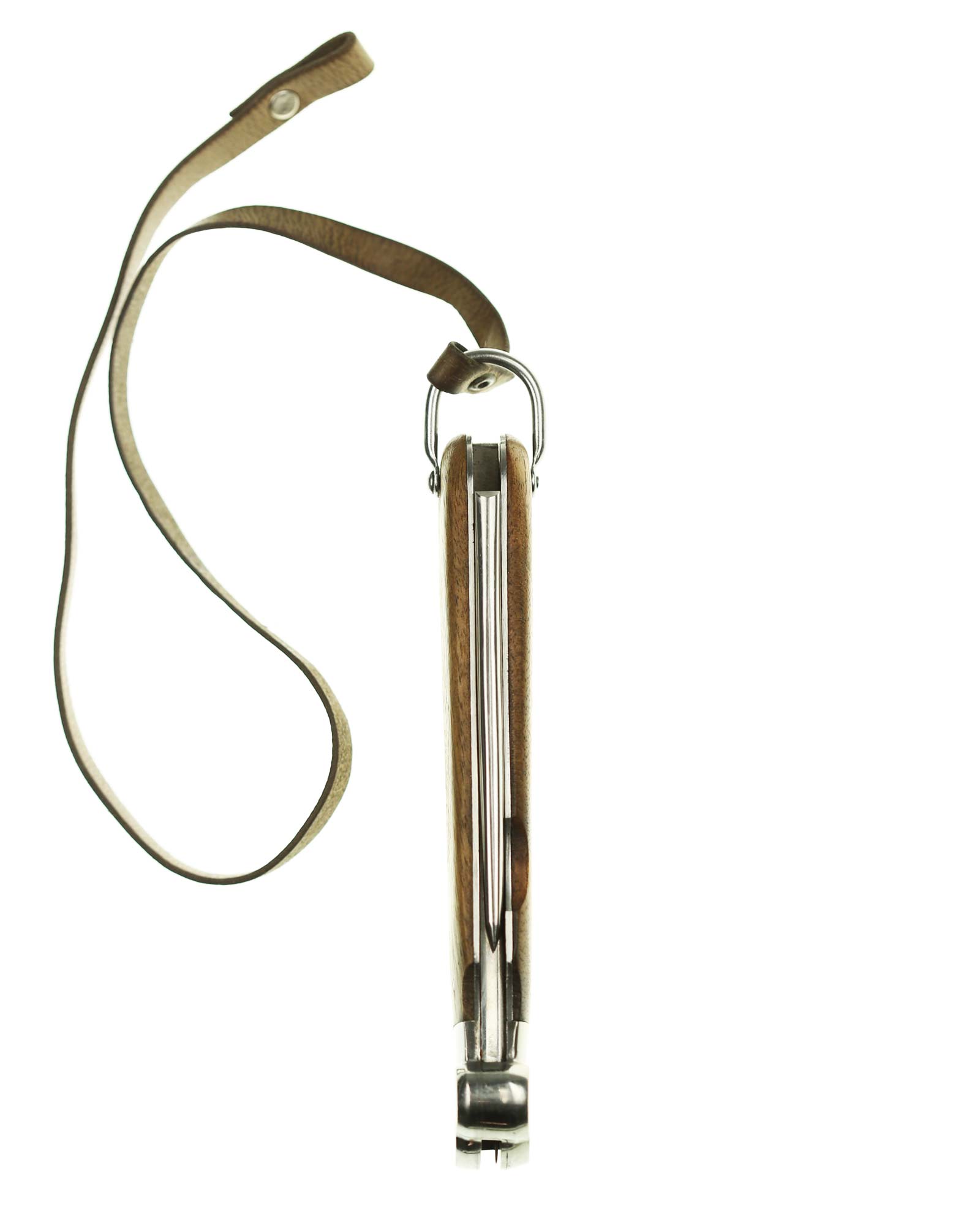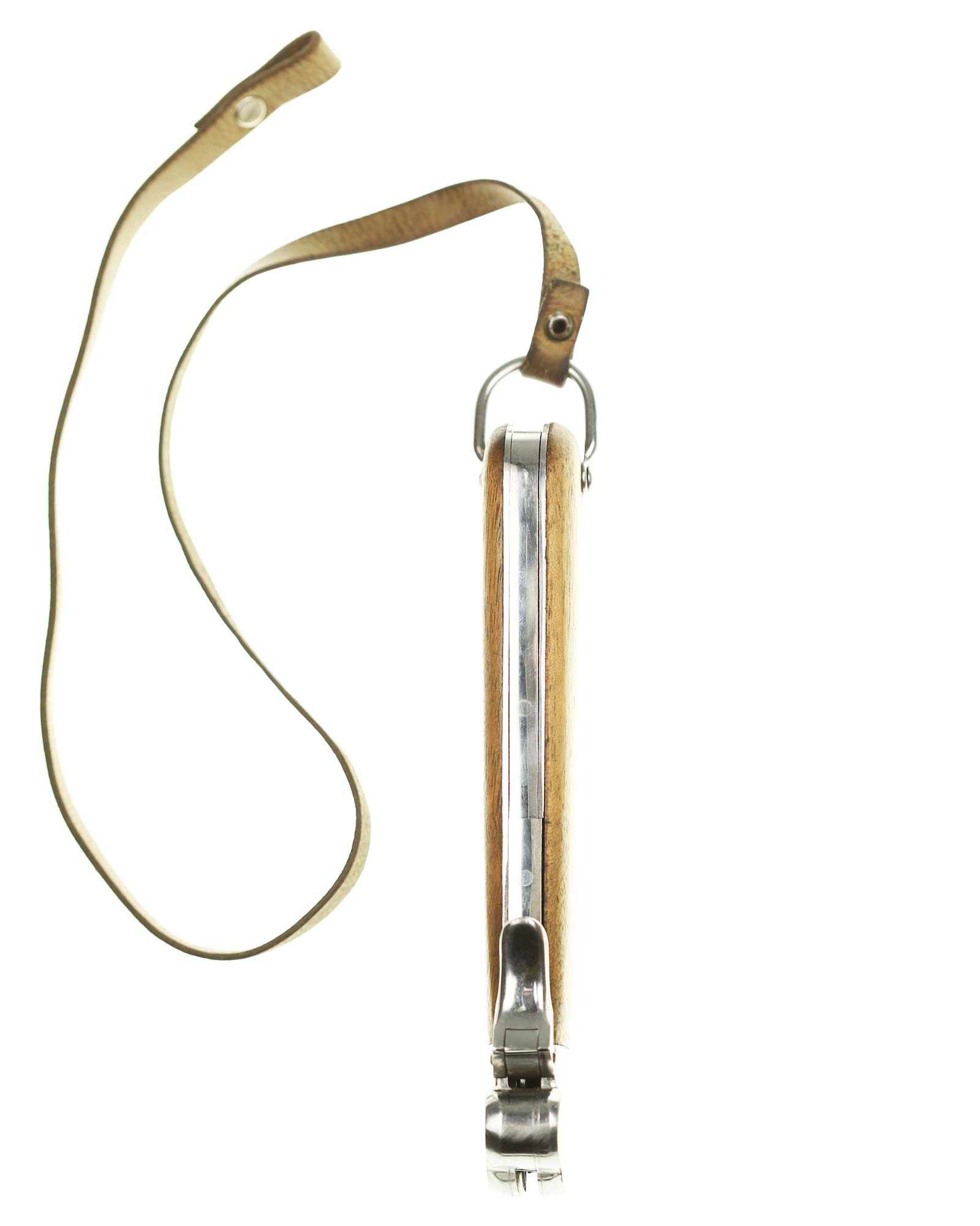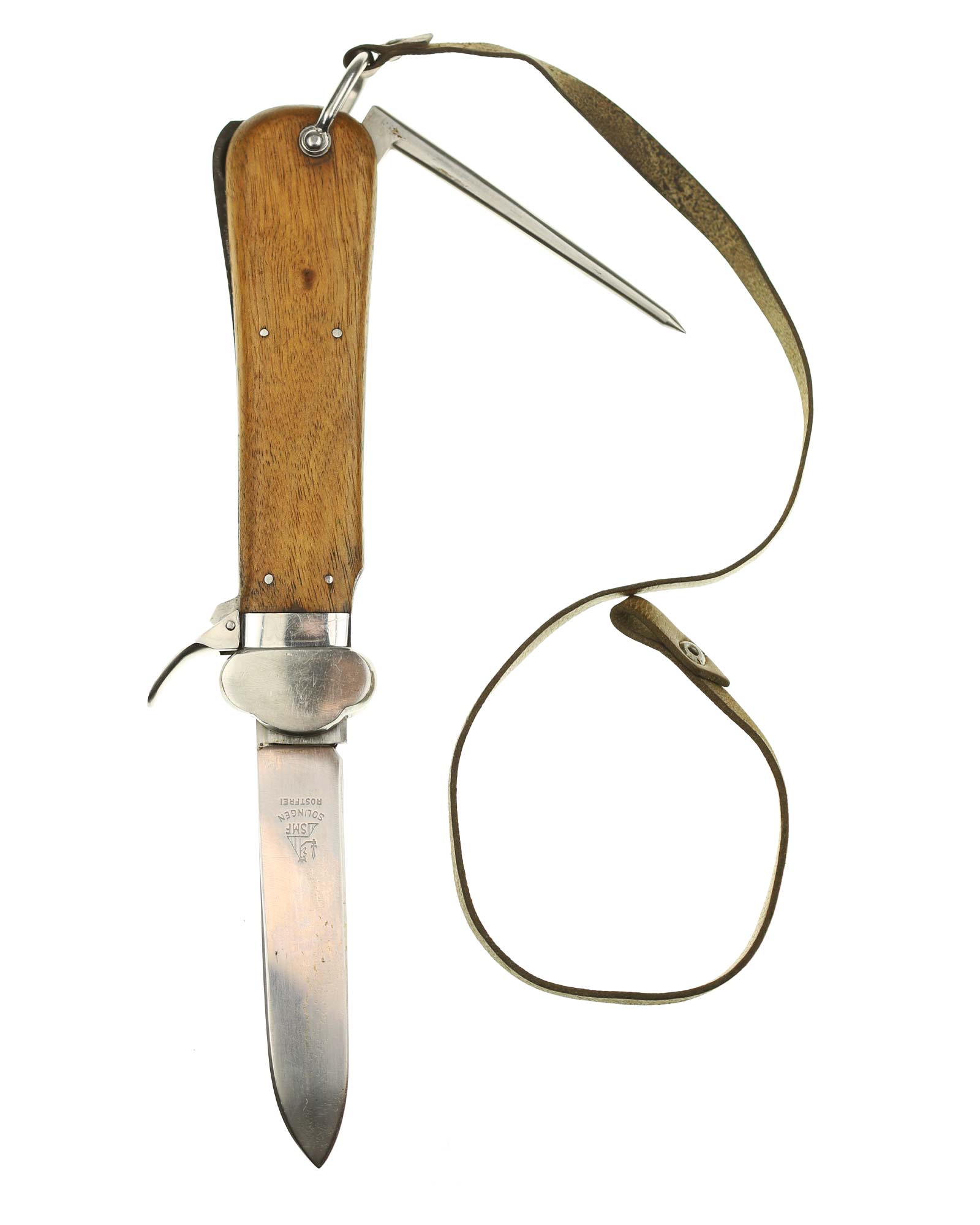 Flieger-Kappmesser mit rostfreiem Stahl. Die Gleitklinge ist einschneidig. Braune Nussbaum-Holzgriffschalen. Seitlich umlegbarer Druckhebel. Umlegbarer Aufreiber (Ahle) an der Schmalseite des Messerkastens. Vernieteter Tragebügel. Klinge lässt sich nicht einrasten. Polierte Klinge, mit seltenem Hersteller für das Fallschirm-Kappmesser: SMF Solingen. Der Druckhebel ist mit der Nummer #635 gekennzeichnet.-