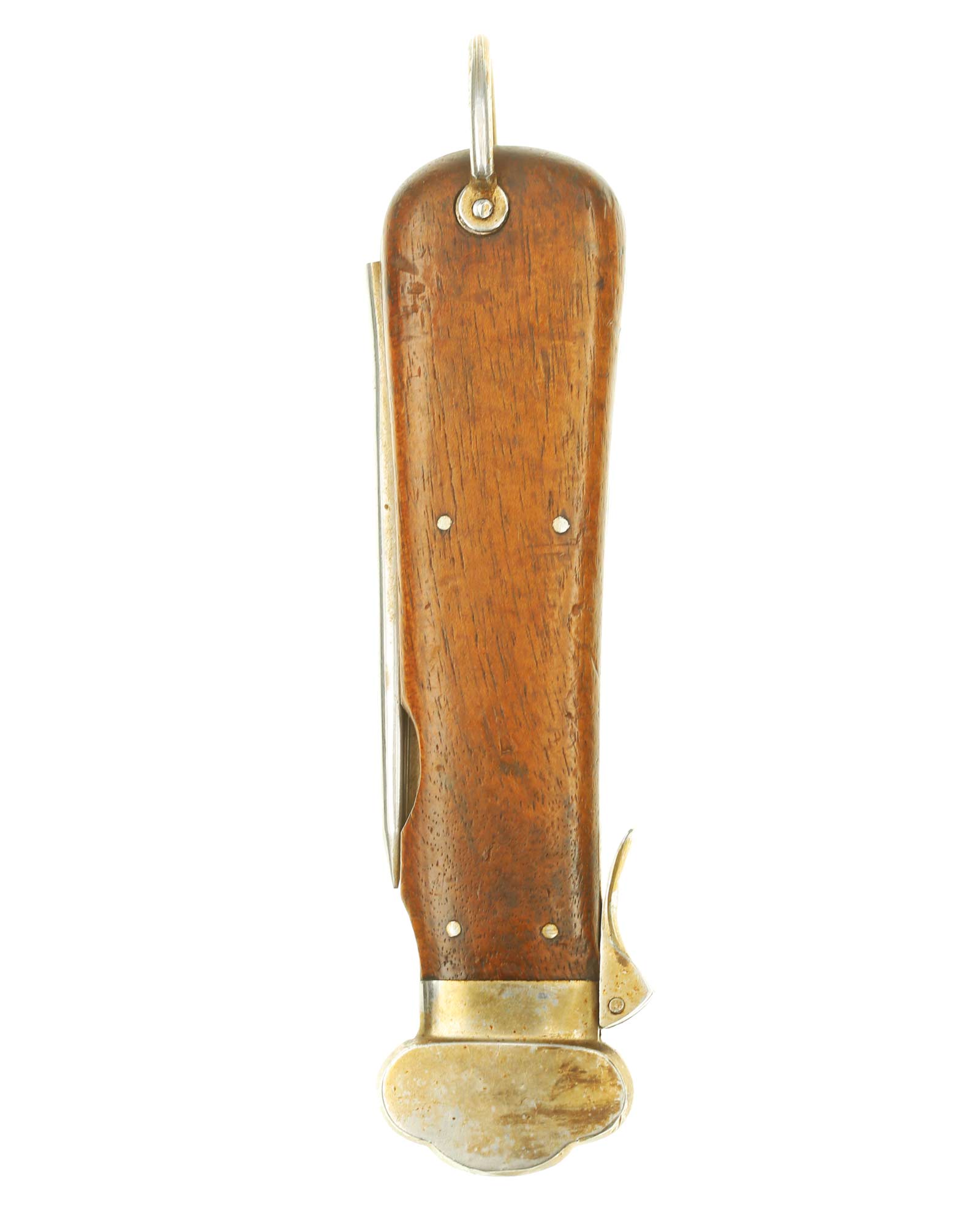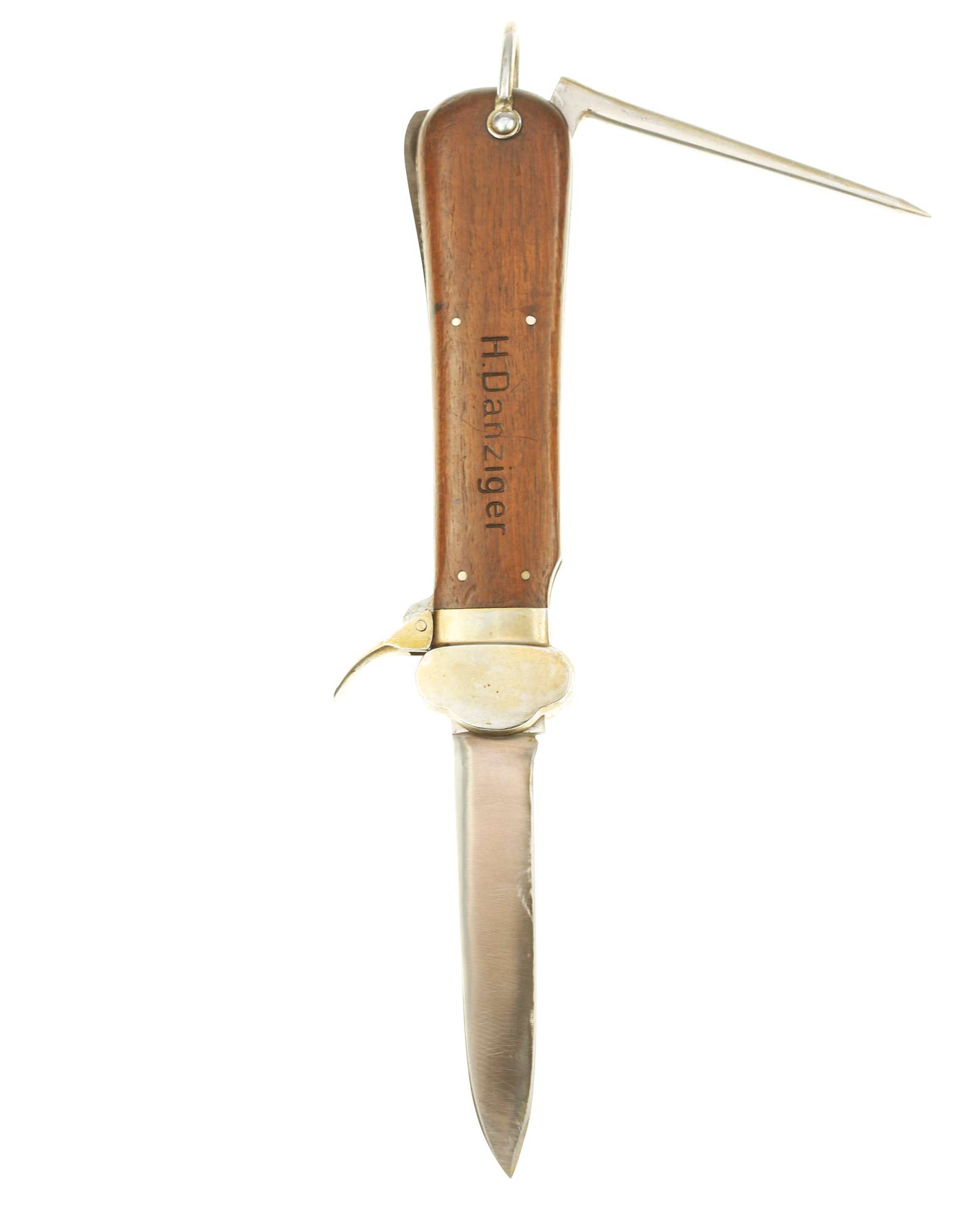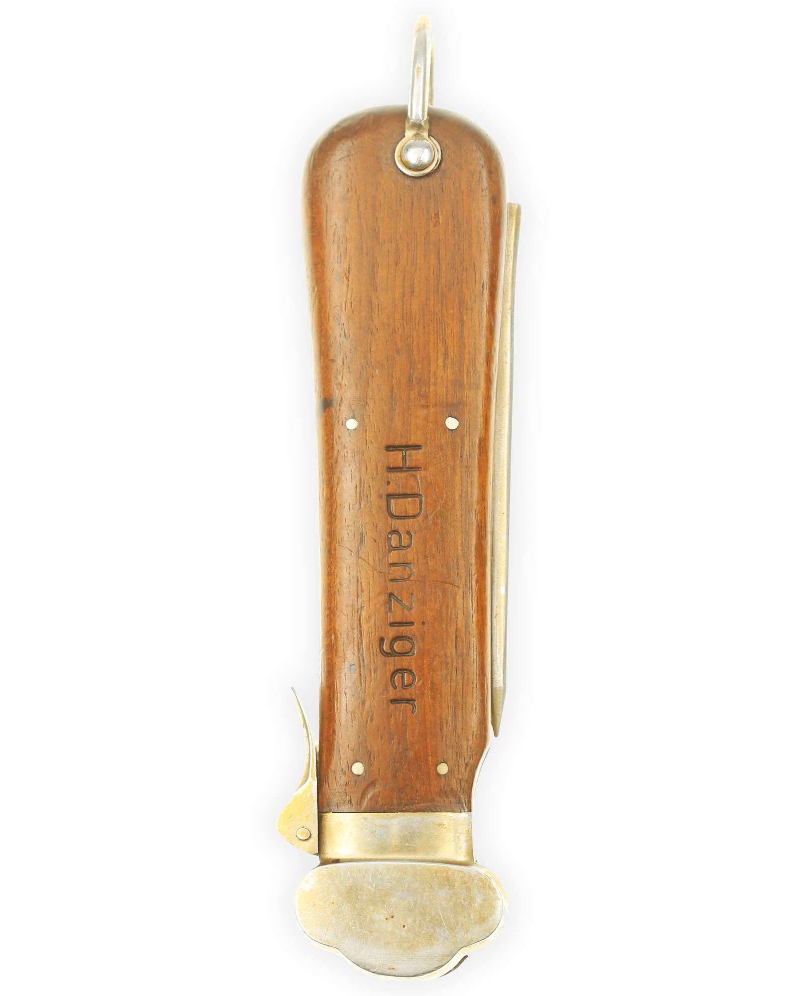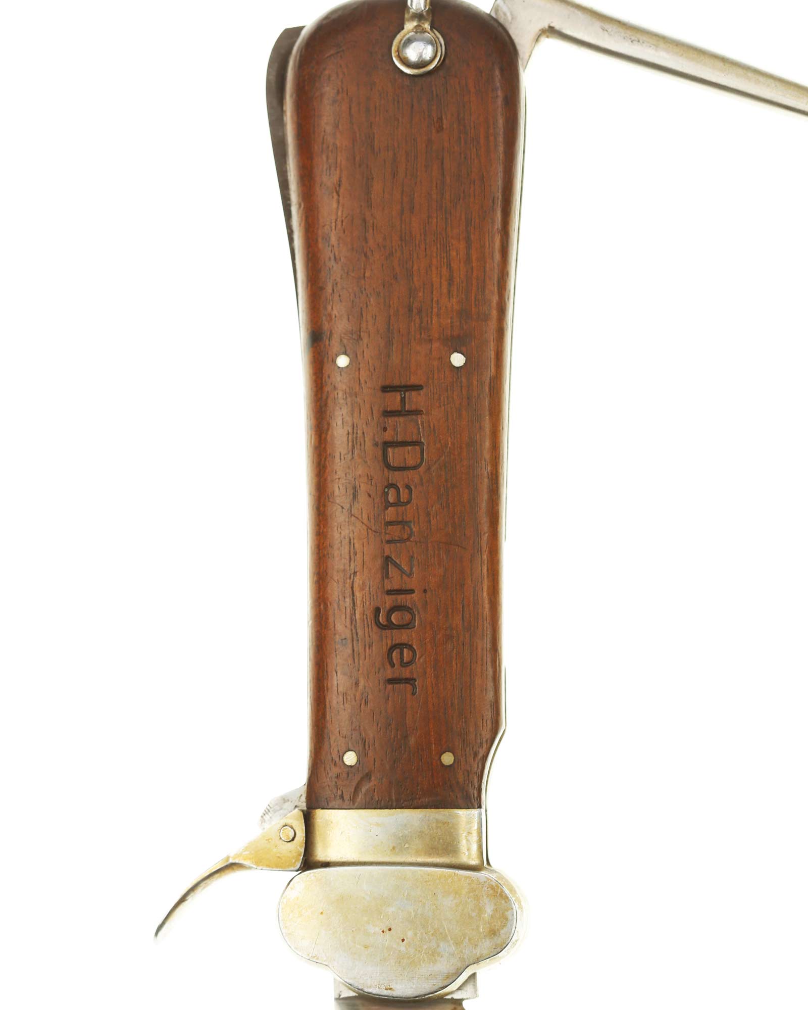 Flieger-Kappmesser mit rostfreiem Stahl. Die Gleitklinge ist einschneidig. Braune Nussbaum-Holzgriffschalen. Seitlich umlegbarer Druckhebel. Umlegbarer Aufreiber (Ahle) an der Schmalseite des Messerkastens. Vernieteter Tragebügel. Klinge lässt sich nicht einrasten. Polierte Klinge, ohne Hersteller. Der Druckhebel ist mit der Nummer #359 gekennzeichnet. Griffplatte beschriftet (H. Danziger).