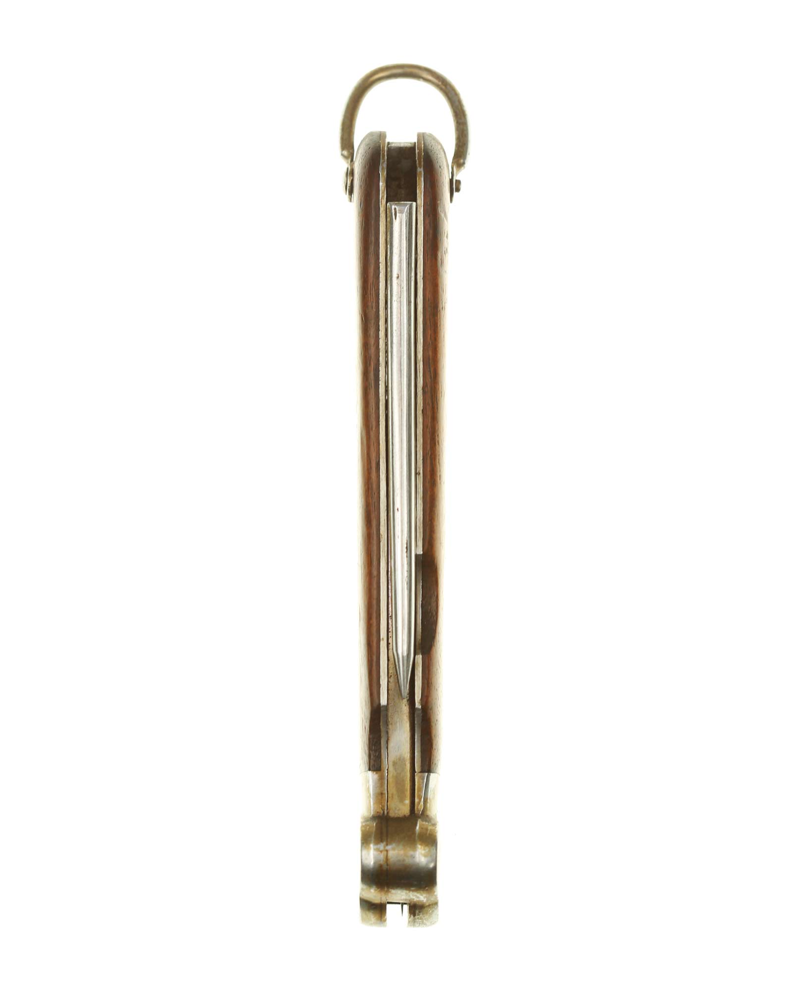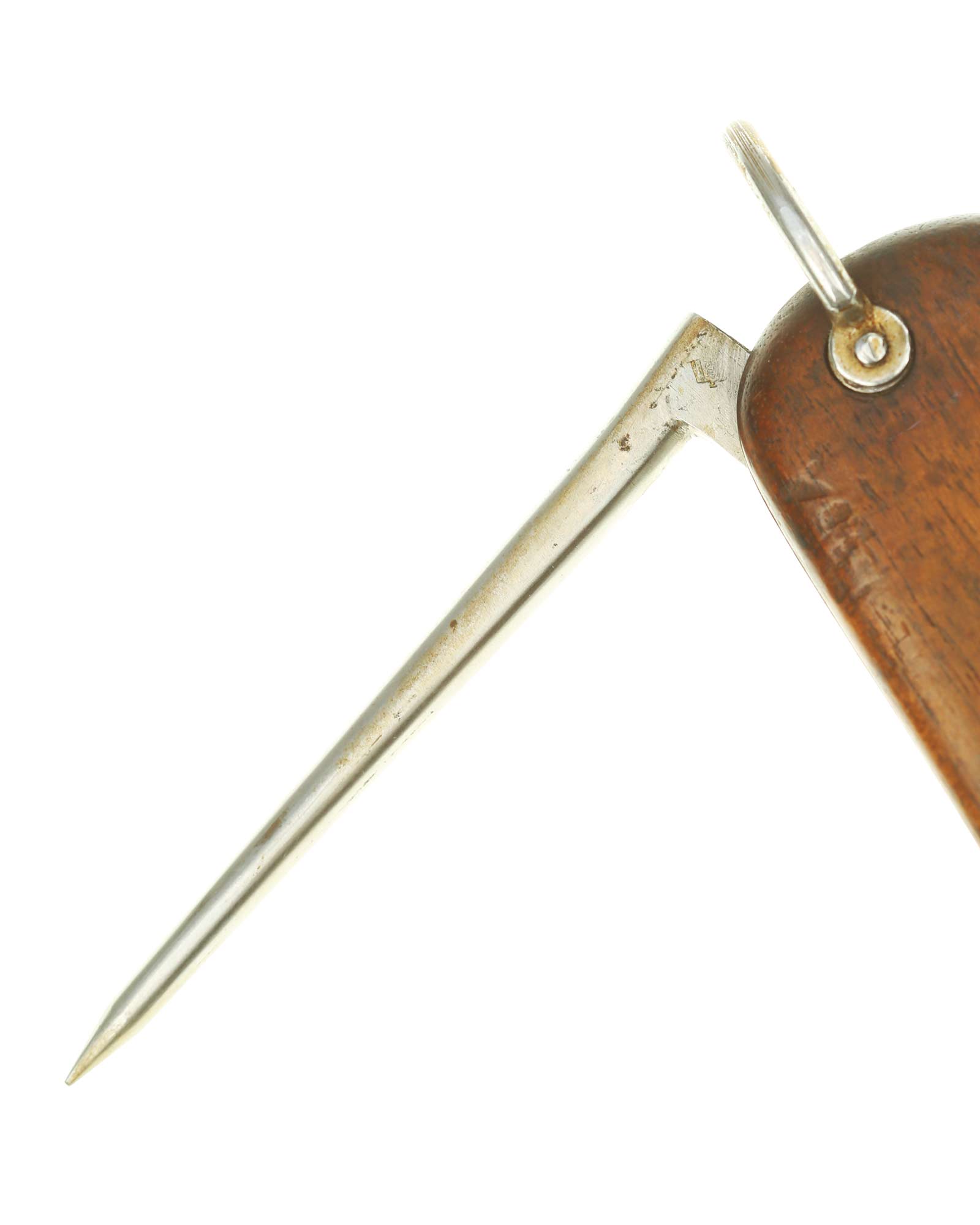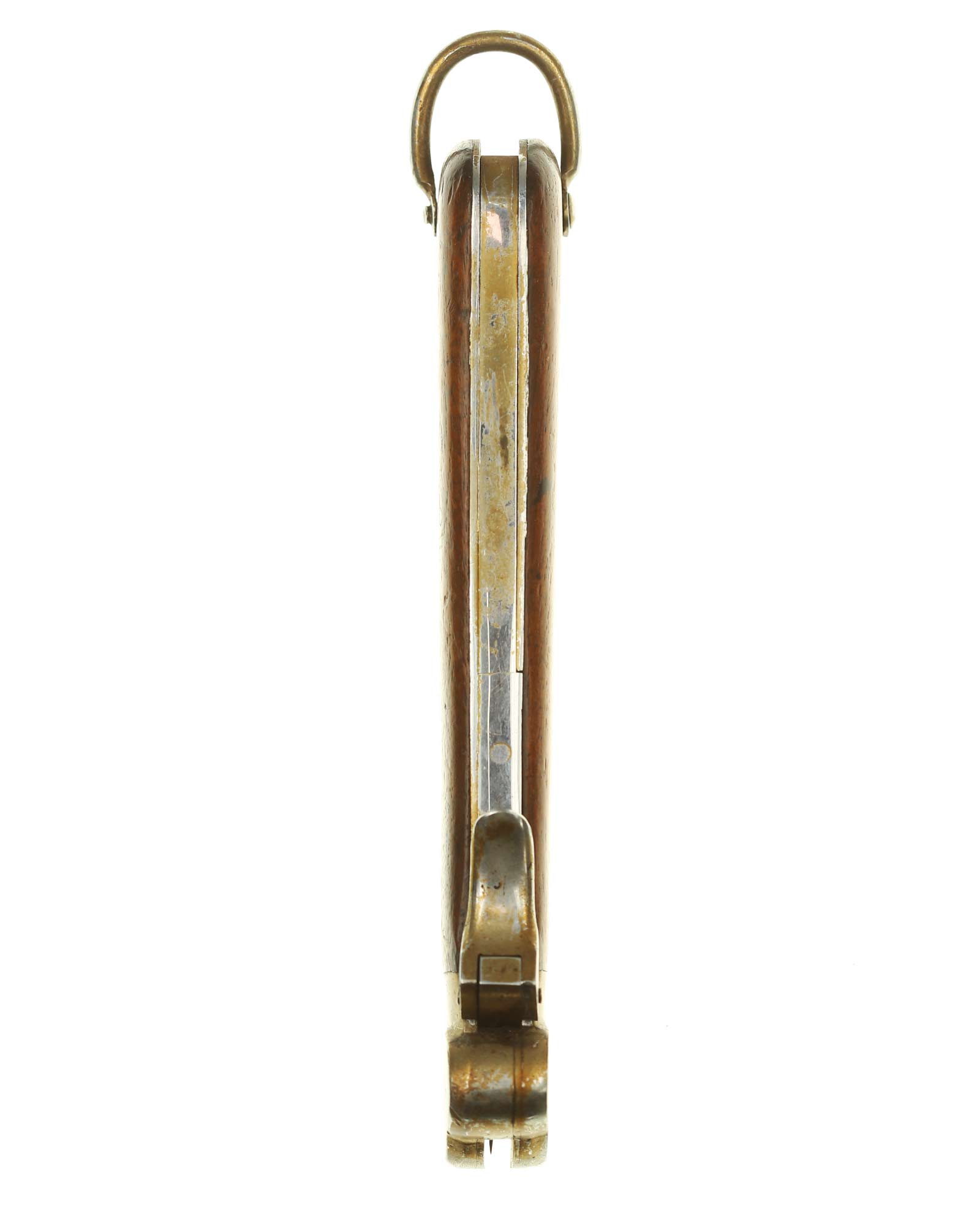 Flieger-Kappmesser mit rostfreiem Stahl. Die Gleitklinge ist einschneidig. Braune Nussbaum-Holzgriffschalen. Seitlich umlegbarer Druckhebel. Umlegbarer Aufreiber (Ahle) an der Schmalseite des Messerkastens. Vernieteter Tragebügel. Klinge lässt sich nicht einrasten. Polierte Klinge, ohne Hersteller. Der Druckhebel ist mit der Nummer #359 gekennzeichnet. Griffplatte beschriftet (H. Danziger).