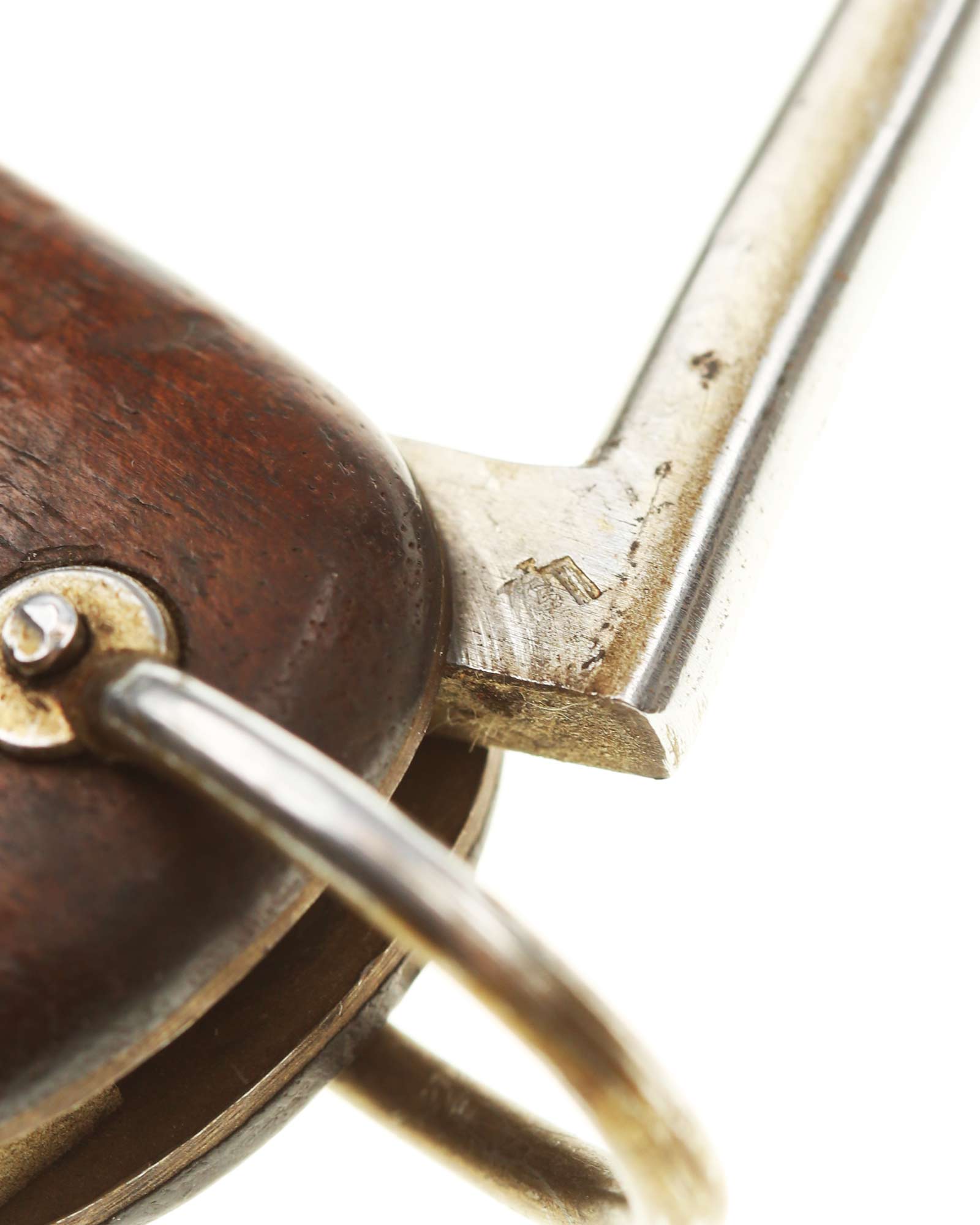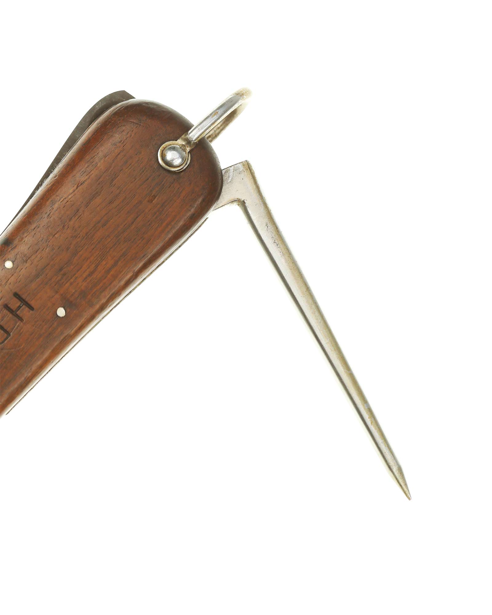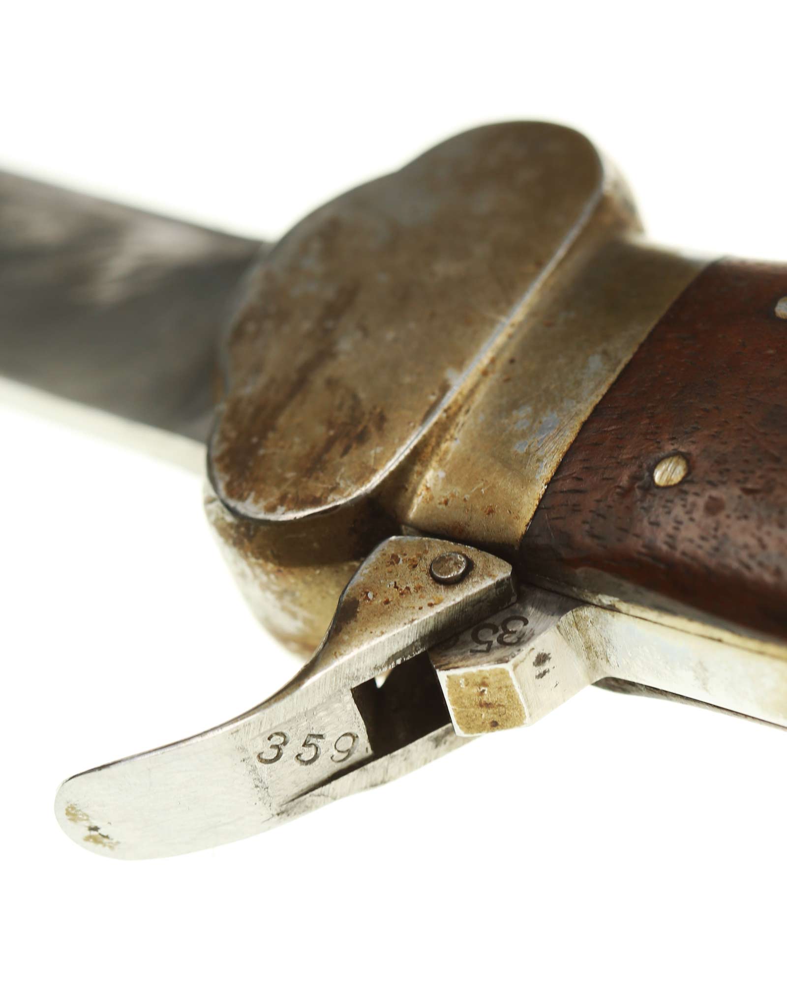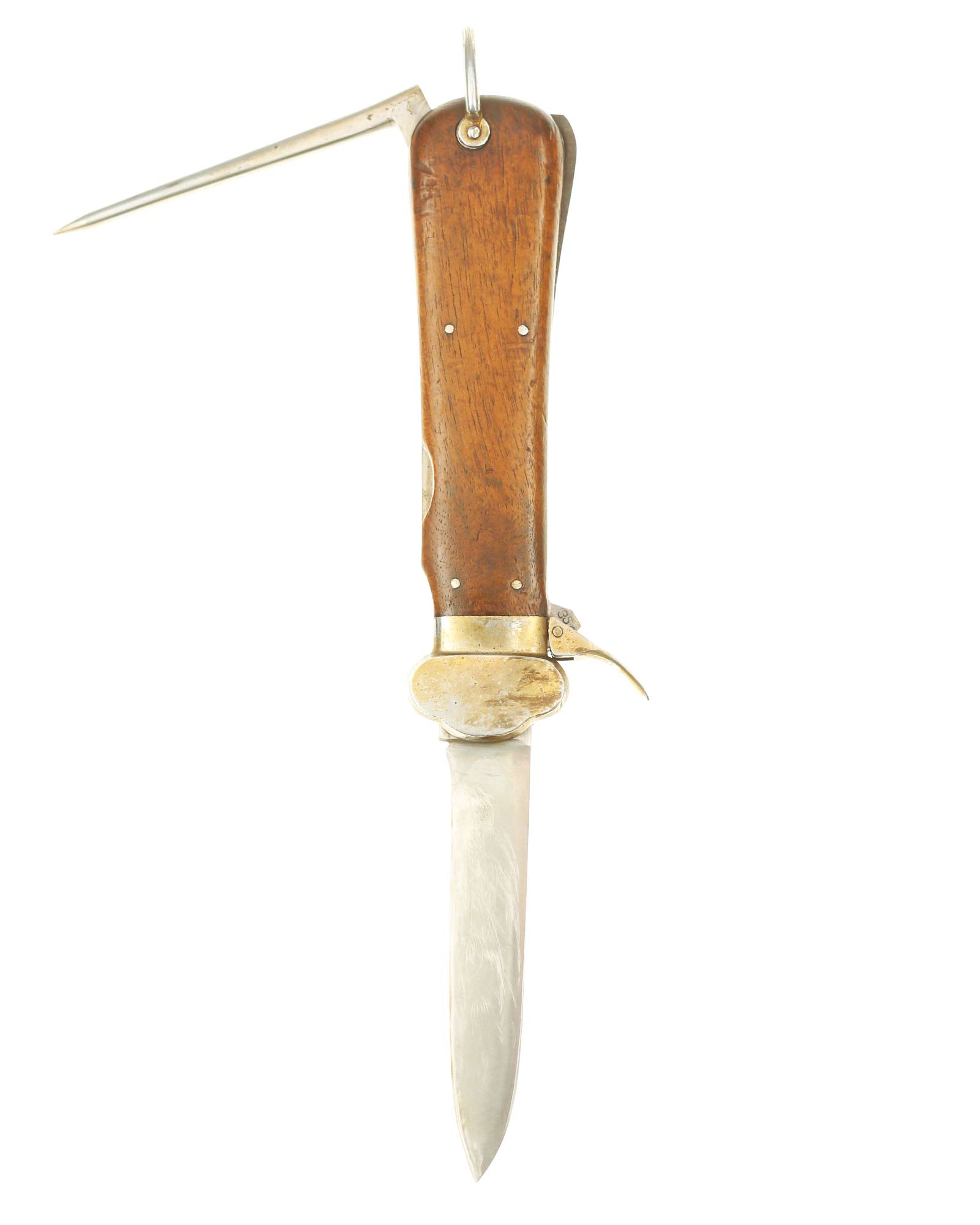Flieger-Kappmesser mit rostfreiem Stahl. Die Gleitklinge ist einschneidig. Braune Nussbaum-Holzgriffschalen. Seitlich umlegbarer Druckhebel. Umlegbarer Aufreiber (Ahle) an der Schmalseite des Messerkastens. Vernieteter Tragebügel. Klinge lässt sich nicht einrasten. Polierte Klinge, ohne Hersteller. Der Druckhebel ist mit der Nummer #359 gekennzeichnet. Griffplatte beschriftet (H. Danziger).