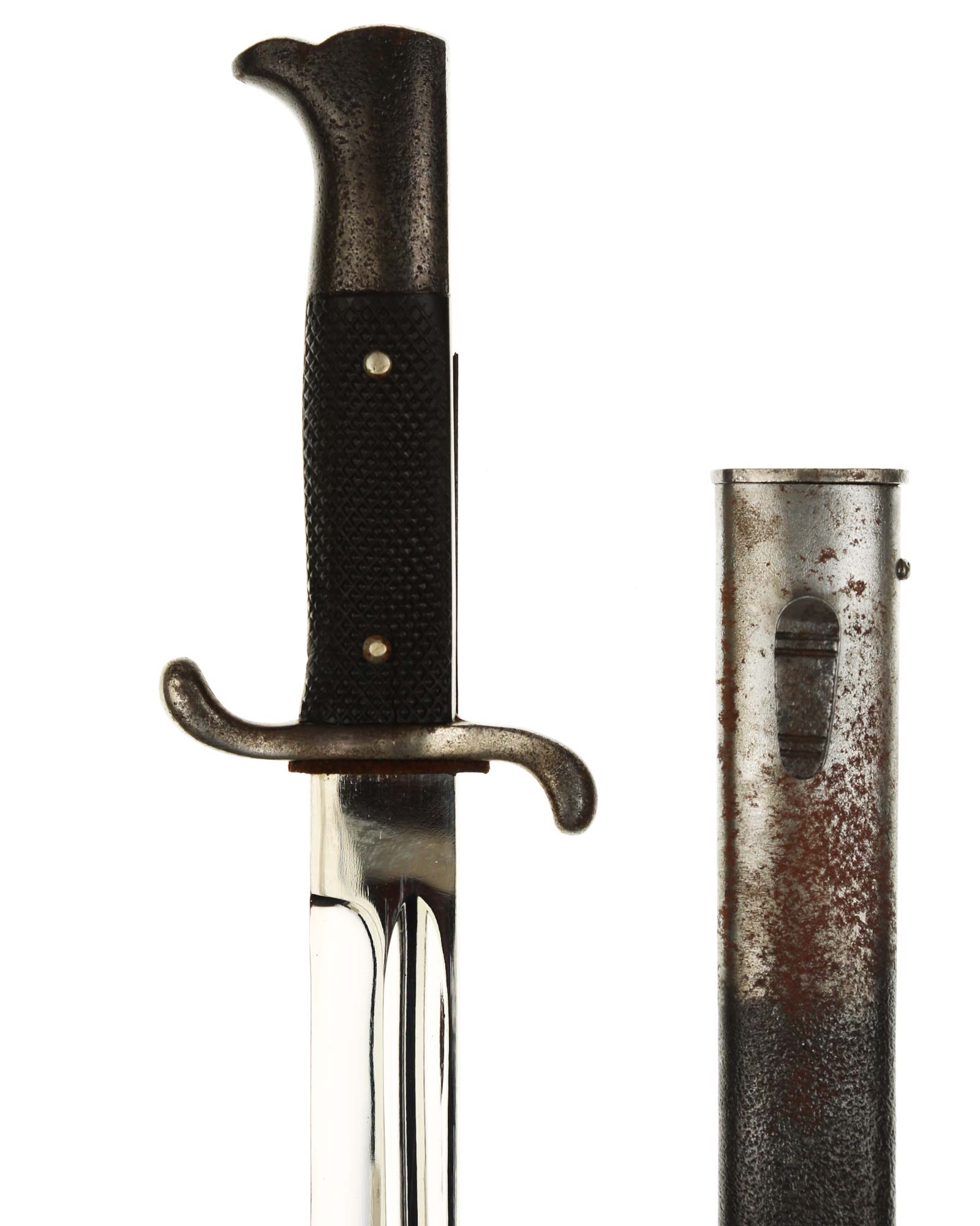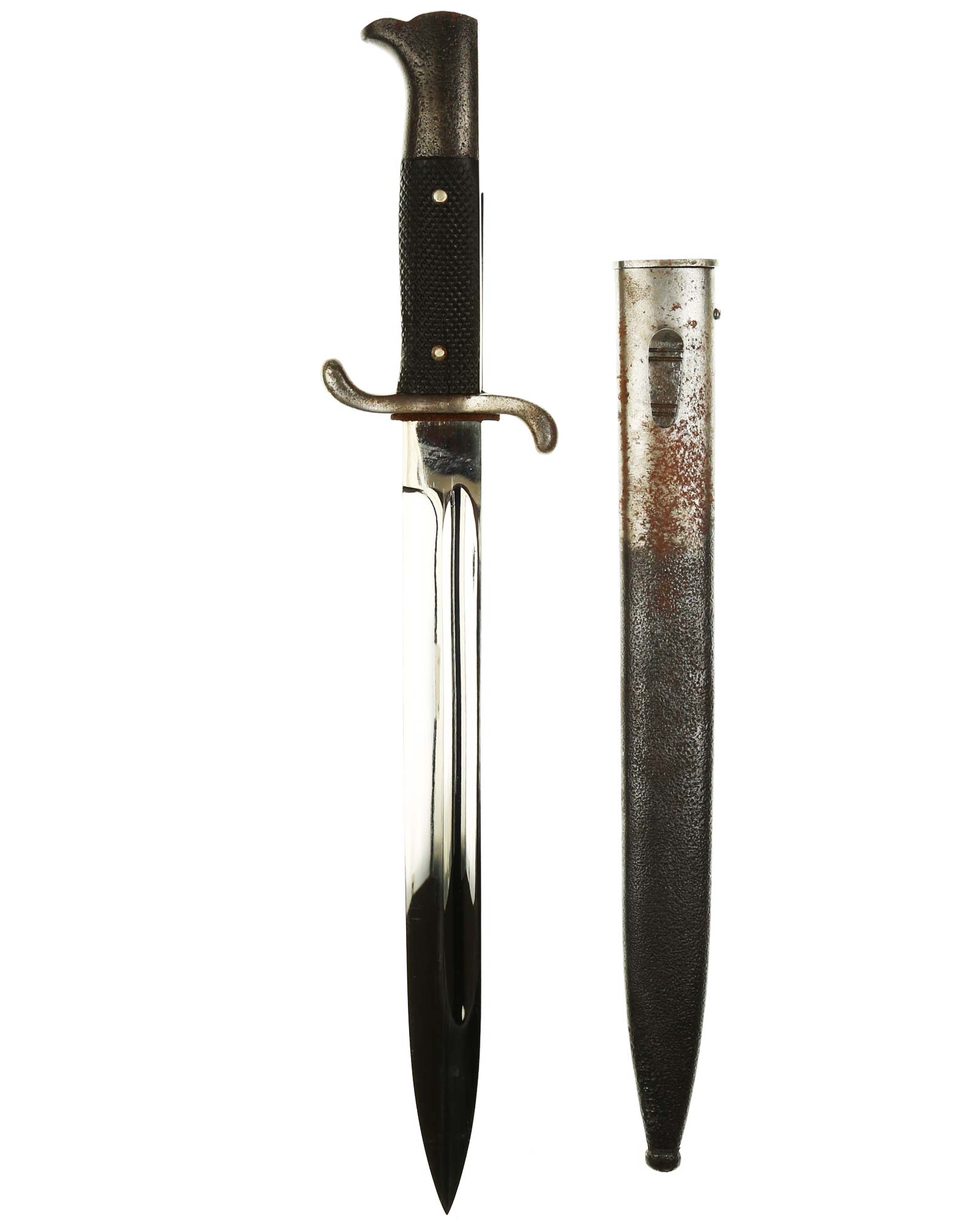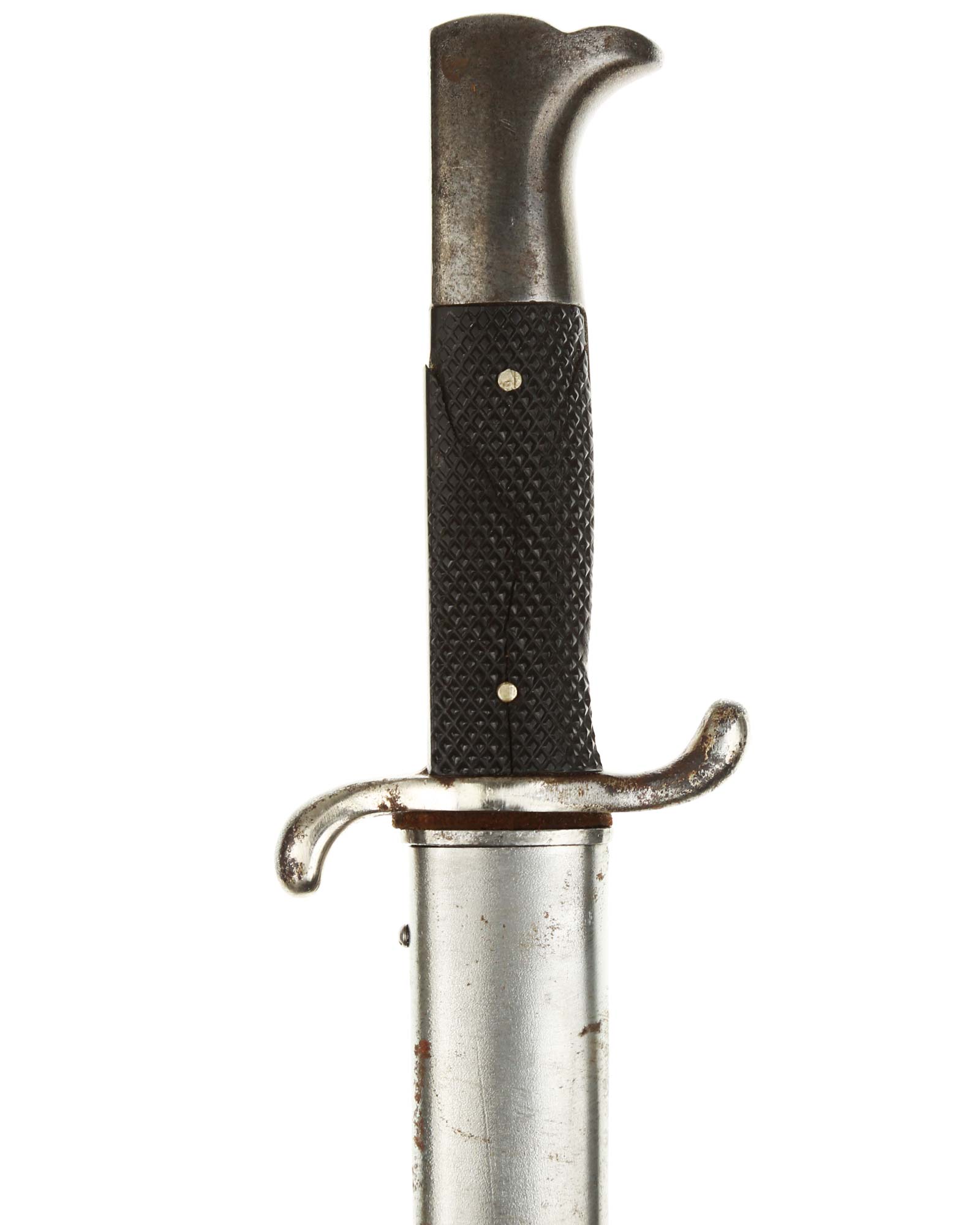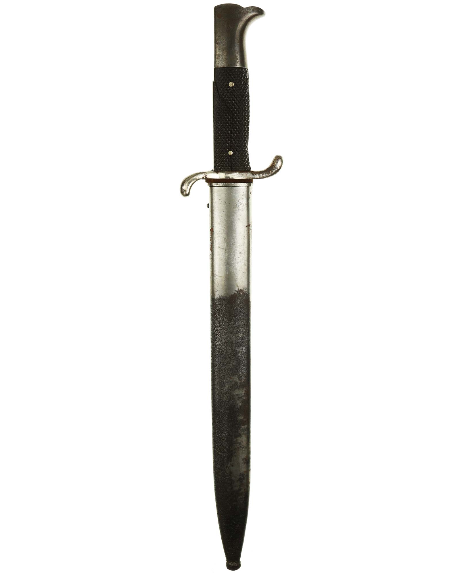 Feuerwehr Seitengewehr mit dem Robert Klaas Hersteller. Hintere Griffschale geplatzt. S-förmige Parierstange. Die Klinge ist einschneidig mit runden Hohlkehlen. Auf der Rückseite der Klinge befindet sich das Herstellerlogo:Robert Klaas Solingen. Stahlscheide ohne Lackierung. Gesamtlänge beträgt 400 mm.