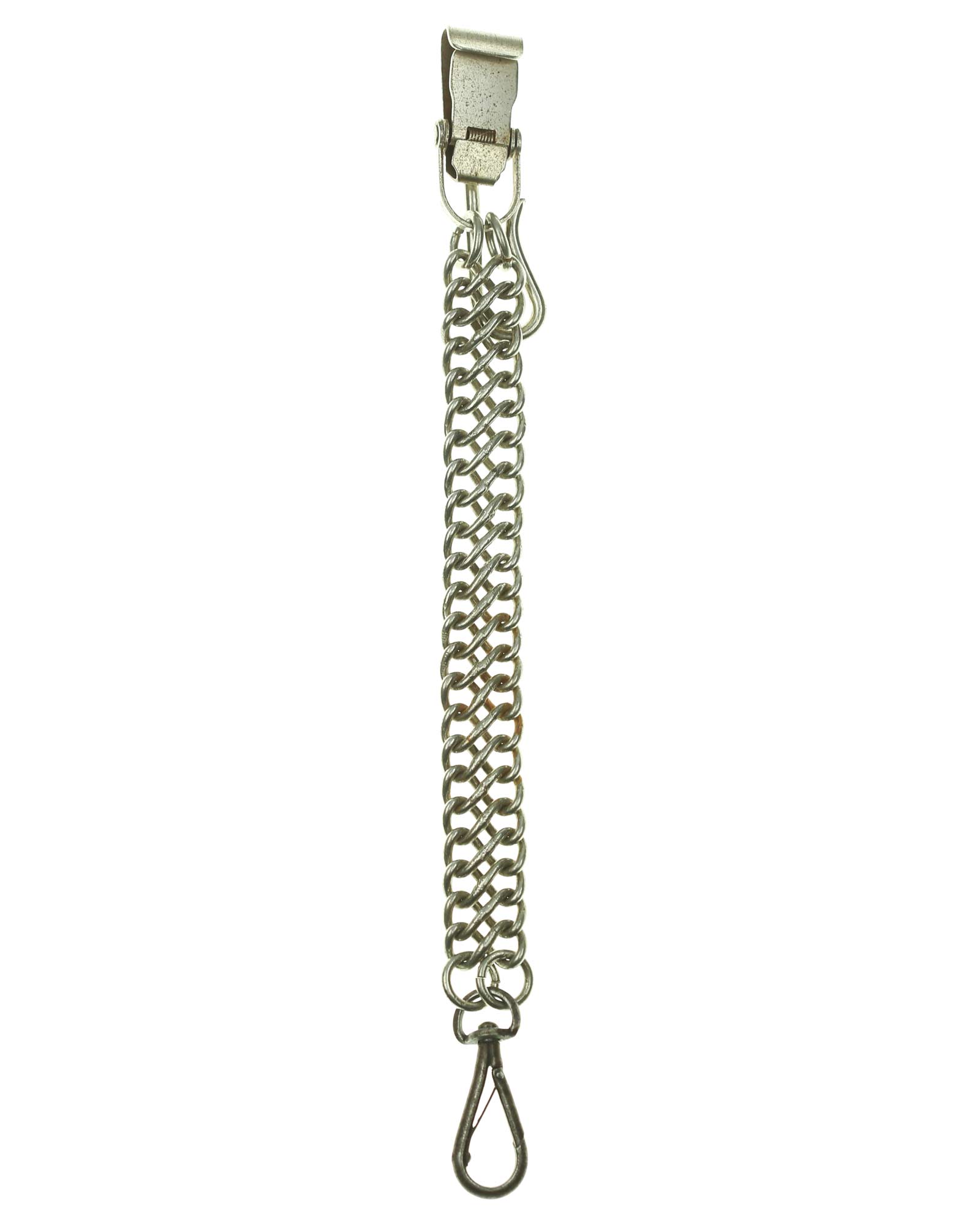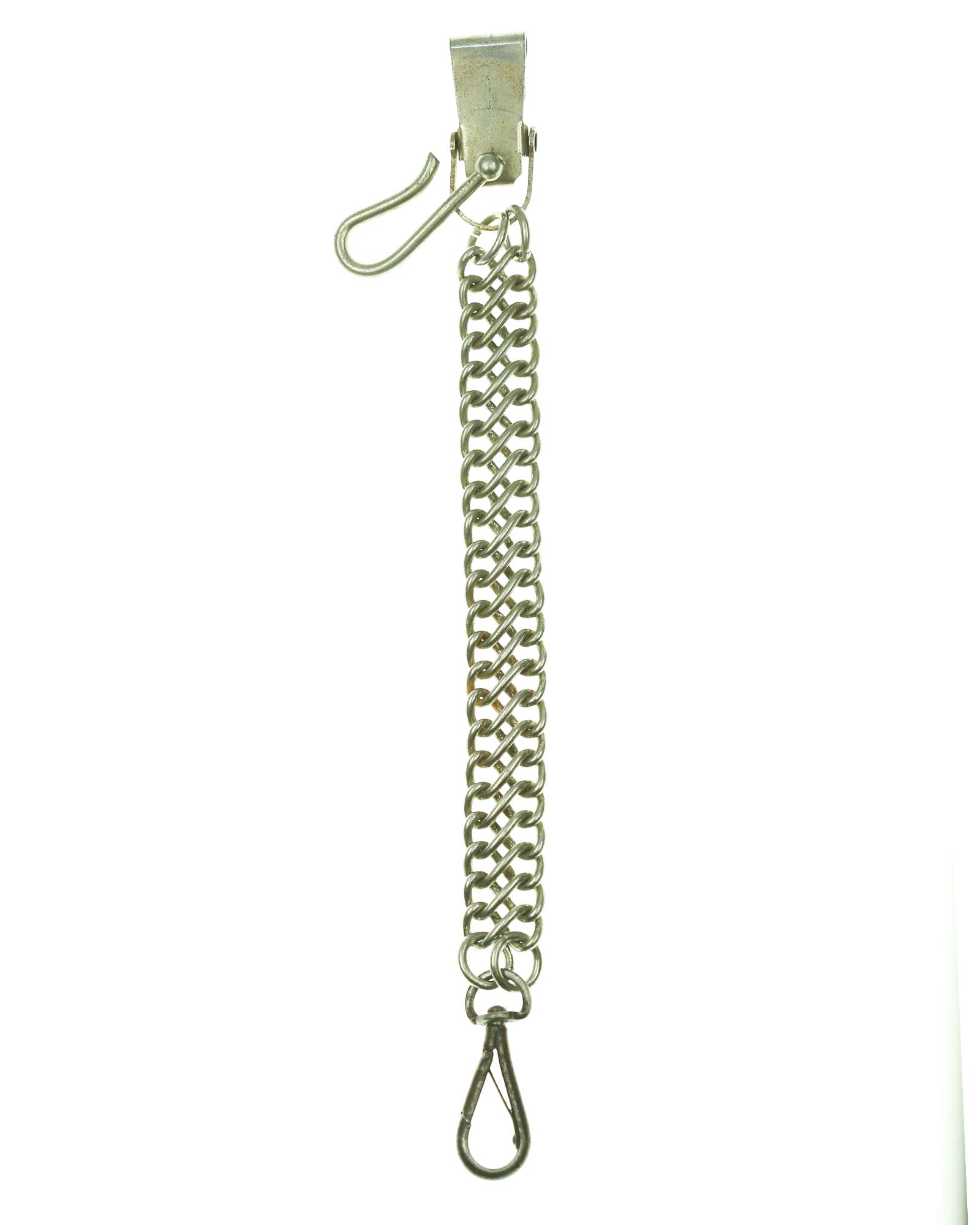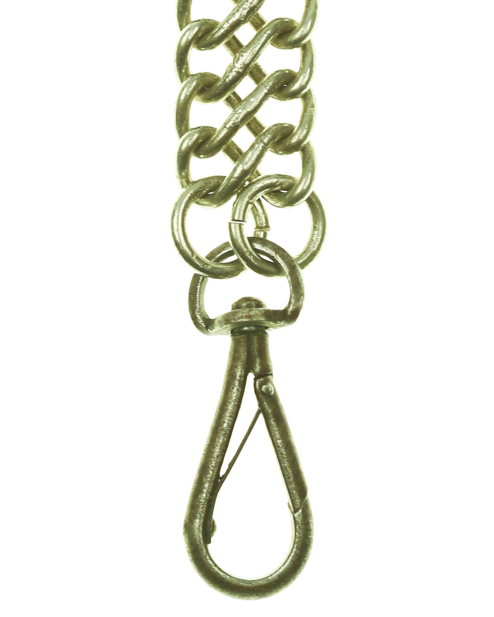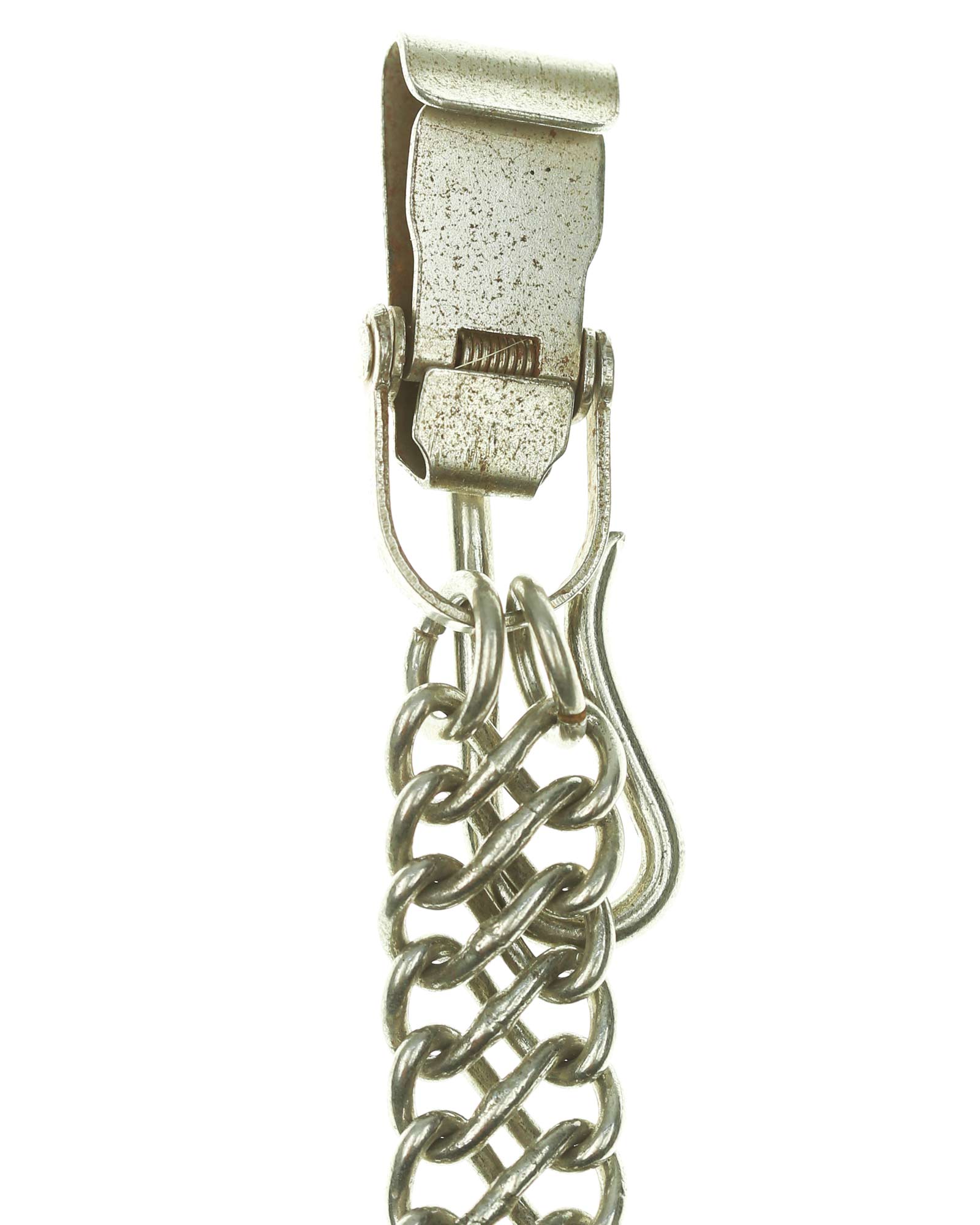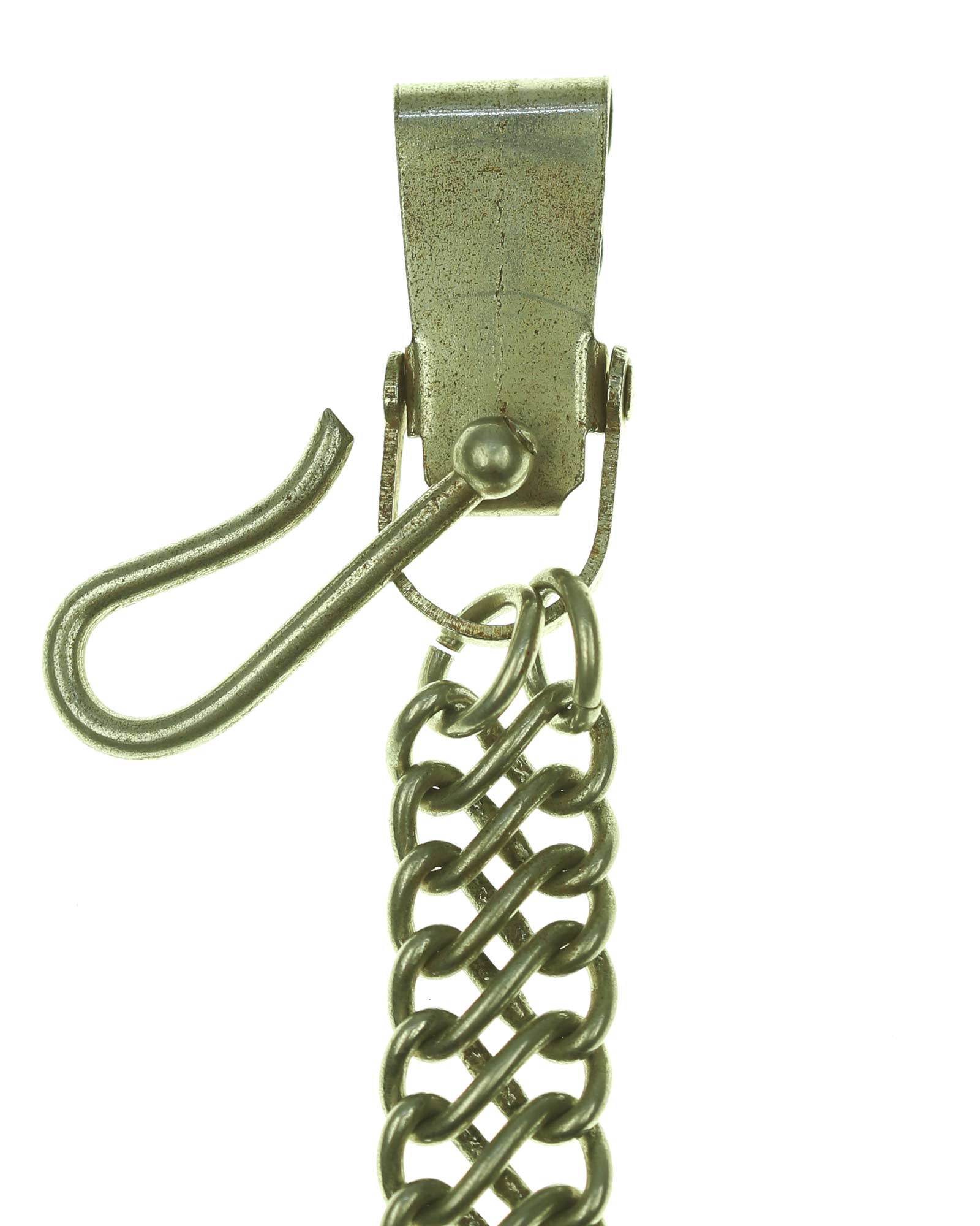 Hänger für Säbel aus Metall (Eisen). Geflochtene und gewalzte Kettenglieder, oben ein flacher Karabinerhaken, unten ein einfacher Karabinerhaken. Länge 28 cm. Zustand 2