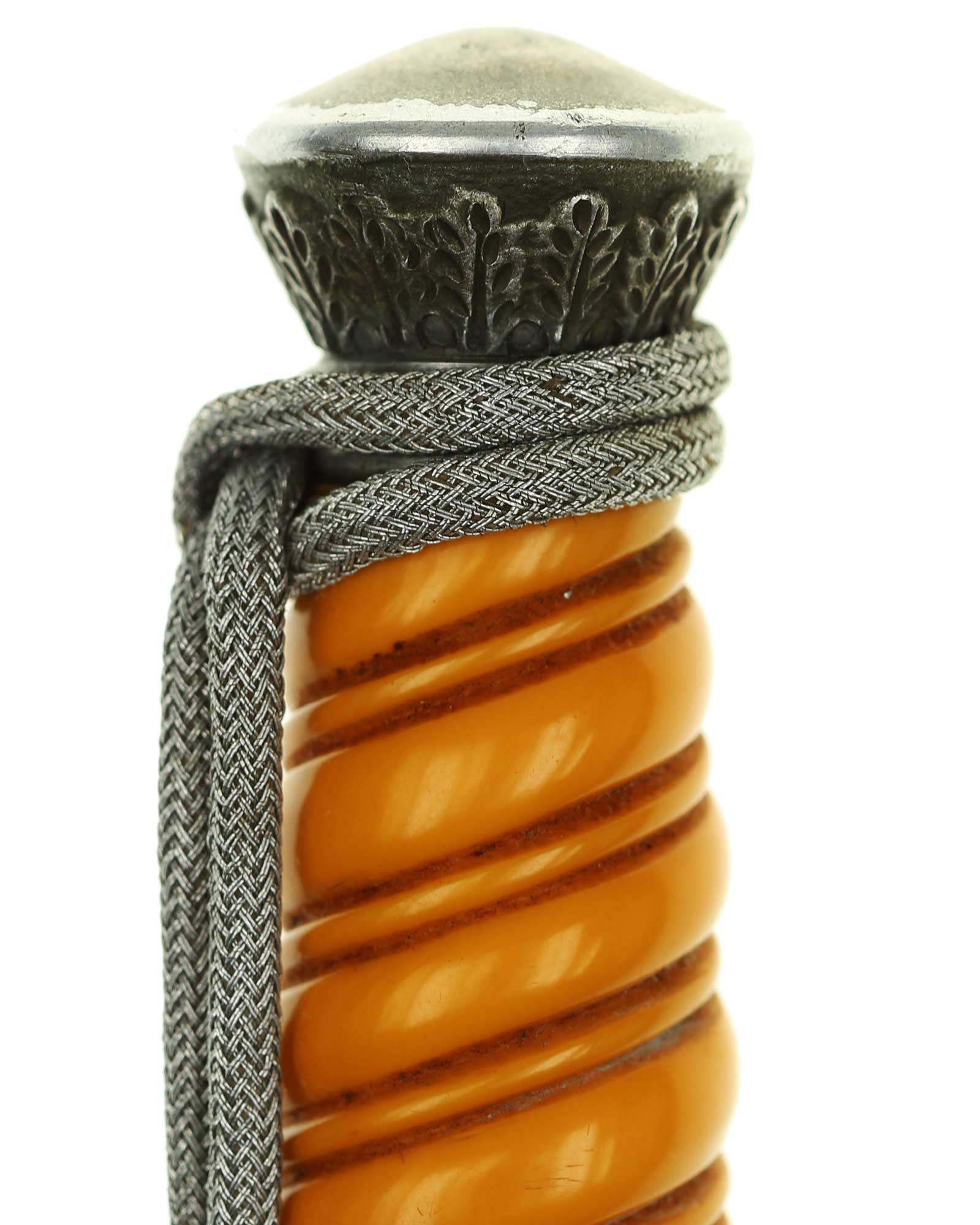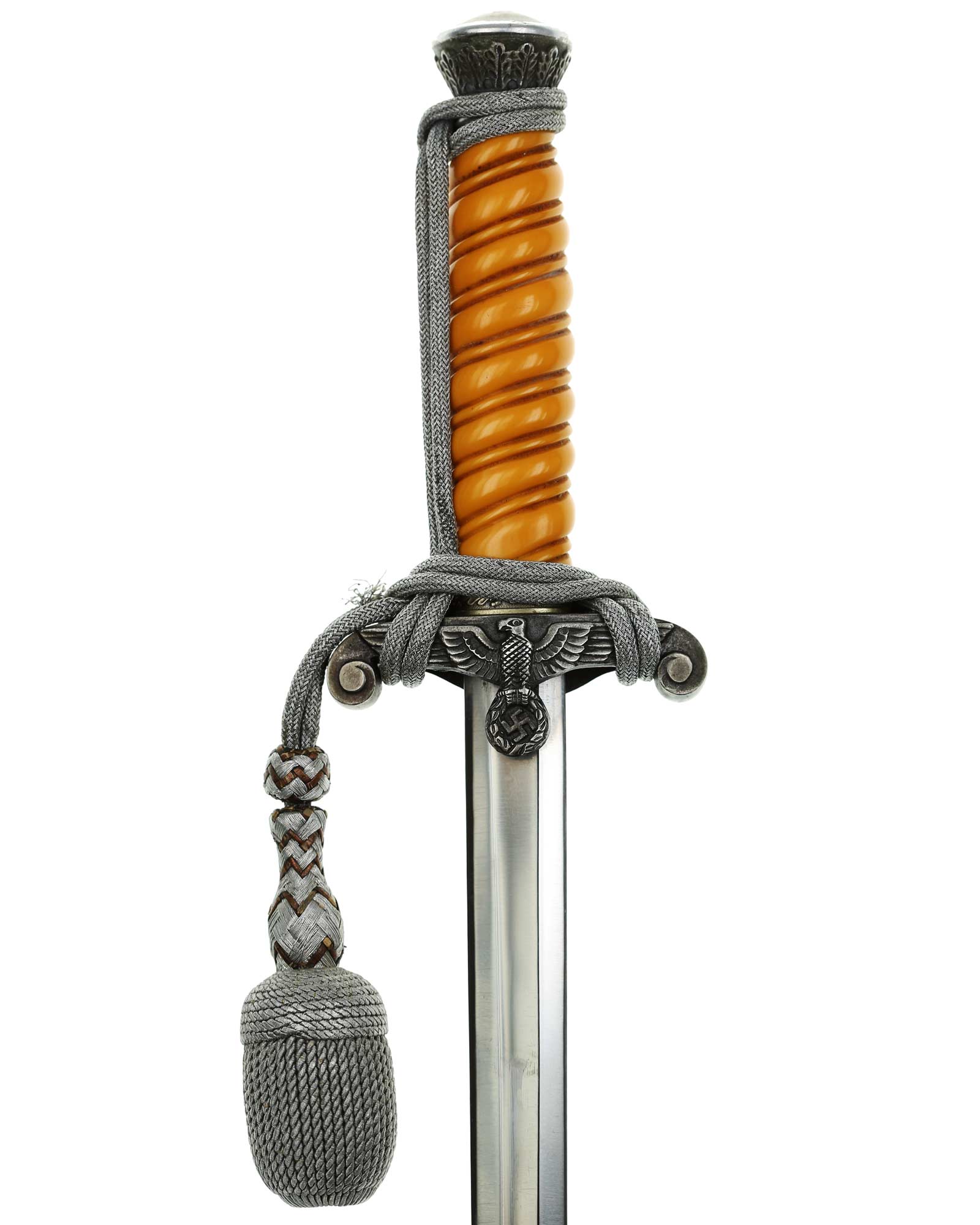 Griff: Der Griff ist rund mit zweifach verdrehten Kanneluren. Der Griff ist aus gelben Trolen. Die Form der Kanneluren ist konvex bzw. nach außen gewölbt. Der Knauf ist konisch und ist auf die Klingenangel festgeschraubt, dieser ist mit 14 Eichenlaubblätter verziert. Am unteren Ende des Griffes befindet sich der Griffring. Die Parierstange ist in Form eines Reichsadlers, der nach links schaut. Zu den beiden Enden hin wirbeln die Flügel nach unten. In der Mitte befindet sich der Adler, der in seinen Krallen einen Kranz mit dem Hakenkreuz festhält.