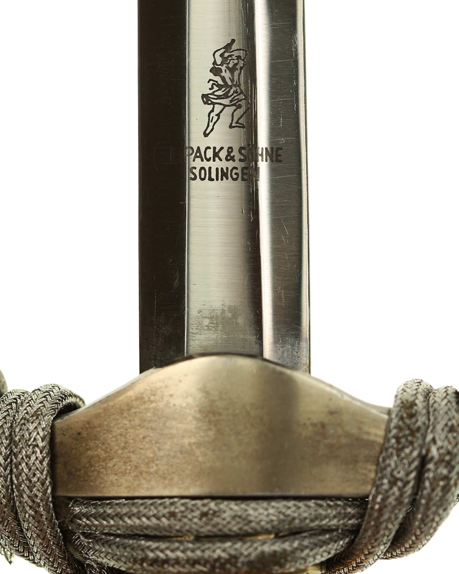 Klinge: Die Klinge ist zweischneidig und sehr gut erhalten. Das sog. "Crossgrain" ist zu 100% erhalten und sichtbar. Auf der Rückseite befindet sich das Herstellerlogo: E.PACK&SÖHNE SOLINGEN. Zwischen den Schultern der Klinge befindet sich das originale Stoßleder.