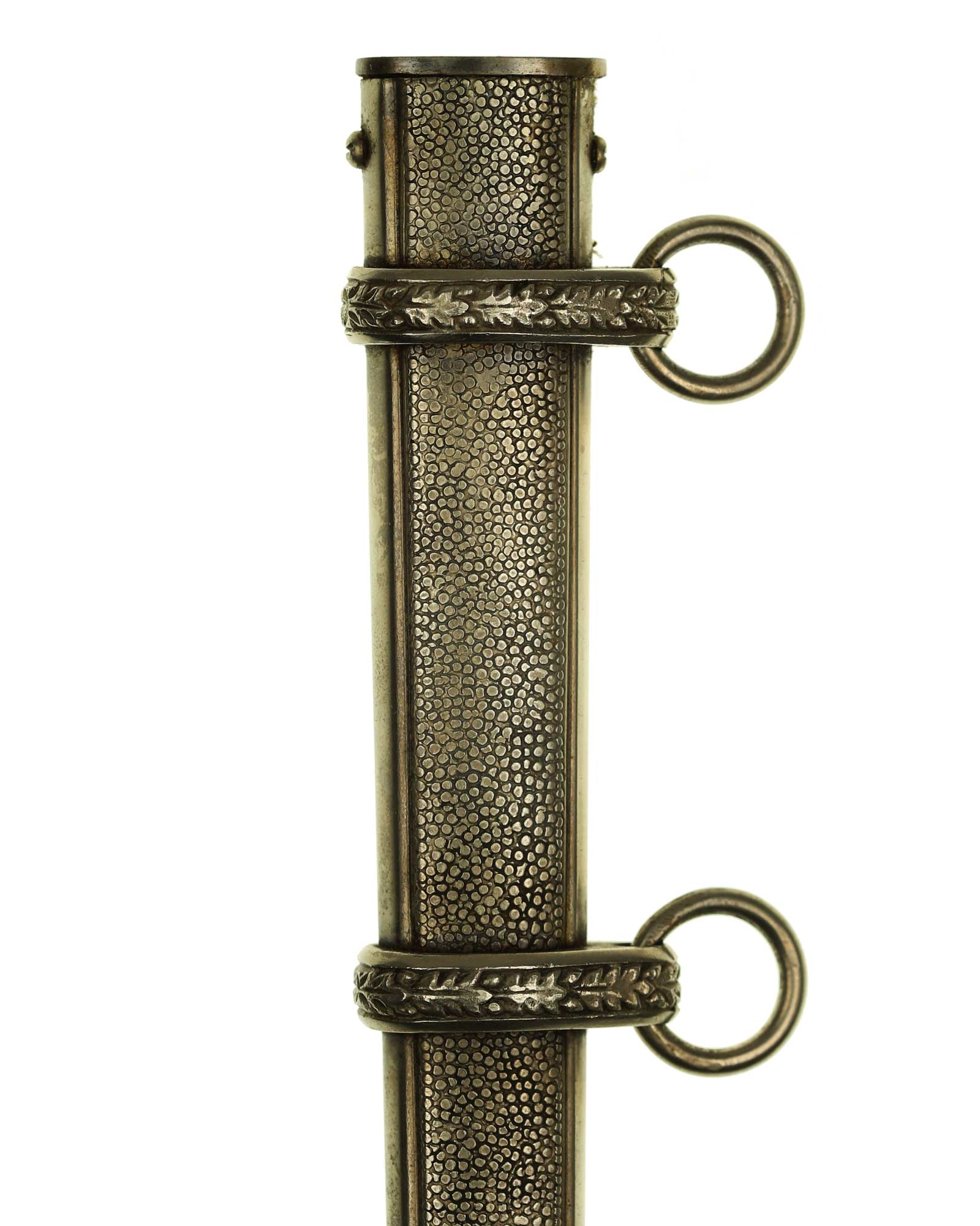 Scheide: Die Scheide besteht aus Mundblech und aus zwei Eichenlaub verzierten Scheidenbändern mit zwei losen Trageringen, diese sind komplett geschlossen. Die Scheide ist aus einem Stück Stahlblech gezogen und auf der Vorder- und Rückseite mit körniger Oberflächenstruktur versehen. Die Spitze ist abgerundet und nicht eingedrückt. Das Mundstück ist separat eingesetzt und mit zwei Schrauben befestigt. Die Scheide ist komplett ohne Beulen oder Dellen.