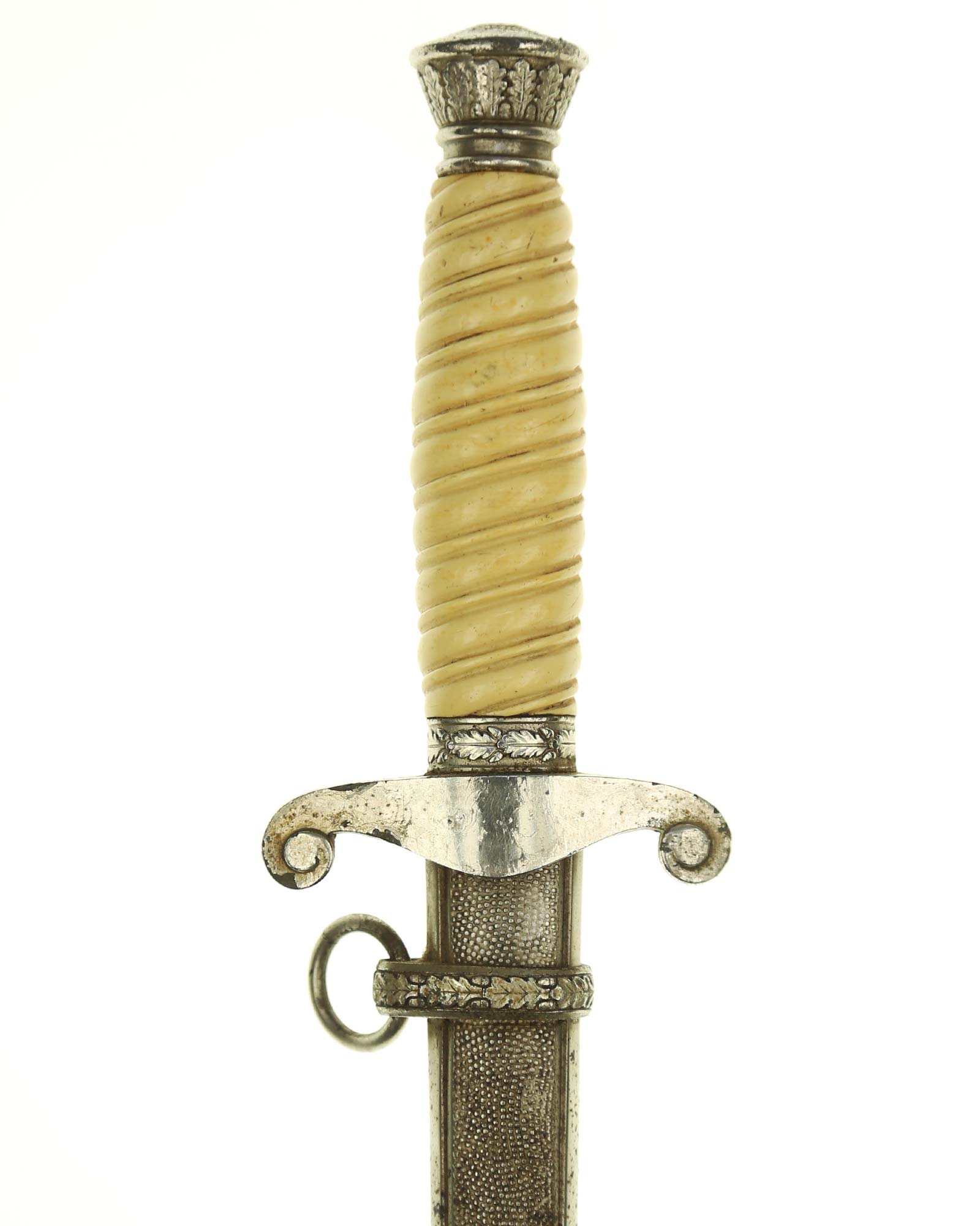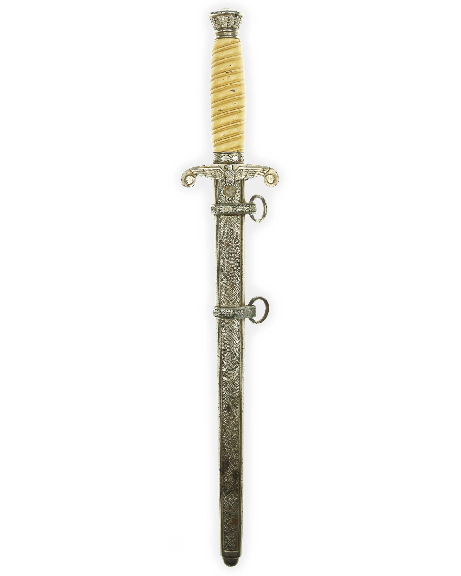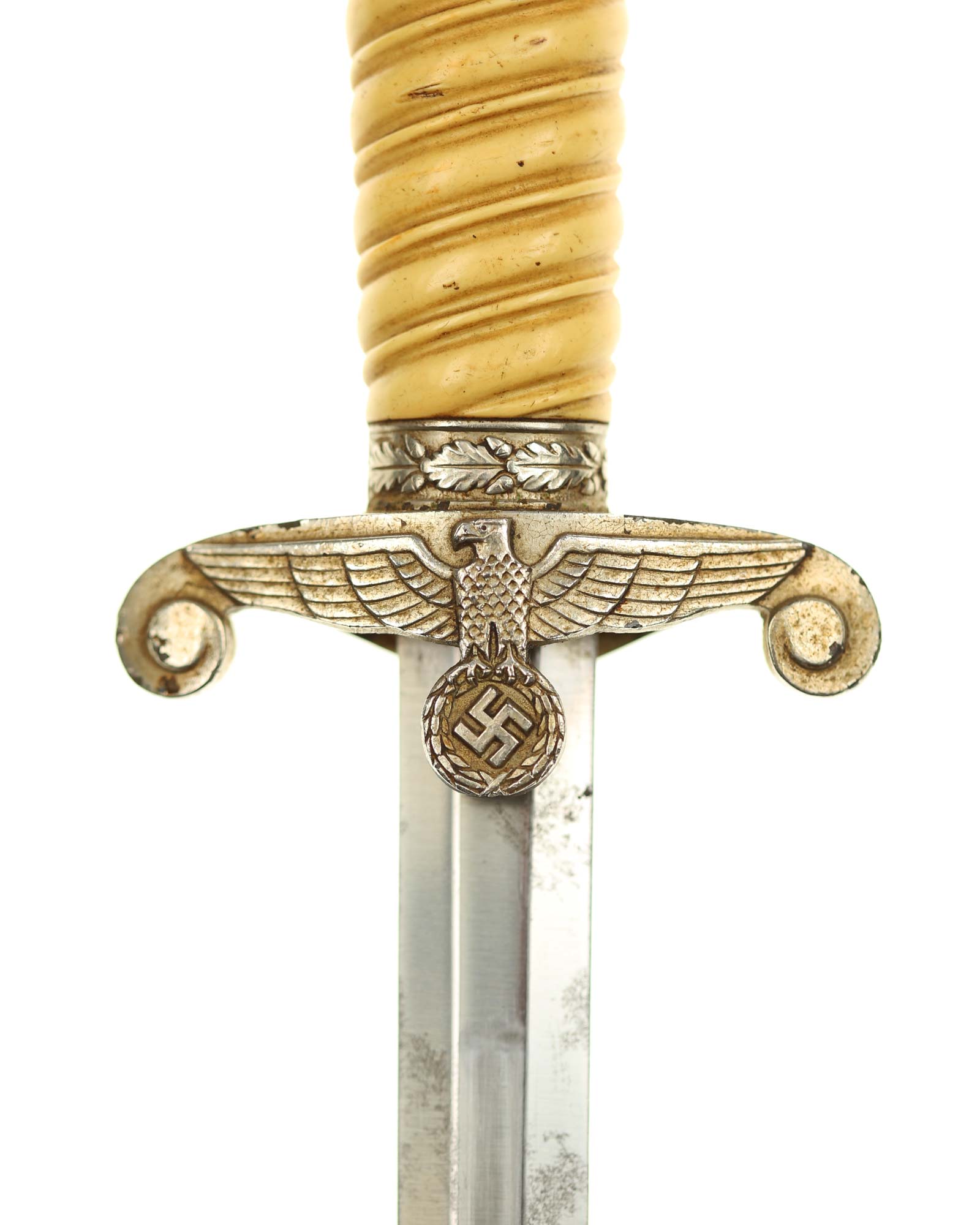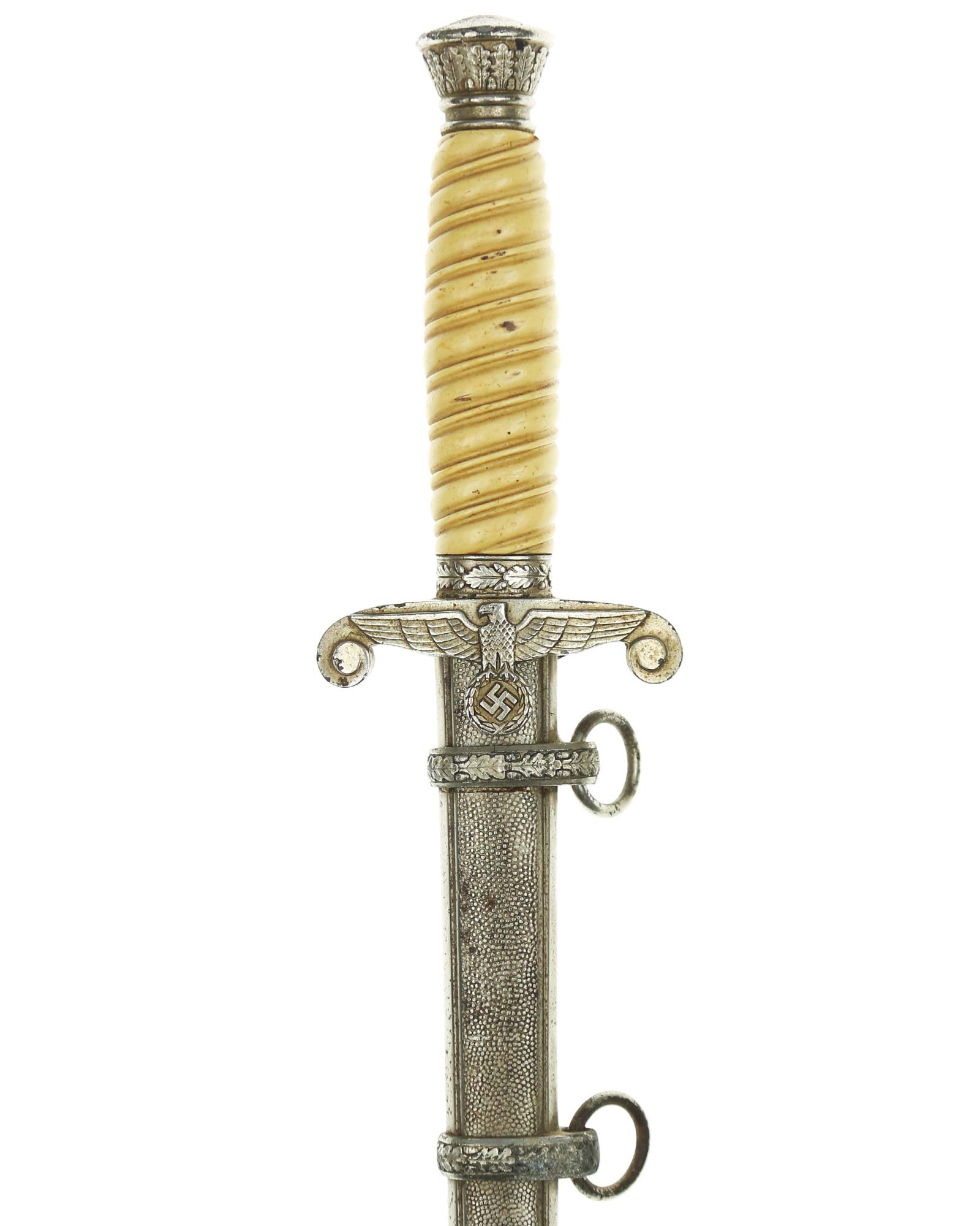 Griff: Der Griff ist rund mit zweifach verdrehten Kanneluren. Der Griff ist aus weißem Zelluloid. Die Form der Kanneluren ist konvex bzw. nach außen gewölbt. Der Knauf ist konisch und ist auf die Klingenangel festgeschraubt, er ist mit 12 Eichenlaubblätter verziert. Am unteren Ende des Griffes befindet sich der Griffring, der mit 6 Eichenblätter in einer Reihe nebeneinander verziert ist. Die Parierstange ist in Form eines Reichsadlers, der nach links schaut. Zu den beiden Enden hin wirbeln die Flügel nach unten. In der Mitte befindet sich der Adler, der in seinen Krallen einen Kranz mit dem Hakenkreuz festhält.
